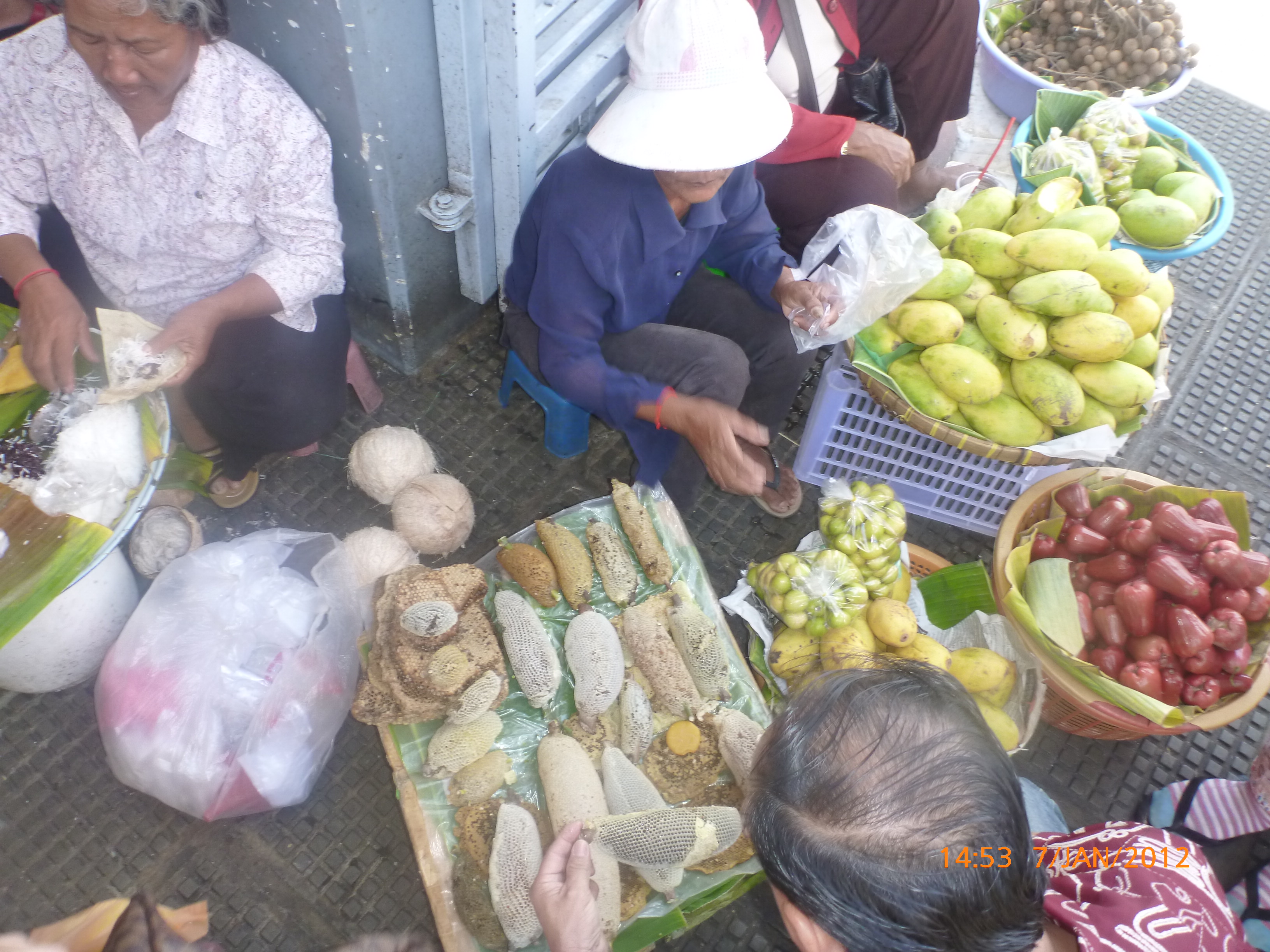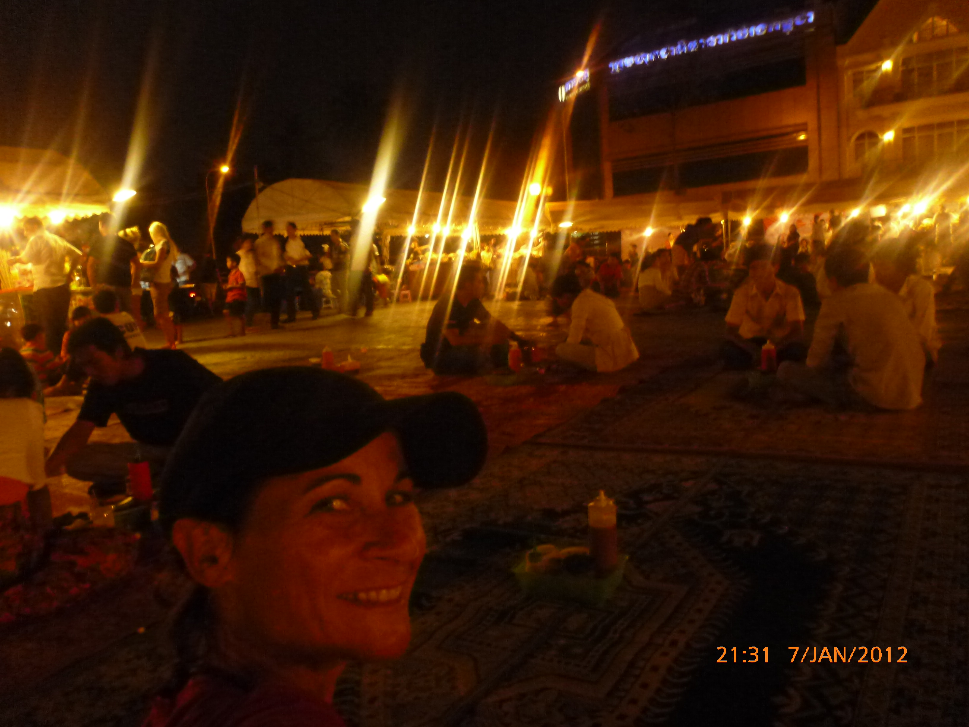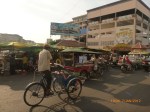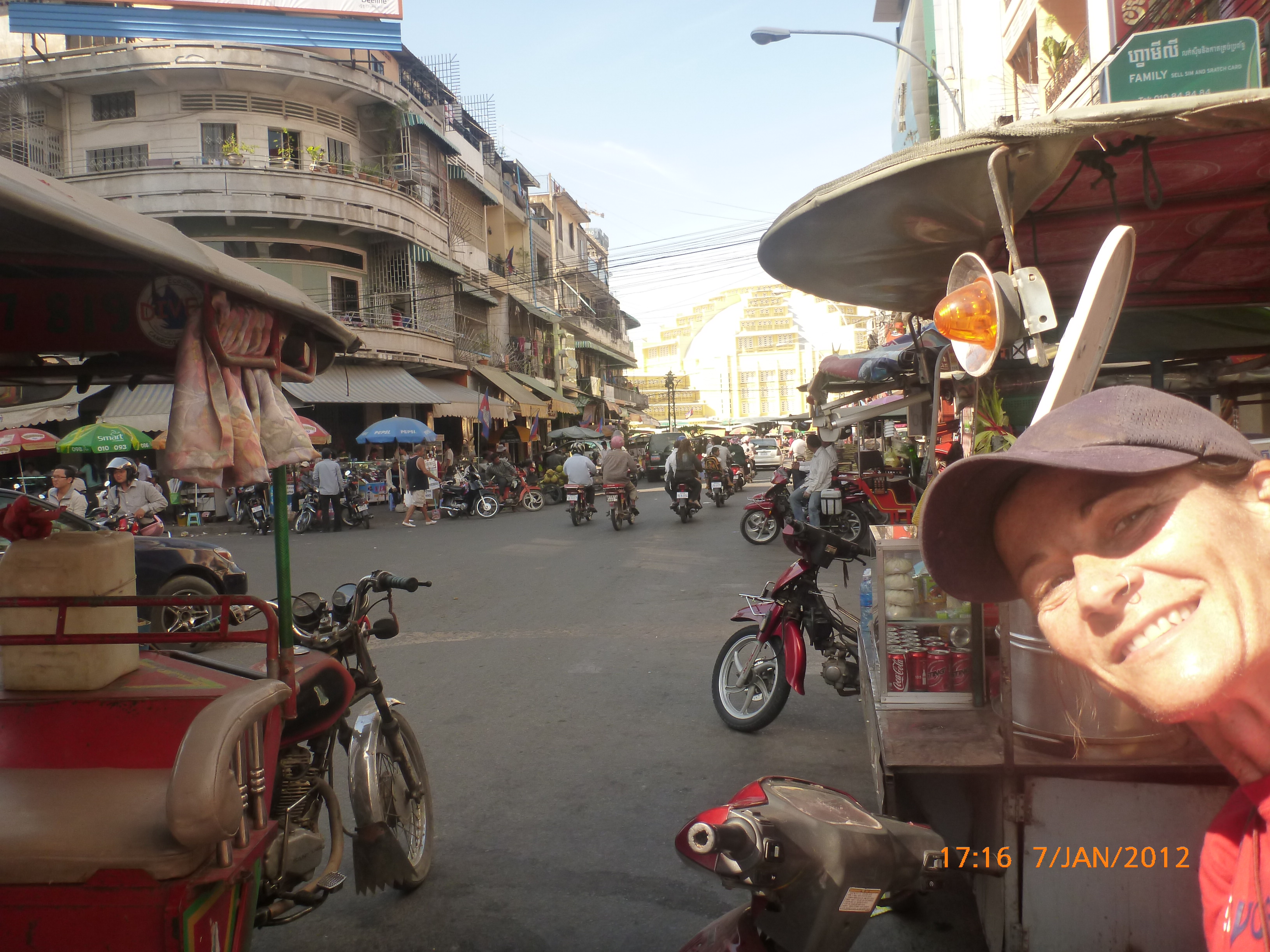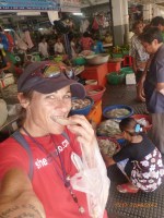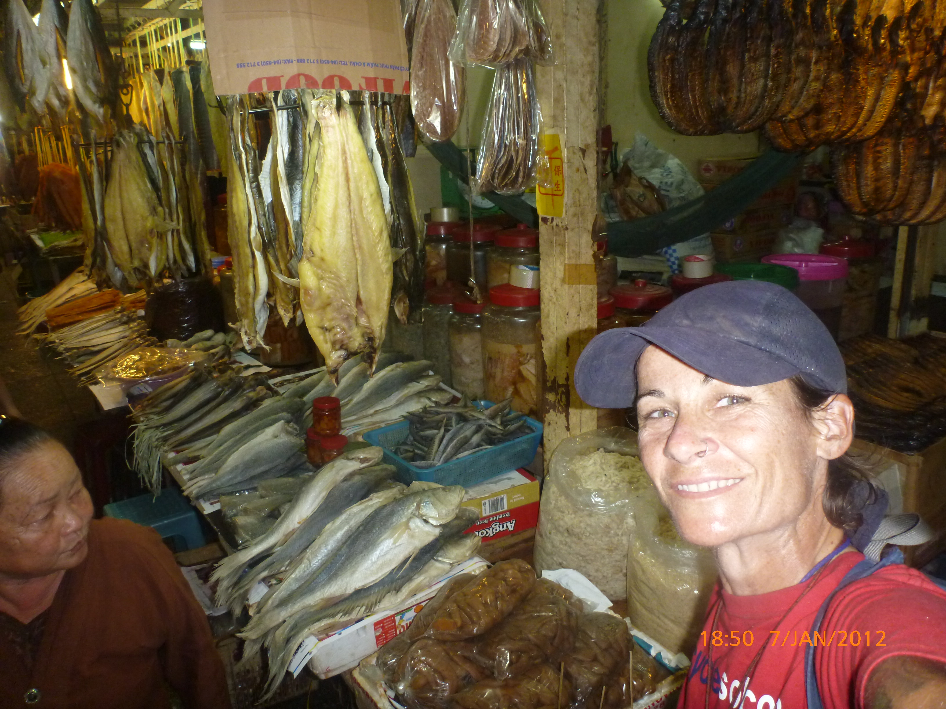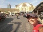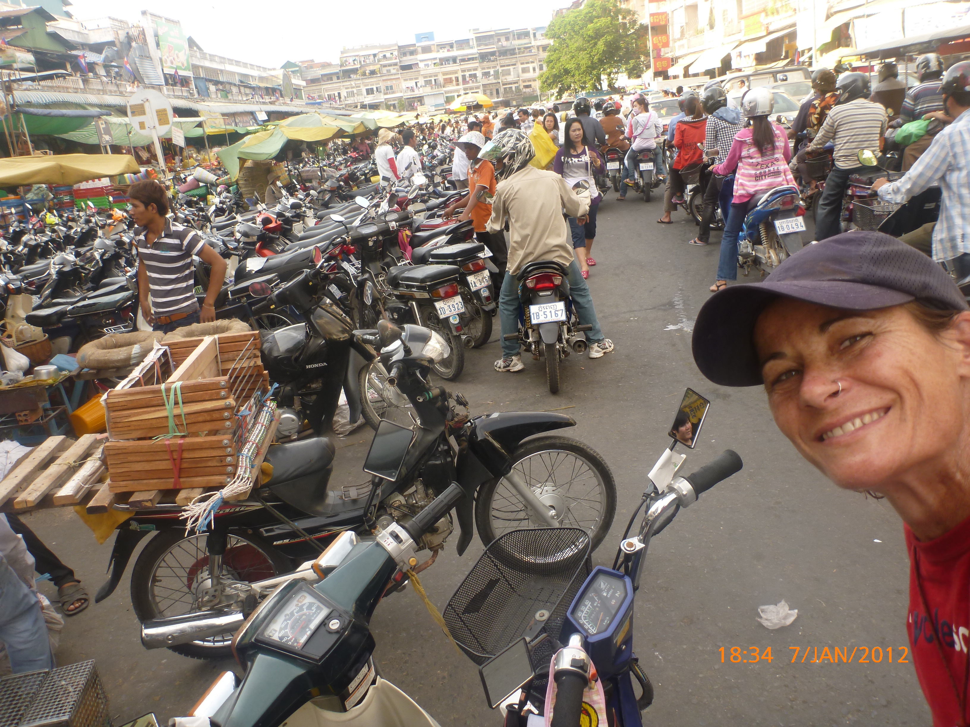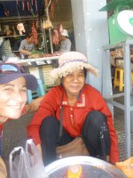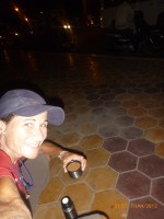 Day 38 1042 days to go. Distance: today 30km total 2060. As much as this place is one thing its just as much the opposite. And no I haven’t had a special vegetarian pizza for dinner. Phenom Phen is grand but grotesque with its polar standards of living. It’s huge with small pockets bustling with it’s own business and seemingly oblivious to the big city extravaganzas. it’s stimulating with its sensory overload whilst very confronting and personally challenging. It is truly beautiful in its locality and river front living but the live stock markets redefine cruelty. Here’s a story. I was in the night markets and stopped in the eating section where there were mats laid out to sit and have a meal. I thought it a great spot to blog but as soon as I sat I was approached by begging children. I told them no and they soon left but I saw their mother wave them back and they came and laid on the ground beside me displaying their desperate message. I left. Today has been an incredible day. Rube and I headed this morning to go find the supermarket and bakery I spotted on the way in yesterday. It turned out the bakery was this hub of bread products and local folk and vendors were buying bags of freshly baked loaves and bread sticks still warm. They were selling out of huge wooden crates and being topped up as quick as sold. I got amongst it and bought 10 for $1.00. The bag was so warm and the bread crusty yum. So I sat outside the bakery in my best asian squat position and ate one while it was hot. I must have sat there for an hour. It tuned out to be a bus stop or should I say a van stop for local folk traveling between cities. I have been seeing these vans on the road. The drivers are crazing one speed full throttle plowing the road with their horns. It turns out these vans are alternative intercity transport. So out front of the bakery was the van stop with vendors selling eggs and pork rolls and sugar cane drinks to the travelers. It was fascinating to watch. I dropped Rube back at the guest house and walked to the central market (old and new). On the way I found the bus stop and bought a return ticket for Rube and I for Siem Reap Monday morning leaving 10am 6 hour trip. The guest house will let me leave the trailer and most of the gear which is great. The central market is under this large yellow domed building that takes up a block. All around the base is food markets and inside mostly jewelry, silks and clothing. I of course found the sunglass stand and bought a genuine pair of Oakley’s for $4.00 :-). I haggled I shocked myself I so don’t do haggling but I got the price down from $7 to $4. Actually to tell you the truth it wasn’t the sunglasses (which are pretty cool) or the price it was the fact that she said please please buy and I did….sucker! My glasses had broken with a pair on order from home so they’ll do the trick in the meantime. Plus it was a really nice experience so had to have a photo with the sales girl she was so sweet. Outside in the food stalls this woman was squatted over a tray selling that vegetable Ive been seeing drying on the roadside. These had been steamed and I bought couple of pieces to try. She peeled and cut them up for me. It was a cross between a turnip and a sweet potato very starchy and gave me that sense of indigestion but tasted good. She was very shy for the camera but eventually agreed. I also saw a woman selling beehive pieces which smelt intoxicating and skinned frogs in a basket crazy variety. The block over was the new central market in a tall glass domes building. I checked it out for the view from the top. It was bazar on one side looking out to the river the apartment living was quite good standard most buildings 3-4 stories high with garden terraces. On the other side were dilapidated housing blocks. There was a roller blade rink at the top and I watched these guys for ages doing their tricks and having the best s stacks. The next market was called Orussie. It was totally mad. there were no tourists just locals and lots of them congregating and shopping and eating. This market was raw I loved it allot more interesting and the right side of dirty stinky intrigue. Heaps of dried meats and fish which had an overbearing smell being indoors and in such concentration but looked incredible all crammed in different shapes and sizes hanging adhoc in every bit of shop space very cool I loved it. There were also lots of spices and herbs it was a really interesting market and fun to hang out. Tomorrow is the Russian market which reads as the best one for getting lost in so i’m doing that first up in the morn with a fresh head to get into it. At the bus stop I saw a high pressure hose being used to clean the buses so I took Rube their this arv for a clean. Unfortunately she’s spotless but i’ve mucked up the alignment of her gears bugga so that’s also a job for tomorrow. Thank goodness for Barnets Bike manual. It’s come to the rescue a couple of times now so money well spent already. I hope to end the day doing a walking tour I read in a book which finishes on the river front and I may be able to find a picnic posie over dusk. Tomorrow evening will be uploading photos I found a cafe not too far up the street so a good job before heading to Siem Reap Monday. Talk soon x