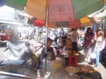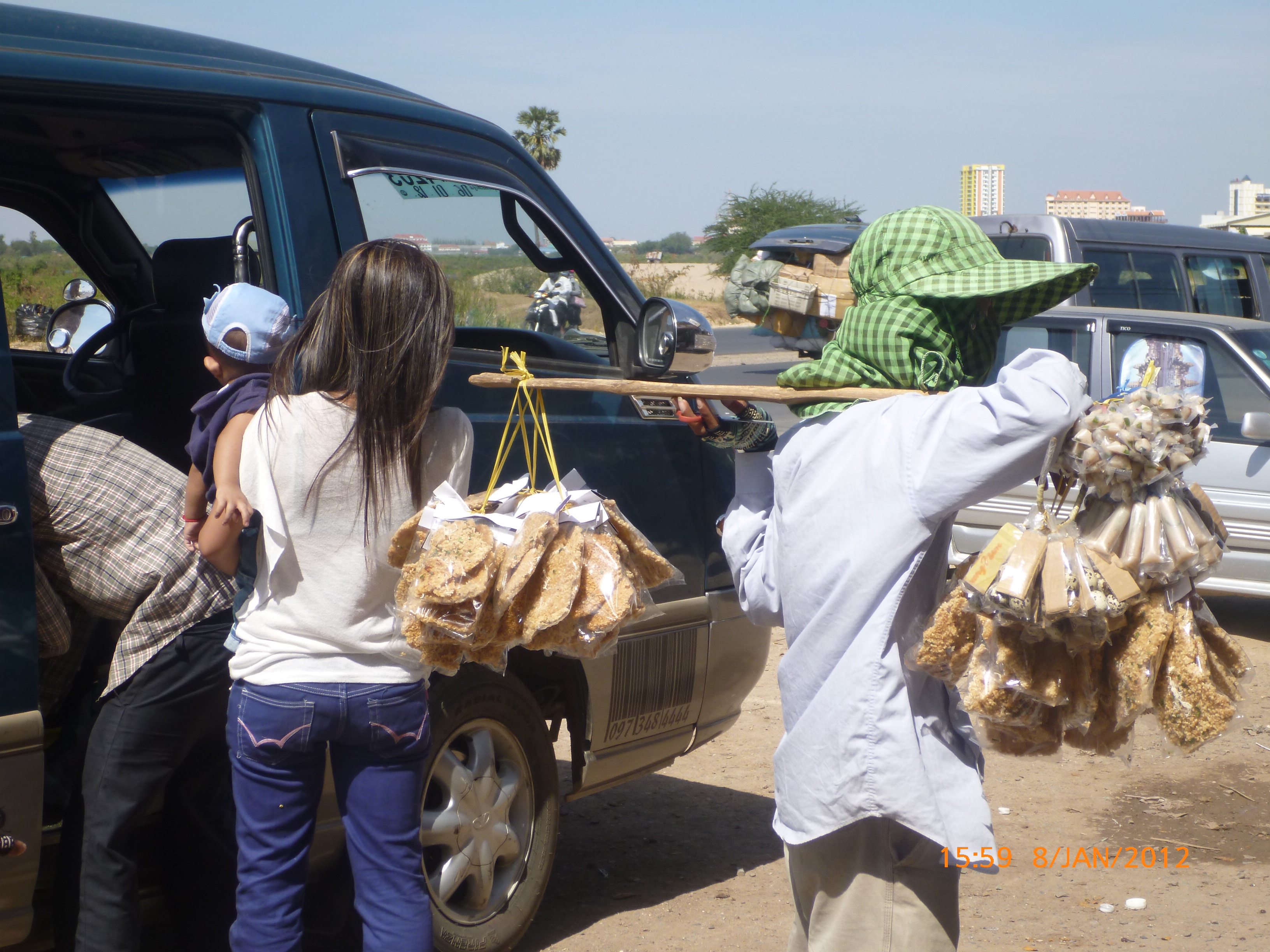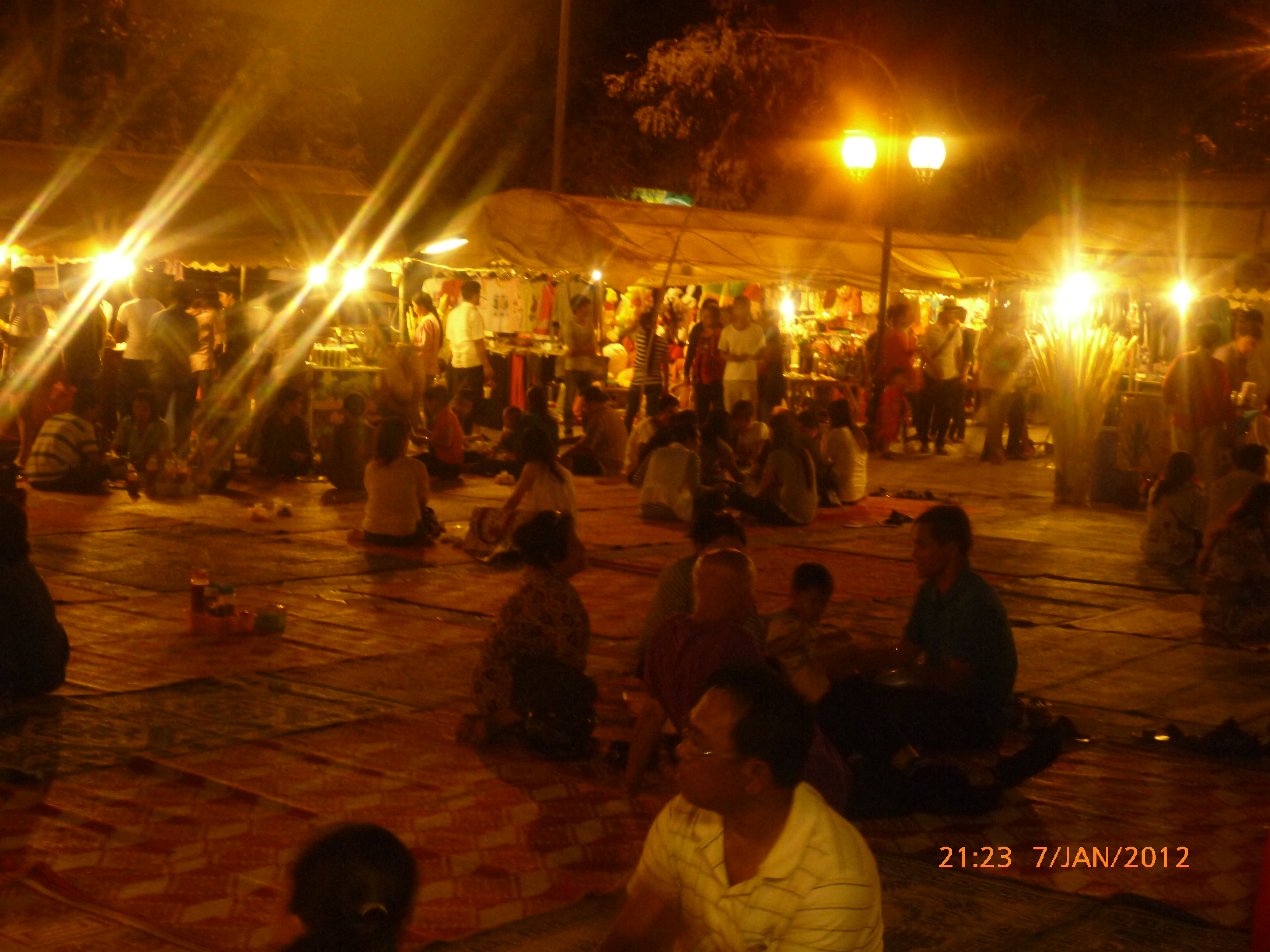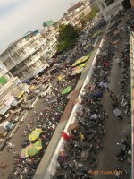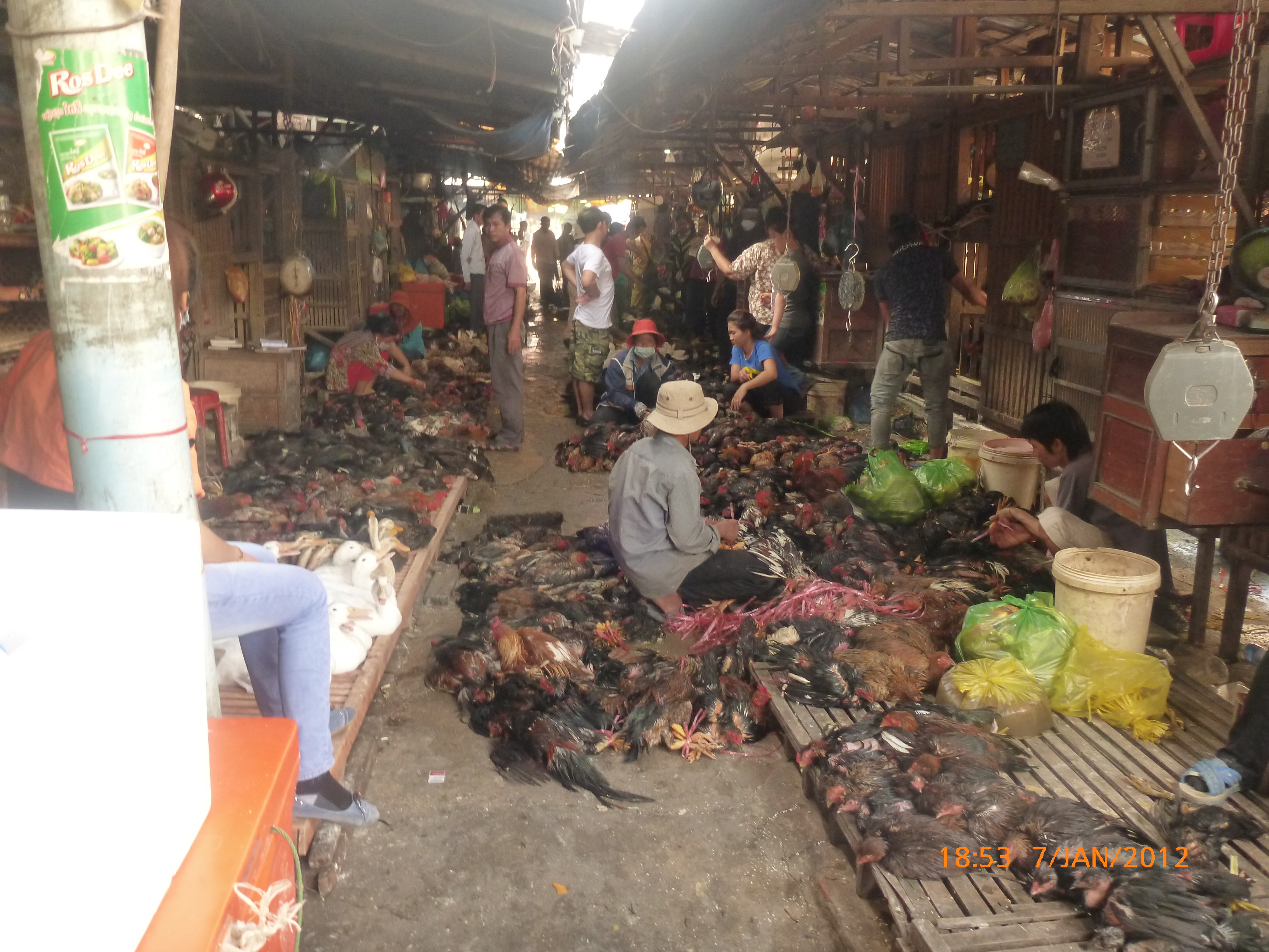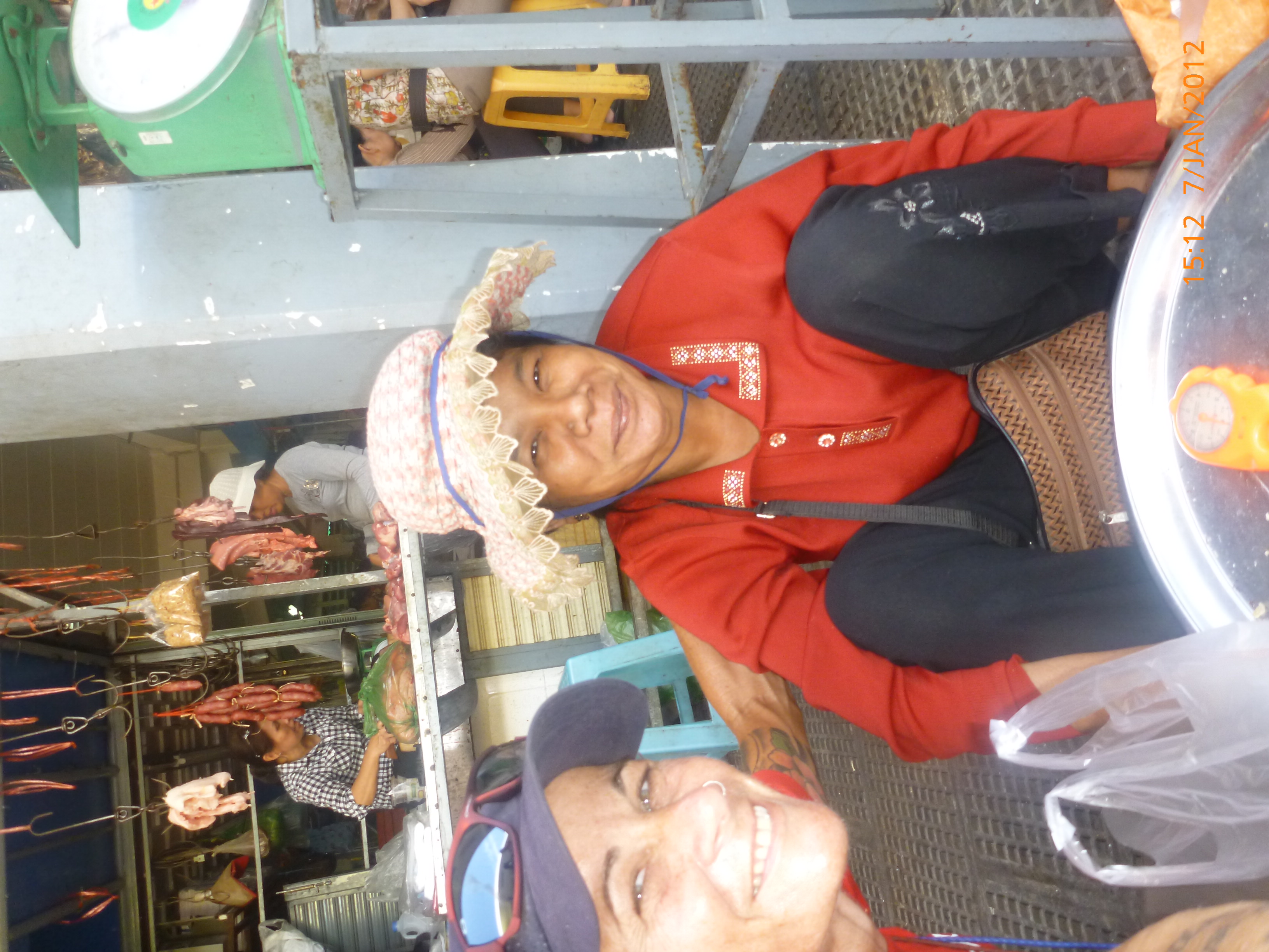 Day 38 1042 days to go. Distance: today 30km total 2060. As much as this place is one thing its just as much the opposite. And no I haven’t had a special vegetarian pizza for dinner. Phenom Phen is grand but grotesque with its polar standards of living. It’s huge with small pockets bustling with it’s own business and seemingly oblivious to the big city extravaganzas. it’s stimulating with its sensory overload whilst very confronting and personally challenging. It is truly beautiful in its locality and river front living but the live stock markets redefine cruelty. Here’s a story. I was in the night markets and stopped in the eating section where there were mats laid out to sit and have a meal. I thought it a great spot to blog but as soon as I sat I was approached by begging children. I told them no and they soon left but I saw their mother wave them back and they came and laid on the ground beside me displaying their desperate message. I left. Today has been an incredible day. Rube and I headed this morning to go find the supermarket and bakery I spotted on the way in yesterday. It turned out the bakery was this hub of bread products and local folk and vendors were buying bags of freshly baked loaves and bread sticks still warm. They were selling out of huge wooden crates and being topped up as quick as sold. I got amongst it and bought 10 for $1.00. The bag was so warm and the bread crusty yum. So I sat outside the bakery in my best asian squat position and ate one while it was hot. I must have sat there for an hour. It tuned out to be a bus stop or should I say a van stop for local folk traveling between cities. I have been seeing these vans on the road. The drivers are crazing one speed full throttle plowing the road with their horns. It turns out these vans are alternative intercity transport. So out front of the bakery was the van stop with vendors selling eggs and pork rolls and sugar cane drinks to the travelers. It was fascinating to watch. I dropped Rube back at the guest house and walked to the central market (old and new). On the way I found the bus stop and bought a return ticket for Rube and I for Siem Reap Monday morning leaving 10am 6 hour trip. The guest house will let me leave the trailer and most of the gear which is great. The central market is under this large yellow domed building that takes up a block. All around the base is food markets and inside mostly jewelry, silks and clothing. I of course found the sunglass stand and bought a genuine pair of Oakley’s for $4.00 :-). I haggled I shocked myself I so don’t do haggling but I got the price down from $7 to $4. Actually to tell you the truth it wasn’t the sunglasses (which are pretty cool) or the price it was the fact that she said please please buy and I did….sucker! My glasses had broken with a pair on order from home so they’ll do the trick in the meantime. Plus it was a really nice experience so had to have a photo with the sales girl she was so sweet. Outside in the food stalls this woman was squatted over a tray selling that vegetable Ive been seeing drying on the roadside. These had been steamed and I bought couple of pieces to try. She peeled and cut them up for me. It was a cross between a turnip and a sweet potato very starchy and gave me that sense of indigestion but tasted good. She was very shy for the camera but eventually agreed. I also saw a woman selling beehive pieces which smelt intoxicating and skinned frogs in a basket crazy variety. The block over was the new central market in a tall glass domes building. I checked it out for the view from the top. It was bazar on one side looking out to the river the apartment living was quite good standard most buildings 3-4 stories high with garden terraces. On the other side were dilapidated housing blocks. There was a roller blade rink at the top and I watched these guys for ages doing their tricks and having the best s stacks. The next market was called Orussie. It was totally mad. there were no tourists just locals and lots of them congregating and shopping and eating. This market was raw I loved it allot more interesting and the right side of dirty stinky intrigue. Heaps of dried meats and fish which had an overbearing smell being indoors and in such concentration but looked incredible all crammed in different shapes and sizes hanging adhoc in every bit of shop space very cool I loved it. There were also lots of spices and herbs it was a really interesting market and fun to hang out. Tomorrow is the Russian market which reads as the best one for getting lost in so i’m doing that first up in the morn with a fresh head to get into it. At the bus stop I saw a high pressure hose being used to clean the buses so I took Rube their this arv for a clean. Unfortunately she’s spotless but i’ve mucked up the alignment of her gears bugga so that’s also a job for tomorrow. Thank goodness for Barnets Bike manual. It’s come to the rescue a couple of times now so money well spent already. I hope to end the day doing a walking tour I read in a book which finishes on the river front and I may be able to find a picnic posie over dusk. Tomorrow evening will be uploading photos I found a cafe not too far up the street so a good job before heading to Siem Reap Monday. Talk soon x