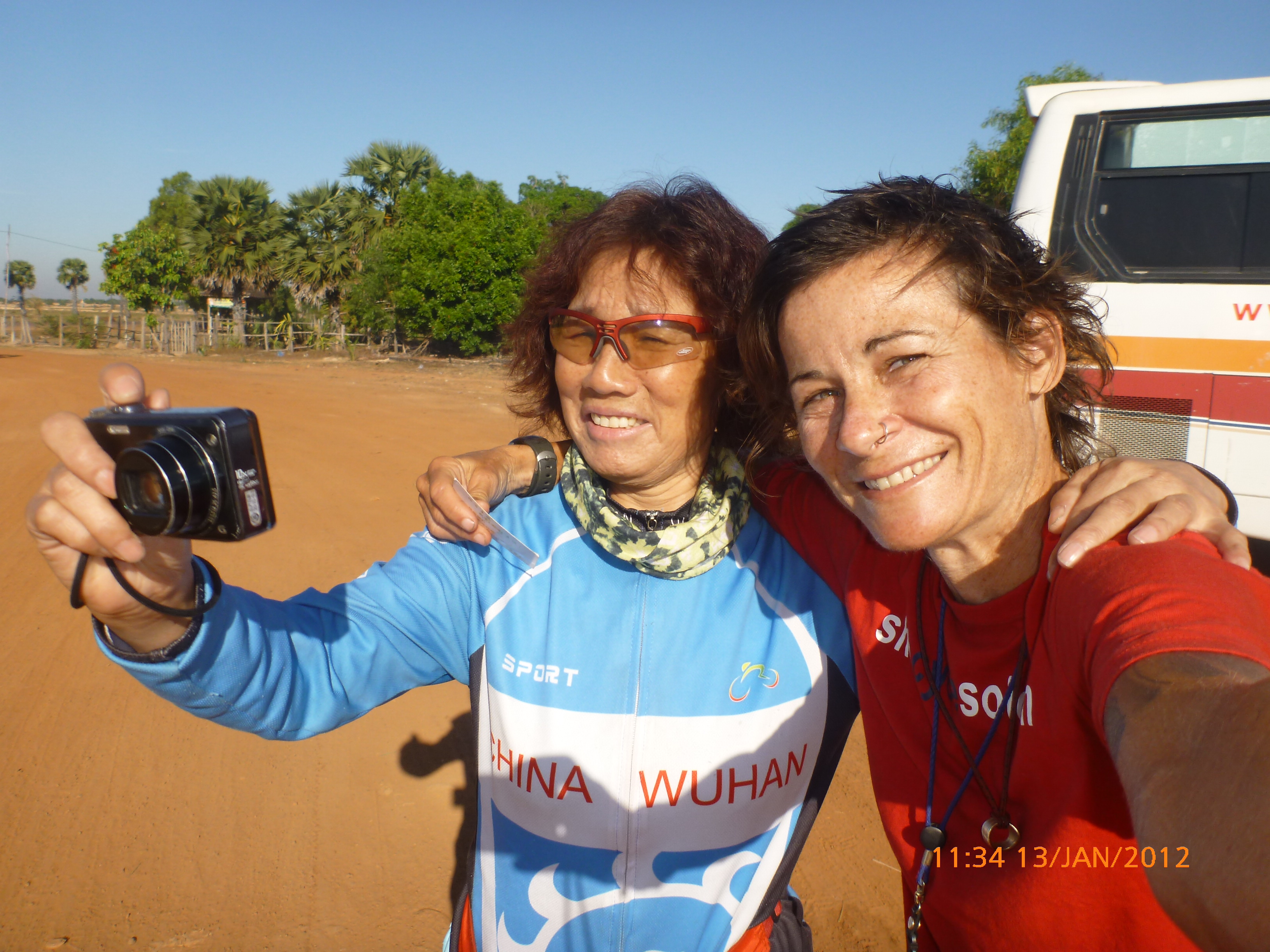It’s 8.11pm Friday 13/1/2012 Phenom Phen. The afternoon has flown and I didn’t realize the time until I’ve sat down now at the Internet café to upload the photos fromAngkor. Time flies when you’re doing cool stuff and I have been. I’ve just had my first Skype date with my parents. Aren’t they out of control clever and IT all over it? I’m so proud of them. Fun and loved it and we even have another date in the morning as we got disconnected before finishing our chats. I still have a few things to organize before heading off toVietnamso I’m here for one more day tomorrow to give myself a chance to get organized. Rube needs attention – she got battered a bit on the bus ride and some bits came loose which I eventually found in the luggage compartment but lost her seat post screws. I’ll crack some “screws loose” jokes once she calms down it’s a bit early for the Virgo. Not a biggy to fix as I since found spares that will do the trick but it didn’t stop me giving the luggage man a blast for rushing the situation.  ”Sorry Miss” he called out as they started reversing out. It was out of my mouth what I thought of their care factor about my Rubes. On a positive there was no bloodshed and he just smiled at me so I walked off trying to recall something I said about acting respectfully grrrr. I returned to the same hotel and found my gear all waiting safe and sound yay. It’s been an afternoon of doing some have-to’s in an attempt to head tomorrow but ran out of hours in the day so tomorrow I’ll sort the rest tomorrow. I want to bring some time frames together to meet up with friends in Hoi An and Family inBeijingso its’ well worth the extra day to bring that stuff together. The photos fromAngkorare uploading as I type very excited to add them to the posts. On the bus today I met this group of five cyclists fromChina. How cool is that. They gave me a neck scarf to pull up over my nose when it’s dusty, a little flag with their cycling logo and an email contact once I’m inChina. Very cool. I think I mentioned I lost Rube’s dinky flag so I’m on a mission now to find a plastic post to mount her new one which is Red and not yellow much to her delight. Ruby winged all the way throughThailandthat her dinky flag made her feel like a lollypop lady. For those not familiar with Lollypop ladies they are volunteers (usually woman) who keep traffic control at pedestrian crossings for school children. They are dressed in bright yellow accessories to stand out. MMMM maybe it was Ruby who “misplaced” the flag on the long boat to Luang Prabang. Full points to the girl for strategy I say (She so has me wrapped around her peddles and knows it) J I’m not sure which way I’ll head toVietnamand will have a look at the map tonight over dinner. Time is somewhat a factor with other priorities so I’ll see what I can bring together tomorrow. The photos have taken longer than initially thought to upload into the blog so I’ll come back tomorrow and attach them to the posts. One extra day won’t make a difference most of you are sleeping anyway J Talk soon x