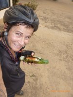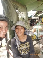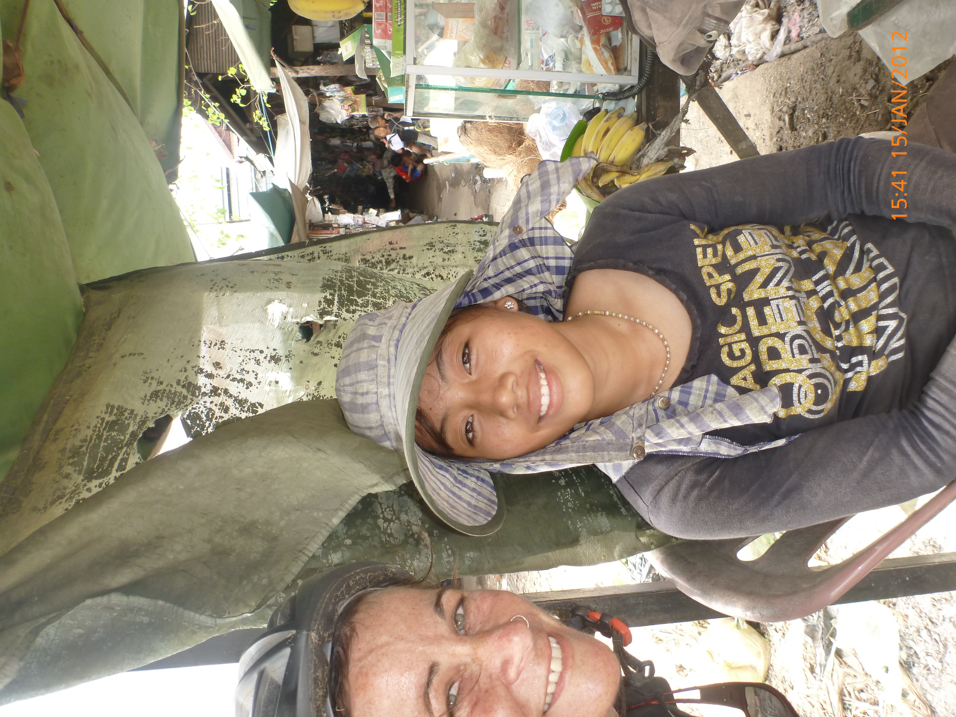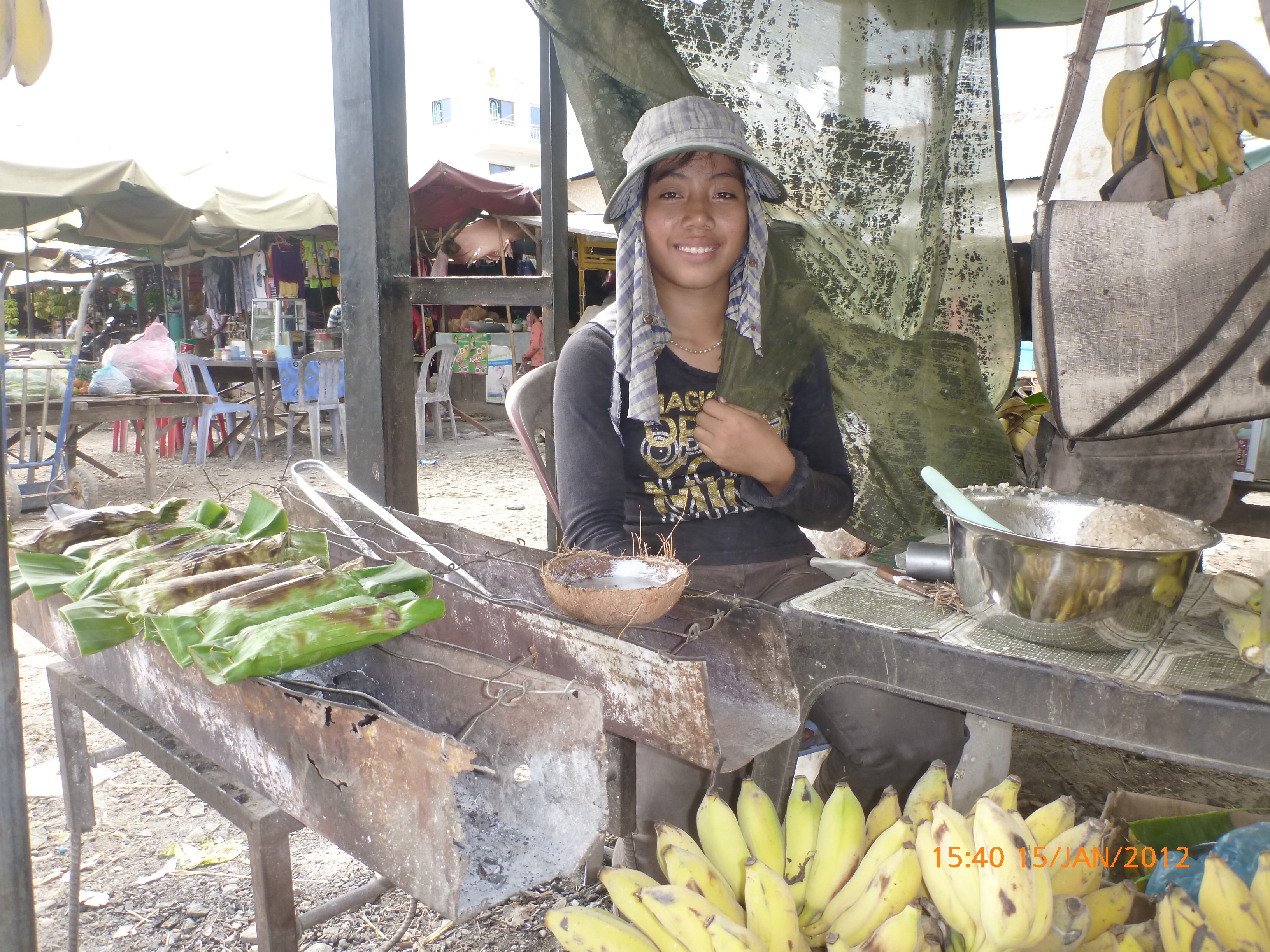 Today’s been a bit tricky. The signage out of Phenom Phen gave me an initial means to get out on the right road but all road signage stopped after that. Like all road signage. I wasn’t sure if I was on the right highway as there’sthree heading out in a similar direction at first and I didn’t know how many kms I was at during 6the day which made it all a bit challenging. What that did mean was lots of stops to try and get some orientation. The frist 3 hrs was spent pretty much trying to find the highway and I got such mixed directions so went in circles around outer suburbs. Directions were from police and tuk tuk drivers and shopw owners and no one really helped. It took this young lad scratching a map on the concrete to get me on track he was a resourceful jet and I think Id still be finding my way by headtorch by now if it wasn’t for him darling chap. Gave him the biggest hand shake. One police man was incredible drunk and the other just said ‘no’ and sent me in the opposite direction nice. Once on track I stopped for breaky and bought a banana wrapped in coconut sticky rice and baked in a banana leaf on the grill. And yes it tasted as good as it sounds. The girl was really sweet and I scored a photo wioth her. I had another stop to check where I was at the village café where all these men were hanging out and very not sure about me popping in. They all stood round the bike poking and discussing Rube and eventually agreed that she was a good thing. I got nods of approval and warm goodbyes so she was definitely a crowd pleaser in the end. Pretty much the road spat us out at 4.30 in Takeo with the first road sign saying I had arrived crazy. Distances are another funny one. The whole day was 20kms. One fellow even said 13km. It ended up being 78km which I saw on a sign heading back to Phenom Phen from Takeo. I found a great guest house with a balcony right next to the main market area. Really lively and good atmosphere to people watch. I’ll have a picnic out there when I head back to savour my last night in Cambodia. And what best ways then taking in the sounds and business going on of the local psar yay. Found an internet café and uploaded the last of the photos. It’s nice to round Cambodia off before heading in Vietnam. One door closes another opens awesome. Cambodia has been it’s own identity so different to Thailand and Laos. I’ve loved how it’s really stretched my comfort zones and challenged my perspective. This is one of the key things I’m after travelling the way I am so thankyou Cambodia. It hasn’t been comfortable but I take away all good stuff you have shared. Miss Jane and Blue Dog have kept a real low profile finding their feets over the initial weeks but they were keen to check out the view from the guest house when they heard me oooíng and ahhhhíng. It’s good to see they’re stepping out of their comfort zones too 🙂 Time to upload this post attach photos and head back for dinner hungry yay. Talk soon x