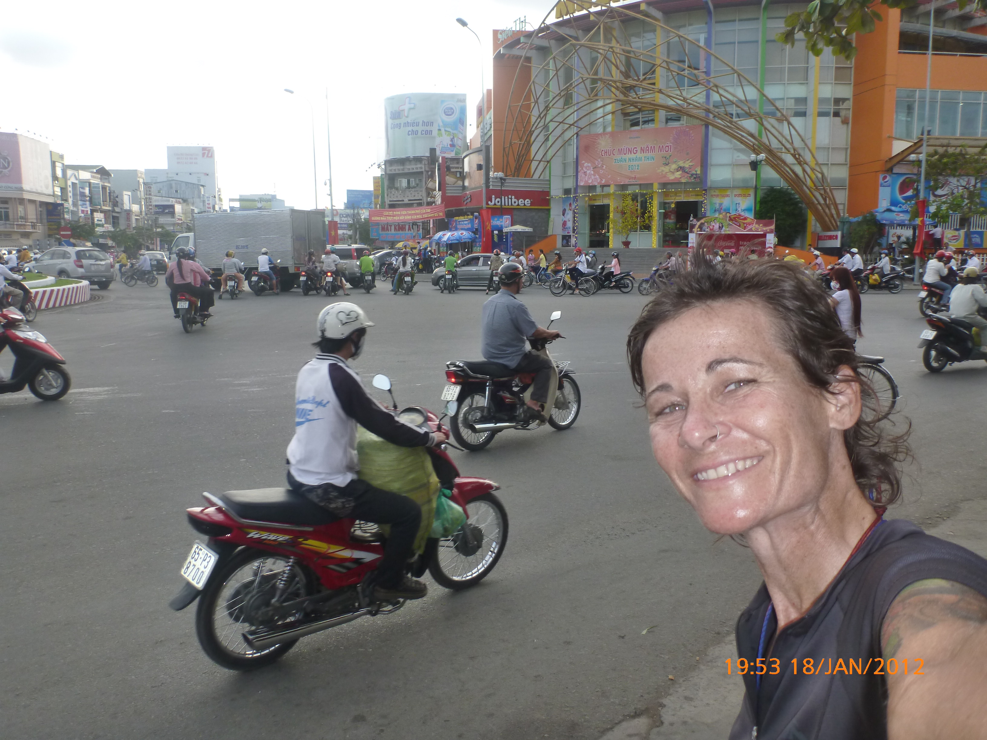 Day 49 1031 days to go. Distance: today 65km total 2454 . It’s 11.56am Wednesday 18/1/2012 Cantho. Or at least I will be in about an hour. It’s 6.36pm and now I’m in Cantho. That post entry wasw very short before I was wonderfully interrupted by a local gentleman who served the transport vans in a town I passed through about 20kms short of Cantho. I love stopping in amongst the real folk. You know where there are those working hard just to keep their heads above water if so lucky. I find these folk the most real whatever the country. I find them the most real to interact with and genuinely wanting to know more about me in a way particular to the person that interests them. Todays a good example. In the town I stopped for lunch there’s heaps of cafes but what appeals is the small two chair roadstall cafe opposite the petrol station where the transport vans are pulling in and out. There’s an old lady there watching intently as the vans pull in the draw a customer. I asked her for hot water as I saw she had a flask, paid her 25c (5000 dang) and went to sit on the nearby kerb but she insisted I take one of her seats. She just sat and smiled and watched me eat my banana baguette. When done I started to post and pone of the van people came over to talk where I was from and where he want to travel to using a combination of his minimal English and map drawings scratched on the concrete. It drew a couple more lads. I love it and get so much out of their genuine effort. They don’t want anything just to talk. In Cantho I was in a supermarket (there’s that supermarket fettish again) pricing up honey options and this little girl came up watching me. I said hi and frightened her off. Then her father came up introduced himself and his daughter to me. I went to shake her hand and she took hold of my hand with both hers and squeezed. It was really beautiful sweet little thing. I spoke then with dad his English was ok. He wanted to know where I’m from and heading to and why and what I was wanting in the shop and what I thought if Vietnam etc. Whatever I said he’d repeat and nod then fire the next question at me. 30 minutes later he thanked me for my time and wished me a safe journey, shook my hand and left. Awesome I love this stuff and will never tire of this simple interaction. Today was a hard cycle not long but a strong head wind and Rubes only had 2 gears working without slipping which made it a bit tricky. It was only 65km so it passed soon enough. It was mostly urban sprawl today I passed through with no major highlights as far as scenery but I was happy to potter along and enjoy the ride flashing and/or exchanging smiles with passer bye traffic of all sorts. I have a real soft spot for truck drivers. They mostly travel in twos and its usually for the passenger to hang out the window and give me a big hello and thumbs up. Despite being the most ‘horn crazy’ they are always considerate passing by such a welcomed change to experiences back home whereby truck drivers can be a bit smart arsey. I’m going on a bit about the traffic of things tonight probably because it really interests me and the psyche of the people is very reflective on the roads. There is never a dull moment and Ive quickly learnt how to move through the chaos as best I can. You cant wait for a break in the traffic as there is none it’s about merging, peripheral vision foremost and adjusting your speed as opposed to direction to blend to where you want to head. Its really crazy stuff and I enjoy the skill and thrill of it. I’m very fortunate that the road users in south east asia are very used to dealing with the unexpected and I have not had any close calls as yet and hope it stays that way. One day, one pedal, one post at a time. It’s a true gift what I’m doing and I intend to savor and squeeze what I can out of the simple opportunities as they present. It’s very cool and I hope you’re enjoying the ride with me. Cantho is very busy with local tourists visiting for the Chinese New Year that apparently starts soon. It took me half dozen checks to find a hotel that would take me for one night and/or had vacancy. I ended up finding one for $7.50 bit more than I’m used to paying but it’s got wifi, air con and hot water so I’m spoiling myself and have even shaved the legs (you probably didnt need to know that but hey we’re all friends here). I’ve planned a skype date with my partner in the morning awesome then it’s onto Mytho 105km. I’ve put my nose in the bike manual this afternoon and got Rubes gears working again so that’ll make it a more comfy cycle all going well. My sister’s been doing some looking into the Chinese New Year this year being the year of the dragon. I’m going to share some of the info she’s shared with me interesting stuff. Hope you enjoy. Talk soon. x