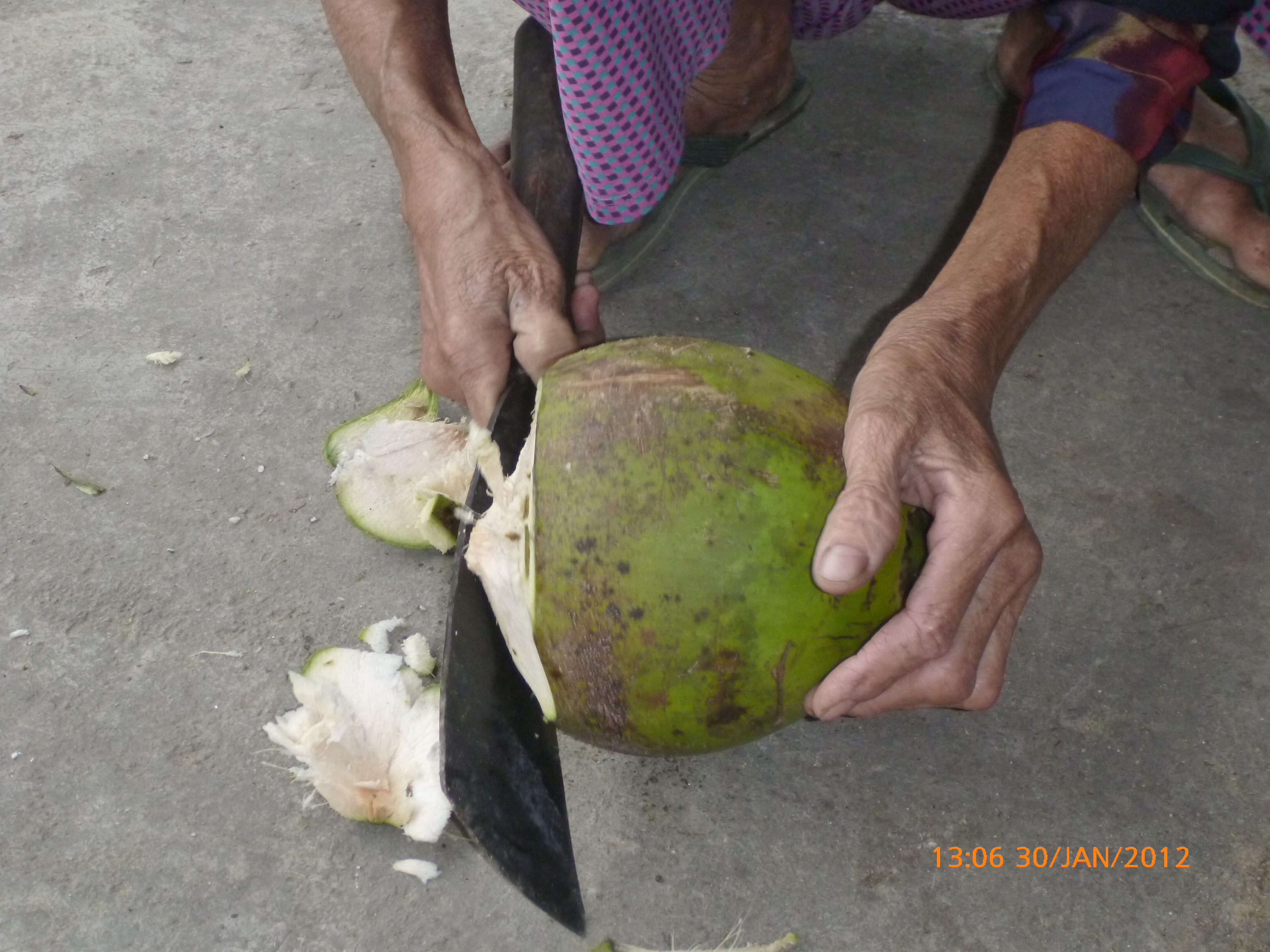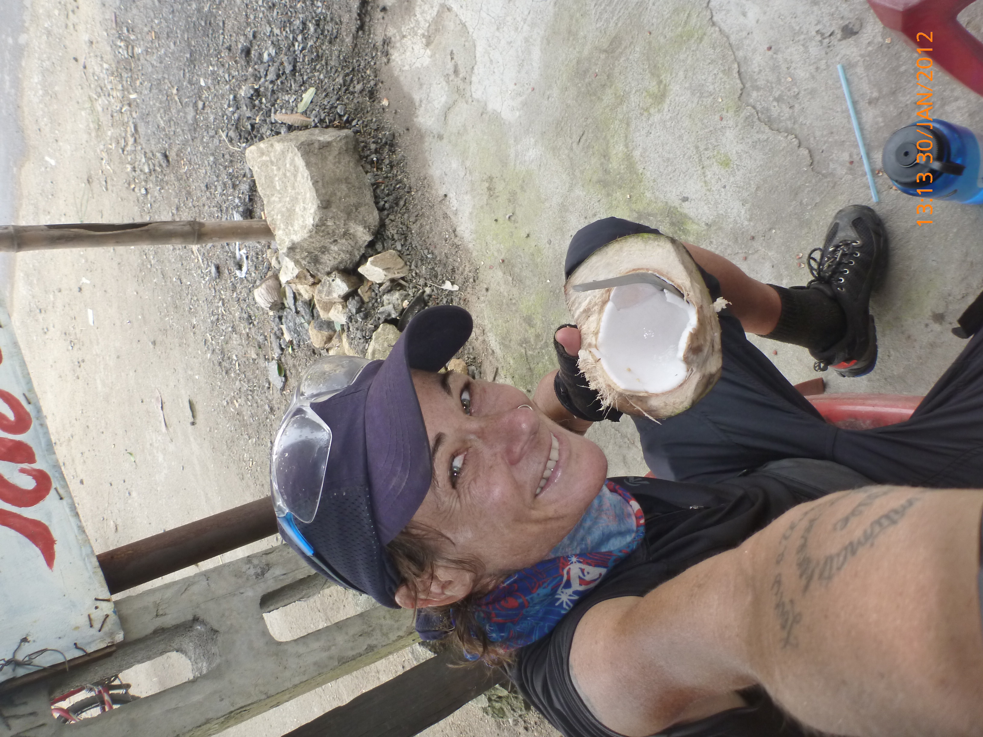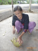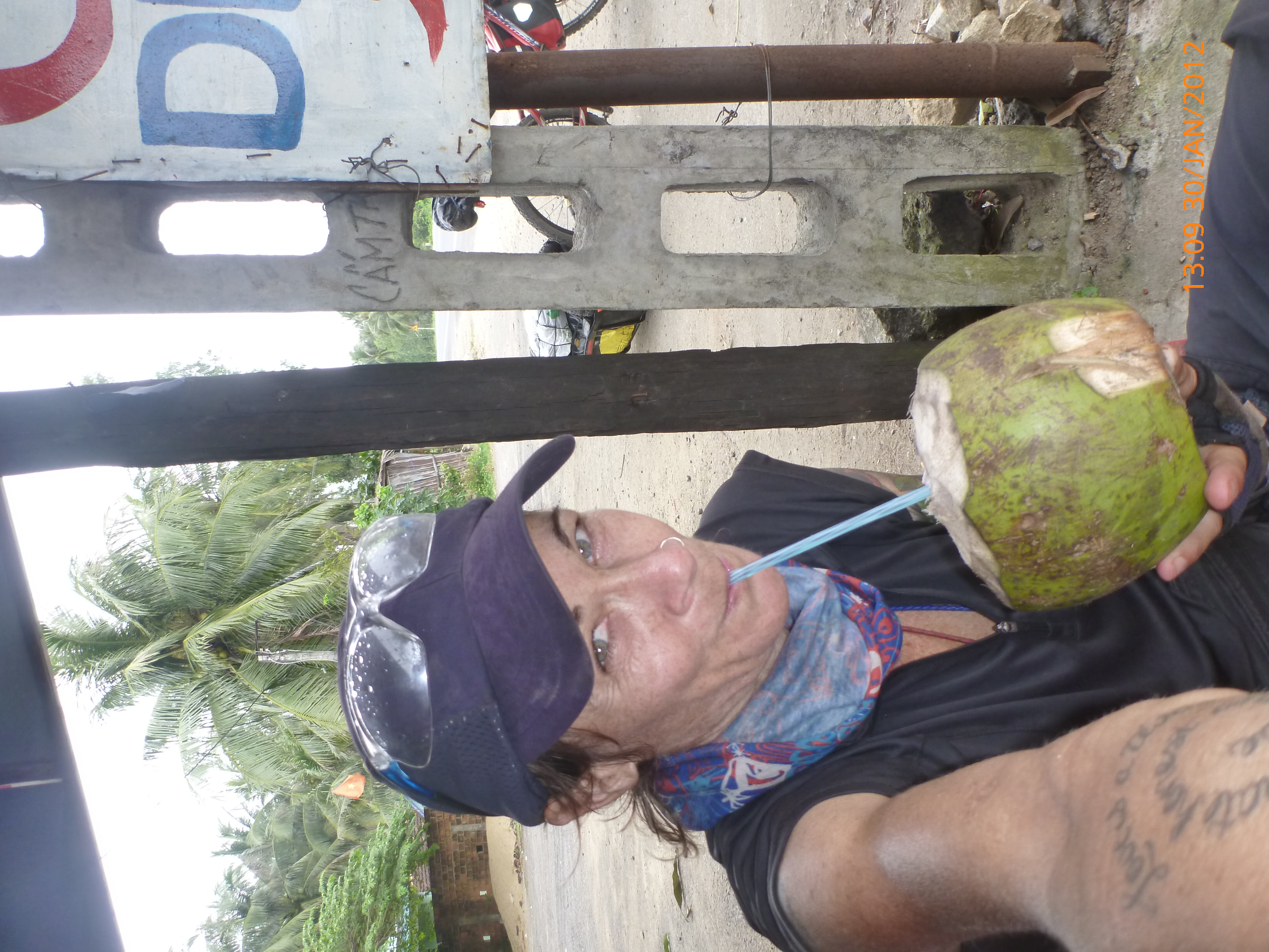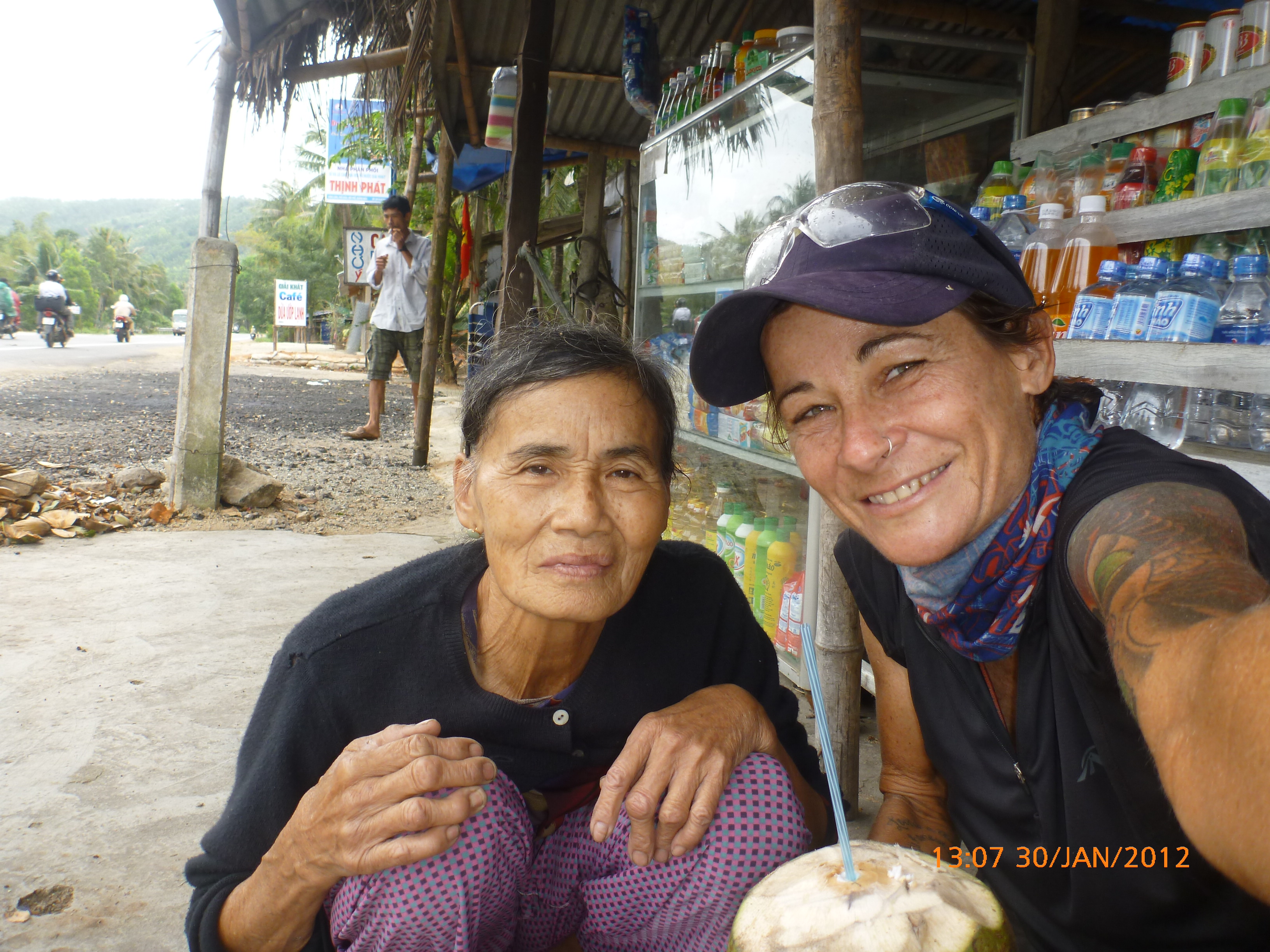 Day 60 1020 days to go. Distance: today 97km total 3453km. It’s 5.00pm Monday 30/1/2012 Quang Ngai. Hi there. One more day to go one more day to go one more day to go. Do you get I’m a bit excited yayayayayayaya. Can’t wait to see my friends in Hoi An nd guess what….. one more day to go J Oh dear it has been a big few days. I’m sooo happy with myself to have gotten this far in the time frame and now between 125-130km to go (not sure haven’t seen Hoi An come up on the highway yet) it’s one good days ride to get there, but only one. Then I’m socializing and out of the saddle for a couple of days. That sounds so good to be away from the highway and in a good space to recoup a bit. I’m so fried from the mental and physical challenges I know my edges are a bit frayed and patience a bit wayward. There have been regular blasts of verbal and horn aggression from the mixtures of folk on the road. It’s horn first regardless of need followed by a myriad of abuse. I have no idea what they’re saying but the message is the same. Its clear I’m a hindrance and a good sounding post for road rage Vietnamese style J. I’m totally saturated by it and my filters clogged. I’ve had to shut down a bit over the last 2 days just to get through the kms without blowing a stack. And even then I’ve had my moment’s opsy. This lad this afternoon wanted to talk the last 10kms into town which was all very nice and welcoming but amongst the chaos on the road I eventually said goodbye thanked him for his conversation and asked him to move along so I could deal with safely arriving in town and finding a place to stay. He was riding his moped alongside me and it was becoming dangerous as he traffic temp turned up getting closer to town. He didn’t get the hint and proceeded to ask me out and stay at his place bla bla bla you get the idea. No meant keep trying and after another five minutes I had to raise the voice to make it a bit clearer to him to go away. Still no response. OK angry now. Lets say yelling words to the effect of ‘go away’ did the trick but raised the cranky richer scale up too high so it was time to find a bed for the night. The saying is ‘don’t ride angry.’ There’s no longevity in riding safely if I go that path so I was relieved to stop. The timing was perfect. I found a roadside hotel for $7.50 just before the 3km turn off to the city so no backtracking in the morning yay. I’m all cleaned up and perfumed now even plucked the eyebrows J to be socially more presentable tomorrow so feeling human again and that’s a good thing. Rube and I headed into town and found this internet café so awesome chance to upload photos and update the blog before Hoi An. There are some beautiful photos from the coastal ride the last few days it’s really good to get them attached to the blogs. The speed is awesome. The place I stayed last night had wifi but the connection was dodge so my partner and I didn’t have the best of skype chats this morning (Sorry darling). We’ll make up for it Wednesday morning in Hoi An yay. It drizzled all day today with a headwind for most of the day bugga. I had lunch earlier to keep the calories up and that worked allot better. Yesterday I left it a bit late and had a no brainer for the afternoon which made it tougher than it needed to be. Ive heard that coconut milk has awesome electrolytes. That was my treat and highlight today. I stopped at the little roadside stall where I spotted this old couple sitting. They were so welcoming and helped me select a coconut. She skillfully stripped and cut the husk with a machete and made a small hole in the top and handed it to me with a straw in it. It looked great and was devoured. I’ve never had fresh coconut milk before and it tastes yum. Once that was devoured the machete was still sitting on the ground so I tried to cut away the hard outer to get to the pulp. It’s allot harder that they make it look. Much to their amusement they rescued my crap effort and went about in moments cutting it in half for me to eat the inside flesh. The man handed it over with an Asian curved metal spoon perfect for scraping out the inside. Again it was delish and a great calorie hit. They offered me to wash and have a sleep in their single hammock. As tempting as that was I thanked them immensely and headed back on the road for the remainder of the kms. The photos are all uploaded now so I’ll leave it there and get to attaching them. Tomorrows an early start to get through the kms and into Hoi An at reasonable o’clock. Talk soon x