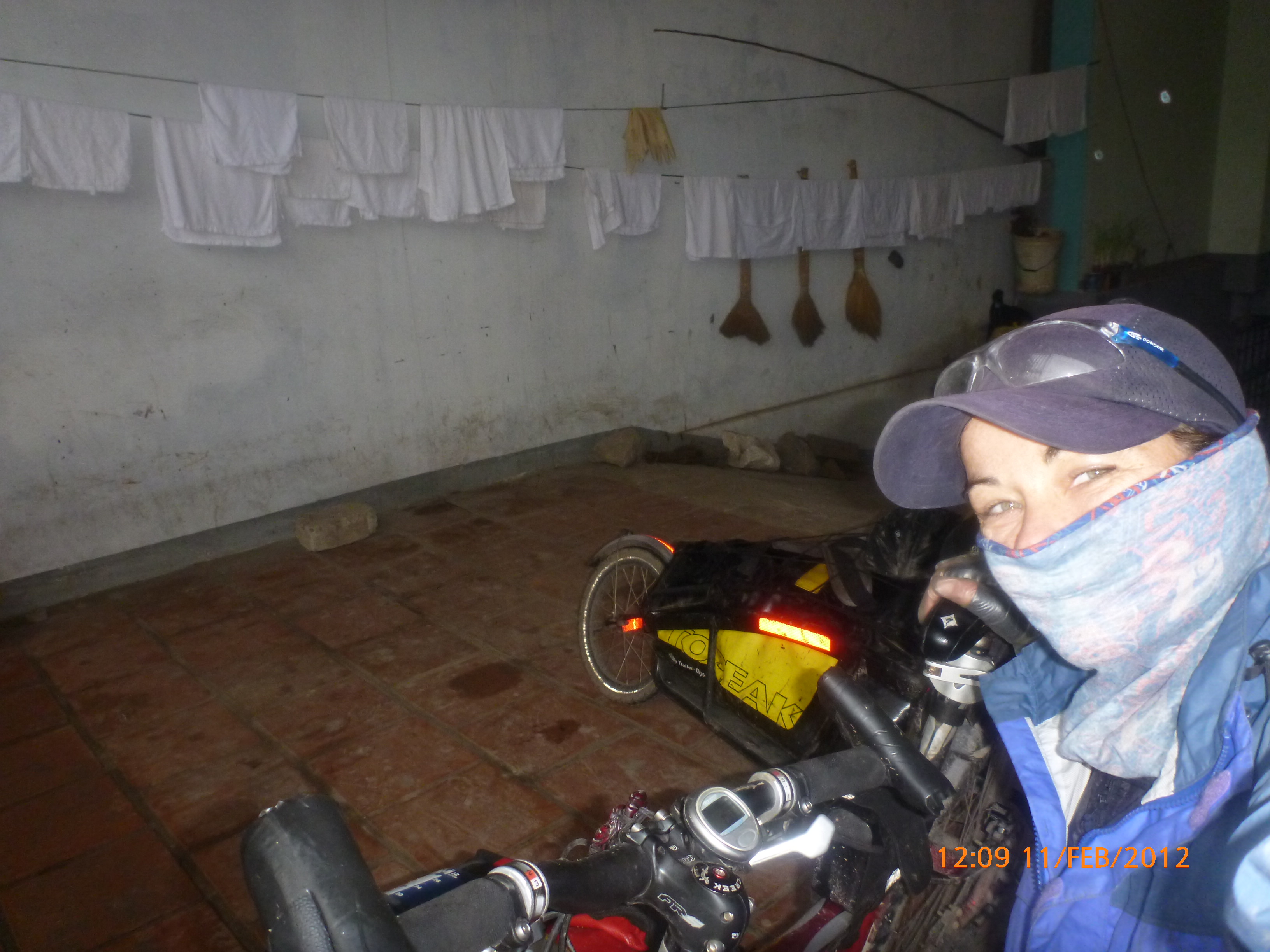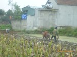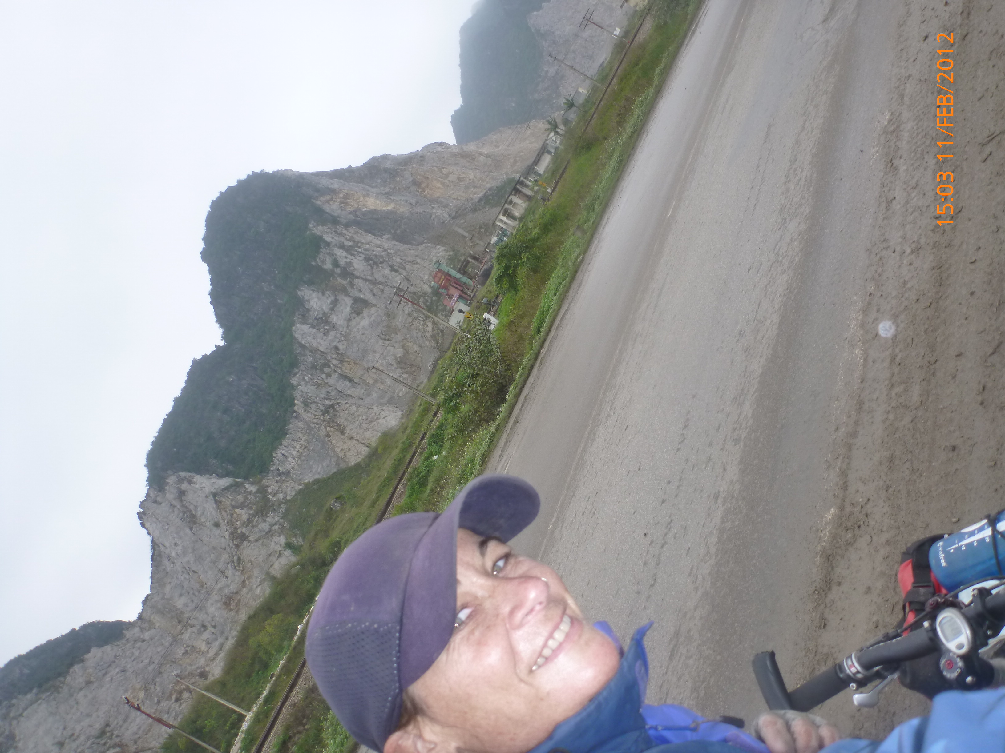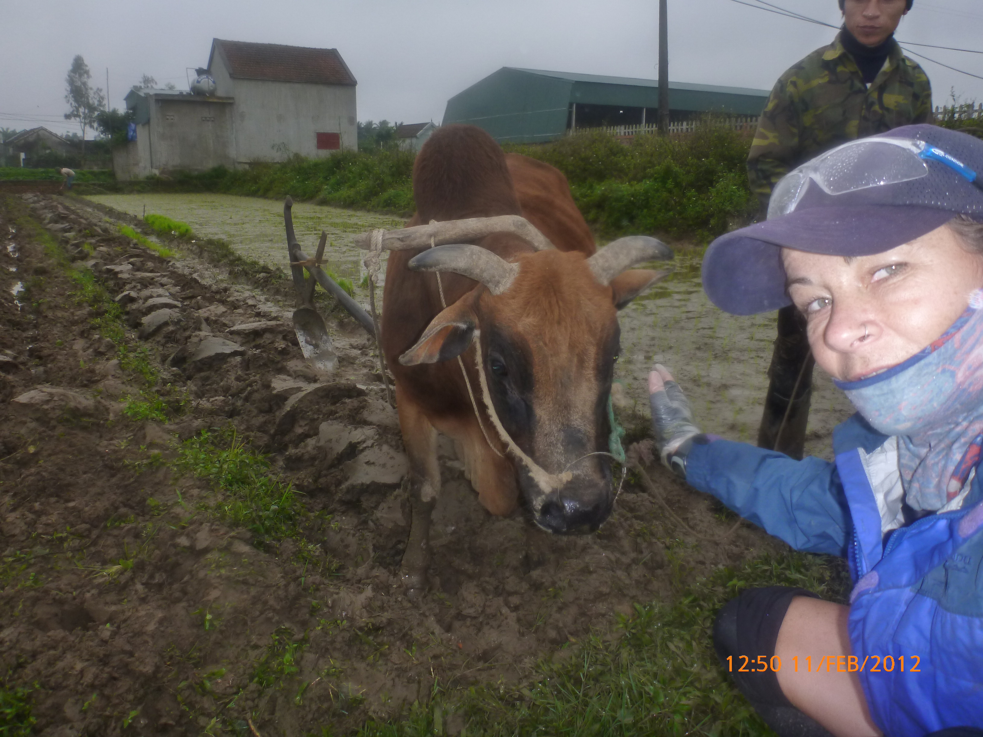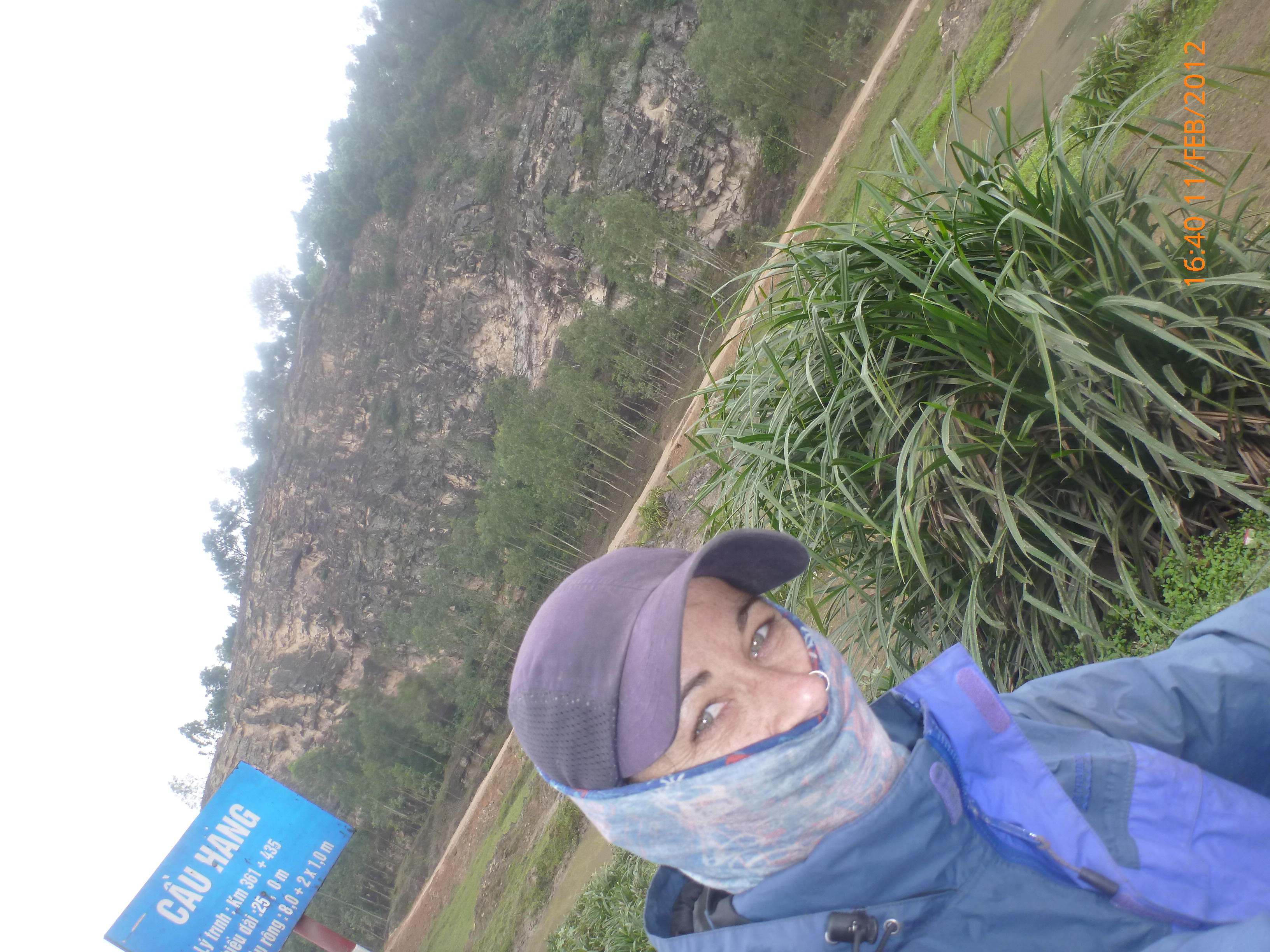 Day 73 1007 days to go. Distance: today 105km total 4271km. It’s 6.30pm Saturday 11/2/2012 Thanh Hoa. Hi hope the Staurday finds ou all happy and in a good place. Today has again been rainy and the road conditions a bit crapola. It’s so evident we’re getting closer to Hanoi with the volume of people and road traffic increasing over the course of the day. One positive is that there was little headwind yay so gave the brain a chance to deal with the other which was appreciated. Earlier on was more of he farming land that has dominated the landscape in between towns. It’s very open and flat and rice paddies as far as the eye can see. People are skin deep in water a resiliantly planting new harvests in a weather. By the roadside are the workers parked mopeds and bicycles and they are literally head down and wet bottoms up busy at it. Some stop and check out the passing cyclist for interest sake and others great us with a huge wave and ‘Oy.’ This is the prefered term of greating amongst folk. It’s taking me a litle to get used to but it’s meant in a positive way despite sounding very abrupt. Woman and men alike use it to get attention and it works 🙂 Earlier on I passed this young fella using a beautiful big cow to pull the plough he was using to dig fresh rows and plant more corn. He had the loveliest smile and I stopped to watch him hard at work. He stopped and I went down to the field to say hello and meet his huge workmate. The lad was so shy but happy to have interest in what he was doing. I told him how clever he was and he got that I was being friendly but he was all shyness so I left with a handshake and happy to have stopped. The landscape started to change with limestone hills appearing amongst the fields. It looked great in the mist. I had a break and watched this mother and baby cow walking a path in front of the brown coloured hills. They blended so beautifully and with the green and mist is looked cool and was a nice chill out time between the kms. The architecture of the homes are becoming classic french colonial mixed pastels and state of decay. It’s odd having such grand style buildings as farm houses. The towns are more urban sprawled with the same style homes and indicative of the top end of Vietnnam from what Ive read.Hanoi is very much french colonial and it’s showing early signs as we get closer. We’re less than 200kms away from Hanoi. I’m doing a side trip out to the Cuc Phuong National Park and looking forward to enjoying it’s wildlife reserve and natural environment campng if I can. I checked out google maps tonight and there appears to be two alternative roads out there with terrain pretty flat on both options. We’ll see tomorrow on the road but I should get there tomorrow or Monday depending on distances. I passed rice fields today with that familiar sound of croaking frogs cool I love that sound reminds me of home when it rains and the creeks run. The frogs go off and have a mating frenzy. You often see white herons busy poking about the paddies I imagine looking for the source of croaks 🙂 They must also get into the rice shoots as there are regularly makeshift scarcrows propped up in the fields. They look great dressed in old shirts and hats on a t-shape stick to add to the effect. My next stop today was brief as this woman stood nearby gesturing I thought for me to eat but it ended up she wanted money to buy food. I offered to share my lunch but she wanted cash so I politely said no and left. We’re staying on the outskirts of Thanh Hoa close to where the highway continues on tomorrow. Ninh Binh is only 65km away and it’s north of there where limestone karst country starts again. Ive heard from other cyclists I’ve met theat the area is beautiful north of here so looking forward to seeing how it unfolds tomorrow. Toniht I’ll upload the photos from the last days and find an ATM to get some cash out if it turns out we can get to the National Park tomorrow. That’s about it for tonight. Not sure what sort of internet access I’ll have over the next days but I’ll keep posting and upload them when I can. Talk soon x