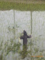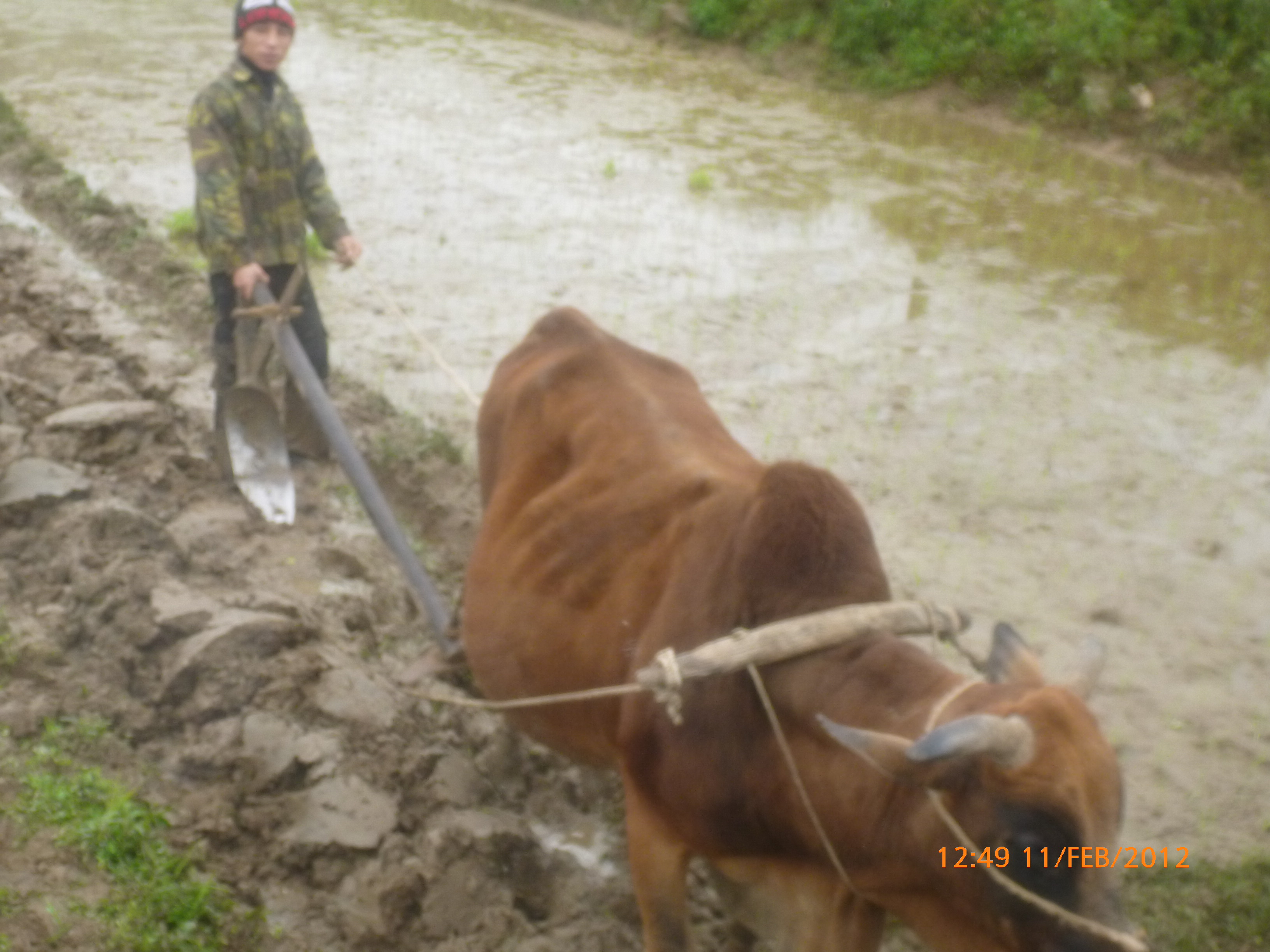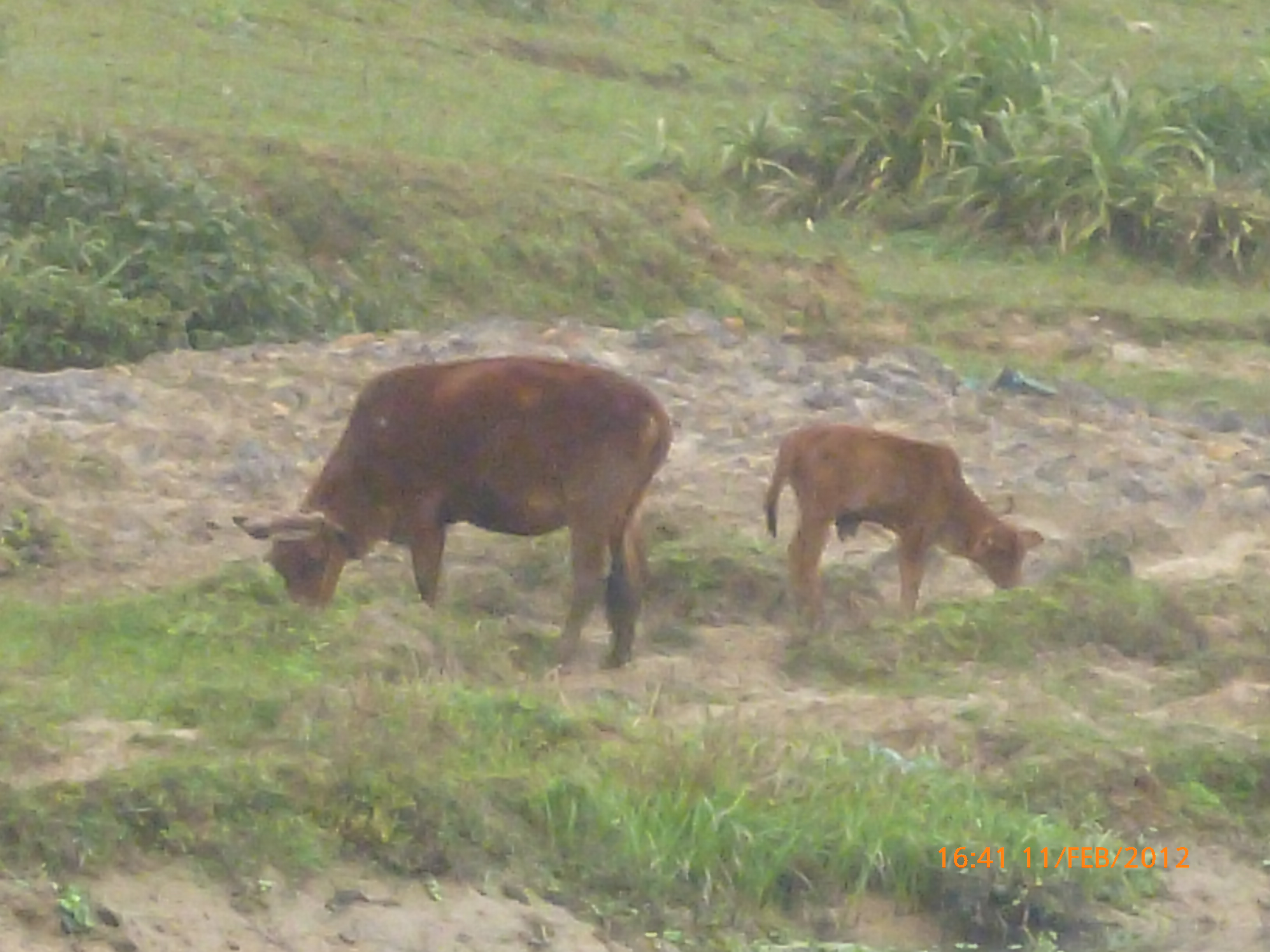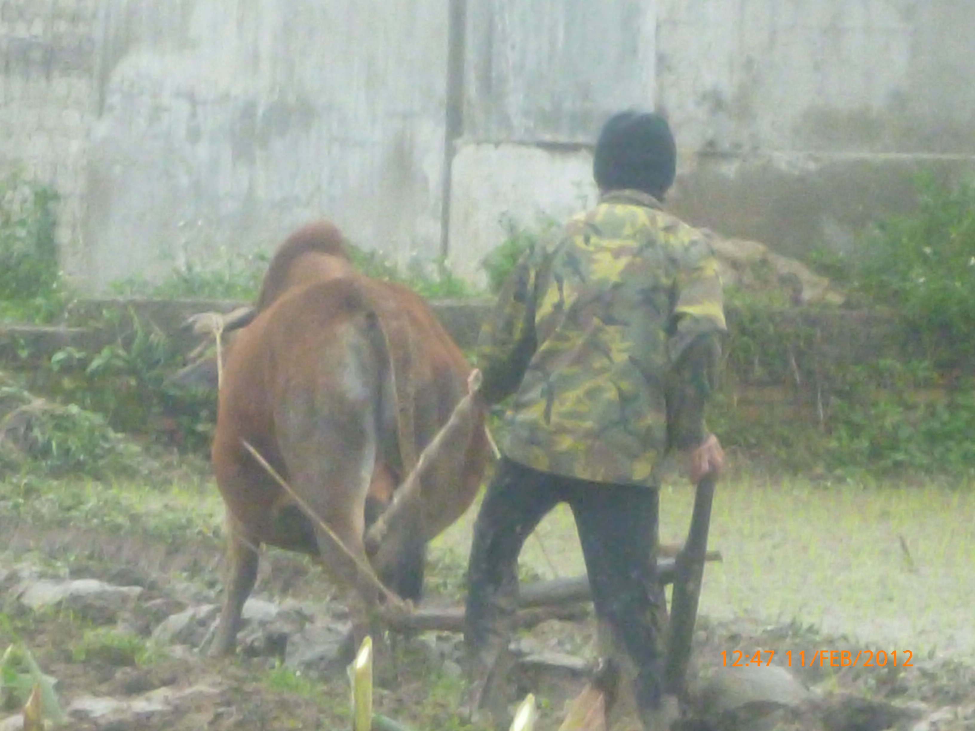 Day 73 1007 days to go. Distance: today 105km total 4271km. It’s 6.30pm Saturday 11/2/2012 Thanh Hoa. Hi hope the Staurday finds ou all happy and in a good place. Today has again been rainy and the road conditions a bit crapola. It’s so evident we’re getting closer to Hanoi with the volume of people and road traffic increasing over the course of the day. One positive is that there was little headwind yay so gave the brain a chance to deal with the other which was appreciated. Earlier on was more of he farming land that has dominated the landscape in between towns. It’s very open and flat and rice paddies as far as the eye can see. People are skin deep in water a resiliantly planting new harvests in a weather. By the roadside are the workers parked mopeds and bicycles and they are literally head down and wet bottoms up busy at it. Some stop and check out the passing cyclist for interest sake and others great us with a huge wave and ‘Oy.’ This is the prefered term of greating amongst folk. It’s taking me a litle to get used to but it’s meant in a positive way despite sounding very abrupt. Woman and men alike use it to get attention and it works 🙂 Earlier on I passed this young fella using a beautiful big cow to pull the plough he was using to dig fresh rows and plant more corn. He had the loveliest smile and I stopped to watch him hard at work. He stopped and I went down to the field to say hello and meet his huge workmate. The lad was so shy but happy to have interest in what he was doing. I told him how clever he was and he got that I was being friendly but he was all shyness so I left with a handshake and happy to have stopped. The landscape started to change with limestone hills appearing amongst the fields. It looked great in the mist. I had a break and watched this mother and baby cow walking a path in front of the brown coloured hills. They blended so beautifully and with the green and mist is looked cool and was a nice chill out time between the kms. The architecture of the homes are becoming classic french colonial mixed pastels and state of decay. It’s odd having such grand style buildings as farm houses. The towns are more urban sprawled with the same style homes and indicative of the top end of Vietnnam from what Ive read.Hanoi is very much french colonial and it’s showing early signs as we get closer. We’re less than 200kms away from Hanoi. I’m doing a side trip out to the Cuc Phuong National Park and looking forward to enjoying it’s wildlife reserve and natural environment campng if I can. I checked out google maps tonight and there appears to be two alternative roads out there with terrain pretty flat on both options. We’ll see tomorrow on the road but I should get there tomorrow or Monday depending on distances. I passed rice fields today with that familiar sound of croaking frogs cool I love that sound reminds me of home when it rains and the creeks run. The frogs go off and have a mating frenzy. You often see white herons busy poking about the paddies I imagine looking for the source of croaks 🙂 They must also get into the rice shoots as there are regularly makeshift scarcrows propped up in the fields. They look great dressed in old shirts and hats on a t-shape stick to add to the effect. My next stop today was brief as this woman stood nearby gesturing I thought for me to eat but it ended up she wanted money to buy food. I offered to share my lunch but she wanted cash so I politely said no and left. We’re staying on the outskirts of Thanh Hoa close to where the highway continues on tomorrow. Ninh Binh is only 65km away and it’s north of there where limestone karst country starts again. Ive heard from other cyclists I’ve met theat the area is beautiful north of here so looking forward to seeing how it unfolds tomorrow. Toniht I’ll upload the photos from the last days and find an ATM to get some cash out if it turns out we can get to the National Park tomorrow. That’s about it for tonight. Not sure what sort of internet access I’ll have over the next days but I’ll keep posting and upload them when I can. Talk soon x
