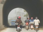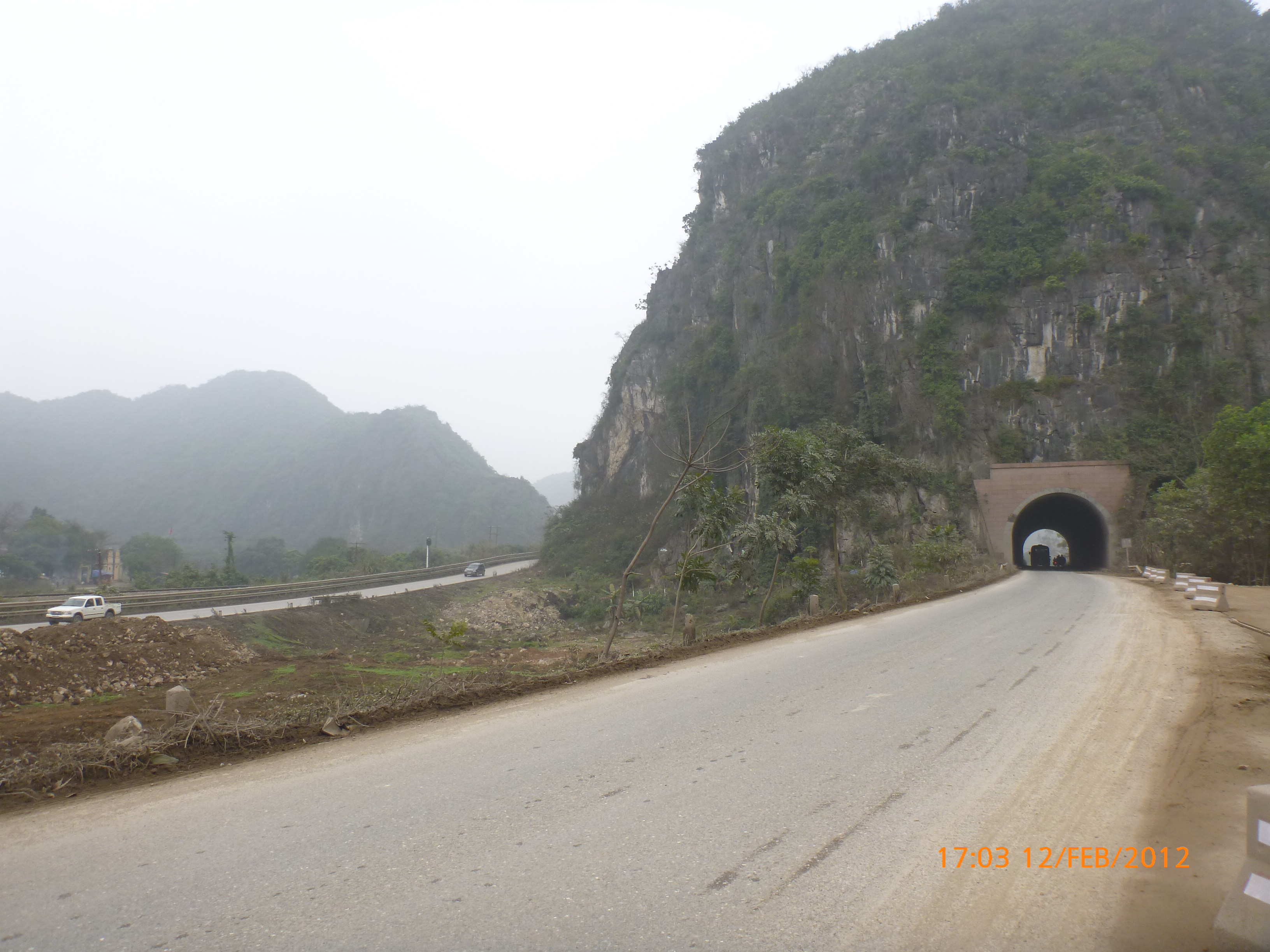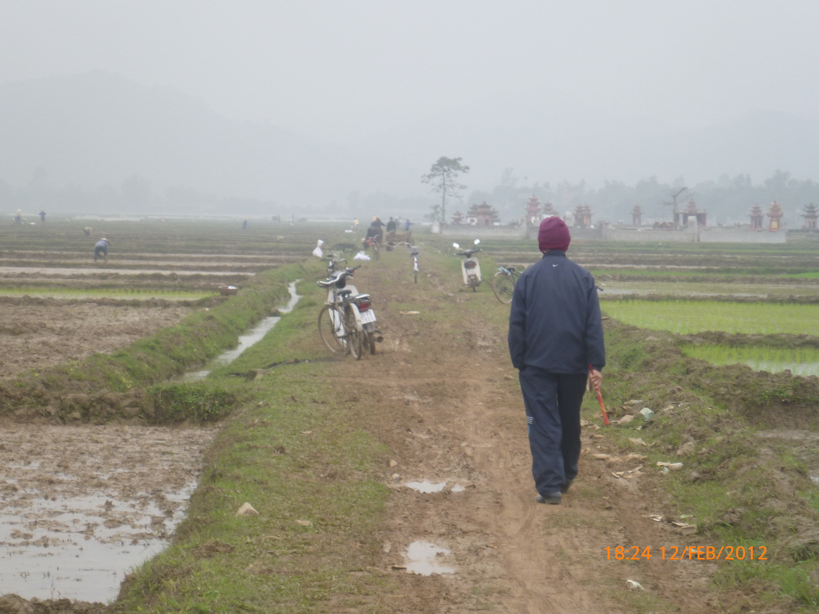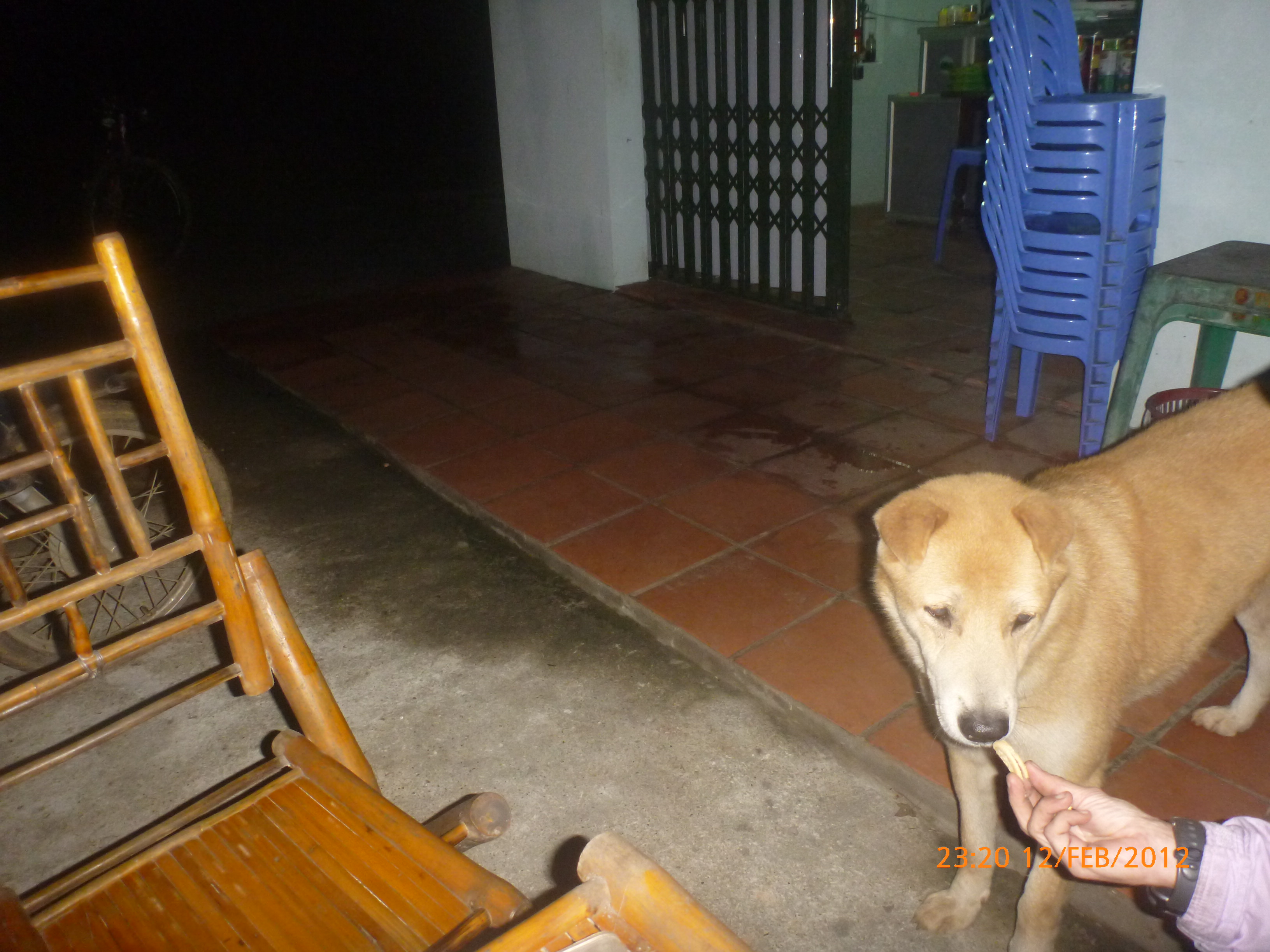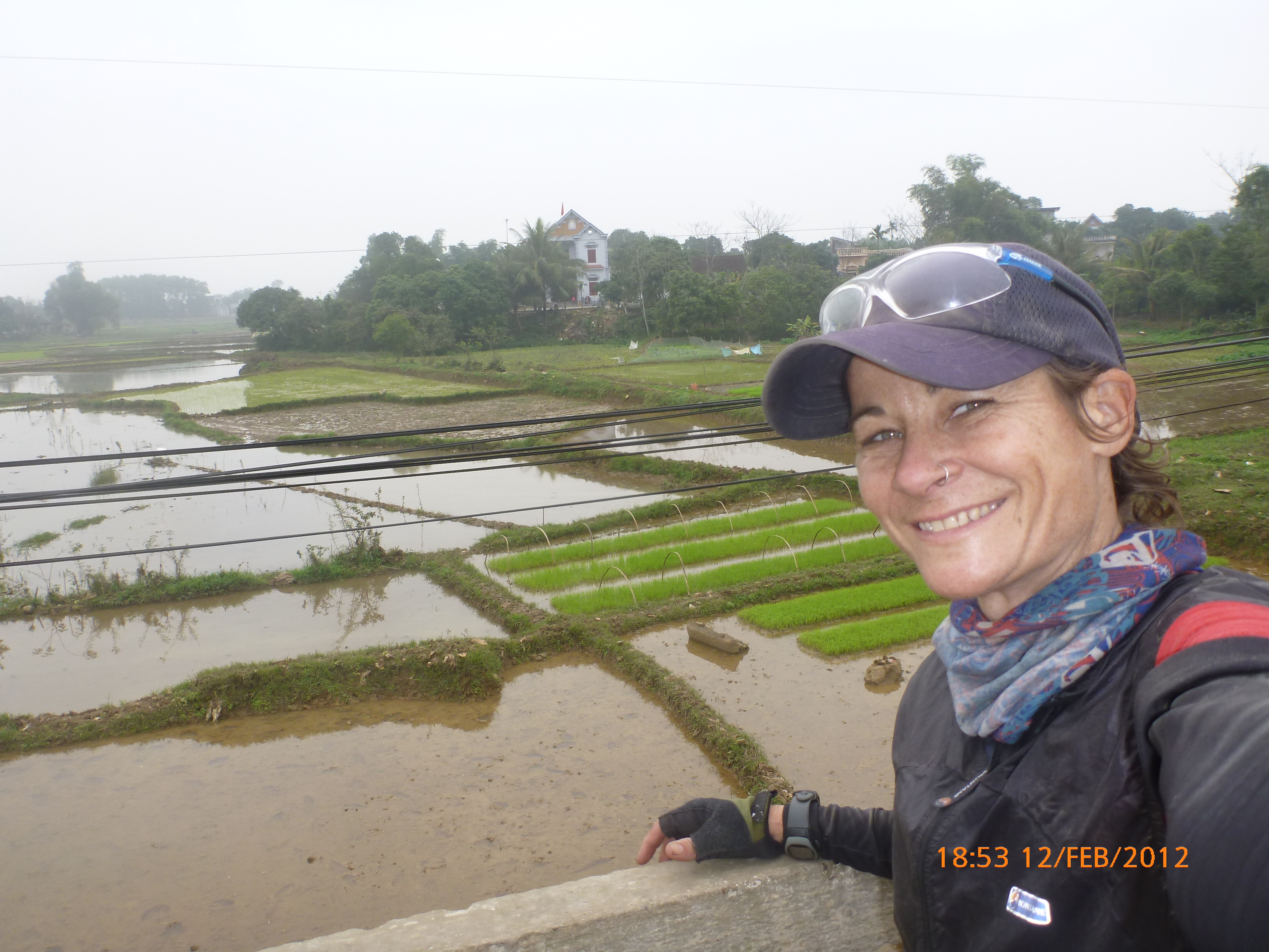 Day 74 1006 days to go. Distance: today 91km total 4355km. It’s 7pm Sunday 12/2/2012 Cuc Phuong National Park. I got here, I go here, I got here!!!!! Sooo happy. I made sure the spot tracker was on it’s full 20minutes so to share in this place. Getting here was a treat. Talk about riding blind. On route I was kinda wishing I had taken more notice of the ‘getting to/from” section when I checked Cuc Phuong National Park on the internet. Oh well! Lots of stopping and asking directions and distances which is always a good thing and fun and I’m here. It was still quite a way to go once I left the National highway on road 12B just after Tam Diep at 3pm, 33km to be precise. Not far in retrospect but when you have no idea of distances, terrain and time it’s a long 33ks. The people were fantastic but. Small small villages very welcoming with lots of waves, smiles and hellos. Their directions were great distances not so. The first fella said 5km to go and 5kms down the track the next fella said 15kms. Bugga oh well. He ended up being pretty spot on. The scenery was great, all karst country very remote with small villages dotted along the quiet road. I was picturing which house I would come back and ask if I could stay if the road didn’t end up popping me out at the park entrance and stocked up on some water at a tiny shop just in case. The old woman at the shop was under 4 feet tall hunched over all smiles and red stained teeth that I haven’t seen since laos. I wish now I had taken photos but I was pretty distracted and a bit anx about getting here before dark. The road spat me out at the park entrance at 5.15pm and I let out the biggest cheer it gave Rube a fright 🙂 The road t-junctioned with a major road that was sign posted Hanoi 120km so that’ll be the full days ride when I head that way. I had incidentally taken the back road here but now that I’ve arrived the ride in hindsight was just beautiful and such a stark contrast to the highway. The traffic continued to be nuts leading up to the turn off. I lost count of the amount of times I got pushed off the road by the trucks and buses. I didn’t know Rube knew such colorful language. I wonder who she learnt that from 🙂 Despite the traffic but it was a real interesting ride. Lots of rice fields as usual but the weather was really foggy with no rain in it yay so it gave the scenery a misty mountains feel. I stopped heaps for photos and just to take it all in which was great. Prior to the turn off we went through the start of limestone karst but the area was full on mining and again interesting to check out. I spotted this woman at one stage up high on this cleared area pulling out the roots and shrubbery before the dozers could get in to do their part. You could hardly see her and I only noticed her because of her movement against the stark hill. The roadside stalls alway reflect what’s being farmed or in this case mined. They were selling all shapes and sizes, polished and raw limestone rock. The towns between were full of such interesting french architecture that I got some good picks of. It was a real mixed and interesting day that I’ve enjoyed heaps and to end up here is a total icing. I didn’t expect to be here until tomorrow so It’ll be great to wake up and get into it. I’m camping in the grounds for $2 per night. I’ll probably stay 2 nights to enjoy the day tomorrow and head early Tuesday morn for Hanoi. What a contrast the city will be after a couple sleeps here. It’s so nice to be camping as opposed to a guest house. Ive missed it so much. Tomorrow I want to go check out the monkeys in care while they recoup from the hands of poachers. There’s also a 8km walk you can do to a 1000 yer old tree for flora junkies. That’s especially for my partner who loves trees. Apparently the parks great for cycling so Rube and I will enjoy having a look around at some stage. It’s just wonderful to be here, camping and amongst nature. I set up the tent and it was so musty I tried to recall when I last used it then remembered it was in Laos the night the police man put us back on the road for a midnight cycle to be ‘safe.’ That seems like forever ago so it’s about time it got aired and used again. What a beautiful place to do just that. Here’s hoping the rain stays away but we’ll see as odds aren’t in our favor. It’s bickies and pepsi for dinner after eating 2 fresh baguettes over the course of the day. We passed a supermarket early on and I stopped for some fresh bread and it was straight out of the oven crusty on the outside and fluffy on the inside and just yum. Tonight I’ve popped up to the small cafe to do my post. It cost a million dollars for the soft drink but who cares. It’s a nice possy to post and I haven’t had a soft drink for yonks it’s a treat and delish. I’ve christened my new head torch tonight already setting up the tent. It’s terrific ma and pa thank you so much xx. There’s two pooches hanging around the cafe and they keep checking out my bickies when I grab one and the paper rustles. Reminds me of a certain two other pooches at home that have very keen ears for tasty snacks in crinkly foil. The folk inside the stall are playing a card game. Cards are so popular here. I often past roadside stalls or shops in towns or folk just sitting outside their homes playing cards in groups and right into it. I confess I’m not a cards fan but they seem to love it. They’re letting out allot of animated gasps and cheers in the background it’s a softer side to the abrupt mannerisms I usually see or on the receiving end of. It’s funny there’s just none of that harshness amongst country folk. Their manner is the total opposite gentle and friendly and open. The puppies keep staring at me!!!! I may have to share my last bicky with them. It’s a shame the fog was so heavy today because you could see the karst hills on the horizon but only just. It would be spectacular if clea