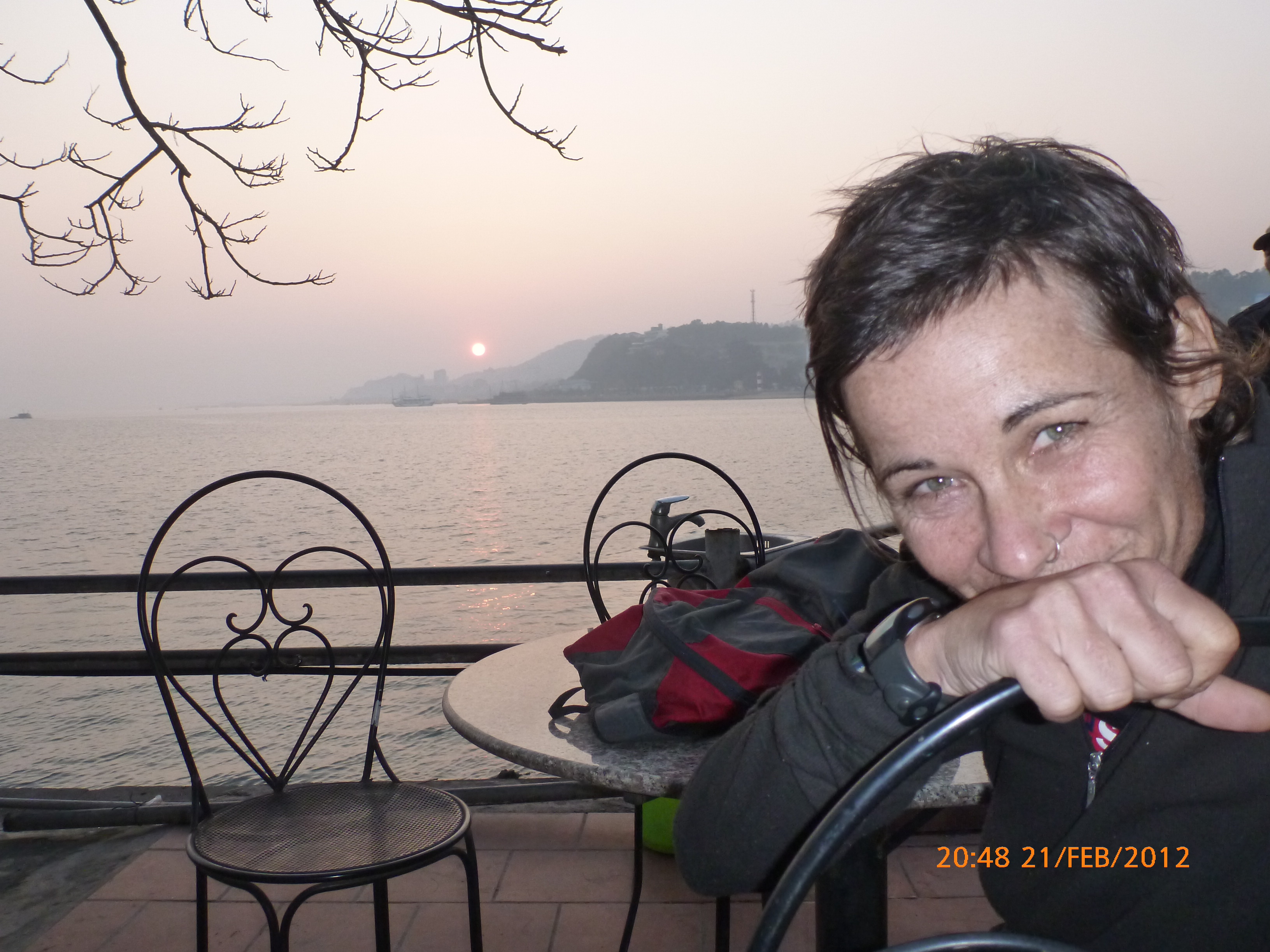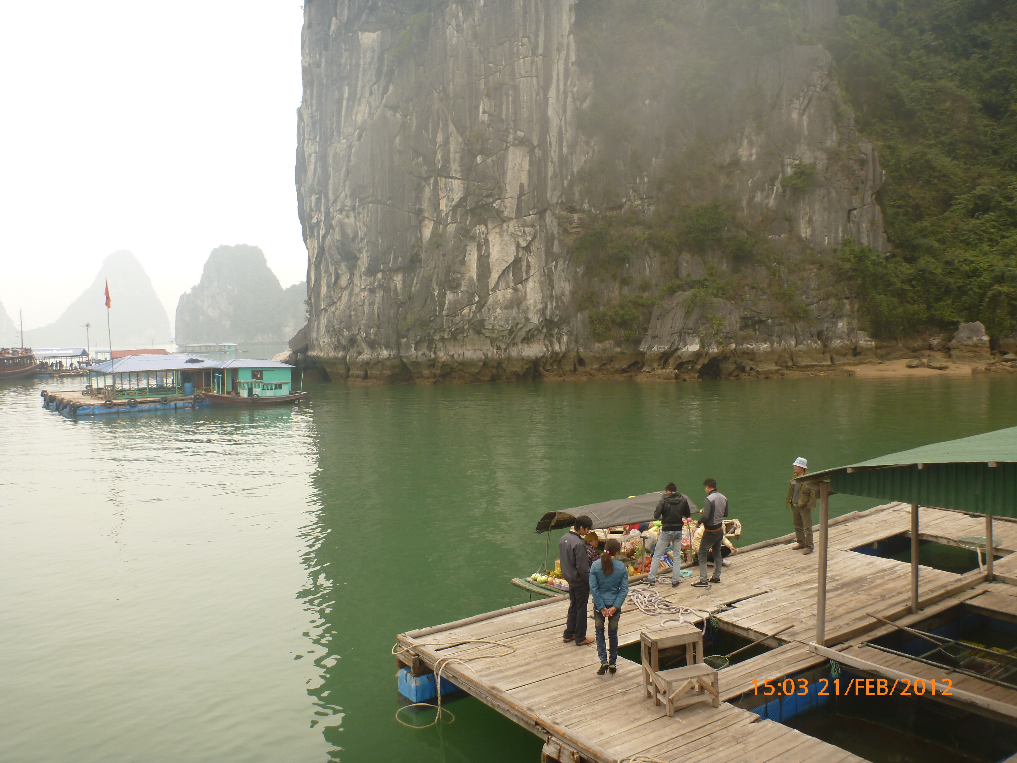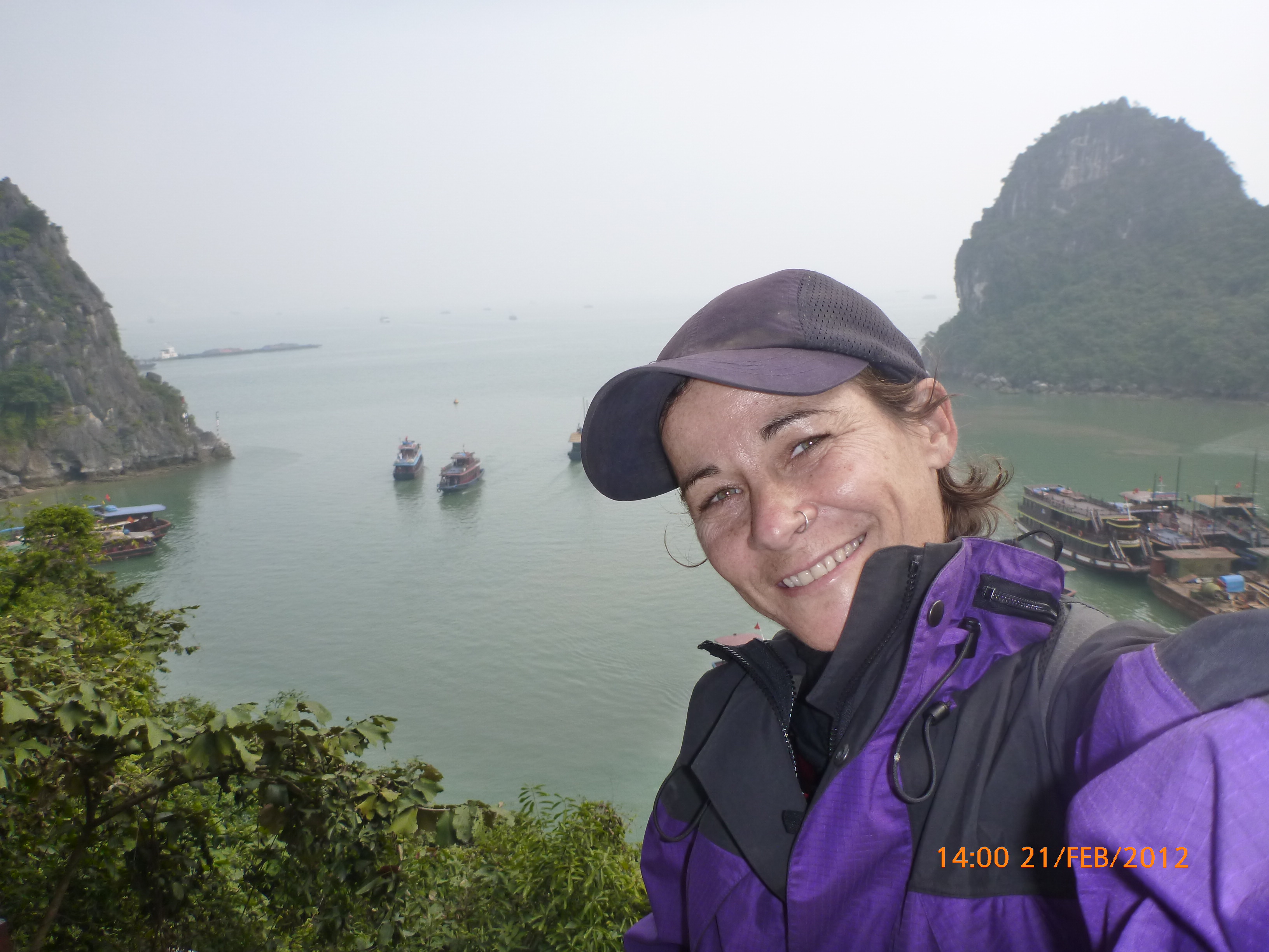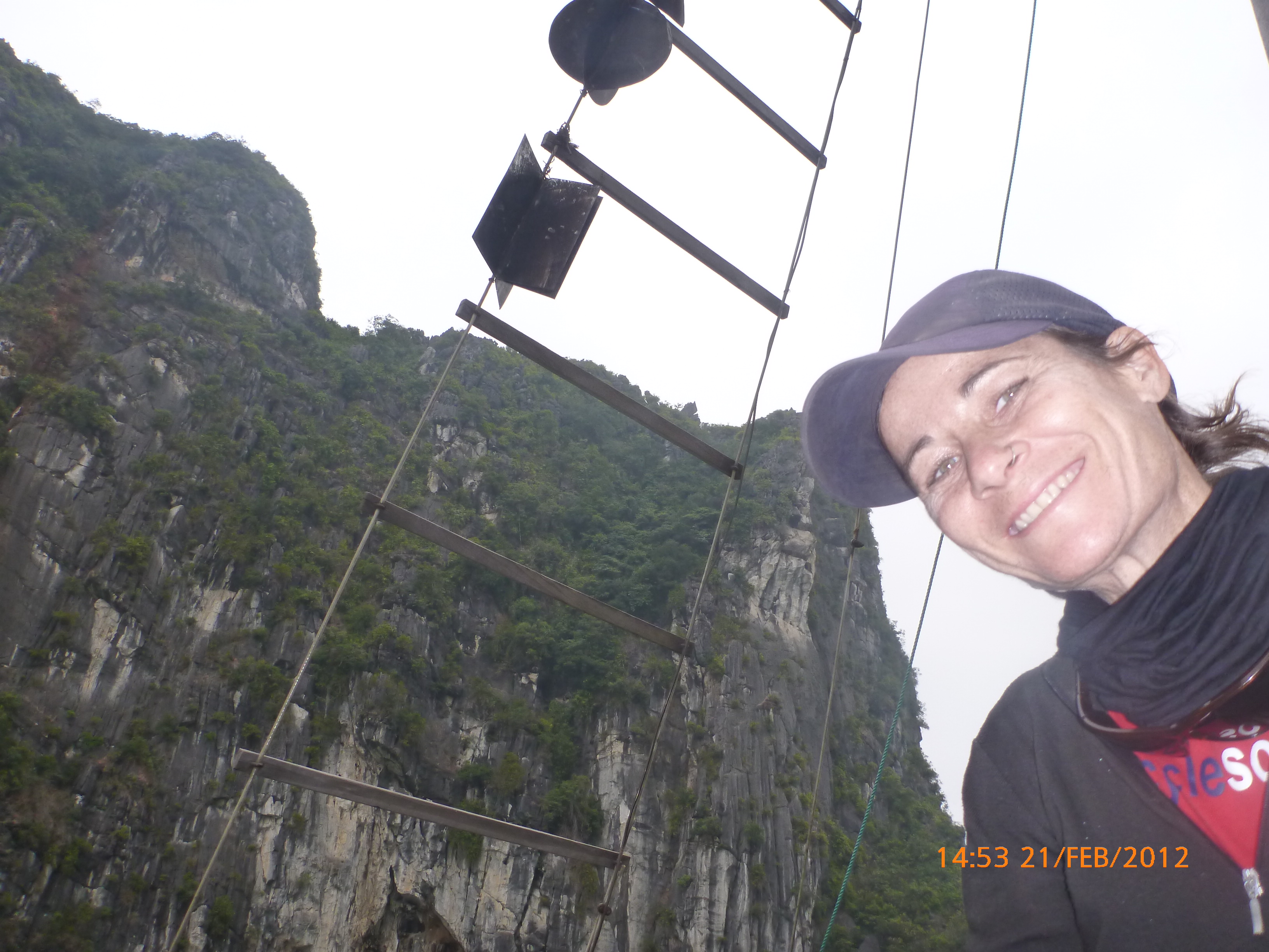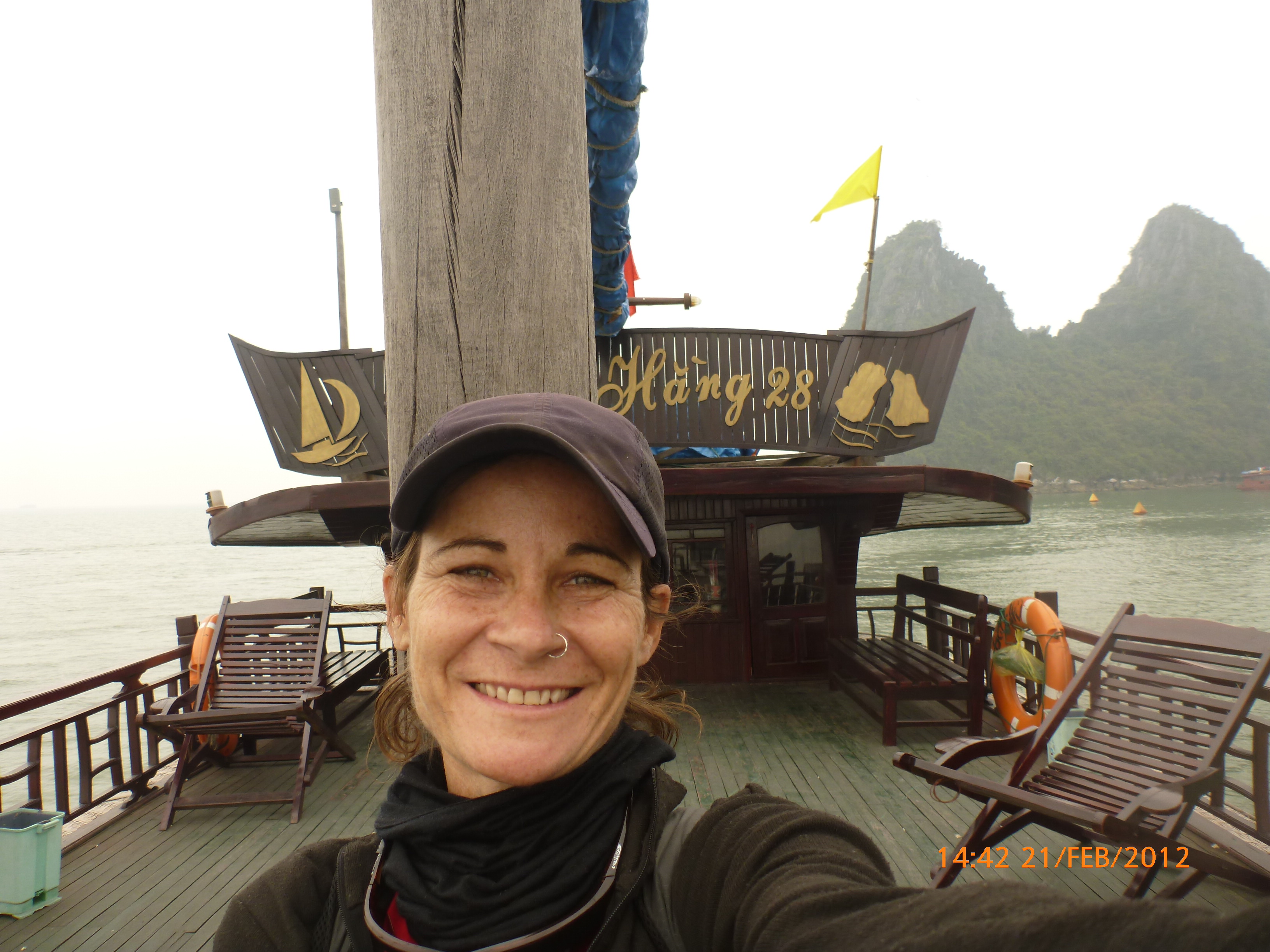 Day 83 997 days to go. Distance today 26km total 4909km . It’s 4.48pm Tuesday 21/2/2012 Hon Gai (Halong City). I was only looking for a WC so I could stop and do my post for the day over sunset. Yes you read right. It’s perfect blue skies this afternoon just t-shirt weather and soooooo yummy. I can feel the body soaking it up as I type. Anyway the urgency was worth buying a coffee. I’m right on the waterfront on the other side of the bridge after spending an awesome couple of hours pottering around the Vietnamese side of town away from the tourist focus. It was just nice to be out and active amongst it so I thought I’d head back over the bridge and see whats about. I firstly sent my next ritual postcard to my buddy Robbie C x I ended up a working class district with the best market. Of course stop time. I had only just started looking and this woman from a shop came up showing me a card with ‘how old are you?’ written on it in english. How totally random. Well that was the start of chaos. Bugger minding the shops it was ‘check out the Aussie’ o’clock. In no time a dozen women were around asking questions for a younger woman who could speak ‘so so’ english to translate. These were her words when I commended her on her English which she learnt in high school. Her name is Do Thu Ha and she is 30 years old with a 9 year old boy who’s smart but a bit lazy. She’s given me her address and asked for me to write her a letter. She doesn’t understand computers or email. Anyway…. chat chat chat laugh giggle poke slap awesome and on it went for over an hour. I tried to take a photo but they all scattered in hysterics. Do hung around with some convincing so at least I have one picky. It felt like an outing with the girls and I loved it. I bought bickies and coffee from Do’s shop to thank her for her translations. Now back to where I started. When I came out of the markets it was blue and hot and it was really startling how changed and beautiful the weather was. Perfect timing for sunset o’clock but I really had to go to the loo. Ive been acting on my sisters advice to drink more water to stop the Miss Piggy blow outs on rest days, so the bladders working overtime. As I said the urgency was worth a coffee so I stopped at this cafe which doesn’t sell coffee. Stubborn Vietnamese always wanting to do their own thing. Sounds like someone else I know all too well 🙂 I showed the lady the coffee sachets I just bought and offered to buy a glass of ‘sow’ (hot water). It was a freebie and now I’m sitting in her cafe with wifi on the water posting to you fine people sipping my coffee bought from Do’s shop watching a sunny sunset over Halong Bay. How good can it get!!!!!!!!!! Photo time. Oh and by the way I haven’t even got onto the boat trip today. This part of the world is crazy postcard beautiful. I know I use that word freely but with all due respect it really is. I have noticed voting forms about with ‘vote Halong Bay as a new natural wonder of the world.’ Does anyone know anything about this? It was overcast but it didn’t stop getting a feel for how magical this area is. Apparently it’s only the start of things now to come heading up into southern china. Enjoy the photos as much as I did taking them. It was like our private cruise. There were only four other people on the boat that could have held 400. I found a possie on top and soaked in every bit of delish. The scenery just got better and every angle you looked there was something else to enjoy. The bay is very busy with tourism and fishing industry. Nothing ugly about it. Quite the contrary good to se it working for the people and economy. Heaps of other tourist boats like hundreds and lots of trawlers and other fishing boats even rub a tub tubs. Market folk are busy with their vending stalls on water. I bought my first mango and slopped it all over me for breaky. The fishing industry is farmed as well as caught and ranges from huge containers transporting supplies from the farms to small time fishing boats. These mostly work from the floating Villages amongst the rocks. Always soaring overhead the peaks are sea eagles which I managed to grab a photo of. It was wonderful and a must do that I’m so glad I did. Tomorrow is a bus to this side of the border where I’ll stay one more night and cross the border with the first full cycle day in China Thursday. Vietnam has slapped me about and I’m smiling with every bit of genuine respect for a country of folk that are annoyingly contagious. Time to enjoy the sunset. I’ll upload the photos after a Skype date with my partner at 7pm. Wonderful wonderful very cool indeedy awesome day!!!!! Point made 🙂 Talk soon x