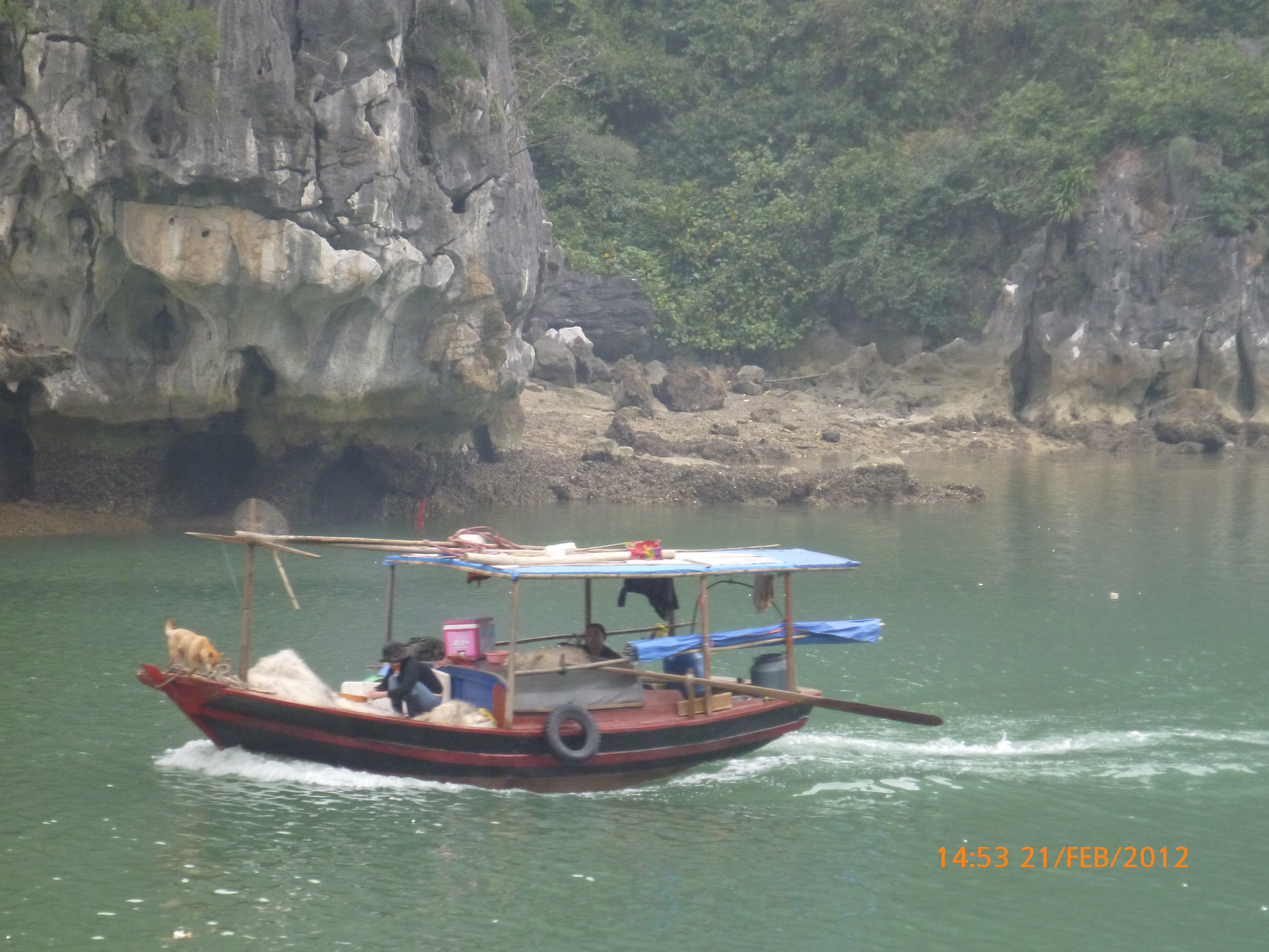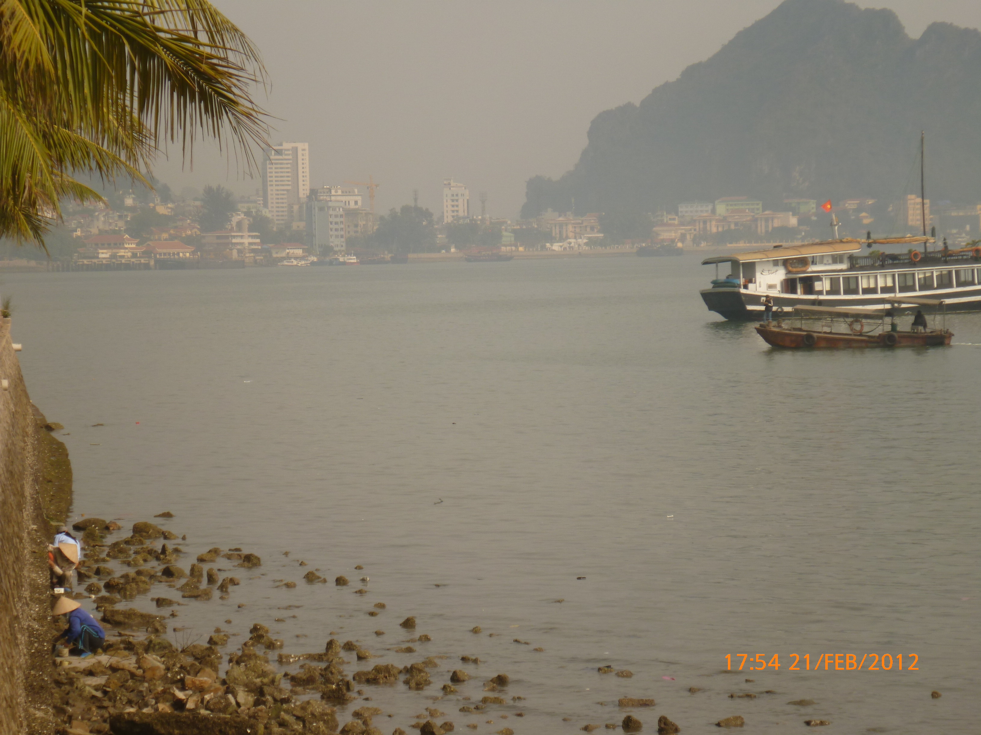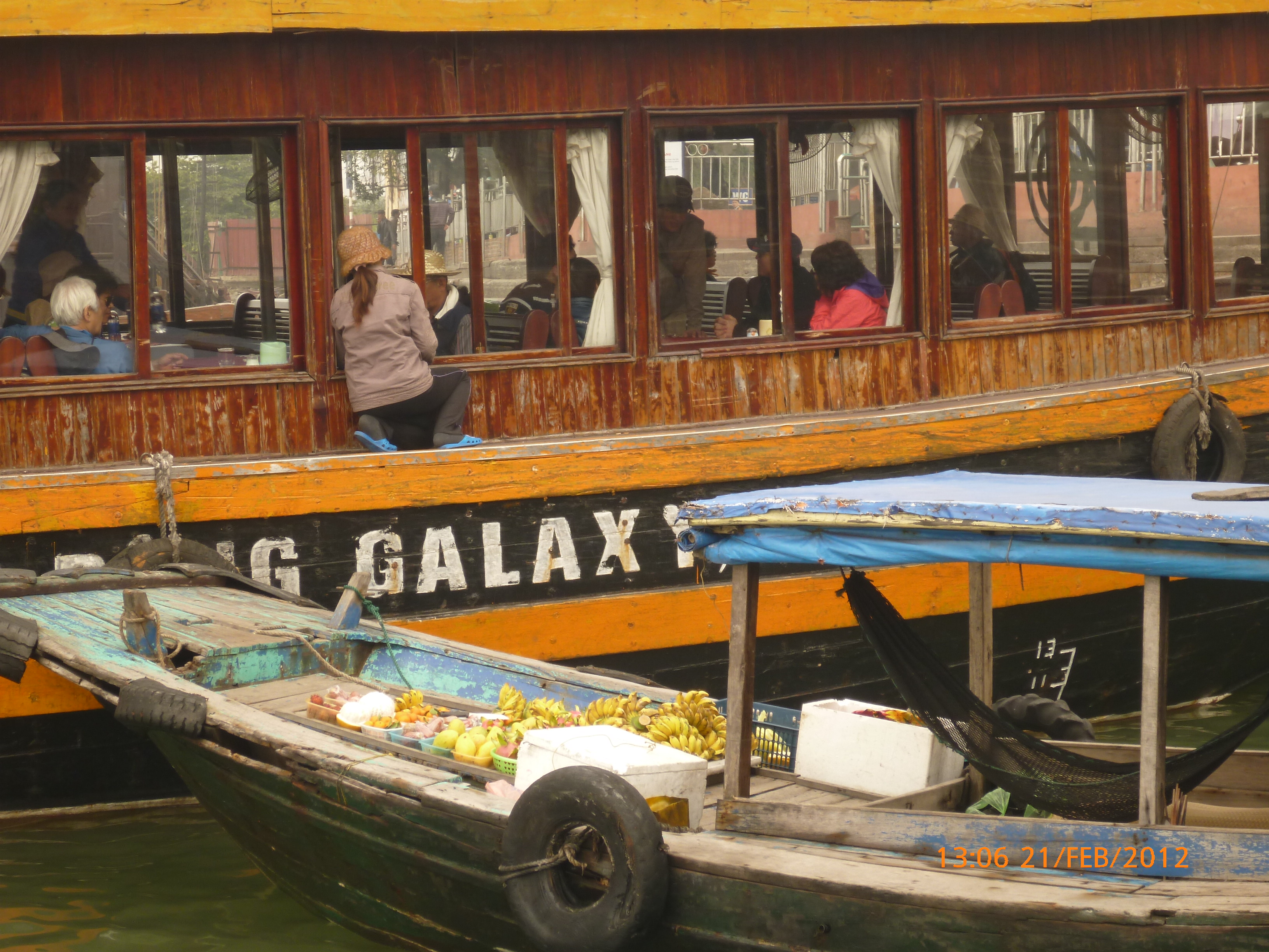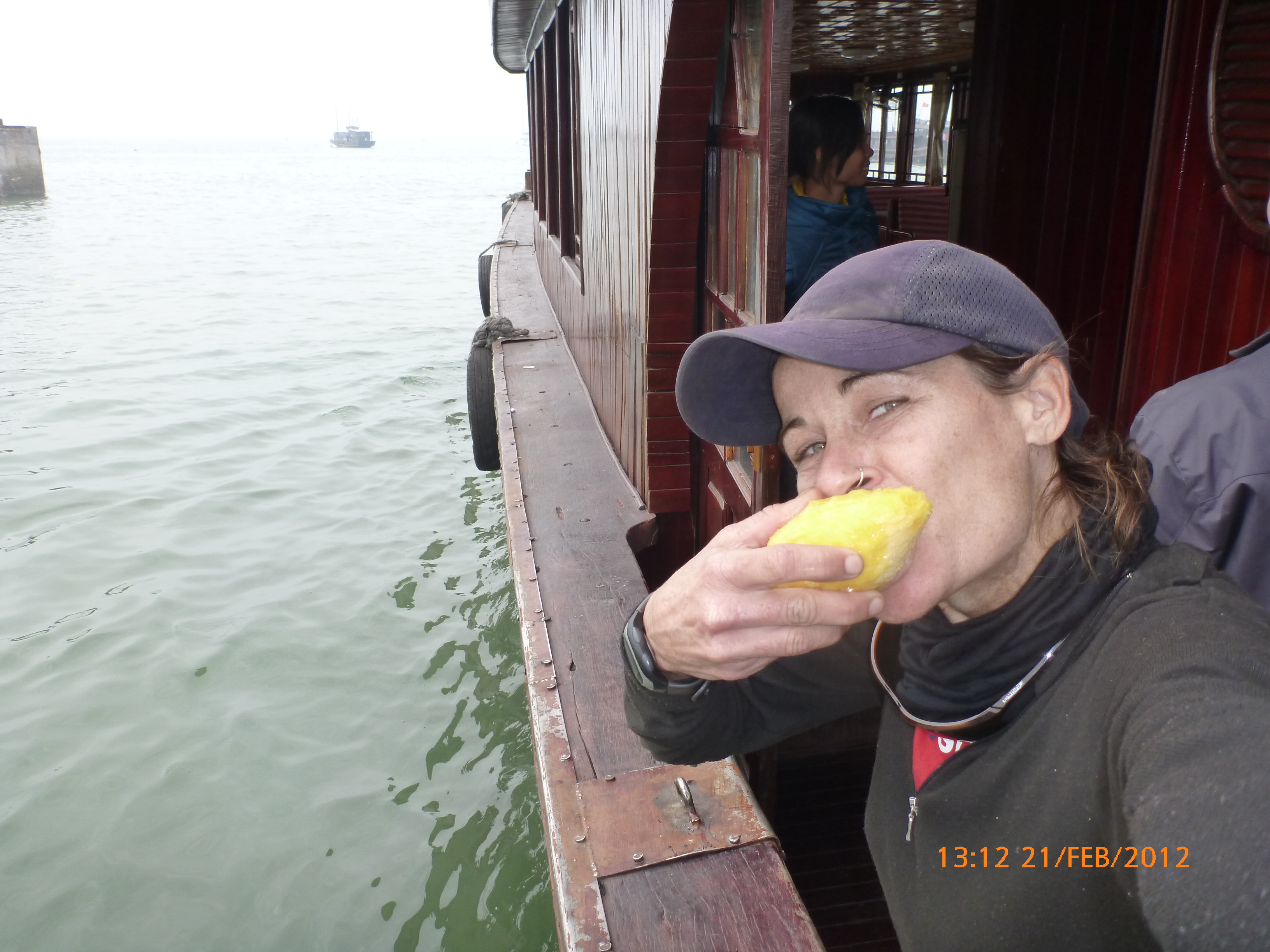 Day 83 997 days to go. Distance today 26km total 4909km . It’s 4.48pm Tuesday 21/2/2012 Hon Gai (Halong City). I was only looking for a WC so I could stop and do my post for the day over sunset. Yes you read right. It’s perfect blue skies this afternoon just t-shirt weather and soooooo yummy. I can feel the body soaking it up as I type. Anyway the urgency was worth buying a coffee. I’m right on the waterfront on the other side of the bridge after spending an awesome couple of hours pottering around the Vietnamese side of town away from the tourist focus. It was just nice to be out and active amongst it so I thought I’d head back over the bridge and see whats about. I firstly sent my next ritual postcard to my buddy Robbie C x I ended up a working class district with the best market. Of course stop time. I had only just started looking and this woman from a shop came up showing me a card with ‘how old are you?’ written on it in english. How totally random. Well that was the start of chaos. Bugger minding the shops it was ‘check out the Aussie’ o’clock. In no time a dozen women were around asking questions for a younger woman who could speak ‘so so’ english to translate. These were her words when I commended her on her English which she learnt in high school. Her name is Do Thu Ha and she is 30 years old with a 9 year old boy who’s smart but a bit lazy. She’s given me her address and asked for me to write her a letter. She doesn’t understand computers or email. Anyway…. chat chat chat laugh giggle poke slap awesome and on it went for over an hour. I tried to take a photo but they all scattered in hysterics. Do hung around with some convincing so at least I have one picky. It felt like an outing with the girls and I loved it. I bought bickies and coffee from Do’s shop to thank her for her translations. Now back to where I started. When I came out of the markets it was blue and hot and it was really startling how changed and beautiful the weather was. Perfect timing for sunset o’clock but I really had to go to the loo. Ive been acting on my sisters advice to drink more water to stop the Miss Piggy blow outs on rest days, so the bladders working overtime. As I said the urgency was worth a coffee so I stopped at this cafe which doesn’t sell coffee. Stubborn Vietnamese always wanting to do their own thing. Sounds like someone else I know all too well 🙂 I showed the lady the coffee sachets I just bought and offered to buy a glass of ‘sow’ (hot water). It was a freebie and now I’m sitting in her cafe with wifi on the water posting to you fine people sipping my coffee bought from Do’s shop watching a sunny sunset over Halong Bay. How good can it get!!!!!!!!!! Photo time. Oh and by the way I haven’t even got onto the boat trip today. This part of the world is crazy postcard beautiful. I know I use that word freely but with all due respect it really is. I have noticed voting forms about with ‘vote Halong Bay as a new natural wonder of the world.’ Does anyone know anything about this? It was overcast but it didn’t stop getting a feel for how magical this area is. Apparently it’s only the start of things now to come heading up into southern china. Enjoy the photos as much as I did taking them. It was like our private cruise. There were only four other people on the boat that could have held 400. I found a possie on top and soaked in every bit of delish. The scenery just got better and every angle you looked there was something else to enjoy. The bay is very busy with tourism and fishing industry. Nothing ugly about it. Quite the contrary good to se it working for the people and economy. Heaps of other tourist boats like hundreds and lots of trawlers and other fishing boats even rub a tub tubs. Market folk are busy with their vending stalls on water. I bought my first mango and slopped it all over me for breaky. The fishing industry is farmed as well as caught and ranges from huge containers transporting supplies from the farms to small time fishing boats. These mostly work from the floating Villages amongst the rocks. Always soaring overhead the peaks are sea eagles which I managed to grab a photo of. It was wonderful and a must do that I’m so glad I did. Tomorrow is a bus to this side of the border where I’ll stay one more night and cross the border with the first full cycle day in China Thursday. Vietnam has slapped me about and I’m smiling with every bit of genuine respect for a country of folk that are annoyingly contagious. Time to enjoy the sunset. I’ll upload the photos after a Skype date with my partner at 7pm. Wonderful wonderful very cool indeedy awesome day!!!!! Point made 🙂 Talk soon x