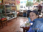 overcast as is every day, but no rain in it which was great. Very cold but. I’ve worked out how to cycle in this weather without overheating and getting all my clothes under my outers wet with sweat. This is not good because as soon as I stop I get so cold and need to put dry clothes on. Im wearing my wet weather gear to keep the wind and air out. Underneath I just have my cycling shorts and marino shirt. Marino is awesome material that dries as you sweat as long as it get air circling. I change my gloves and cap for balaclava when it gets extra chilly and that’s doing the trick. It’s actually quite difficult working out how to dress for a day in the saddle but we’re learning 101. We had a half way stop today at a tiny village where this character of a woman had a narrow shop selling steaming noodle soup out front with seating inside out of the weather. perfect. I saddled up to noodle soup with a bioled egg plopped in the middle so hard it gave me the