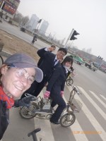We dined and chatted about their work and our trip and exchanged email addresses. They use a program here called QQ instead of skype to chat so I have to look further into that. They were all 24 years old and so happy to be practicing their English. Liang Xu and Tian Yuan have not spoken English since school and loved being able to practice again. Lunch time conversation was pretty much about them enjoying and remembering words. They used their internet access on their phones to translate when needed and it was fun to share their enthusiasm. After lunch we headed back to their work and Tian Yuan said he would take us to the ring road that joined the 107. Another girl from the bank doubled him on her moped cycle and we went through all the back streets on a ‘short cut’ that took forever.