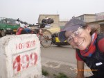 They debated about the best way to go and a lady from the next door mechanics came over and sorted them out. She was great very tough but a colourful smile and all over her way around. I was getting ready to head off and Tian Yuan invited me to join them for lunch, ‘We would like to shout you a traditional meal from this area. Prease join us for lunch?’ “How generous of you, yes that would be great!!’ So I parked Rube and their Bank and we jumped into a taxi and headed somewhere local. It was a bustling restaurant filled with lunctime diners. They only served this one dish. Liang Xu made a ‘baaaa’ sheep noise to tell me we were having mutton. I like this girl’s style!!! Sheep have appeared just today with their shepards on the roadisde grazing, so that explains it. The dish was a bowl of large ribbon noodles, mutton pieces, greens and a clear fine noodle made from potato. It’s served with a bulb of braised garlic and coriander. God only knows what I smell like tonight because I ate the whole bulb – it so perfectly complimented the tastes. You also garnish the dish with the thick brown sweet vinagar like what I had in Wuhan. It’s probably more like a balsamic and I could drink it. Again it topped off the flavours.