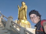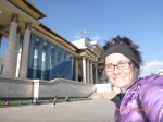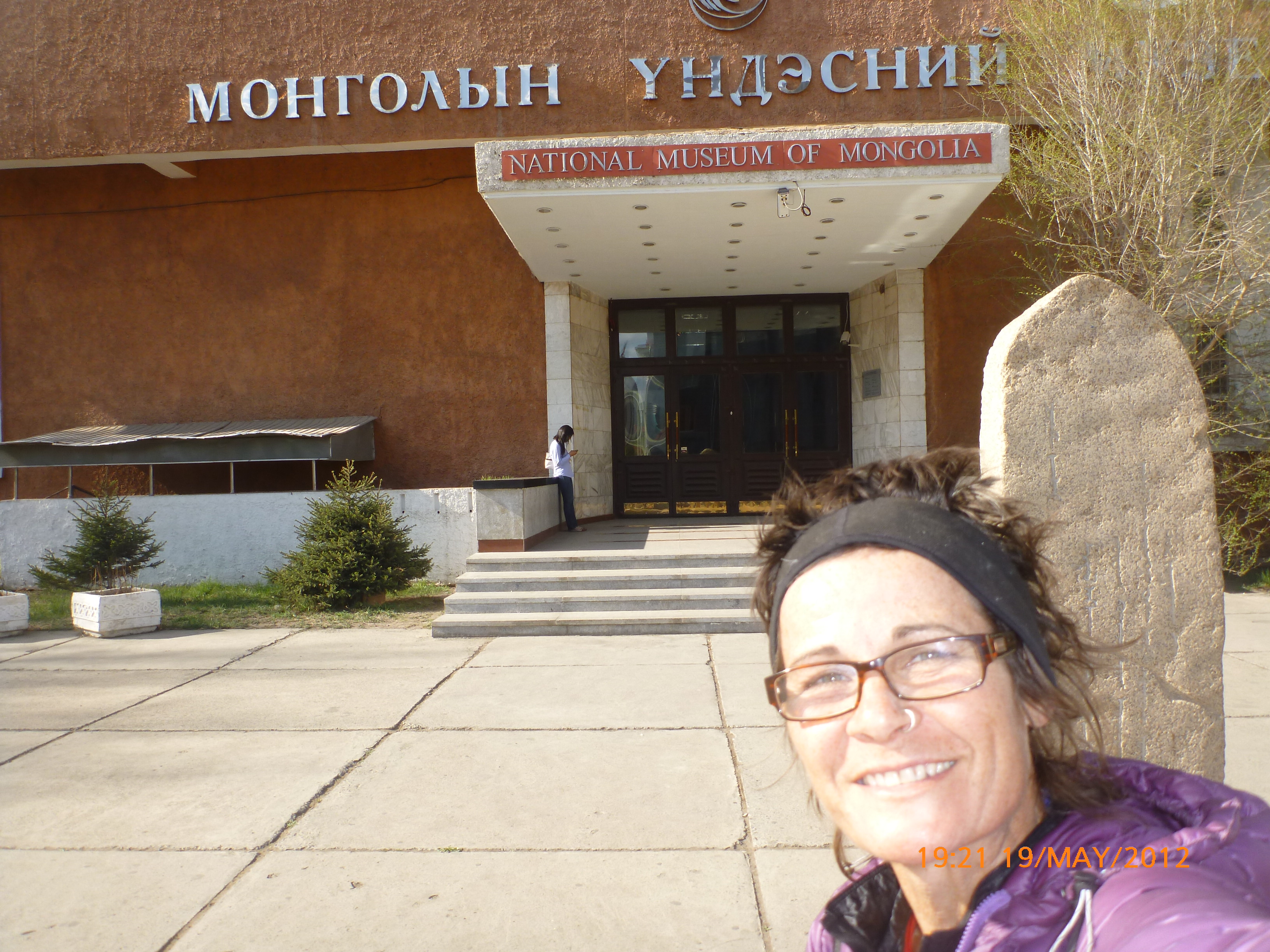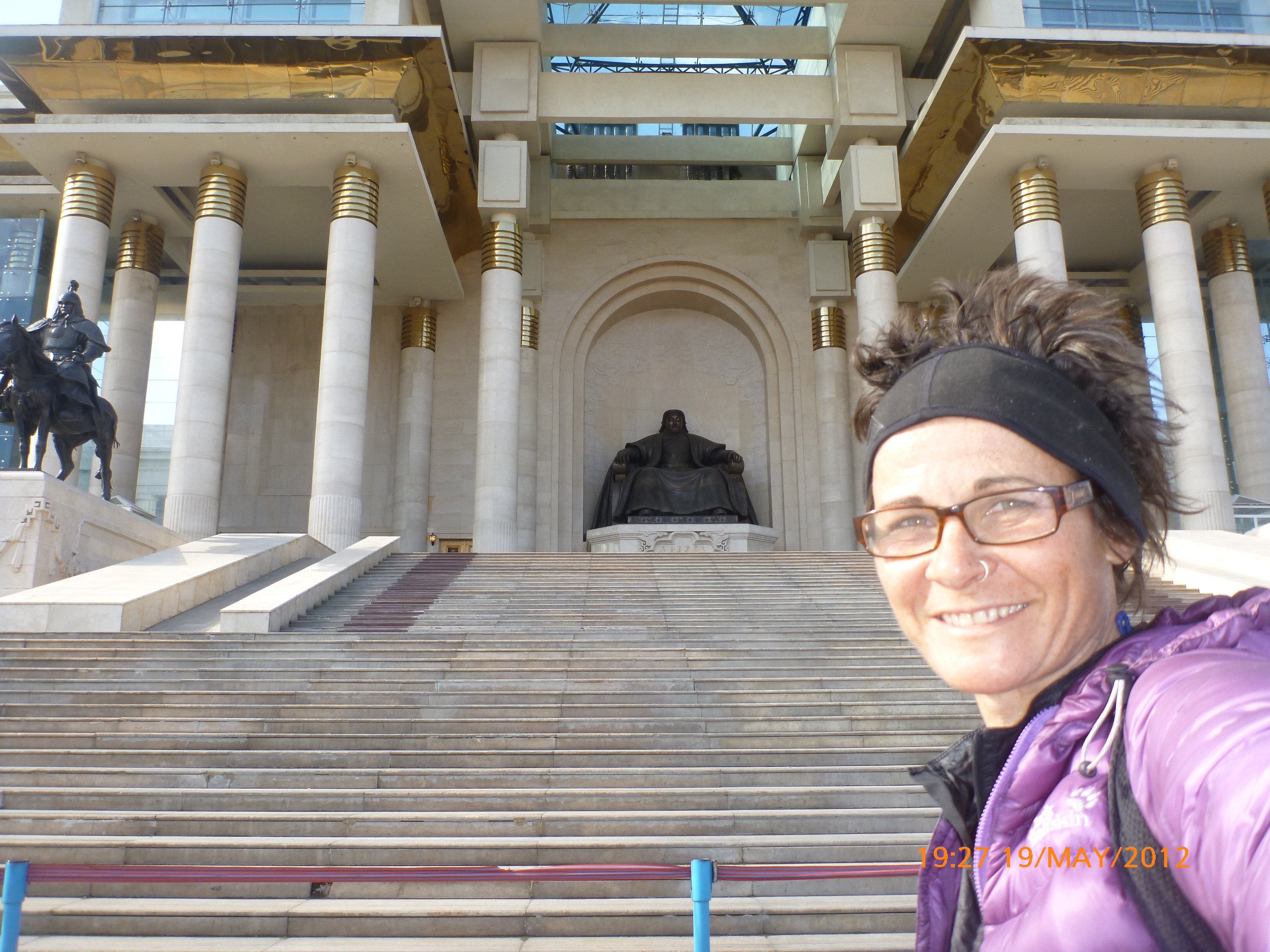 This morning I cleaned Rube and her trailer to get them through Brissie customs. I tucked the girl back into her box all ready for a comfy ride. The afternoon was spent doing a walking tour of UB. I read up on what sounded interesting. First up I went to the Natonal Museum of Mongolian History. It read up as one of UB’s highlights. The museum is a walk through Mongolian history from prehistoric to present times. I’m not a museum fan but it was pretty cool. There were theme halls from ancient history artifacts to traditional clothing and culture to socialist mongolia and its political reform of 1990 to the present. Of particular interest was the events of 1990 when the Mongolian Democratic Party came into power. Sükhbaatar Square has been the site of some pretty significant political events in the 20th century. The Lonely Planet explains “In July 1921 in the centre of Ulaanbaatar, the ‘hero of the revolution’, Damdin Sükhbaatar, declared Mongolia’s final independence from the Chinese. The Square now bears his name and features a statue of him astride his horse. The words he apparently pro-claimed at the time are engraved on the bottom of the statue: ‘If we, the whole people, unite in our common effort and common will, there will be nothing in the world that we cannot achieve, that we will not have learnt or failed to do.” However from 1921 to 1990, in the Mongolians People’s Republic, all sectors including economy culture and politics were directly dependent on the USSR lead by the Mongolian People’s Revolutionary Party. But in December 1989 a Mongolian Democratic Union was formed and in their first congress in April 1990 they established the Mongolian Democratic Party. They called a mass demonstration in the square later that month and forced the MPRP to resign and Mongolia became a democracy. Very different times to the Mongolian empire of the 13 and 14 centuries when it occupied Siberia to South Asia,and Korea to Bulgaria. During this era they conquered more than 50 contries and united more than half of the populated world. Chingiis khan was the first ‘great king’ who united the Mongolian state of regional khans in 1206. There were some of his famous quotes including, ‘wish to bring people under one reign to make them happy. What makes me happy is if this world again becomes one family peaceful and quiet.’ Also ‘Our goal will be realised when the whole world from sunrise to sunset shall become united under the power of the blue sky.’ This is a very strong Shamanist belief. GK surrounded himself with Shamans who are regarded as the ‘links’ on earth to the spirit world. Another bit of GK trivia is that his remains or tomb has never been found. Nowadays Mongolia is one of the most sparsely populated countries in the world with 43% pastoral nomads 57% urban dwellers. There were halls and halls of history but all very easy to take in and enjoy.Good interesting fun. I then walked to the hill where the Mongolian symbol is inscribed on its side. I included a photo in a previous post. It was nice again to stretch the legs and get out of the city. Great views and pickies!! I walked back via Buda park where the gold statue is. Remember the photo I got at sunset one of the first days? This time it was showing off it’s gold in the afternoon light with the bluest of skies as a backdrop. So that was my walking tour of UB on what was my last day here. I crossed peace bridge back into the city and saw the graffiti face I got a picky with on day 1. It’s only been a month since then but it seems much much longer with all the layers of stuff that has happened. It was a good day to end on yay. Tomorrow I have a Skype date with the folks first up then I’d like to head to the Gandan Khid Buddhist monastery. It is one of Mongolia’s most important, and also one of its biggest tourist attractions. The full name, Gandantegchinlen, translates roughly as ‘the great place of complete joy’. Around the start of the 19th century, more than 100 süm (temples) and khiid (monaster-ies) served a population of only about 50,000 in Ulaanbaatar. Only a handful survived the religious purges of 1937. Only since the early 1990s have the people of Mongolia started to openly practise Buddhism again. It sounds like a cool place to finish my Mongolian experience. After this I’ll upload the last of my photos and get ready to go to the airport early evening. So this will be the last of my posts for a couple of days when I’ll be back with stories of what will hopefully be a safe trip home home home. Talk soon x