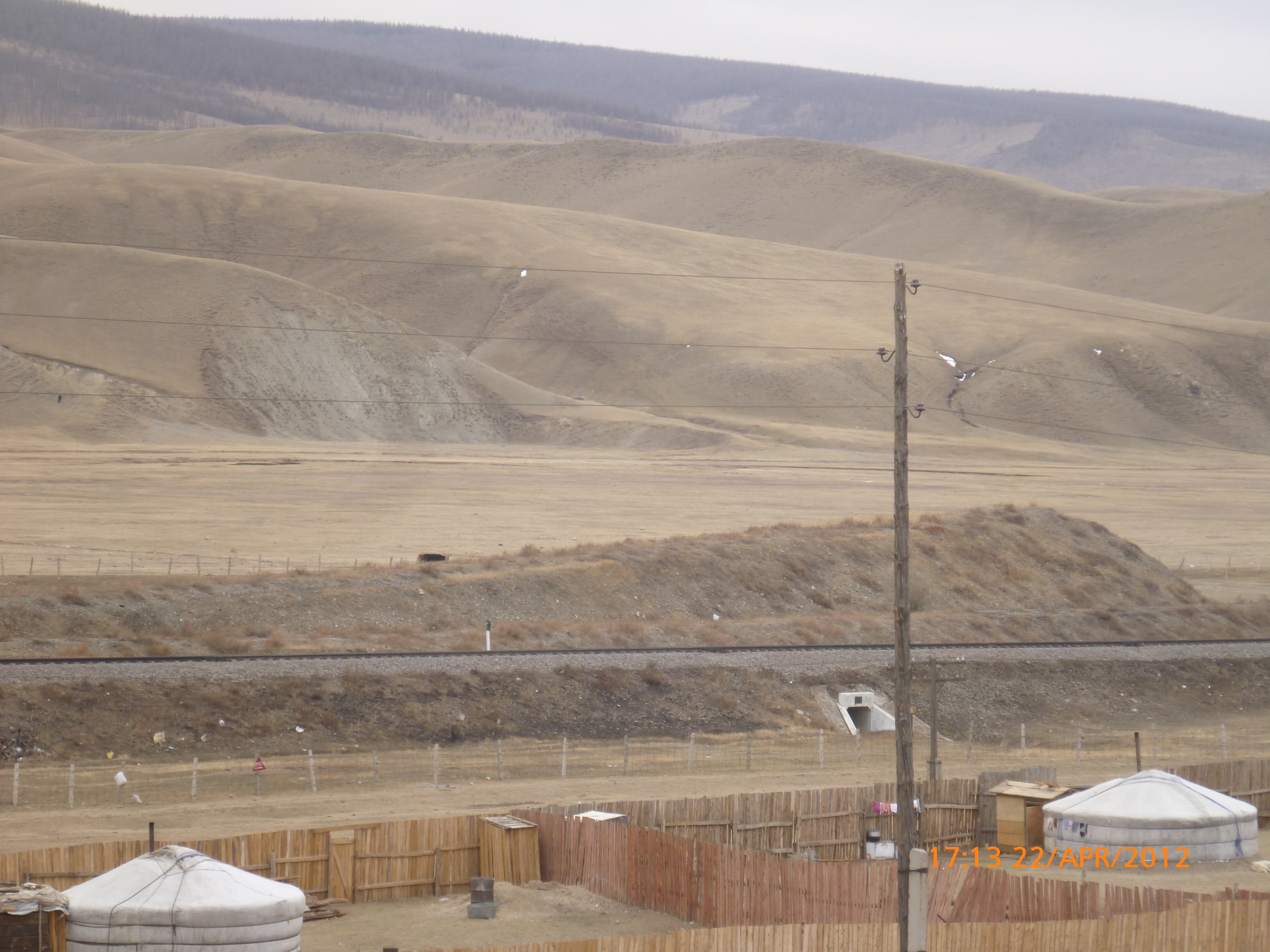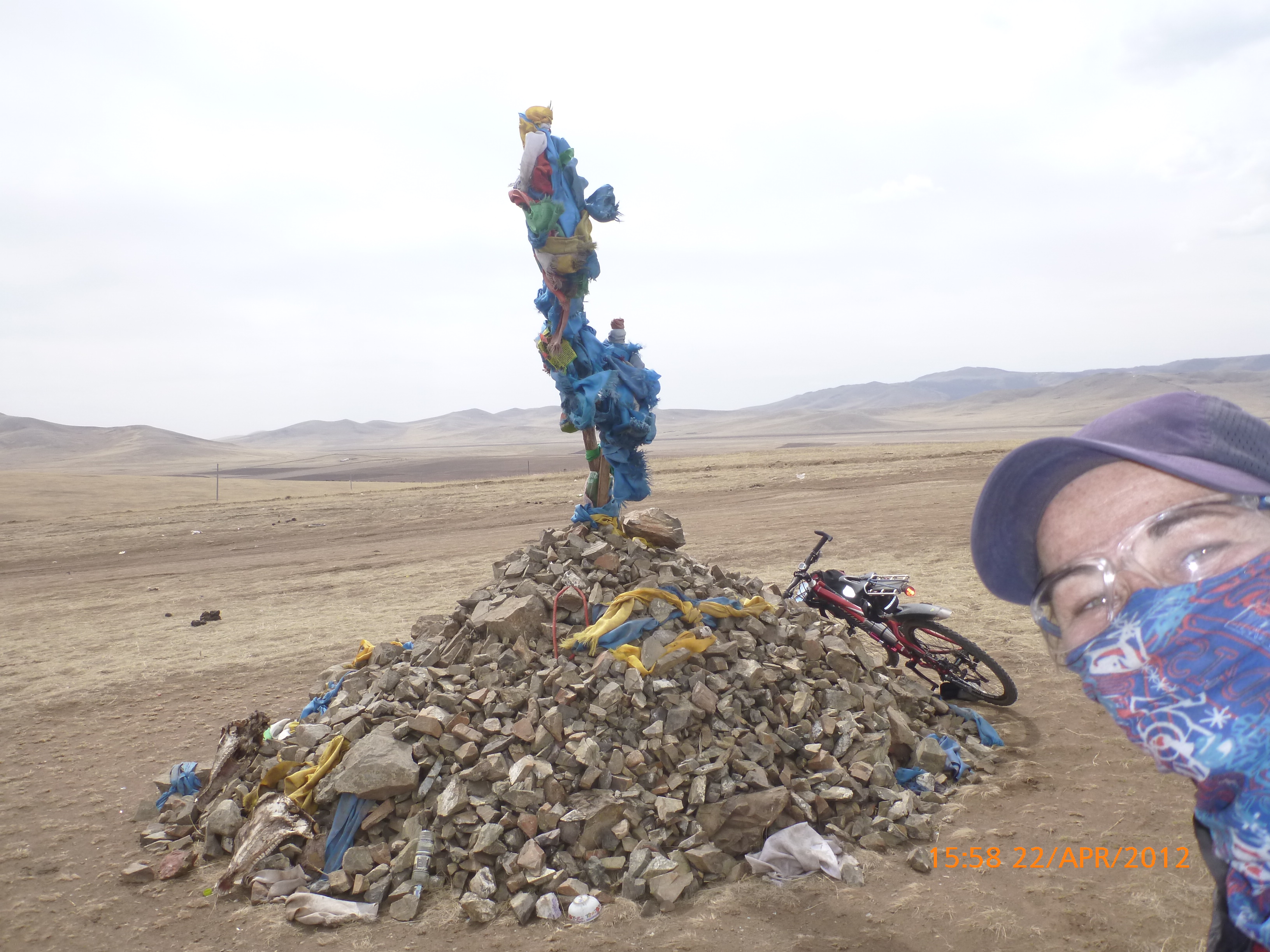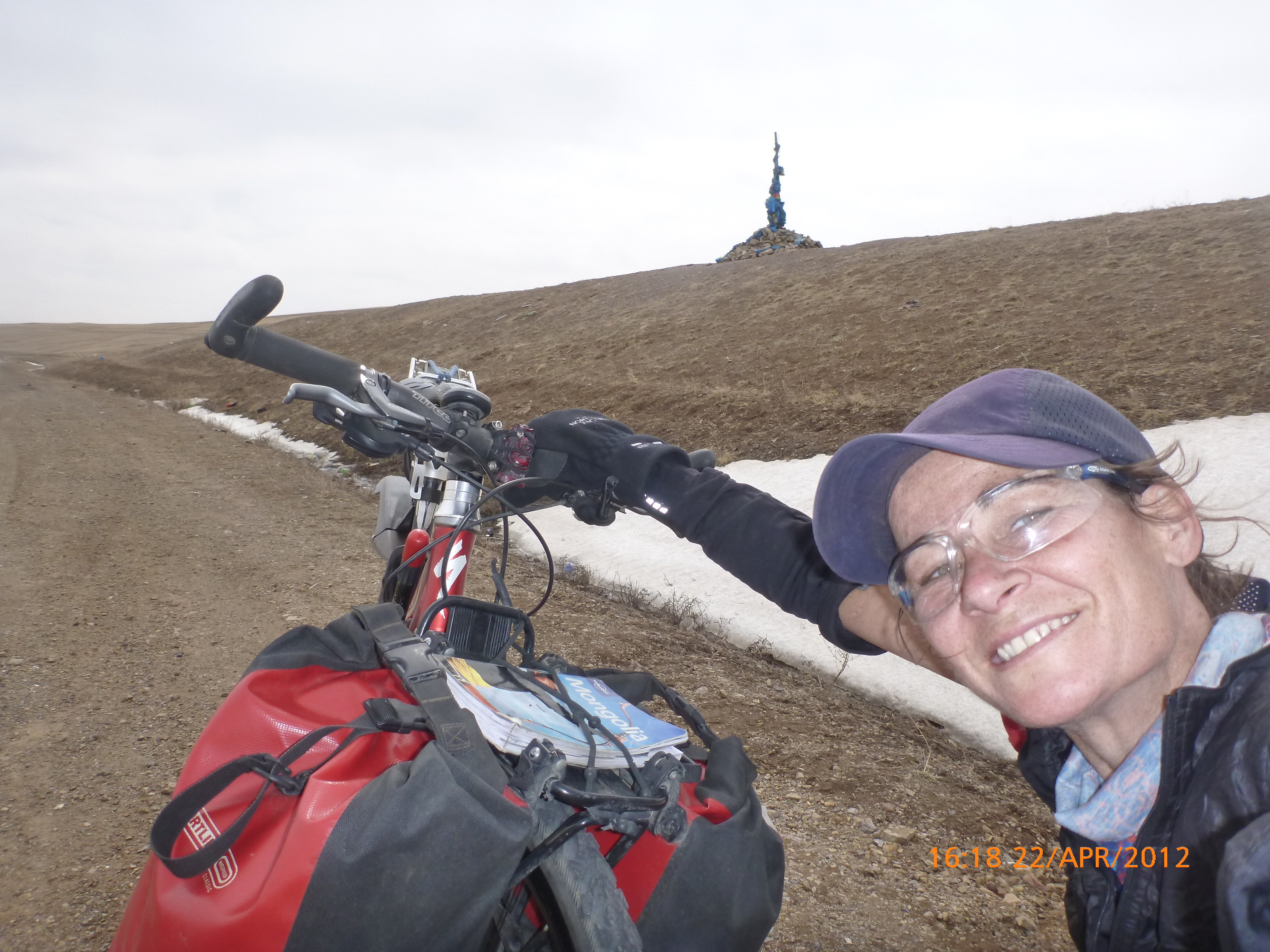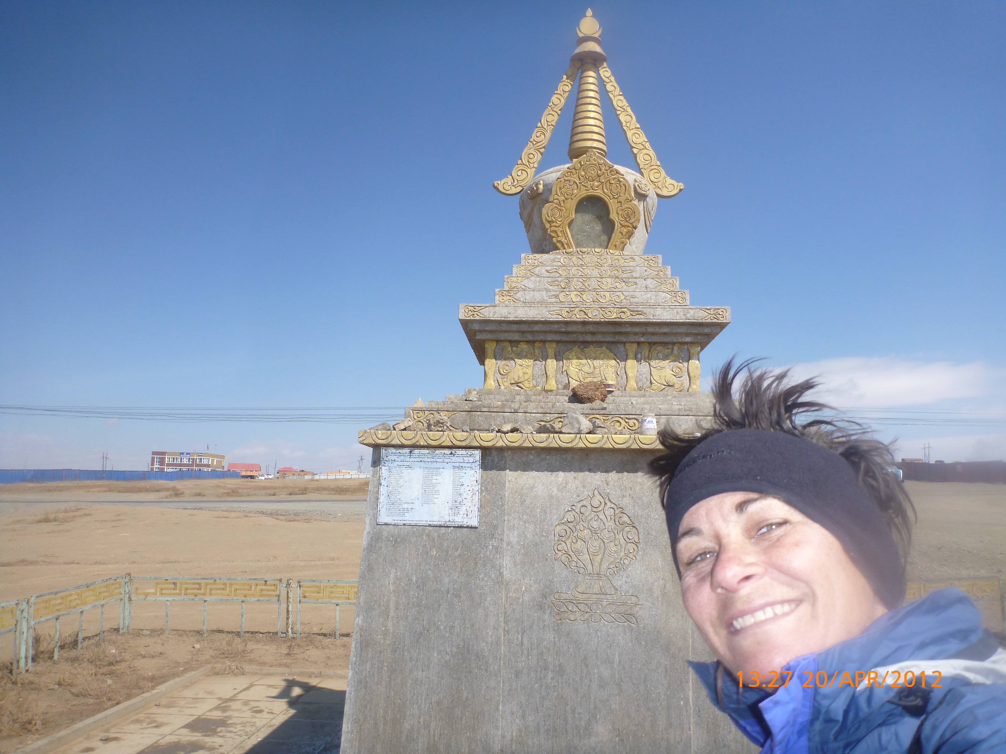 Day 144 587 days to go. Distance: today 82km total 8173 km. Its 8.00pm Sunday 22/4/2012 Ulaanbaatar. Hi there on this sleepy Sunday. Well it seems to be for some local folk at least. Ive been so used to SE Asia and China being 7 days of same same but not so here on face value. It much like back home with a lazy Sunday feel. Not so for us chicks but. We headed off for a cycle day on the road eastwards towards Terelj National Park. The National Park is 78km but the ride out there is open plains and rolling hills so very nice for a day trip. Rube and I loved being back in the saddle and had a cool bonding day. It’s been 3 weeks since we’ve done anything decent together so we had fun. The scenery was wonderful and we managed some cool pickies along the way. The day was comparatively warm say early 20s but there was still snow patches on the ground and the creeks were frozen on top at least. I saw a few flowing patches so spring is trying to nudge it’s way in. The wind was pretty full on being so open and a wicked south easterly. We had a few blown-off the road moments that added to the day’s adventure. Better still we got some great tail wind sections early on the way back into UB. Our weeeeee fun was short lived as a dust storm blew in from the west and we cycled into it for the last hour. It was an amazing thing to see on the horizon. I managed to capture some picks but it didn’t do the force of the storm justice. There was a constant strong wind but then it would gust and send brown dust swirls upwards. It was wicked and really interesting. Ive never seen anything like this before. It’s still really windy outside but the dust has eased up. I was cycling back just in time for a skype date with my partner so I havent as yet had a shower. Anywhere that was exposed is brown like around my sunglasses. It’s a sexy look and a shower will be nice a bit later. I got a few things to do first. Ive filled out my visa registration application and got my warmer cycling gear ready for tomorrows pedal back out to immigration. On the way back today I passed a Korean fella on a cycling tour of Mongolia for 3 months. He was heading out to Terelj for a few days but coming back to UB. We’ve exchanged emails and Ive invited him to dinner when he gets back so I hope to hear from him. It’ll be great to touch base with him and pick his brain for info and tips. His set up was the best Ive seen and very professional. Last night I headed out into town and walked about a different mall area. It was quite a meeting place so good for some subtle people watching. It’s a bit hard to people watch when I’m the one being checked out 🙂 There were some fabulous copper relief murals in the mall and I snapped a picky with the one I liked most. I thought I’d snavel what company I could with a dash of serenading 🙂 All shananagans aside it was a cool piece of art. Just before turning round today I stopped to check where we were on the map and this fella appeared from nowehere. He was very much jolly on the liquor he was carrying but full of friendliness. He could hardly put a sentence together but was keen to share his story and spittle with me eeeeek. I broke his momentum with a photo which he loved and took the chance to exit. We got to quite a high point where we turned round and there was a chorton pole on top with silk scarfs, prayer players, a Buddhist brass bell and cow skulls decorating it. We passed another larger one adorned similarly but with a set of crutches added to the offerings 🙂 I also noticed blue scarfs tied randomly to bridges or road signs. I believe they are to wish a safe journey but I’ll find out more about this as I go along. The folk here love nibbling on a small round roasted nut. It’s common to see piles of shells scattered on the footpaths and about where folk have sat for a time. We passed a number of small towns tucked in the valleys where the road passed. Townsfolk were selling bags of these nuts by the roadside. There’s also many vendors in town selling the same but it was nice to give my pennies to a couple today very pleased about the sale. They weren’t keen for a photo but. I have read that its important to ask before taking a photo. Ive found it better to invite them to join a self portrait which I did today which they refused and to be respected. And that’s about us for today. I’m still to go to the shops for some fresh bread and download the photos from today so I’ll finish up there. I have a line of dust on my top lip that looks very dodge like vegetate or a penciled on mow. mmmm sexy on the inside? Oh well it’ll give the locals in the supermarket and internet cafe a good giggle 🙂 Talk soon x