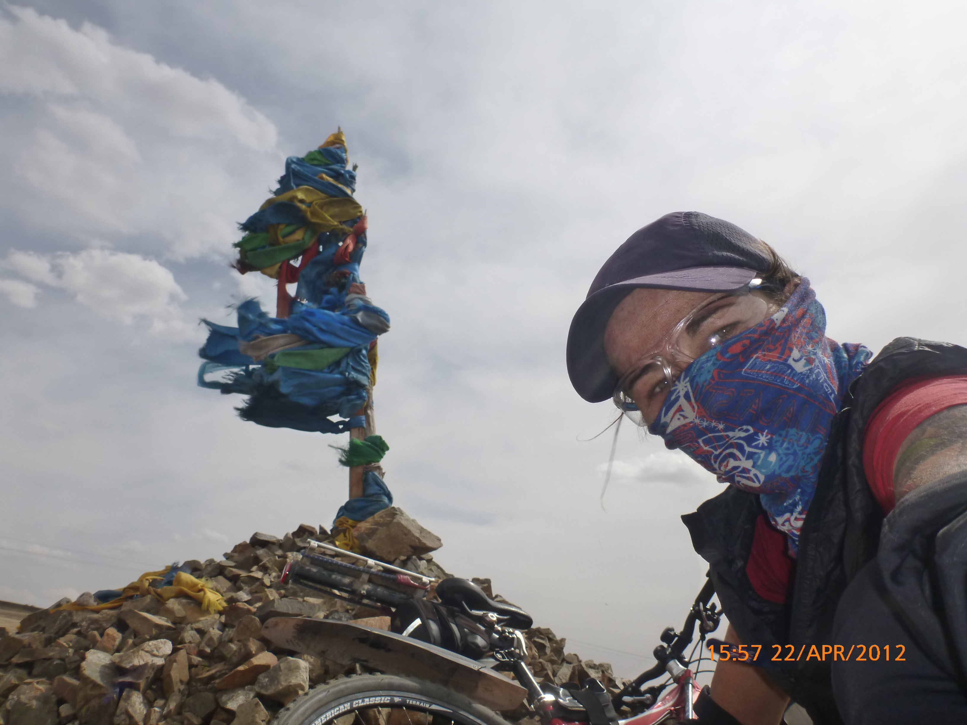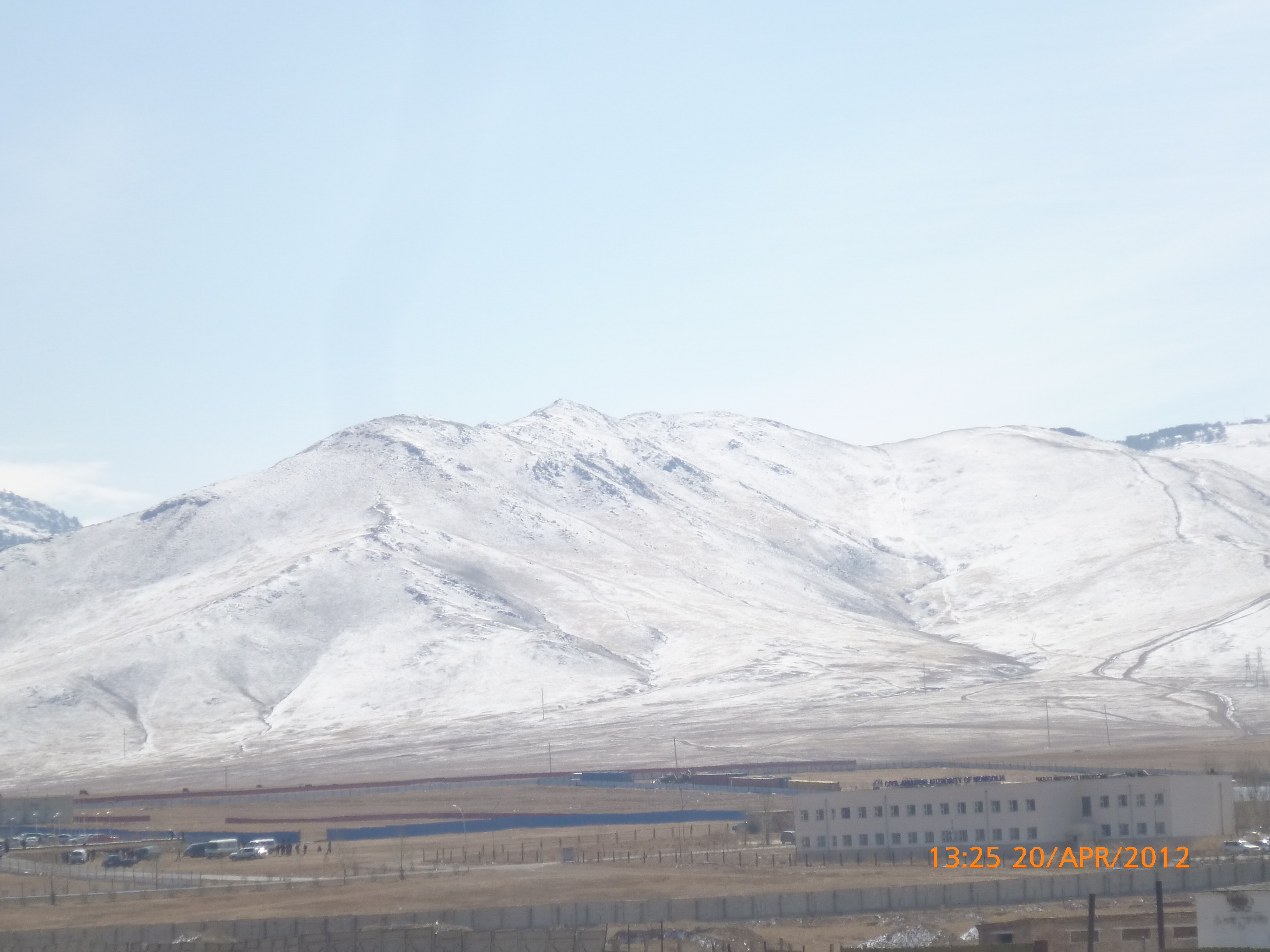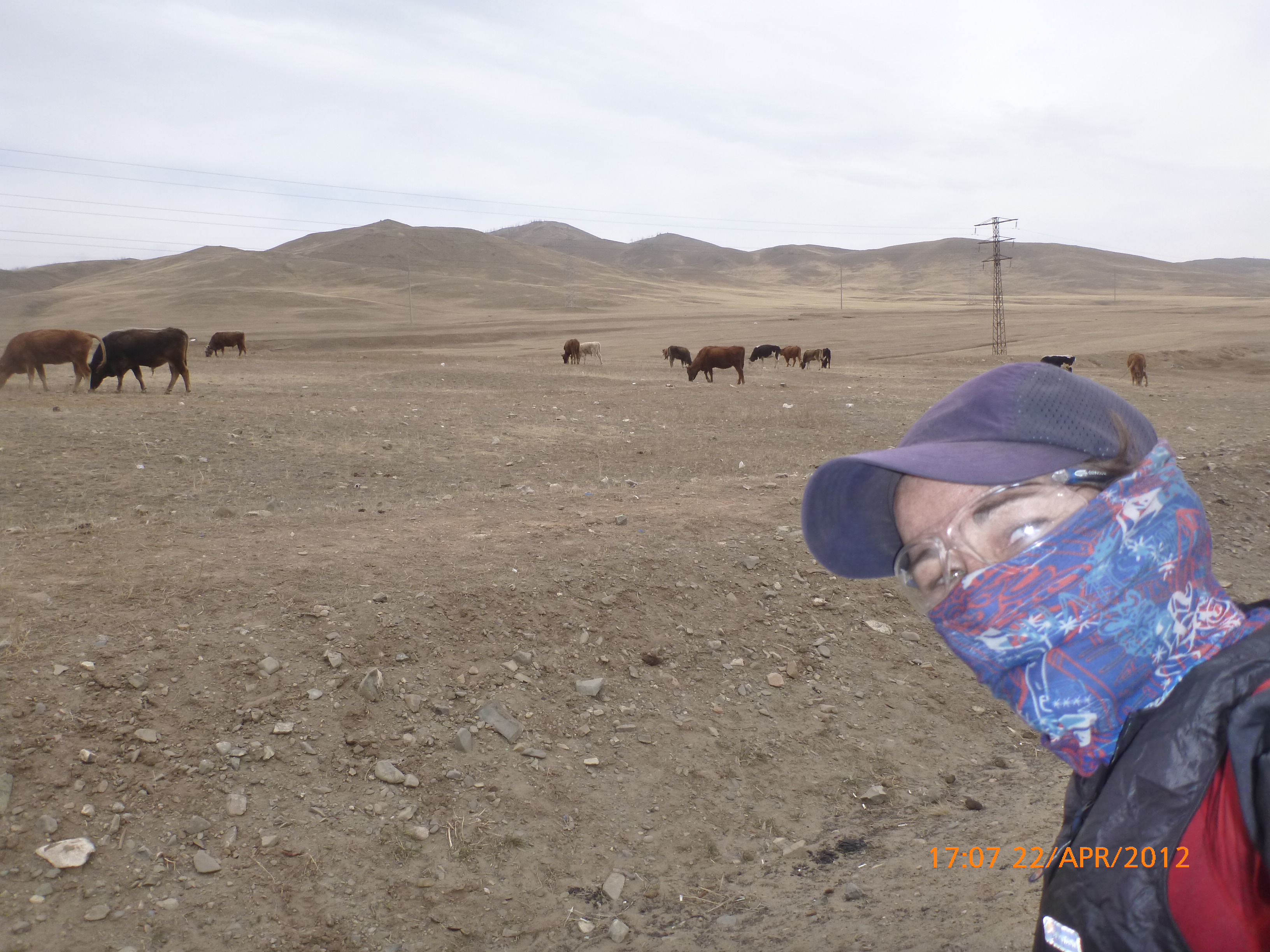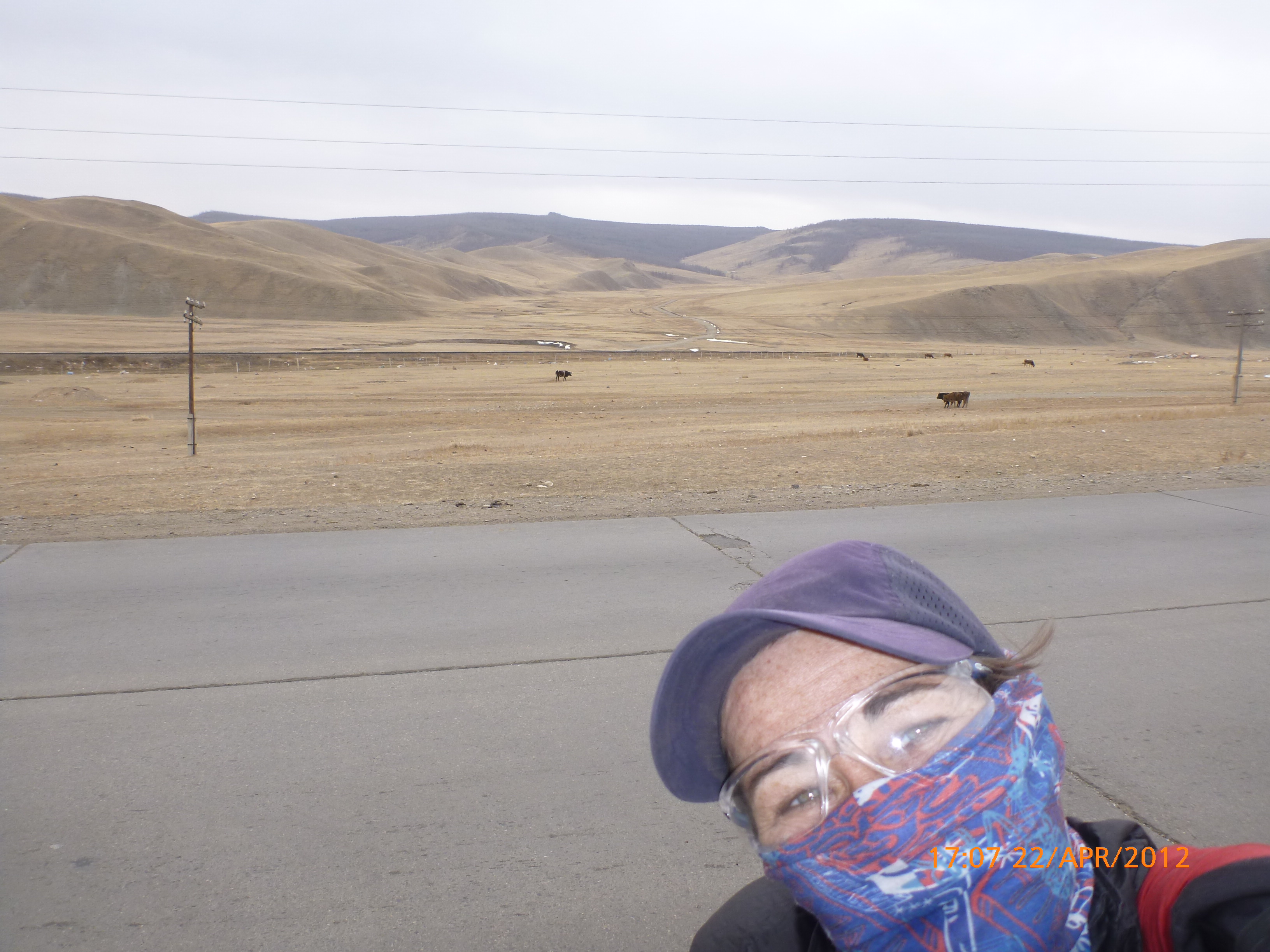 Day 144 587 days to go. Distance: today 82km total 8173 km. Its 8.00pm Sunday 22/4/2012 Ulaanbaatar. Hi there on this sleepy Sunday. Well it seems to be for some local folk at least. Ive been so used to SE Asia and China being 7 days of same same but not so here on face value. It much like back home with a lazy Sunday feel. Not so for us chicks but. We headed off for a cycle day on the road eastwards towards Terelj National Park. The National Park is 78km but the ride out there is open plains and rolling hills so very nice for a day trip. Rube and I loved being back in the saddle and had a cool bonding day. It’s been 3 weeks since we’ve done anything decent together so we had fun. The scenery was wonderful and we managed some cool pickies along the way. The day was comparatively warm say early 20s but there was still snow patches on the ground and the creeks were frozen on top at least. I saw a few flowing patches so spring is trying to nudge it’s way in. The wind was pretty full on being so open and a wicked south easterly. We had a few blown-off the road moments that added to the day’s adventure. Better still we got some great tail wind sections early on the way back into UB. Our weeeeee fun was short lived as a dust storm blew in from the west and we cycled into it for the last hour. It was an amazing thing to see on the horizon. I managed to capture some picks but it didn’t do the force of the storm justice. There was a constant strong wind but then it would gust and send brown dust swirls upwards. It was wicked and really interesting. Ive never seen anything like this before. It’s still really windy outside but the dust has eased up. I was cycling back just in time for a skype date with my partner so I havent as yet had a shower. Anywhere that was exposed is brown like around my sunglasses. It’s a sexy look and a shower will be nice a bit later. I got a few things to do first. Ive filled out my visa registration application and got my warmer cycling gear ready for tomorrows pedal back out to immigration. On the way back today I passed a Korean fella on a cycling tour of Mongolia for 3 months. He was heading out to Terelj for a few days but coming back to UB. We’ve exchanged emails and Ive invited him to dinner when he gets back so I hope to hear from him. It’ll be great to touch base with him and pick his brain for info and tips. His set up was the best Ive seen and very professional. Last night I headed out into town and walked about a different mall area. It was quite a meeting place so good for some subtle people watching. It’s a bit hard to people watch when I’m the one being checked out 🙂 There were some fabulous copper relief murals in the mall and I snapped a picky with the one I liked most. I thought I’d snavel what company I could with a dash of serenading 🙂 All shananagans aside it was a cool piece of art. Just before turning round today I stopped to check where we were on the map and this fella appeared from nowehere. He was very much jolly on the liquor he was carrying but full of friendliness. He could hardly put a sentence together but was keen to share his story and spittle with me eeeeek. I broke his momentum with a photo which he loved and took the chance to exit. We got to quite a high point where we turned round and there was a chorton pole on top with silk scarfs, prayer players, a Buddhist brass bell and cow skulls decorating it. We passed another larger one adorned similarly but with a set of crutches added to the offerings 🙂 I also noticed blue scarfs tied randomly to bridges or road signs. I believe they are to wish a safe journey but I’ll find out more about this as I go along. The folk here love nibbling on a small round roasted nut. It’s common to see piles of shells scattered on the footpaths and about where folk have sat for a time. We passed a number of small towns tucked in the valleys where the road passed. Townsfolk were selling bags of these nuts by the roadside. There’s also many vendors in town selling the same but it was nice to give my pennies to a couple today very pleased about the sale. They weren’t keen for a photo but. I have read that its important to ask before taking a photo. Ive found it better to invite them to join a self portrait which I did today which they refused and to be respected. And that’s about us for today. I’m still to go to the shops for some fresh bread and download the photos from today so I’ll finish up there. I have a line of dust on my top lip that looks very dodge like vegetate or a penciled on mow. mmmm sexy on the inside? Oh well it’ll give the locals in the supermarket and internet cafe a good giggle 🙂 Talk soon x