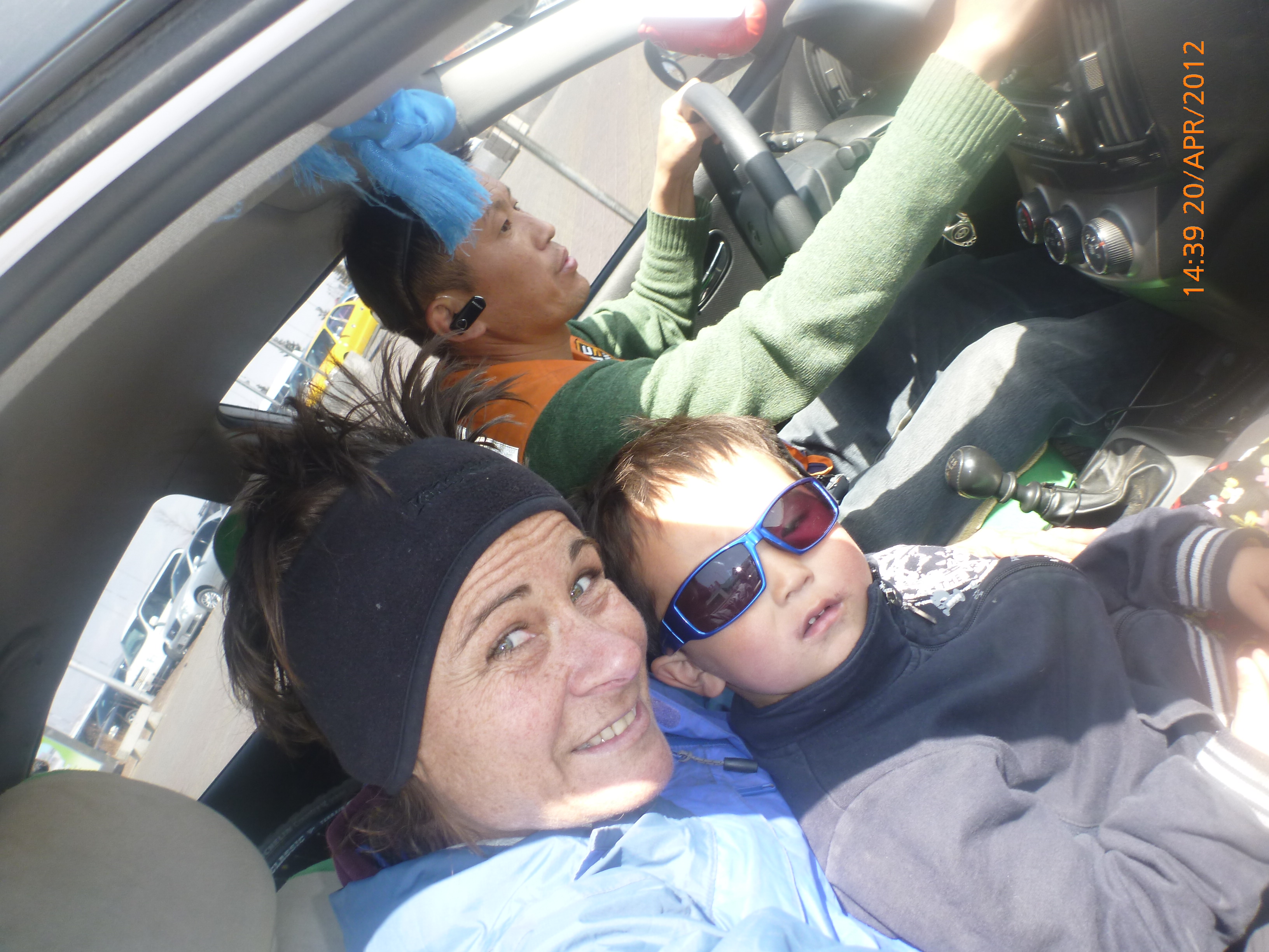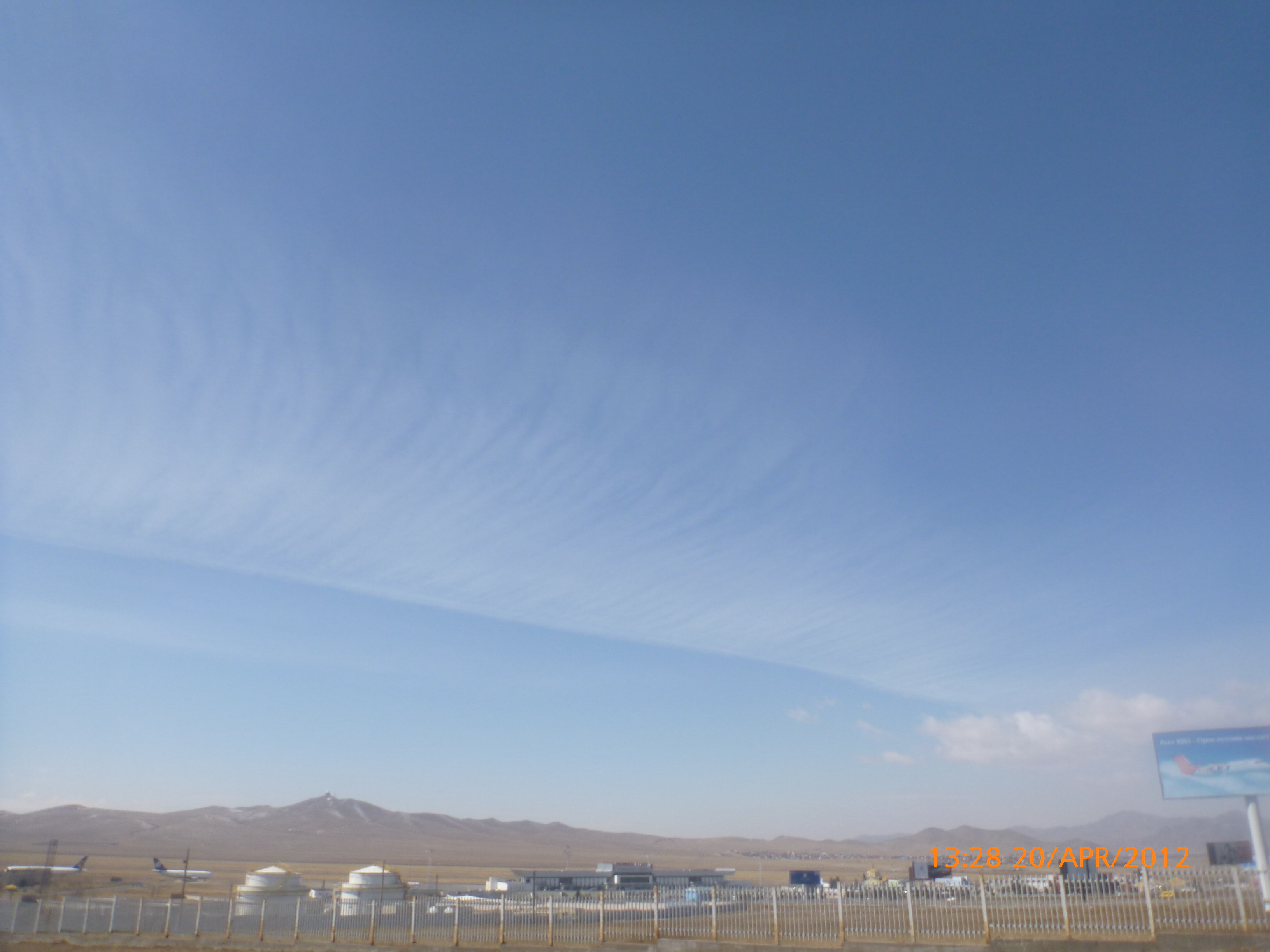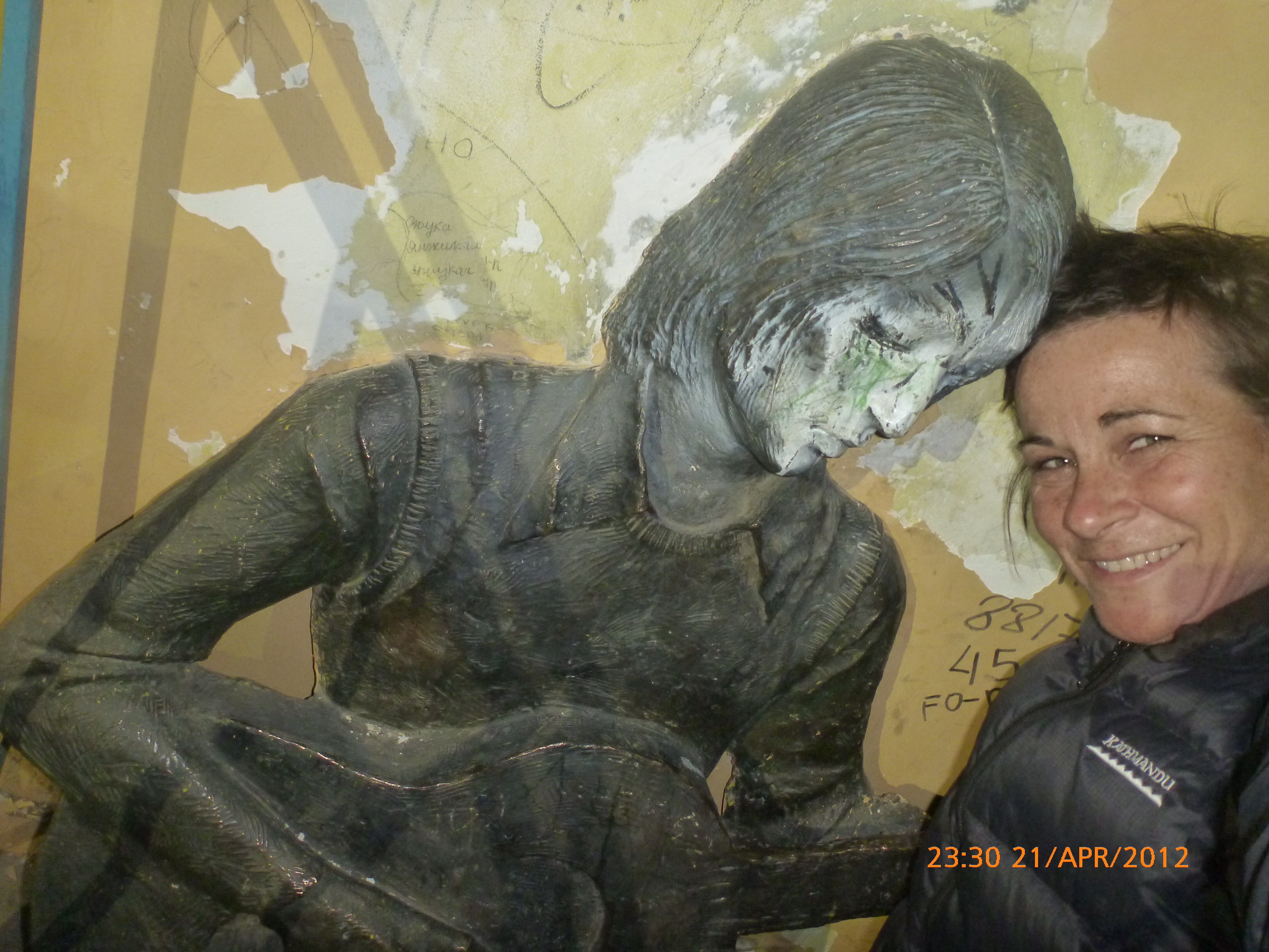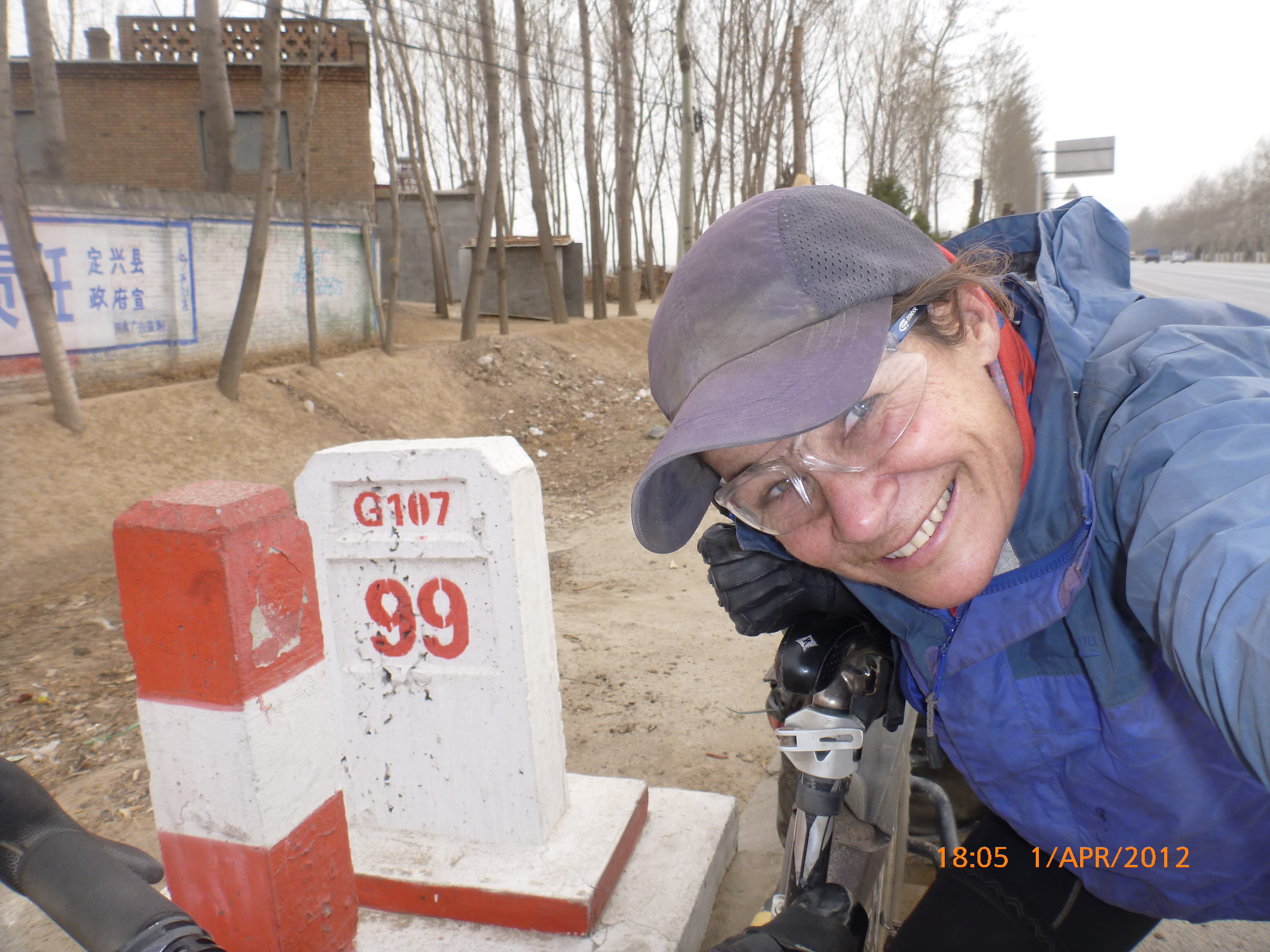 Day 144 587 days to go. Distance: today 82km total 8173 km. Its 8.00pm Sunday 22/4/2012 Ulaanbaatar. Hi there on this sleepy Sunday. Well it seems to be for some local folk at least. Ive been so used to SE Asia and China being 7 days of same same but not so here on face value. It much like back home with a lazy Sunday feel. Not so for us chicks but. We headed off for a cycle day on the road eastwards towards Terelj National Park. The National Park is 78km but the ride out there is open plains and rolling hills so very nice for a day trip. Rube and I loved being back in the saddle and had a cool bonding day. It’s been 3 weeks since we’ve done anything decent together so we had fun. The scenery was wonderful and we managed some cool pickies along the way. The day was comparatively warm say early 20s but there was still snow patches on the ground and the creeks were frozen on top at least. I saw a few flowing patches so spring is trying to nudge it’s way in. The wind was pretty full on being so open and a wicked south easterly. We had a few blown-off the road moments that added to the day’s adventure. Better still we got some great tail wind sections early on the way back into UB. Our weeeeee fun was short lived as a dust storm blew in from the west and we cycled into it for the last hour. It was an amazing thing to see on the horizon. I managed to capture some picks but it didn’t do the force of the storm justice. There was a constant strong wind but then it would gust and send brown dust swirls upwards. It was wicked and really interesting. Ive never seen anything like this before. It’s still really windy outside but the dust has eased up. I was cycling back just in time for a skype date with my partner so I havent as yet had a shower. Anywhere that was exposed is brown like around my sunglasses. It’s a sexy look and a shower will be nice a bit later. I got a few things to do first. Ive filled out my visa registration application and got my warmer cycling gear ready for tomorrows pedal back out to immigration. On the way back today I passed a Korean fella on a cycling tour of Mongolia for 3 months. He was heading out to Terelj for a few days but coming back to UB. We’ve exchanged emails and Ive invited him to dinner when he gets back so I hope to hear from him. It’ll be great to touch base with him and pick his brain for info and tips. His set up was the best Ive seen and very professional. Last night I headed out into town and walked about a different mall area. It was quite a meeting place so good for some subtle people watching. It’s a bit hard to people watch when I’m the one being checked out 🙂 There were some fabulous copper relief murals in the mall and I snapped a picky with the one I liked most. I thought I’d snavel what company I could with a dash of serenading 🙂 All shananagans aside it was a cool piece of art. Just before turning round today I stopped to check where we were on the map and this fella appeared from nowehere. He was very much jolly on the liquor he was carrying but full of friendliness. He could hardly put a sentence together but was keen to share his story and spittle with me eeeeek. I broke his momentum with a photo which he loved and took the chance to exit. We got to quite a high point where we turned round and there was a chorton pole on top with silk scarfs, prayer players, a Buddhist brass bell and cow skulls decorating it. We passed another larger one adorned similarly but with a set of crutches added to the offerings 🙂 I also noticed blue scarfs tied randomly to bridges or road signs. I believe they are to wish a safe journey but I’ll find out more about this as I go along. The folk here love nibbling on a small round roasted nut. It’s common to see piles of shells scattered on the footpaths and about where folk have sat for a time. We passed a number of small towns tucked in the valleys where the road passed. Townsfolk were selling bags of these nuts by the roadside. There’s also many vendors in town selling the same but it was nice to give my pennies to a couple today very pleased about the sale. They weren’t keen for a photo but. I have read that its important to ask before taking a photo. Ive found it better to invite them to join a self portrait which I did today which they refused and to be respected. And that’s about us for today. I’m still to go to the shops for some fresh bread and download the photos from today so I’ll finish up there. I have a line of dust on my top lip that looks very dodge like vegetate or a penciled on mow. mmmm sexy on the inside? Oh well it’ll give the locals in the supermarket and internet cafe a good giggle 🙂 Talk soon x