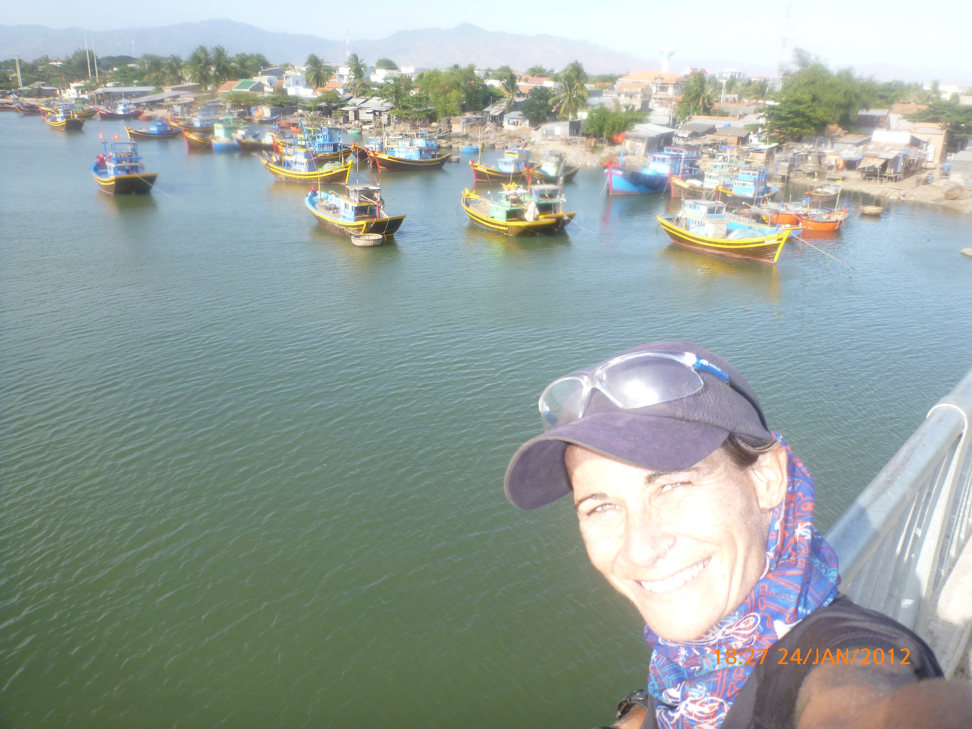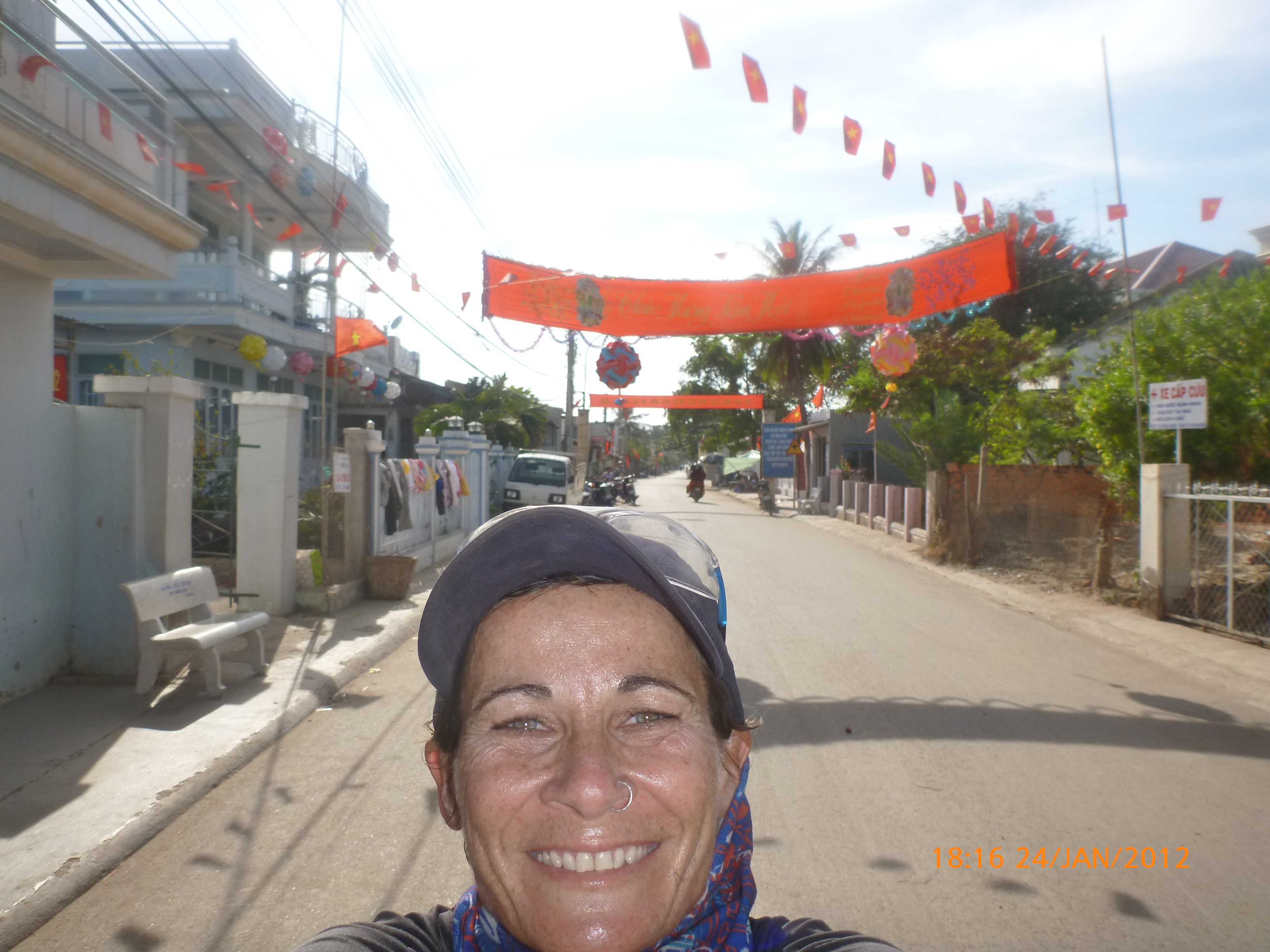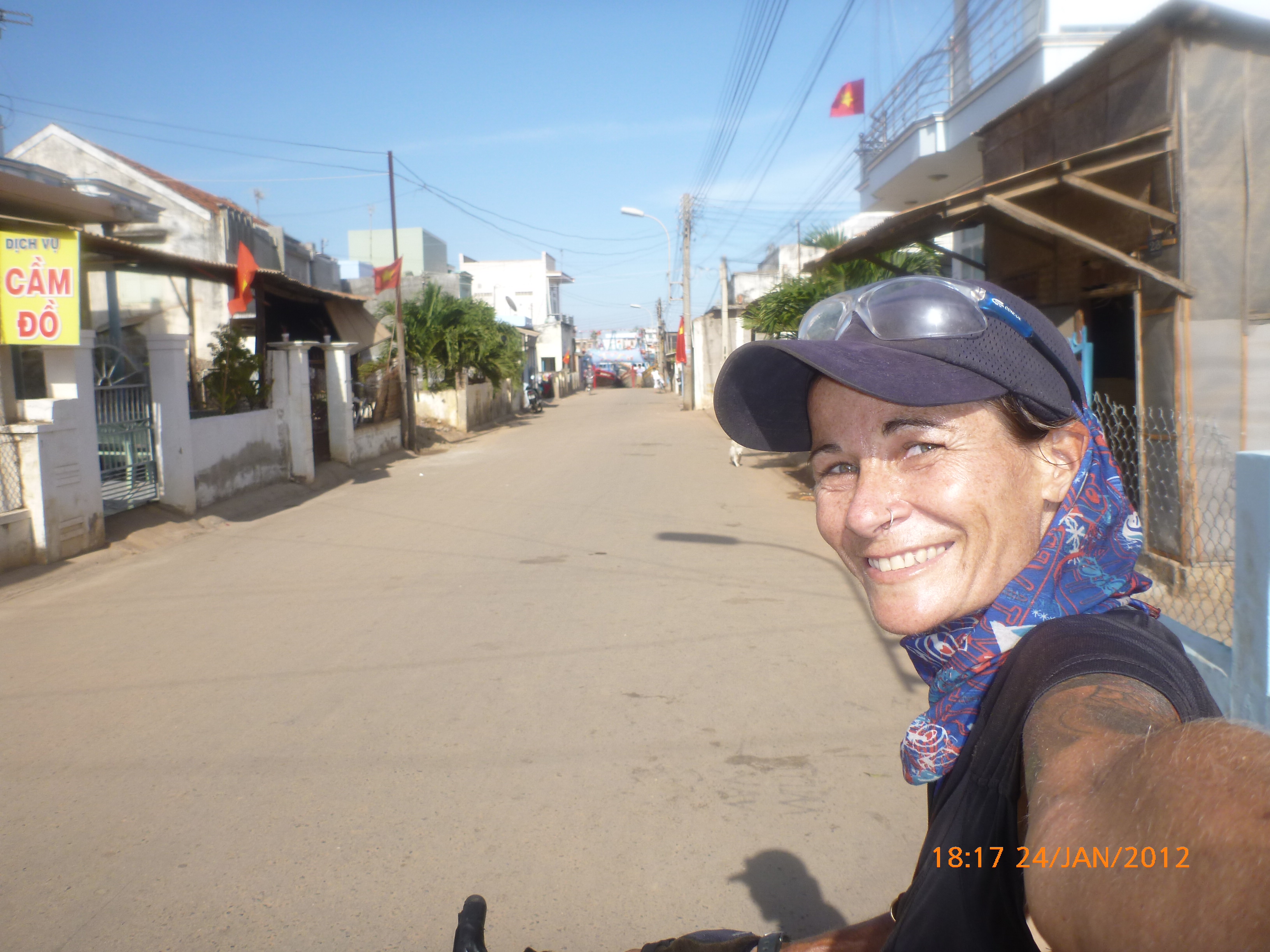 Day 66 1014 days to go. Distance: today 41km total 3752km. It’s 8.53pm Saturday 4/2/2012 Hue. What a cool city. Lonely planet describes Hue as the intellectual, cultural and spiritual heart of Vietnam. Hue is split along the Song Huong (Perfume) River. The south bank is about cuisine and entertainment. The north side is all about the citadel remains, tombs and temples. The empirical city was built in 1800. It’s walled and moated and has an imperial enclosure and forbidden city. The area has been world heritage listed and it’s extremely grand. Given it’s not that old it has however survived the war and is clearly treasured. It’s very spectacular to ride around the well groomed grounds. The crumbling remains of the outer old city wall has been built around by outer villages and it looks great with homes and chickens living amongst the rock wall. This is outside the touristed area but has a road all way round. Rube and I peddled it today and it was really interesting to slowly check out. Obviously the inner citadel area is mostly visited and is very grand. We got some good pickies. There’s lots of outer funky districts very arty and full of young folk and families and heaps of students. It’s still all part of the ‘old town’ so the bars and hang outs are amongst the old buildings and add to the charm. That’s a good word to describe Hue, it’s charming and very tasteful and atmospheric for a well touristed city. Boats potter along the river and you can do cruises along the river to emperors tombs which are dotted along the river side for about 15kms. So it’s definitely worth adding to the ‘to do’ list if you want to travel to Vietnam. The ride here this morning was dry after early rain which cleared and I took the opportunity to cover the 40 so kms. I found a really great hotel $10 great price with all the facilities and wifi. It even has a bath which I indulged in this afternoon sooooooo delish. Theres a supermarket about 50m down the road. Do you think I’m happy? So I’ve topped up on food supplies and bought 2 baked Vietnamese deserts for dinner with a hot chocolate yum. I’ve got a nice tummy now backing up from hoi an so the reserves are good for the next cycling stage. I havnt yet heard how the birthday party went. The family are probably sleeping it off under a palm frond and will wake thinking they are in noosa. I went to adjust Rubes brake and gear cables today as they’ve been a bit dodge traveling down the passes the last days. Both brake cables broke when I pulled at them with the pliers opsy happy it was here and not traveling down a wee hill. I asked the hotel man if there was a bike shop showing him Rubes cables and he told me to wait upstairs and he’d sort it. About 30minutes later Rubes got new brake cables threaded for $1. They still need adjusting but I can do that. A friend commented recently that Rube will tell me when she’s needing some attention so I’m taking the opportunity to get her gear cables changed as well tomorrow and give her some TLC. I also want to find an internet and see more of the city so I’m happy to stay another day and an awesome hotel and city to do so. I did some itinerary map and planning tonight and have sorted the days leading up to crossing the Chinese border, freaky hey the thought of China. For now it’s very much still Vietnam and some amazing places to check out now heading to the northern area. I also have found some camping places in Cuc Phuong National Park 45km south of Ninh Binh and on Cat Ba island in Halong Bay so very excited about that. Bonus today having a bath to wash out the wet stinky clothes and they’re hanging out on the top floor for some serious airing. The view from the top floor balcony is awesome 360 degrees of the city. The architecture is very French and I got some cool shots tonight of the city lights. You’ll be very happy to know that I no longer have the hippy hairy legs and pits and am baby bottom smooth instead with no threading needed yayayayayaya. For now it’s to bed. Talk soon x