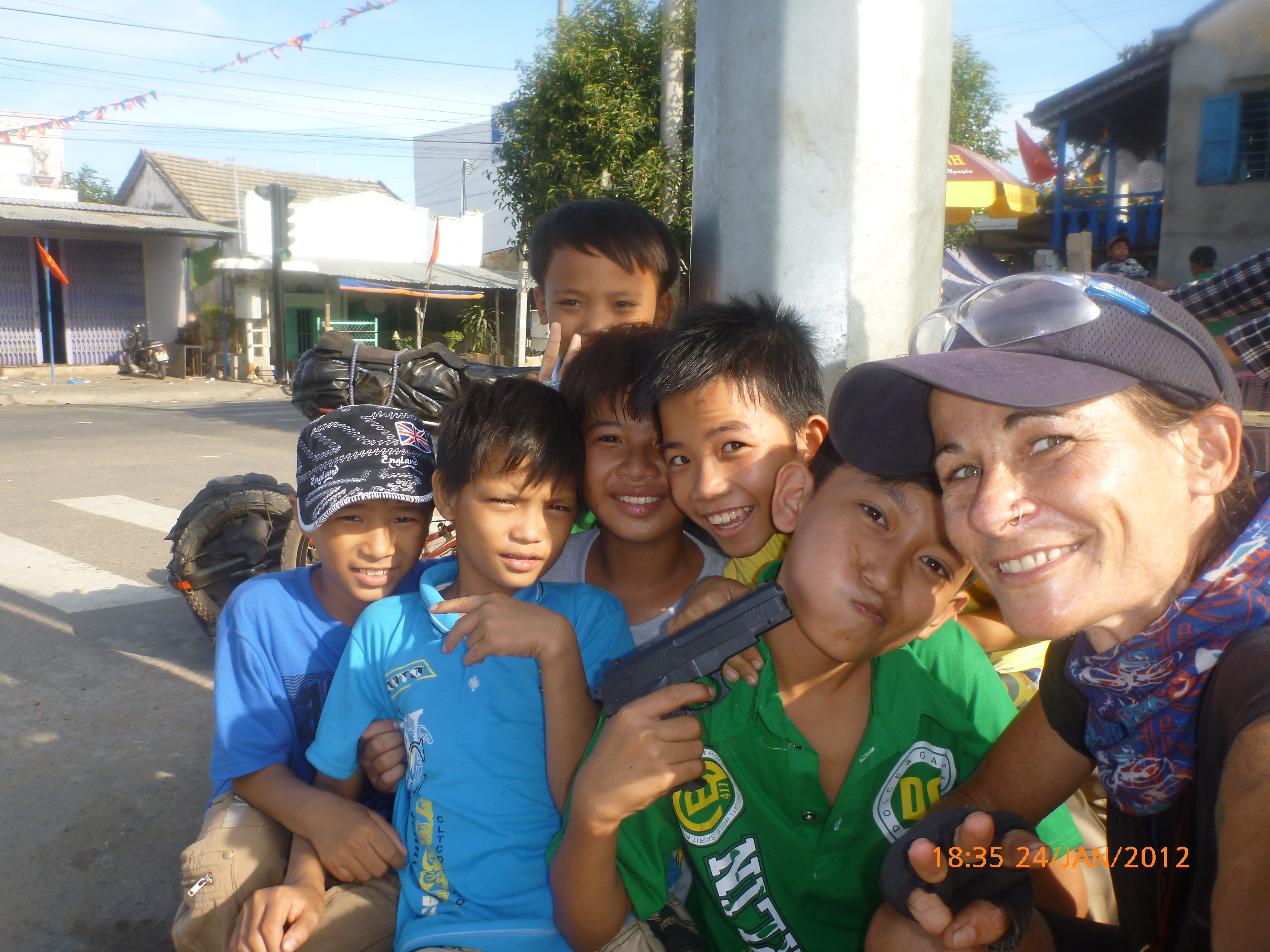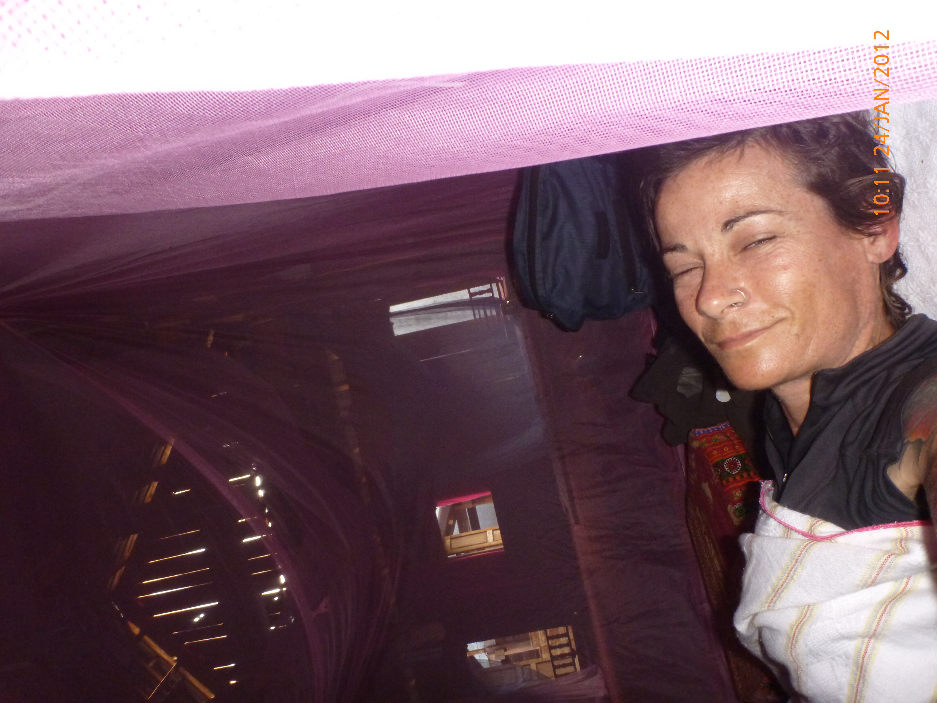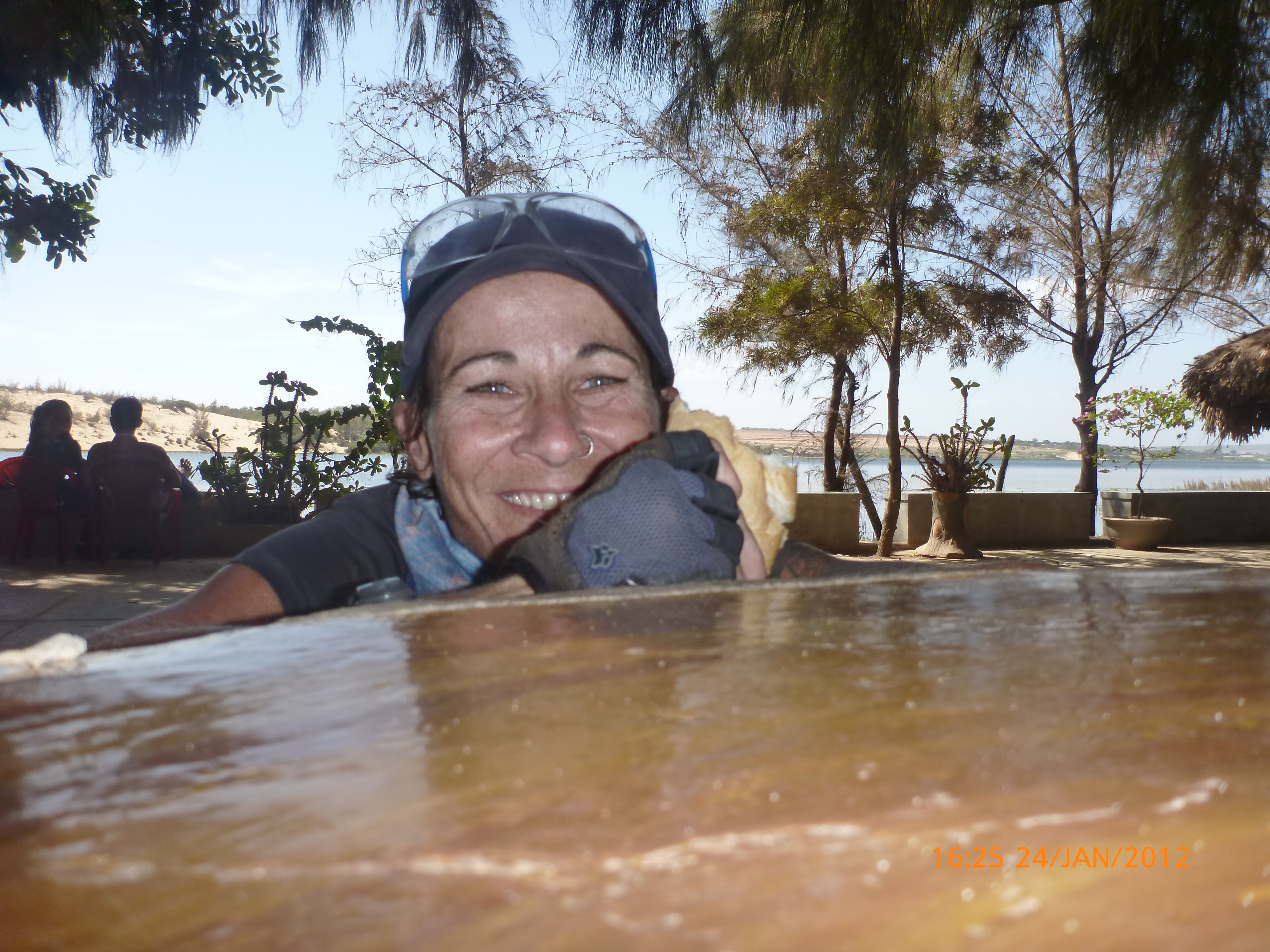 Day 66 1014 days to go. Distance: today 41km total 3752km. It’s 8.53pm Saturday 4/2/2012 Hue. What a cool city. Lonely planet describes Hue as the intellectual, cultural and spiritual heart of Vietnam. Hue is split along the Song Huong (Perfume) River. The south bank is about cuisine and entertainment. The north side is all about the citadel remains, tombs and temples. The empirical city was built in 1800. It’s walled and moated and has an imperial enclosure and forbidden city. The area has been world heritage listed and it’s extremely grand. Given it’s not that old it has however survived the war and is clearly treasured. It’s very spectacular to ride around the well groomed grounds. The crumbling remains of the outer old city wall has been built around by outer villages and it looks great with homes and chickens living amongst the rock wall. This is outside the touristed area but has a road all way round. Rube and I peddled it today and it was really interesting to slowly check out. Obviously the inner citadel area is mostly visited and is very grand. We got some good pickies. There’s lots of outer funky districts very arty and full of young folk and families and heaps of students. It’s still all part of the ‘old town’ so the bars and hang outs are amongst the old buildings and add to the charm. That’s a good word to describe Hue, it’s charming and very tasteful and atmospheric for a well touristed city. Boats potter along the river and you can do cruises along the river to emperors tombs which are dotted along the river side for about 15kms. So it’s definitely worth adding to the ‘to do’ list if you want to travel to Vietnam. The ride here this morning was dry after early rain which cleared and I took the opportunity to cover the 40 so kms. I found a really great hotel $10 great price with all the facilities and wifi. It even has a bath which I indulged in this afternoon sooooooo delish. Theres a supermarket about 50m down the road. Do you think I’m happy? So I’ve topped up on food supplies and bought 2 baked Vietnamese deserts for dinner with a hot chocolate yum. I’ve got a nice tummy now backing up from hoi an so the reserves are good for the next cycling stage. I havnt yet heard how the birthday party went. The family are probably sleeping it off under a palm frond and will wake thinking they are in noosa. I went to adjust Rubes brake and gear cables today as they’ve been a bit dodge traveling down the passes the last days. Both brake cables broke when I pulled at them with the pliers opsy happy it was here and not traveling down a wee hill. I asked the hotel man if there was a bike shop showing him Rubes cables and he told me to wait upstairs and he’d sort it. About 30minutes later Rubes got new brake cables threaded for $1. They still need adjusting but I can do that. A friend commented recently that Rube will tell me when she’s needing some attention so I’m taking the opportunity to get her gear cables changed as well tomorrow and give her some TLC. I also want to find an internet and see more of the city so I’m happy to stay another day and an awesome hotel and city to do so. I did some itinerary map and planning tonight and have sorted the days leading up to crossing the Chinese border, freaky hey the thought of China. For now it’s very much still Vietnam and some amazing places to check out now heading to the northern area. I also have found some camping places in Cuc Phuong National Park 45km south of Ninh Binh and on Cat Ba island in Halong Bay so very excited about that. Bonus today having a bath to wash out the wet stinky clothes and they’re hanging out on the top floor for some serious airing. The view from the top floor balcony is awesome 360 degrees of the city. The architecture is very French and I got some cool shots tonight of the city lights. You’ll be very happy to know that I no longer have the hippy hairy legs and pits and am baby bottom smooth instead with no threading needed yayayayayaya. For now it’s to bed. Talk soon x