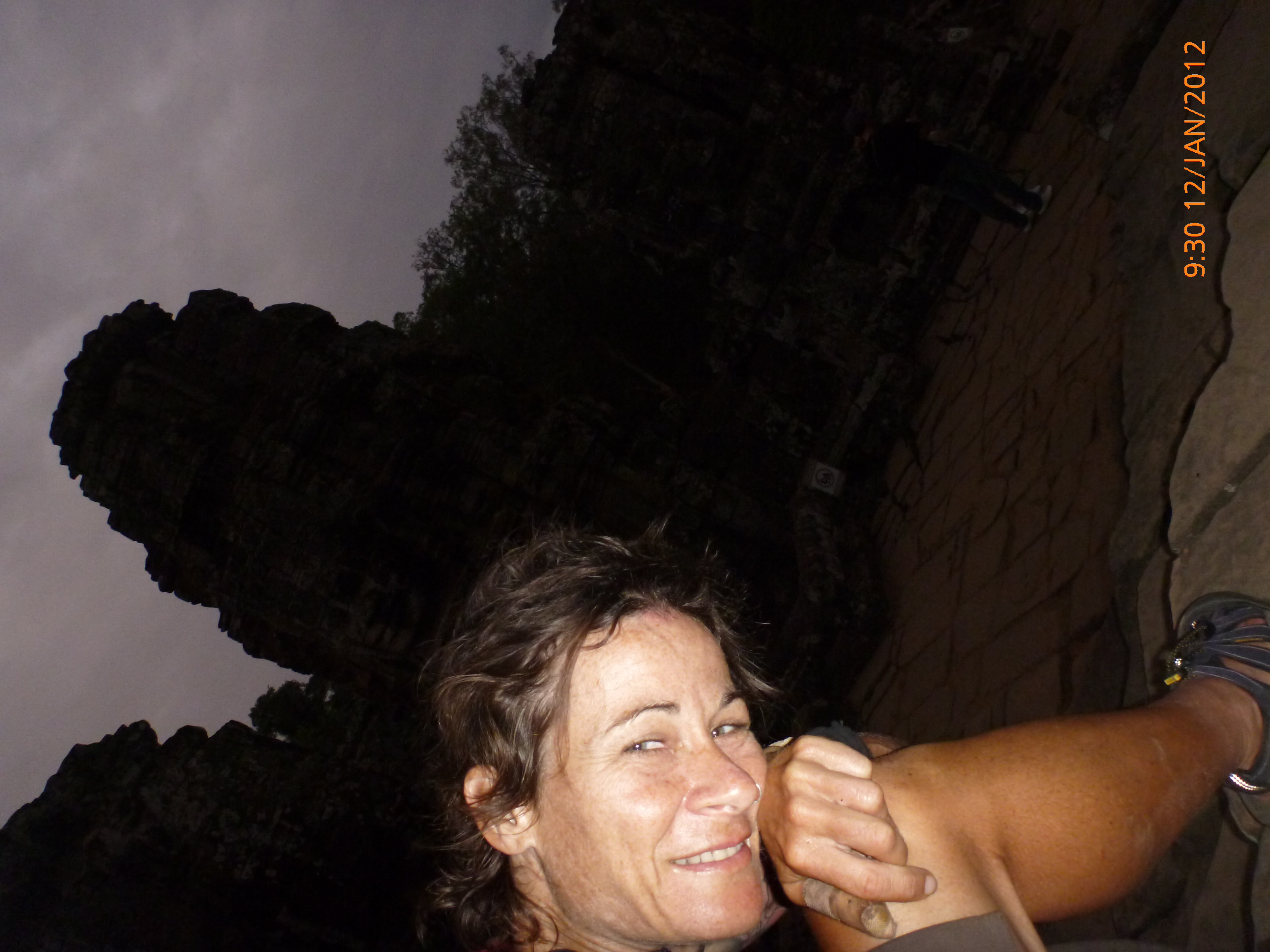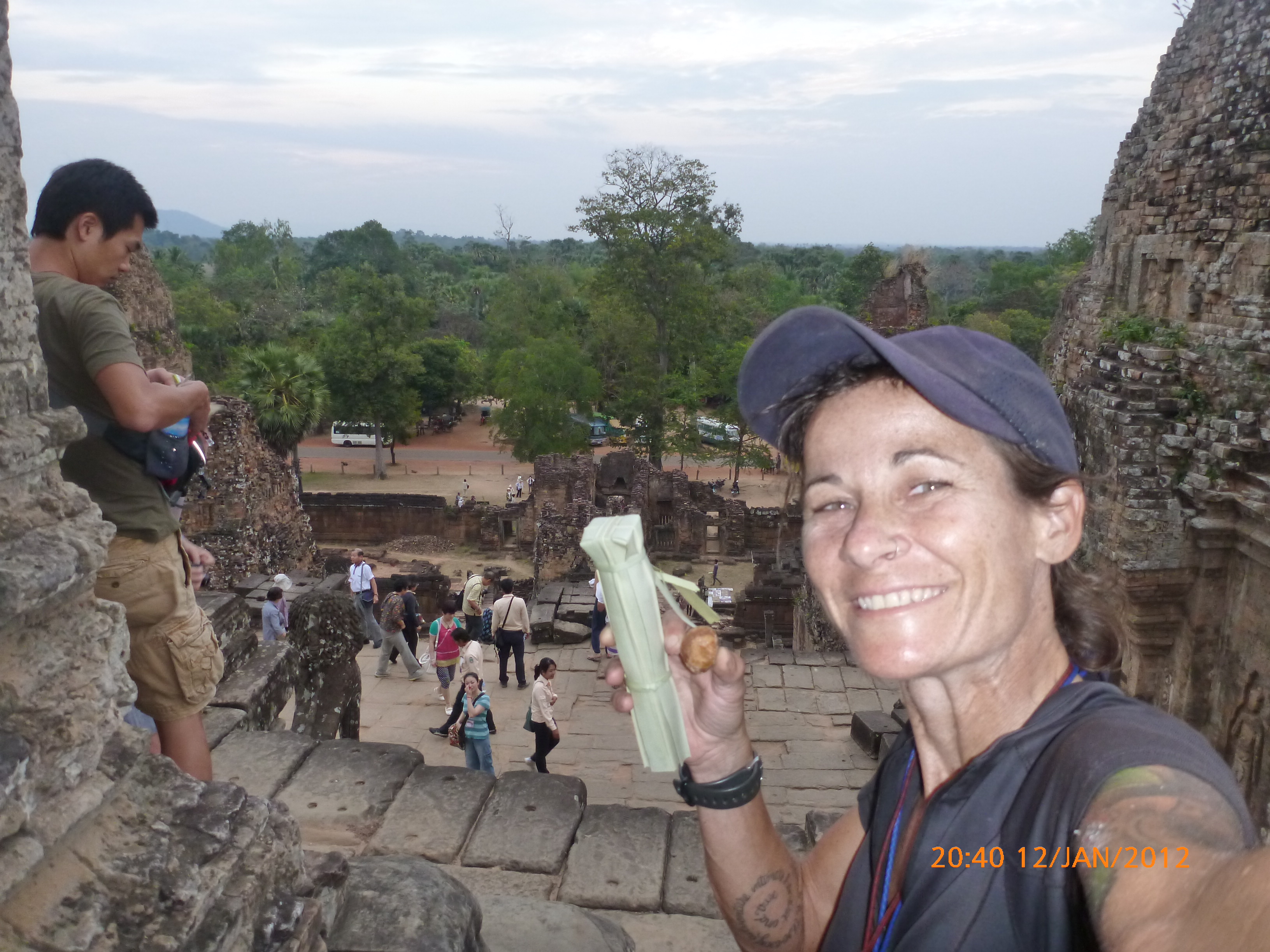 Day 42 1038 days to go. Distance: today 82km total 2222km . It’s 4.45pm wednesday 11/1/2012 Banteay Srei. I’m sitting in front of my favorite temple by far. Lonely planet calls it the art gallery of Angkor and it is. It’s a jewel. A Hindu temple dedicated to shiva cut from pinkish sandstone that glows this time of day giving perfect compliment to the finest stone carvings seen on earth. Shiva is the hindu deity. The exquisite detail of these carvings is jaw dropping and it’s beyond comprehension that it is carved let alone carved in stone. It’s crazy. The designs are very feminine and delicate clearly for a chick to which the pink hues accessorize perfectly. The temple dates back to 967AD and the gemstone in my books. But then again I’m a chick 🙂 This morning started perfect with a Skype date with my partner I love Skype. Then I booked my seat on the 6.30am return bus to phenom phen Friday and found where the main bus station is different to where I arrived. Next I found the post office to send my postcard friend Robbie her Cambodian one x my last ‘have to’ was to but some tinidazole antibiotics as I most likely have guardia bug going by the symptoms which are very specific as anyone who’s had it will know eeek. After this I headed back to Angkor watt to check out the temple. It was such a treat just to wonder and explore this crowd pleaser. It’s so massive there’s heaps of spots on the far sides away from the tourist route you can just sit and take it in. The sandstone blocks from which Angkor watt was built were floated down the seim reap river on rafts. When you see the size and PprocOye the weight each stone must weight this is mind blowing considering the labour and era this feat was achieved. The temple has three stories the first being galleries of wall impressions and Buddha statues. the second and third stories are domed each with towers shaped like lotus buds. The stairs to the central temple measuring 50m are deliberately steep because reaching the kingdom of the gods should never be an easy task. I’ve had so much relaxed fun today with a good ride out here this arv through tree lined backroads and small villages. The villages are selling creaming palm sugar boiled on wok shaped urns on the roadside over a fire in clay made kiln. It looks as great as it tastes and I scored a huge tub for $1. It tastes like crystal used honey yum. I had to stop at another tiny stall with an extended family sitting by their half dozen bunches of bananas which I relieved them of 1 for 50c and a group photo. We all had giggles trying to squeeze in the 3 generations and me but managed just. It’s been such a cool day loving it and the space here in the late afternoon light tops it. Tomorrow I have a couple of options where to head and will decide later over dinner. There will definitely be choice sun rise and sunset spots to end what’s been an epic visit to ancient Angkor. Talk soon x ps the police man on guard duty let me in the ropes area to take the last of my pickies good cop story nice. Bit of a long headtorch ride home but worth it x
