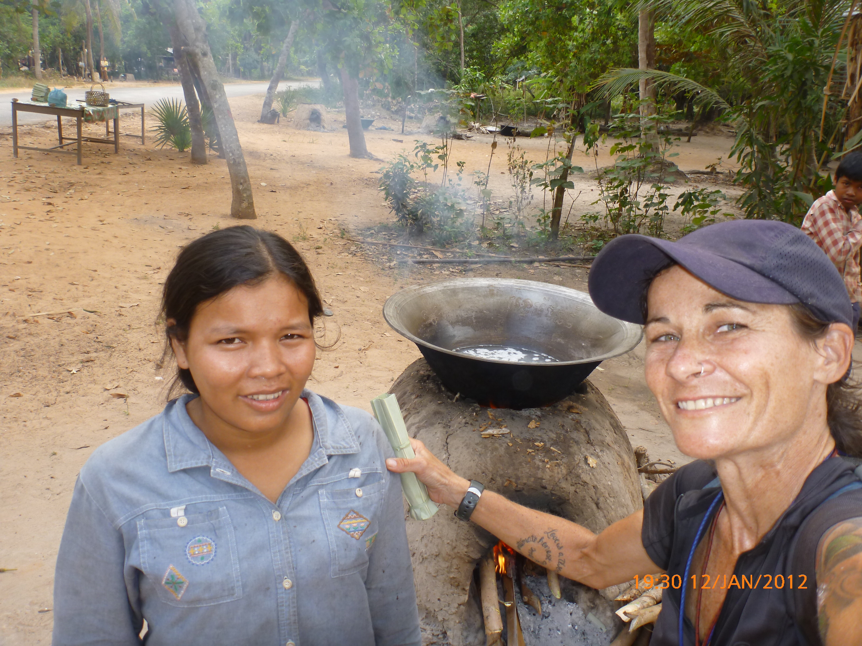 It’s 5.00pm and I’m sitting at Pre Nup temple I really enjoyed this space yesterday and ran up the stairs as a crazy stair lady must do when presented the impressive set that grace this watt. Cambodian stairways to heaven as opposed to their roads to hell. Found a few of them this afternoon and I’m very bumped out for the day with a sore but. I’ve has an awesome day but and heaps of fun. I had a great Skype with my partner for about 3 he’s awesome. Then I headed out for a long ride this arv. I went to the western Baray which is a huge water expanse created by the ancient Khmer now used for weekend escapes by the locals. It was a bit of a non event but good for a ride. The local village folk are so resourceful and in het to see small examples of this when i cycle which i really enjoy. This young lad today was fishing with a bamboo pole and top eyelet where the line was thread through. Instead of a reel he had the line rolled round a water bottle. He somehow manage this hand line as part of the rod set up and could cast beautifully. After this i cycled the way through the main temple group for one last look and out to where I saw the clay pits and culdrens used for making the palm sugar paste. I stopped at the home where the woman had a pot of palm date juice on the early boil and she explained by actions how she boils it and once it gets to a certain point you stir it like crazy and it reduces to a yellowish paste. Pounded dates are squeezed through a cloth to gather the juice. Water is added and that’s what get boiled up. She was great and liked sharing her trade but not getting her photo taken. When the paste is boiled longer dollops are dropped in palm leaves and cooled to a fudge which of course I had to buy some to support the local industry. So the sunsets not spectacular but the setting perfect for palm sugar fudge and a coffee. I won’t forget the last few days and it’s been really special for me to share choice times with you. Tomorrow morning we head 5.30am for the 6.30am bus back to phenom phen. Thank you Siem Reap. Talk soon x