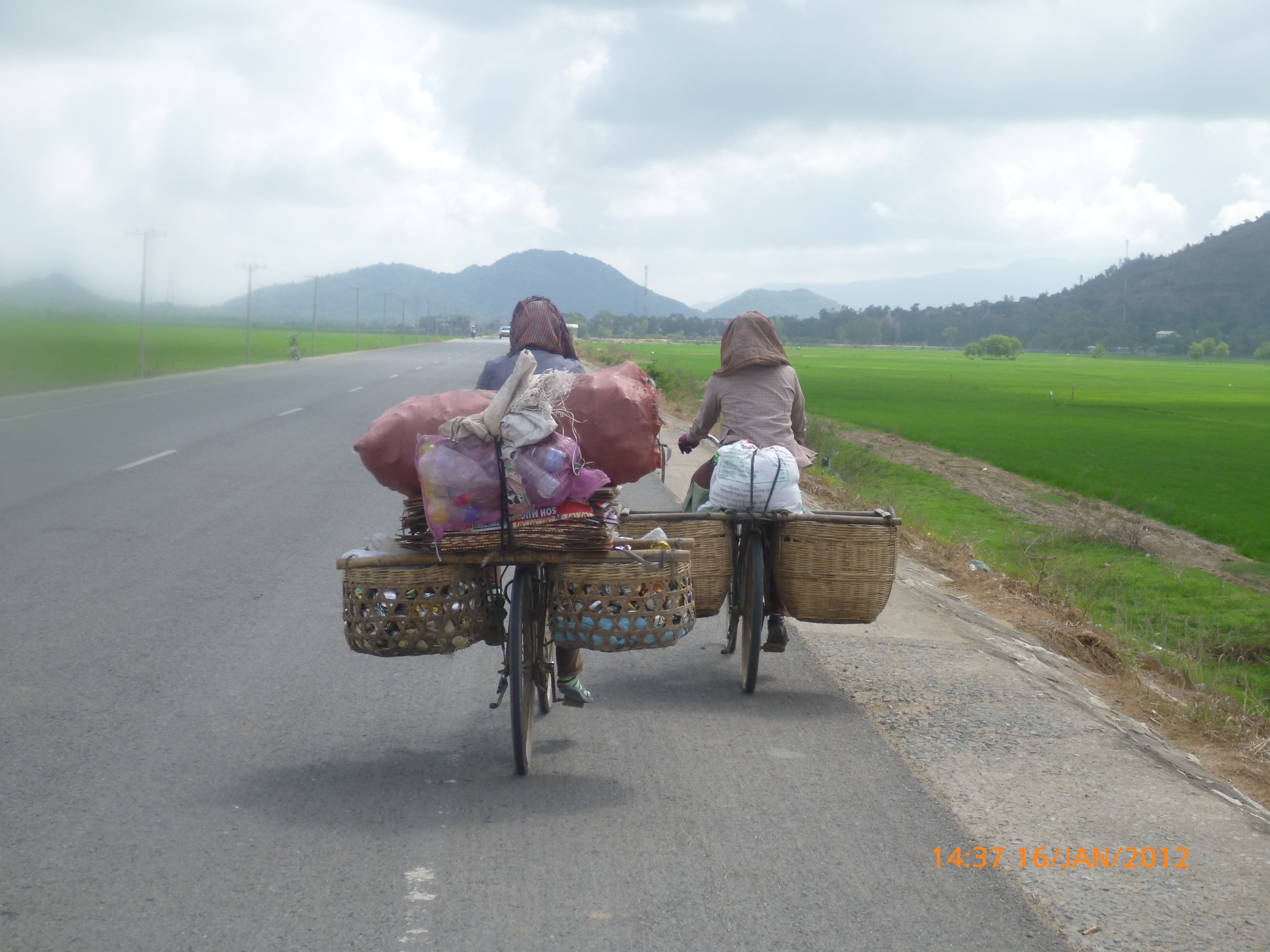 Day 52 1028 days to go. Distance: today 81km total 2741km. It’s 7.30pm Saturday 21/1/2012 Xuan Loc. I’m so happy happy happy after feeling so crappy crappy crappy 2 hours ago and for the most part of the day. I think today was mentally my hardest riding day. I’ve done more physically demanding days but this one was just tough !!!! In the words of Sesame St today was brought to you by the letter H and the number 6. Six nasty H’s made for 81kms now in the past yay – Ho Chi Minh exit, highway, headwind, hills, horns and heat eeeeeeek. But as we know every cloud has a silver lining. When it was ‘I’m so over this’ o’clock and going up yet another long hill I felt this bump from behind and a lad on a moped was using his foot to push me and Rube up the hill. A moped powered push yayayayayaya. Ive seen the locals do this balancing but effective trick before pushing along broken down mopeds or bicycles carrying or towing loads of all size and sorts. I never thought I’d be on the receiving. I could have given him the biggest kiss settling for the biggest thumbs up. It lasted a few hills worth their weight in gold. Thank you Mr whoever you are. He must have sensed I wanted to be beamed back home at that precise time. Yet another rescued by a