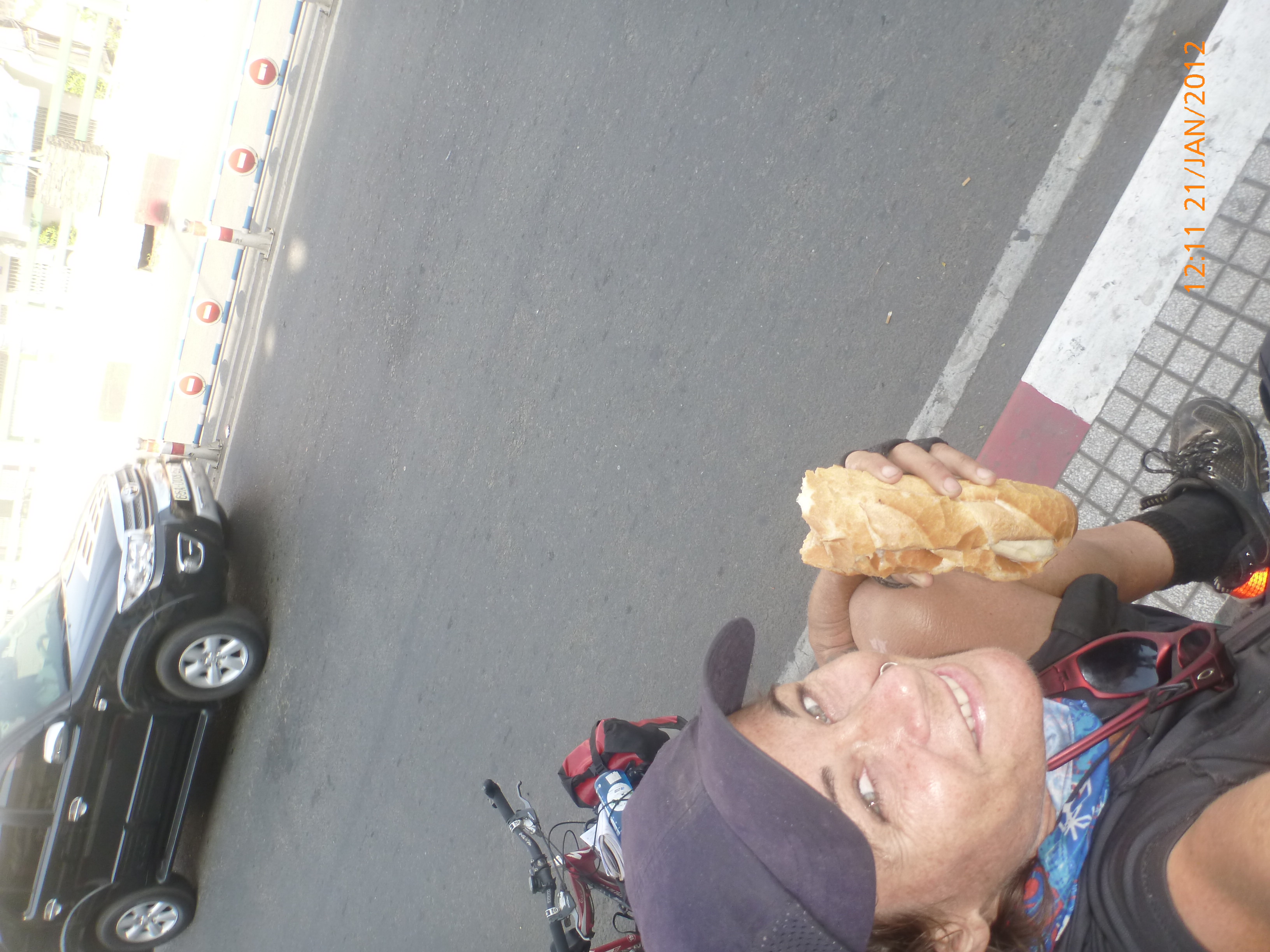 Day 48 1032 days to go. Distance: today 63km total 2389. It’s 7.00pm Tuesday 17/1/2012 Long Xuyen. This has been one of my favorite days. Planned stuff and lots of unplanned stuff all rolled into one very cool day of it. I’ve just got in from checking out the city for the afternoon, cleaned up squeaky clean and sitting on the bed under the fan posting to you fine folk. They’ve got the Australian open being telecasted and Layton Hewitt’s just won his match yay. I went into the morning market first up today and found freshly baked baguettes for the day. The cycle was fabulous. The road followed the mekong right on top of the local river life. I stopped for a break and just watched the comings and goings people washing transporting goods, ferrying people, just everyday stuff but on the water and such great people watching. Actually that’s pretty much the theme of the day for me. I got to nejoy the everyday life I came across by riding with it and sitting and watch it go by both on the river and on in the streets. Rube and I are so used to being gawked at like we got two heads and six wheels but I laughed out loud today. We were going through a town looking about and I caught our reflection in a shop window. We definitely look odd enough without extra bits and I cracked up. It was a good perspective and I’d gawk at us too but more so because we’re two spunky sportos 🙂 I had lots of people contact time from the very little to the very old and I loved the mix. Some people would just gawk but most would flash a smile or smiled back at my crocodile grin. it’s happened a few times over the last couple of days where guys would follow me on their mopeds not being weird but checking out rube then heading off looking back giving us the thumbs up, big nod and a grin. It’s cool. That’s quite a common salute the thumbs up or the peace sign from all ages but more so teenagers. I rode past this vending lady grilling bananas covered on cocoanut creamed rice and it smelt so good I had to stop and buy one. She was great and giggled the whole time. This old fella came up before heading and asked me ‘where you go’ and I showed him the map and he said ’54 km’ gave Rube a shake and nodded his approval and waved us on our way. The sprawl of towns doesn’t end one rolls into the next with very little unused space. The volume of people is a real stand out but there’s not a sense of aggression amongst the people. The chaos seems accepted and just a part of life so you just join them. It’s such a surprising step up from where Ive been with respect to the volume of people even Phenon. It makes me wonder what Saigon will be like but I’ll just ride that one it comes I think. One day at a time and there’s enough going on in the day to move from one moment to the next that’s for sure. I stopped today to watch this bicycle repair lady serving a bike and so into it and efficient. It was fascinating and I got a couple of pictures before she realized she had an audience. I gave her the biggest grin and thumbs up and shook her hand calling her a jet. She had no idea what I was saying but new it was a compliment coming from the passing female cyclist so she loved it. I passed lots of rice drying out on the road and coconut shell pieces that they dry for kindling. i also passed a few shops drying incense sticks. I arrived Long Xuyen about 1pm and its a huge city bigger than chou Doc and spread over such a distance. I didnt have a city map in my guide book but had a couple of names of hotels. There was just no way of finding myself around despite trying for about an hour to find where the hotels were. I ended up stopping at a cafe to ask and the man who owned it offered to leaed my by moped to one of the hotels in the book. how lovely was that. I sat with his elderly mother who was very amused by my visit and situation. He took me to the hotel which ended up being baulous only $5 and right in the city centre I think. It’s just up from a roundabout with a monument so I used that as a landmark to check out the city for the afternoon. Found the river markets where people living on boats were preparing their produce it was so interesting to watch. So much so I just had to stop sit myself in the street just up from the river and watched the markets and general goings on, passing of people and vendors it was just awesome. I sat there until the sun started to set so I thought I’d head for another ride about before it got dark. I found the river side markets of mostly flowers and assorted fruit trees and bonsai. I was there right on sunset and it was beautiful on the water. It started getting dark so I headed back to the hotel and here I am. Really loving the difference of Vietnam and the unique daily life and activity and being amongst it. Great day and onto Cantho tomorrow. Starving!!!! talk soon x