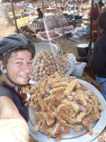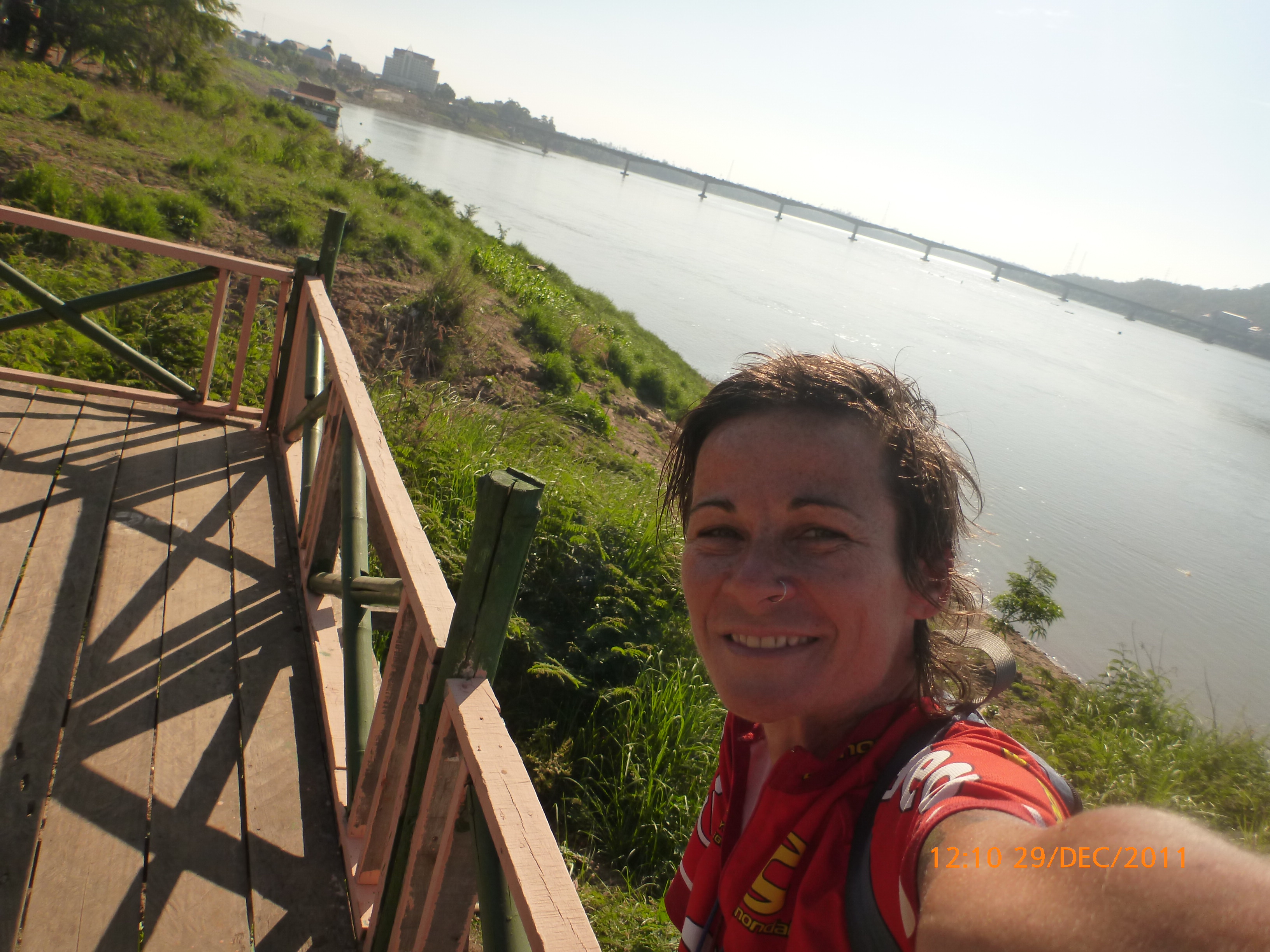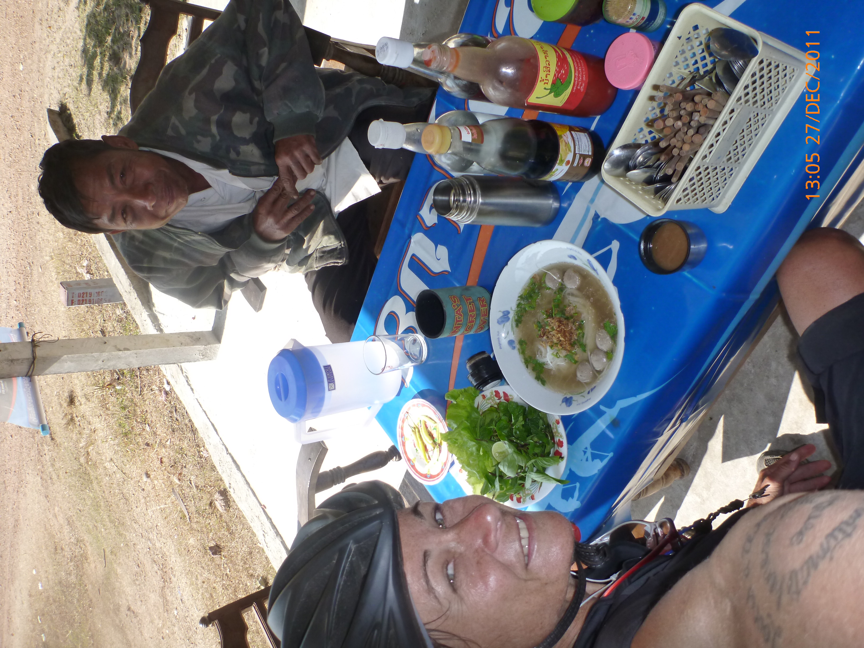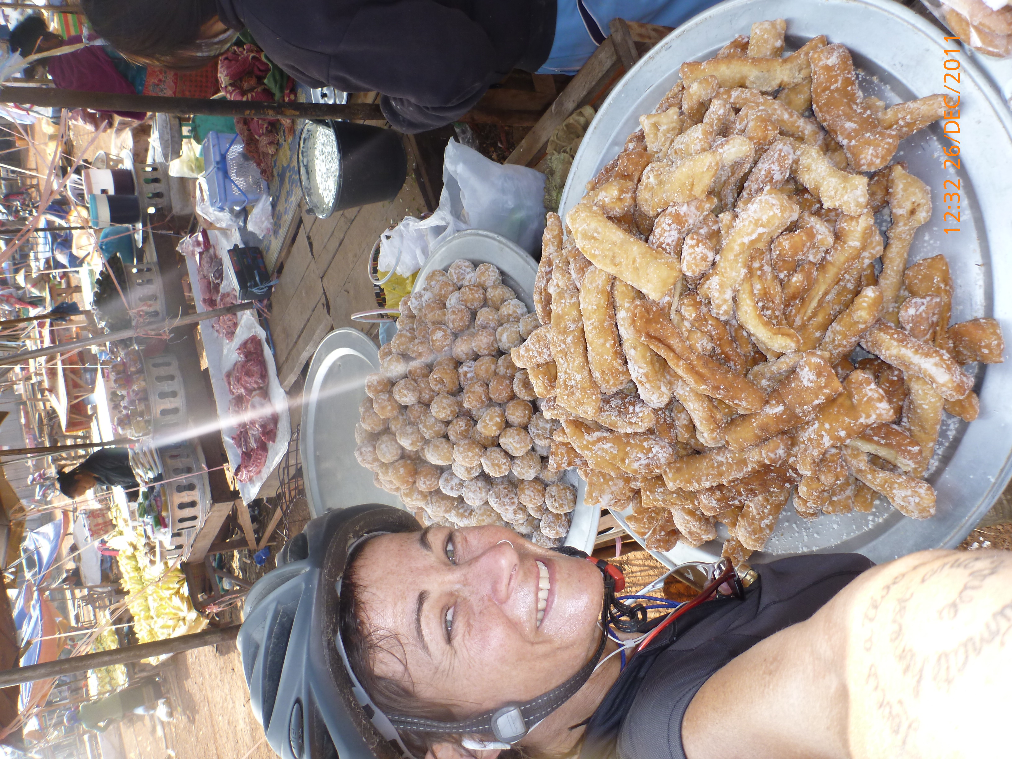 Day 24 1056 day to go. Distance: today 112km total 1008km. Hi there Just realised I’ve crossed the first 1000km mark that’s a mile stone yay. Now that was a huge day the road was good but windy wicked and long long long haul. Did have a great stop at a midway town Hoi Don where there was an awesome morning market and found this great noodle stall selling fresh mint, lime and tofu noodle salad for 2oookip. I indulged 2 for lunch and bough 2 more for dinner later yummmmmm. Anyway was so happy to arrive about 4pm to find a place to stay and get some laundry arranged, showered and pruned for my Christmas Eve date for 5pm. Found a dormitory style accommodation for 30000kip which is great but a bit crappy to share as I’ve been spoil having my own room for a bit more. No complaints but as accommodation is a bit scarce here for some reason – HOWEVER – they do have internet yayayayayayayaya. Unfortunately the connection was crap so we talked briefly and made another date for 8am 25/12/2011. Found my way down to the water front Tha Knaek is right on the Mekong and was looking out over the city lights of the Thai town across the river bizarre that another country is just over the other side of the river. Was still hungry after noodles so I found a pancake vendor yum no idea what was inside but it was savory sweet and tasted great. Then I found another vendor that was selling doughnuts filled with a sweet bean mix yummy again. OK so now I’m full and very sleepy and it’s cold here it would have been about 10degrees and time to high tale it back to the guesthouse and to bed. Happy to be enjoying Christmas tomorrow just chilling out I’m a bit coldy, tired and homesick given it’s Christmas so it’s an early night to bed sooky lala. Talk soon