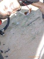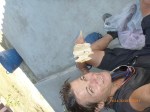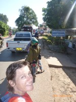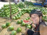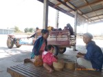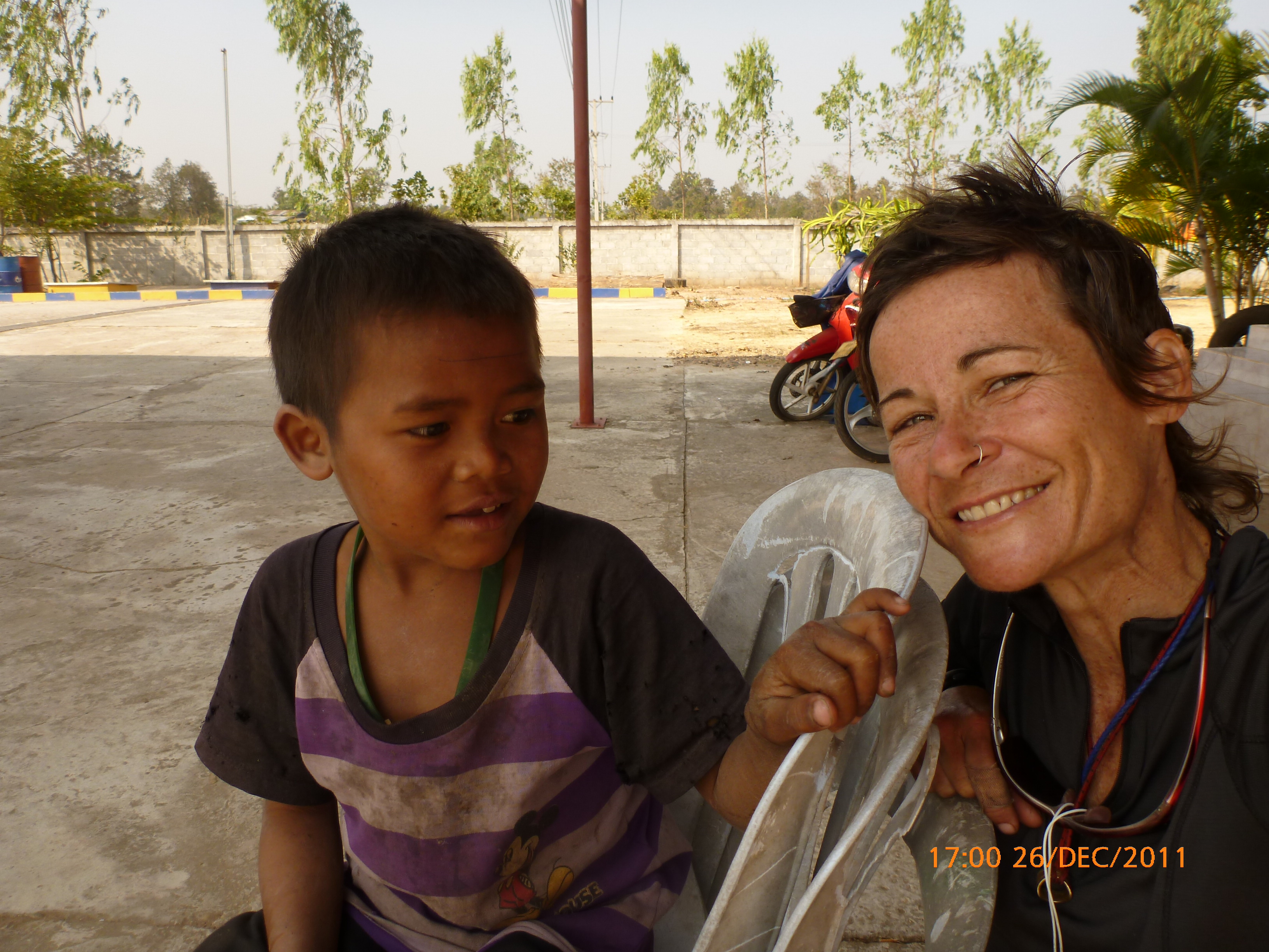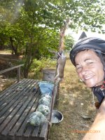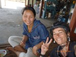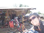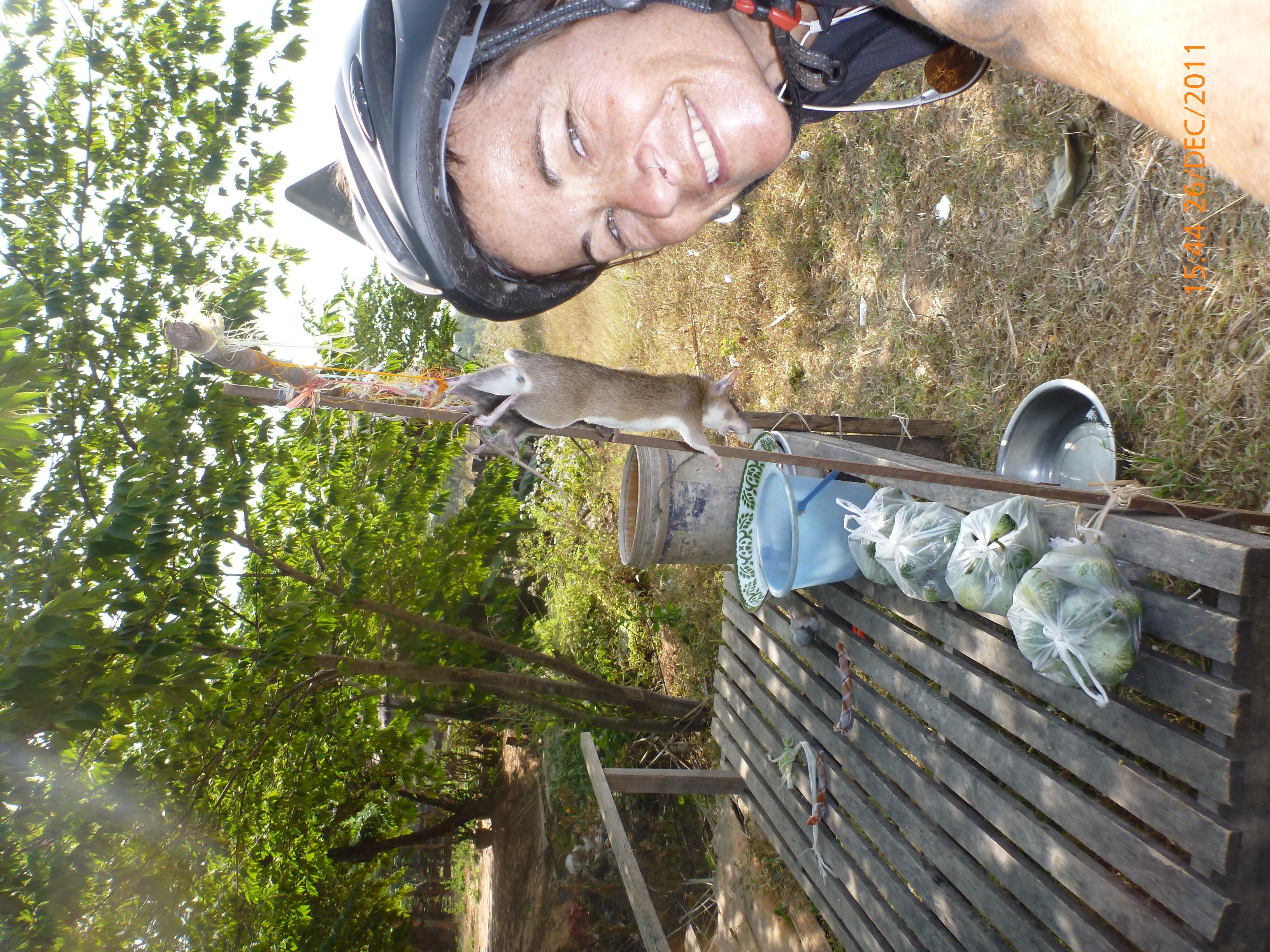 It’s 5.46pm same day and I got to Seno this arv. It’s been such a nice day. I relaxed into the kms and had heaps of stops to mix with people that got my attention. Hey they play botchy here with the silver balls. It’s weird cause my family are big botchy players at the inaugural boxing day bbq and I so thought of them today seeing the locals right into it. The area is again agriculture but now heaps of sugar cane growing and watermelons. So there’s lots of smoke in the air as they still use the grow and burn style but made for a great sunset tonight. I passed this lad who held up a rat he had trapped and was clearly proud of the fact. Shortly after there was this stall with rats all hanging and really small melons for sale. I had to stop. The little girl ran inside and came out with her mum again no teeth but all smiles and hello. Of course with the cane there’s heaps of rats so what’s plentiful is what’s eaten. The lady showed me that the baby melons get put inside the rats when they cook and apparently taste pretty alright. Lunch stop was at this servo good spot with toilets and water for a top up. I went to sit on the ground near rube and a man and his kids were having lunch at a table and invited me over to join them. They offered me to share their sticky rice and a mixture of soupy dunks and I showed them my rice cakes and bananas and said I was ok but say with them anyway the man chatting away to me talking about goodness knows what but happy to chat he bought me a water and wished me well. I shared the last of my rice cakes with a long haired mutt that was giving me his best I’m starving look which he wasn’t but it worked. He looked a bit like my cousins dog Marley very cute. Later in the day I stopped to adjust Rubes rear brakes which were having a squeek and happened to stop next door to a mechanical place. Of course they were very keen to check out her bits. I must say I felt a little bit the idiot with the mechanically minded watching on but I sorted it and got their nods of approval. They even tried to find a #5 allen key amongst their tools but no luck really lovely of them to try but. You have probably guessed by now that children are everywhere here and appear from nowhere so of course there were a little gang hanging about playing tricks and getting chased and tickled by me which they loved as well 🙂 I did the photo thing before heading off and its a nice picture for keeps sake as it was big fun. I’m very fond of the whole grease monkey scene and am definitely a bogan at heart. I just need a few thousand more skills to be a bit more legit. I mentioned before there are so many goats in this area and as an avid fan of these beautiful creatures I find myself calling out to them constantly saying hello or be careful of the road etc. Their bleat is so unmistakable you hear it often from the fields or the footpaths and roads now I think of it. Lots of babies who have their own octaves lol they’re such darlings. I’ll grab a photo if I get the chance again I’m too busy chatting to think about grabbing the camera. Back at home the Woodford Folk Festival started today so the theme for the Ipod was the bands I bought albums from when I was there last year. I haven’t listened to some of this music for ages so I was singing to the goats while the Ipod lasted. Seno is allot smaller than what i thought and not much about except this huge market at the top of town where the road heads off to a place called Savannakhet a border town with Thailand on the Mekong. Allot of Thai products must come through this way because everything from clothing to jewelry to bags and accessories stuff you don’t see elsewhere were for sale and loads of it. And that’s bpretty much the town which is odd. I was really lucky to find a guest house with only one in town 50000kip. It’s got these two wooden chairs inside that way over 10kgs each made from some solid timber. They’re ugly as hell but would cost a fortune back at home in an antic place I’m sure. I checked out the foodstalls and bought some more rice cakes and bananas . I also found a bag of baguettes finally was game enough to buy skewered eggs 5000 kip for 4 that have been grilled. They look so weird skewered eggs but they’ll taste great as most food here does. On that note I’m hungry and going to set up a picnic for dinner yum. Good day all all round and very happy to be back on the road. Talk soon x