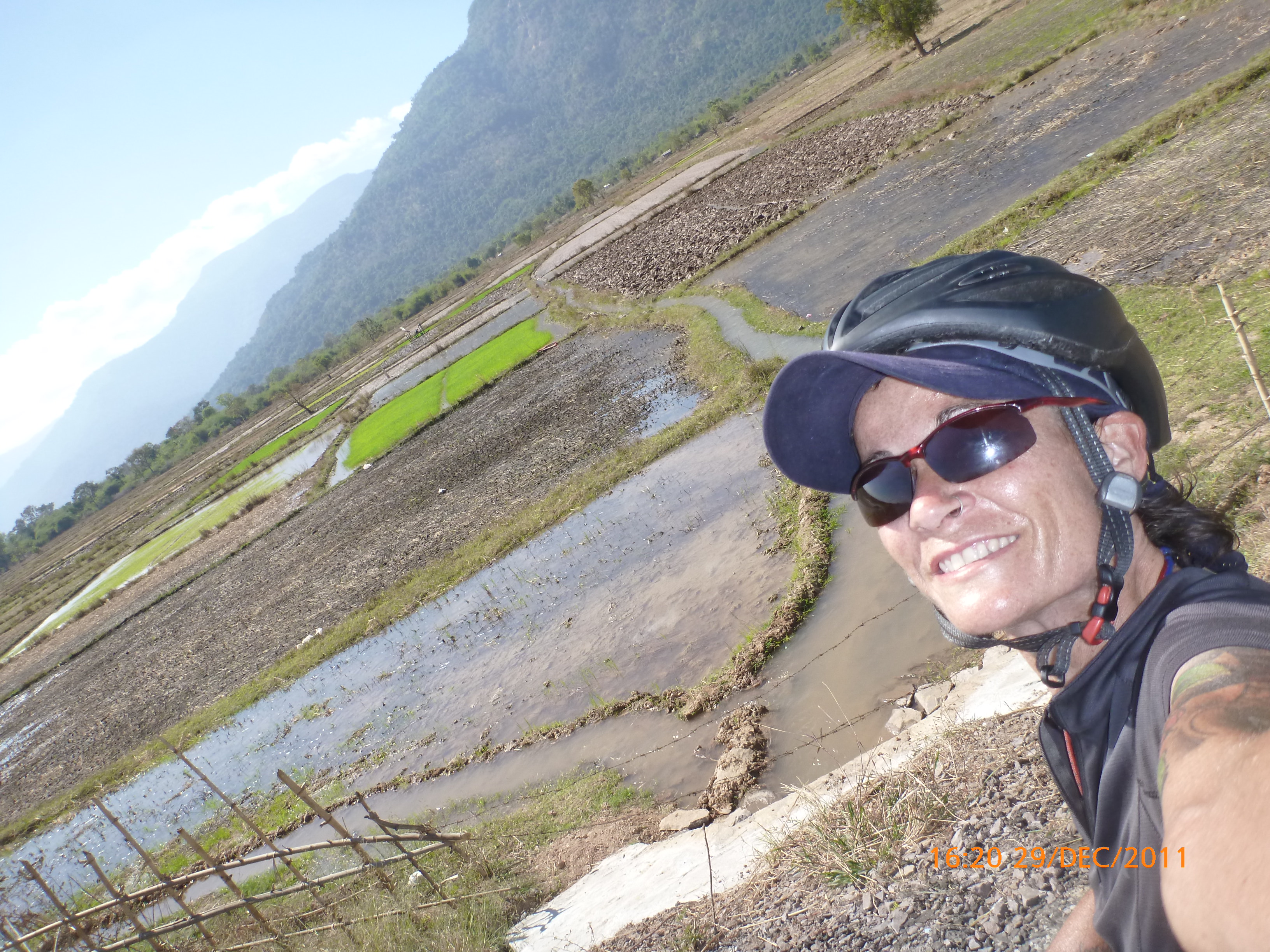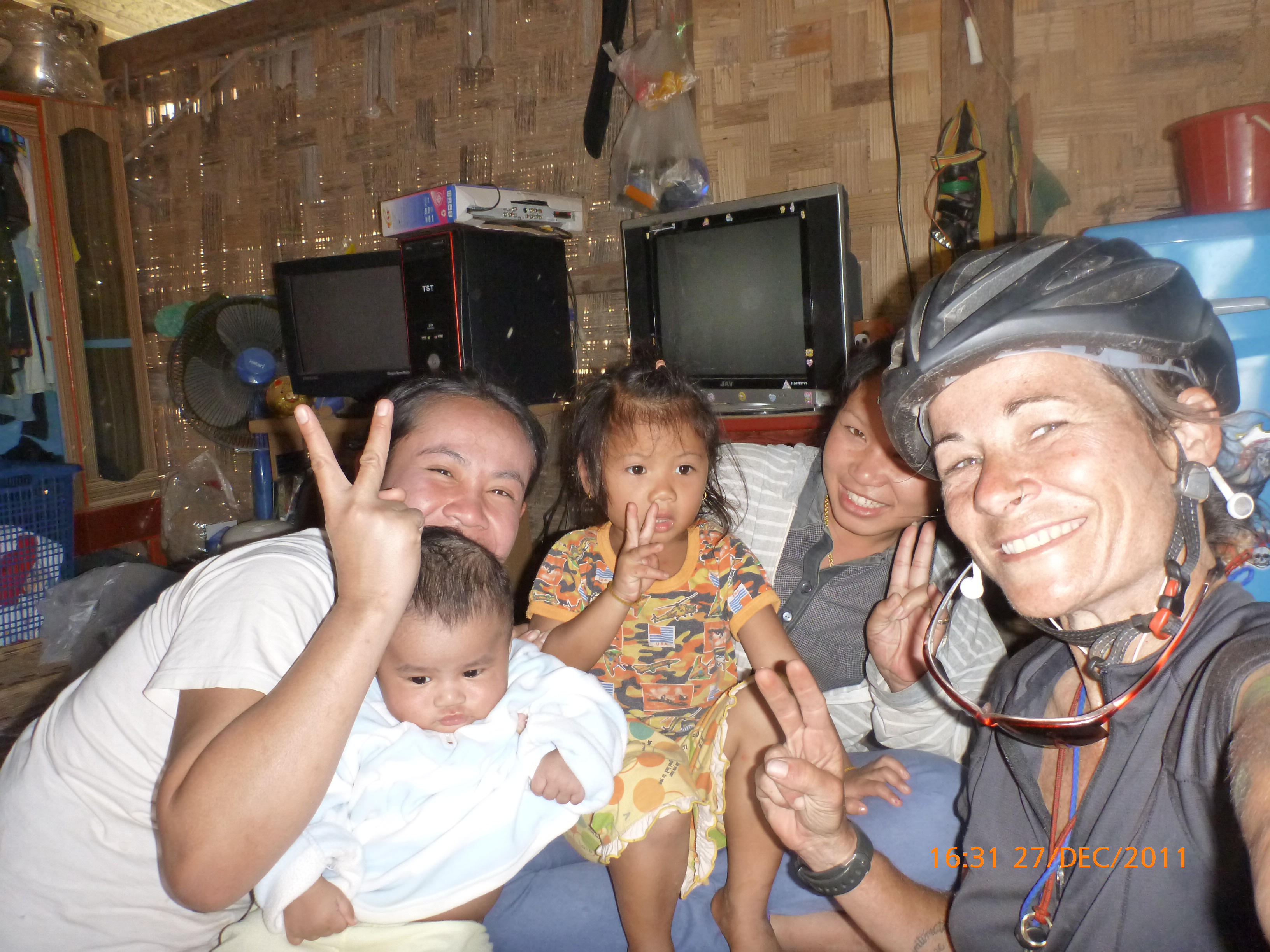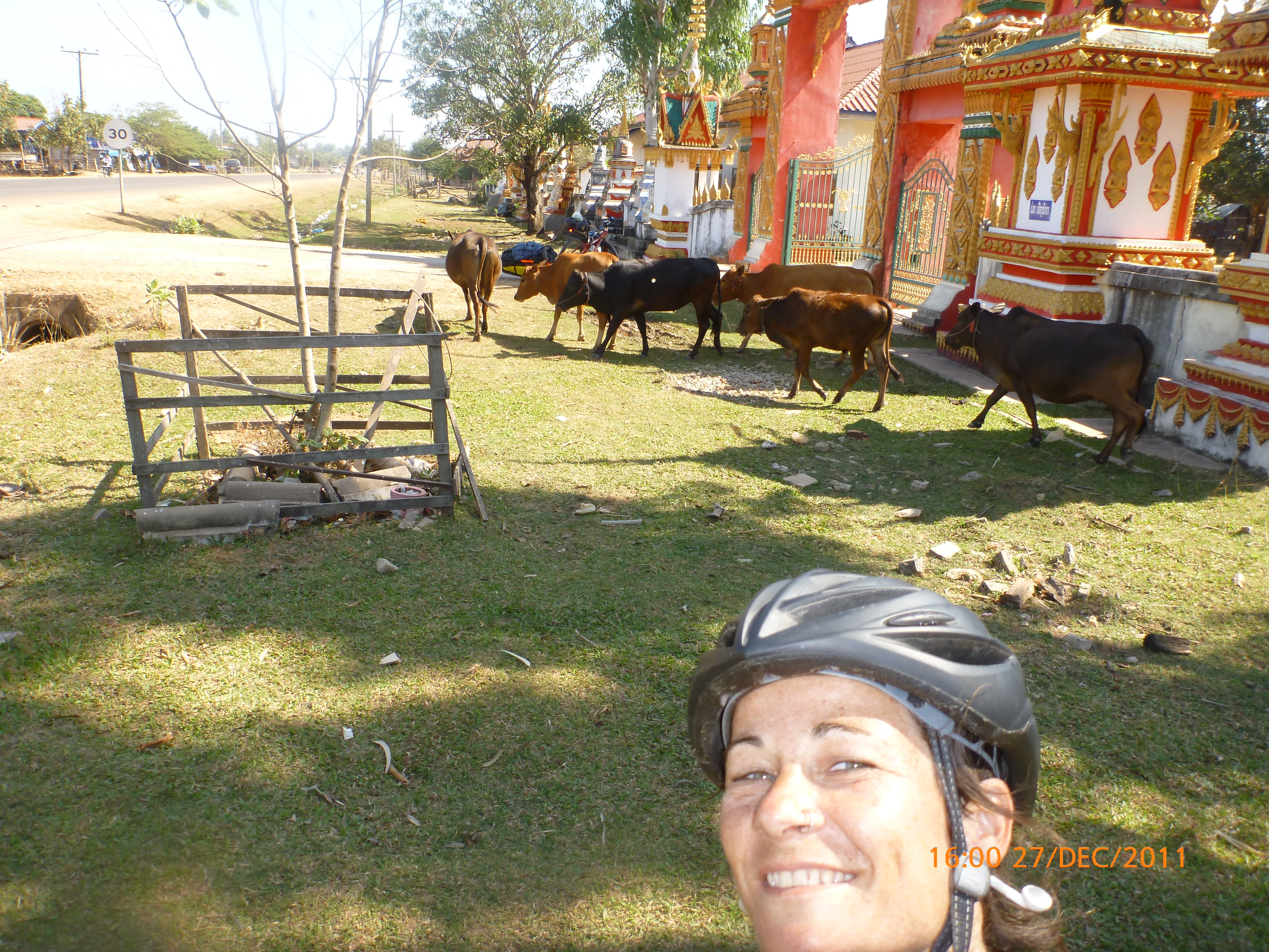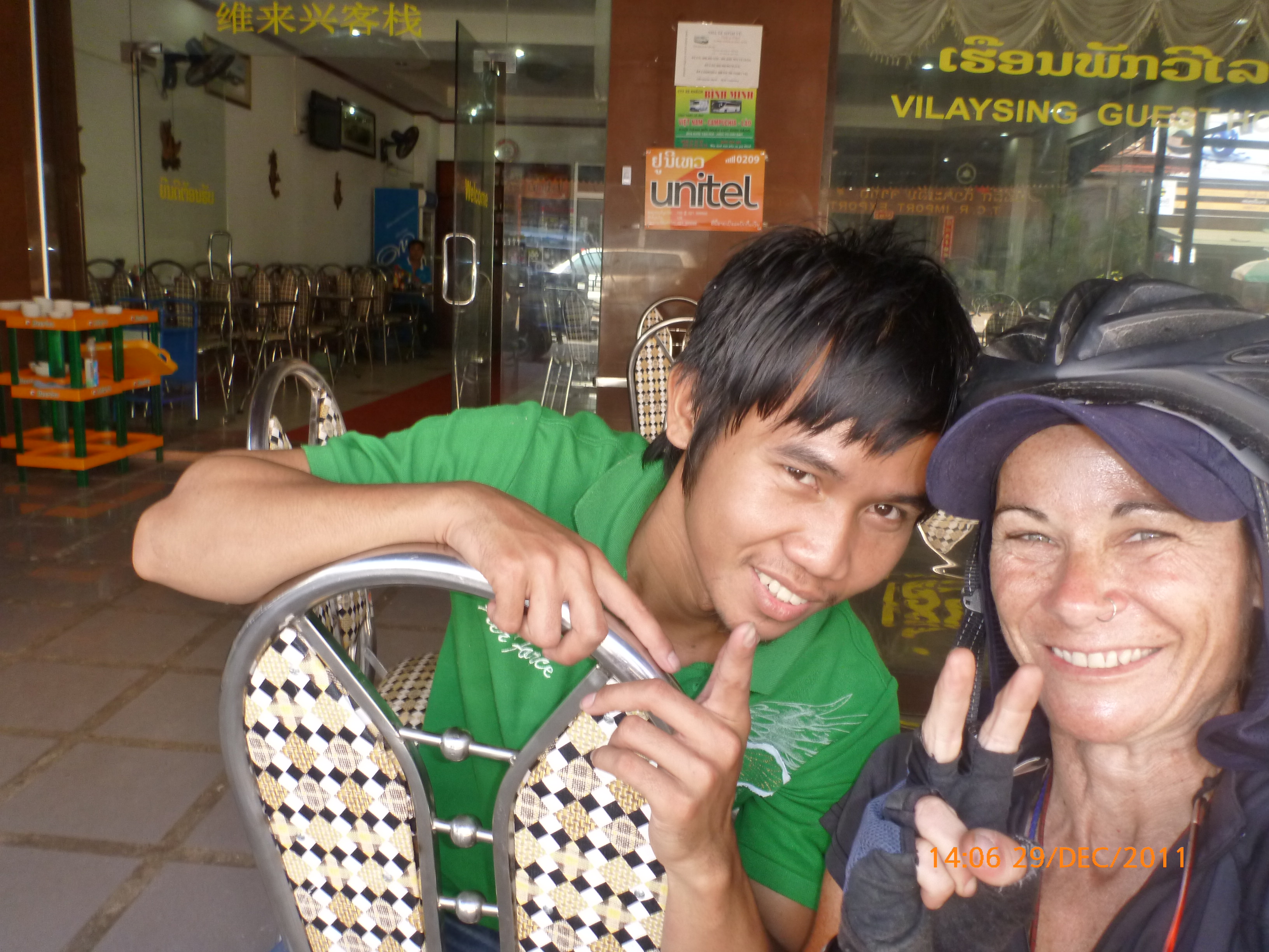 Day 21 1059 days to go. Distance: today 98km total 851km. It’s 7.20pm Wednesday the 21/12/2011 Ban Thabok. My room has a TV and there’s a video hits channel yayayayayayay. Videos they get me like a chronic teenager and yes it’s irrelevant I have no idea about the music or what they’re saying or that it’s very Bollywood and lollipop. It’s very cool and I’m spacing and enjoying the simple stimulation of FAN TV. Speaking of non-intellegent moments I realised tonight that I had a good one back in Chaing Rai. I had 200USD tucked away for an emergency need to exchange cash. I had thought before that I probably should have got some more cash out in Vientiane but remembered I had the USD and that it was an option to exchange some cash for Kip tomorrow. So I went to where I thought I had tucked it away and no, double-check still no mmmmm checked all the places it could be and rechecked mmmmm bugga big. All I can think is that I when I got my laundry done in haing Rai including my money belt for some reason I didn’t take out the UD that was folded in the back sleeve. I had a moment of growly growls I really hate loosing stull and am very proned particularly when Im distracted or tired that’s why everything important is tied to me literally. But its hard to stay cranky crank for something that happened two weeks ago when obviously my brain was elsewhere. You know I can still picture the woman who did my 1kg laundry for very little baht so it’s some consolation that it was an early christmas for her and her family that day. Onto today. I had the ,ost awesome Skype with my partner just a perfect way to start the day. It’s been a while since we hooked up on skype and had a two hour session thankyou technology x When I came down to reception to check out later there was Hanna yay hellllooooo. Her and the kids didn’t get into Vientiane until after 8pm and she didnt get my message until this morning. As I have mentioned there is only one arterial road north/south in Laos great that you can’t get lost but not so great if workers need to dig up road just what happened to these guys. All southbound road traffic including their bus, cars, bicycles, tuk tuks, tractors. mopeds, carts people. dog, cats, goats, buffalos, pigs, chickens were stopped for three hours while they did road maintenance. It was great to catch up briefly and Im sure they’re enjoying Vientiane. The rad here is great all sealed not too much dust and traffic or hills so I covered the distance from 12.30 to 4.30m (25km/hr with stops) a sign how good the conditions were. Hanna told me about bamboo sticks of sticky rice with seeds you can buy that make a great snack and I found one for lunch today yum more f them please. The country side was most agriculture rice fields. The town stalls were selling what I thought was a home-brew whisky or sorts but it turned out to be petrol/oil for mopeds for refueling. I saw one refilling during the day and its either that or rocket fuel whisky (lol). The guesthouse Im staying is nice 60000 kip bit exy comparatively but its the only one in town and since leaving the more remote areas camping not an apparent option but Im keeping my eyes open. The road crosses the Mekong before coming into town and its on a pretty spot their monastery perched right on the river. There’s a market as you cross the brifge so Ill check that out for breaky yum. Trave through Paksan tomorrow and aim for Pak kong a similar distance to today. I need to get to Kong Lo Cave over the next day so we’ll see where I’ll end up. As for today I’m safe and happy. Talk soon x