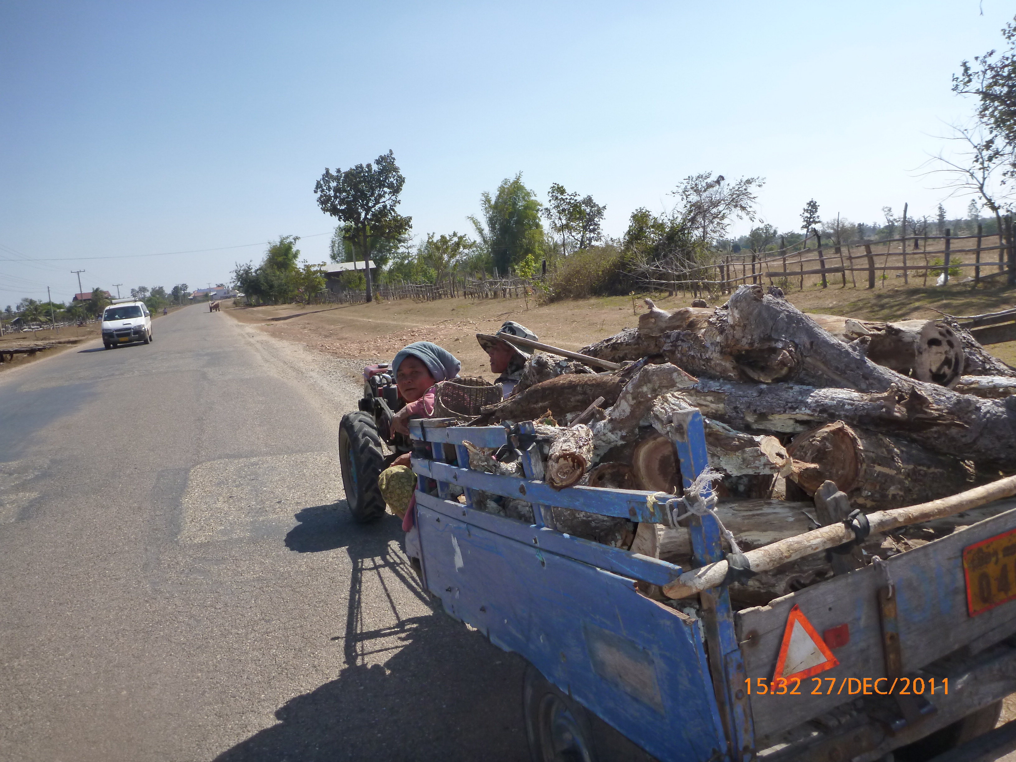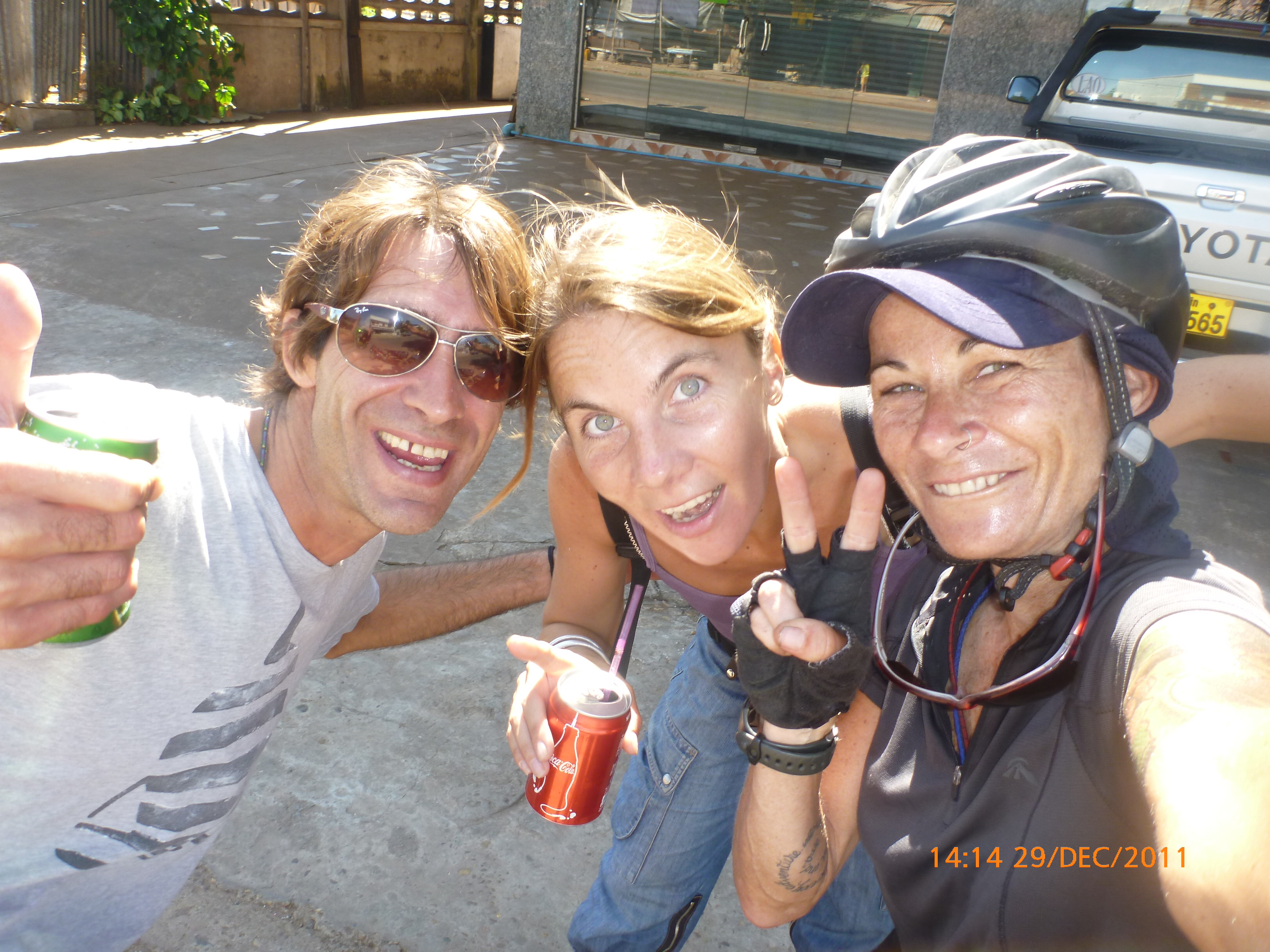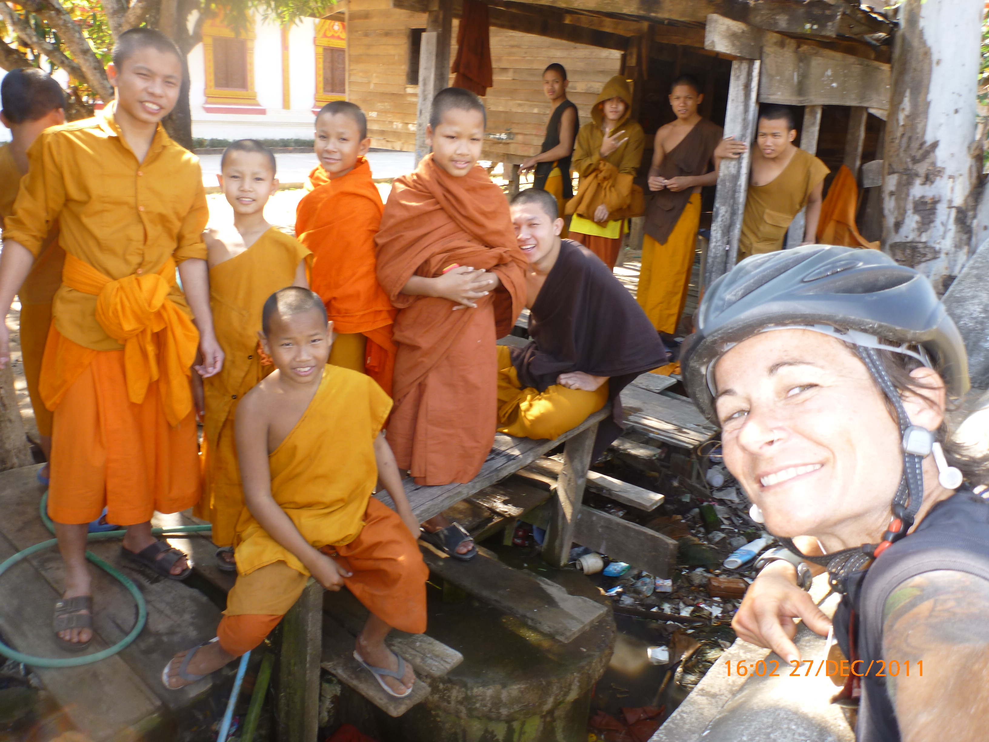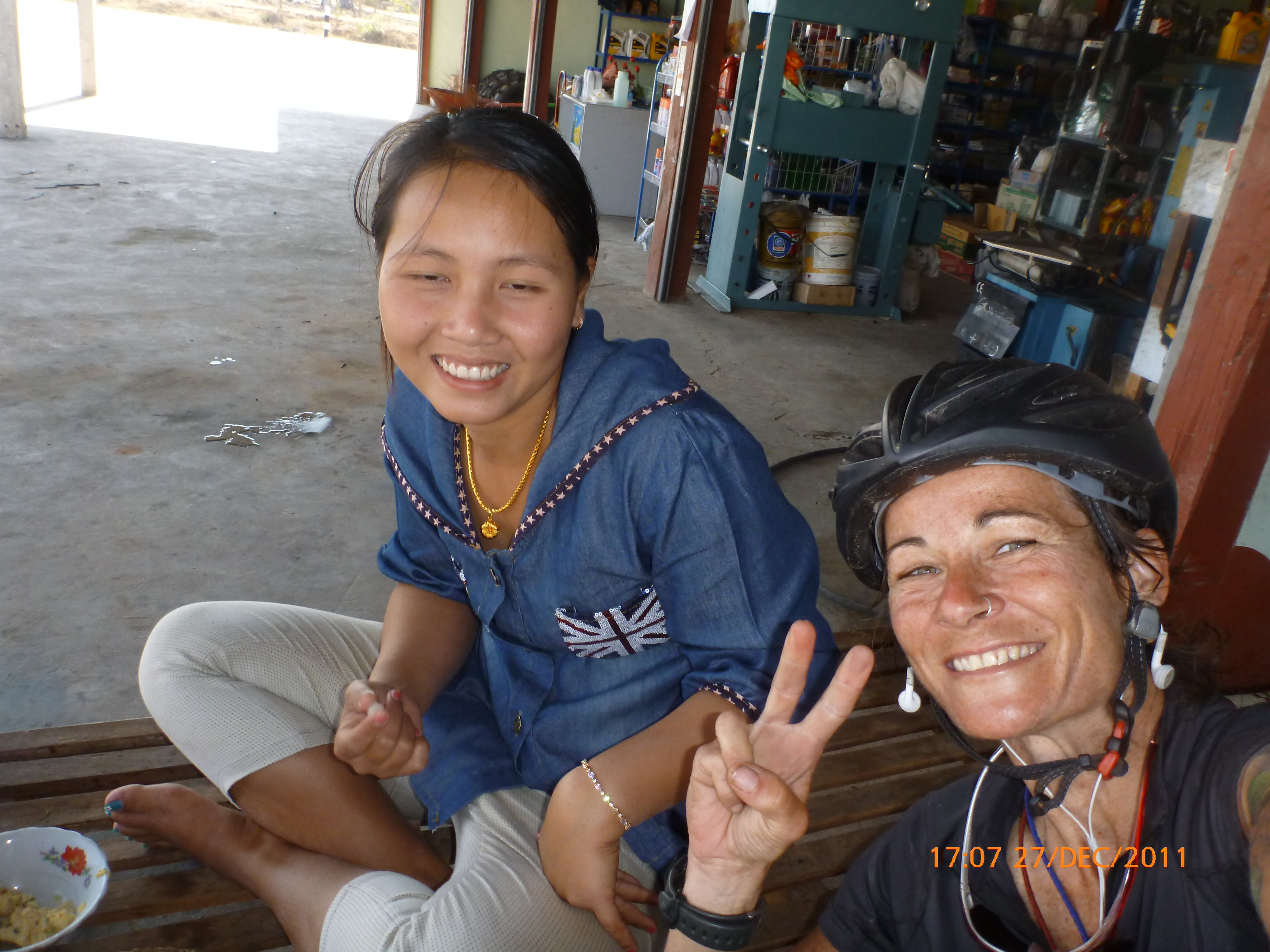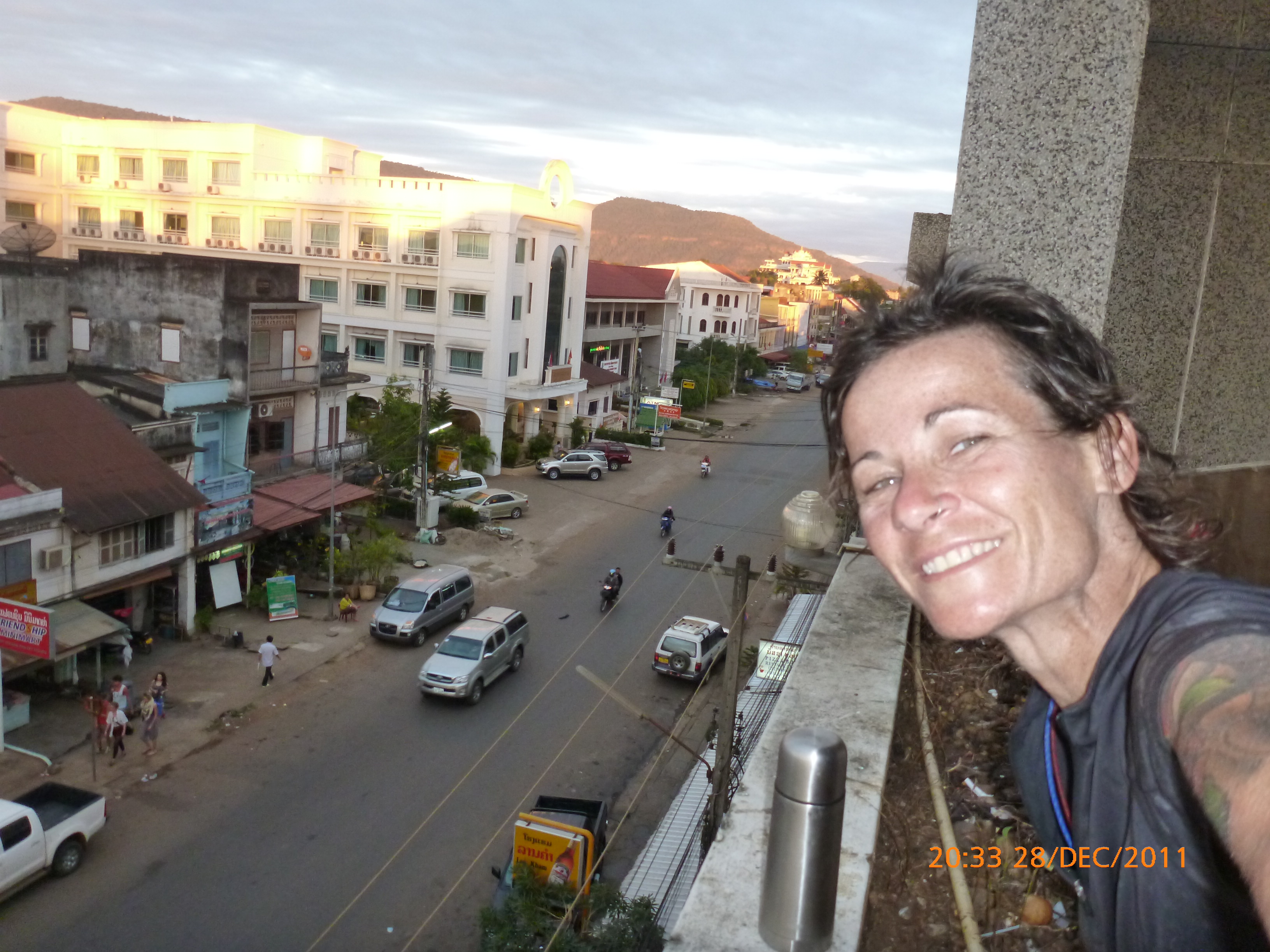 Day 21 1059 days to go. Distance: today 98km total 851km. It’s 7.20pm Wednesday the 21/12/2011 Ban Thabok. My room has a TV and there’s a video hits channel yayayayayayay. Videos they get me like a chronic teenager and yes it’s irrelevant I have no idea about the music or what they’re saying or that it’s very Bollywood and lollipop. It’s very cool and I’m spacing and enjoying the simple stimulation of FAN TV. Speaking of non-intellegent moments I realised tonight that I had a good one back in Chaing Rai. I had 200USD tucked away for an emergency need to exchange cash. I had thought before that I probably should have got some more cash out in Vientiane but remembered I had the USD and that it was an option to exchange some cash for Kip tomorrow. So I went to where I thought I had tucked it away and no, double-check still no mmmmm checked all the places it could be and rechecked mmmmm bugga big. All I can think is that I when I got my laundry done in haing Rai including my money belt for some reason I didn’t take out the UD that was folded in the back sleeve. I had a moment of growly growls I really hate loosing stull and am very proned particularly when Im distracted or tired that’s why everything important is tied to me literally. But its hard to stay cranky crank for something that happened two weeks ago when obviously my brain was elsewhere. You know I can still picture the woman who did my 1kg laundry for very little baht so it’s some consolation that it was an early christmas for her and her family that day. Onto today. I had the ,ost awesome Skype with my partner just a perfect way to start the day. It’s been a while since we hooked up on skype and had a two hour session thankyou technology x When I came down to reception to check out later there was Hanna yay hellllooooo. Her and the kids didn’t get into Vientiane until after 8pm and she didnt get my message until this morning. As I have mentioned there is only one arterial road north/south in Laos great that you can’t get lost but not so great if workers need to dig up road just what happened to these guys. All southbound road traffic including their bus, cars, bicycles, tuk tuks, tractors. mopeds, carts people. dog, cats, goats, buffalos, pigs, chickens were stopped for three hours while they did road maintenance. It was great to catch up briefly and Im sure they’re enjoying Vientiane. The rad here is great all sealed not too much dust and traffic or hills so I covered the distance from 12.30 to 4.30m (25km/hr with stops) a sign how good the conditions were. Hanna told me about bamboo sticks of sticky rice with seeds you can buy that make a great snack and I found one for lunch today yum more f them please. The country side was most agriculture rice fields. The town stalls were selling what I thought was a home-brew whisky or sorts but it turned out to be petrol/oil for mopeds for refueling. I saw one refilling during the day and its either that or rocket fuel whisky (lol). The guesthouse Im staying is nice 60000 kip bit exy comparatively but its the only one in town and since leaving the more remote areas camping not an apparent option but Im keeping my eyes open. The road crosses the Mekong before coming into town and its on a pretty spot their monastery perched right on the river. There’s a market as you cross the brifge so Ill check that out for breaky yum. Trave through Paksan tomorrow and aim for Pak kong a similar distance to today. I need to get to Kong Lo Cave over the next day so we’ll see where I’ll end up. As for today I’m safe and happy. Talk soon x