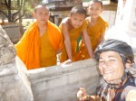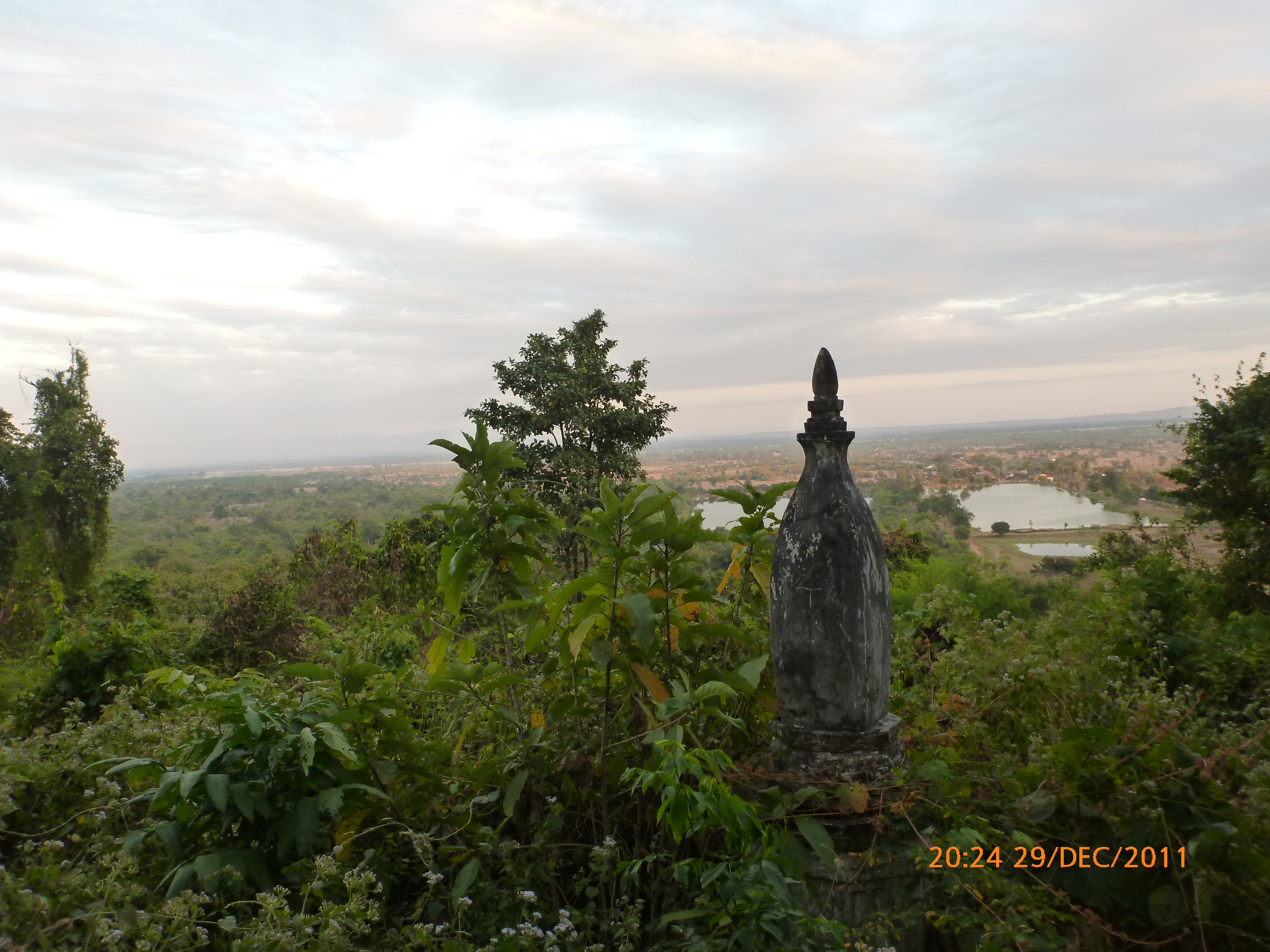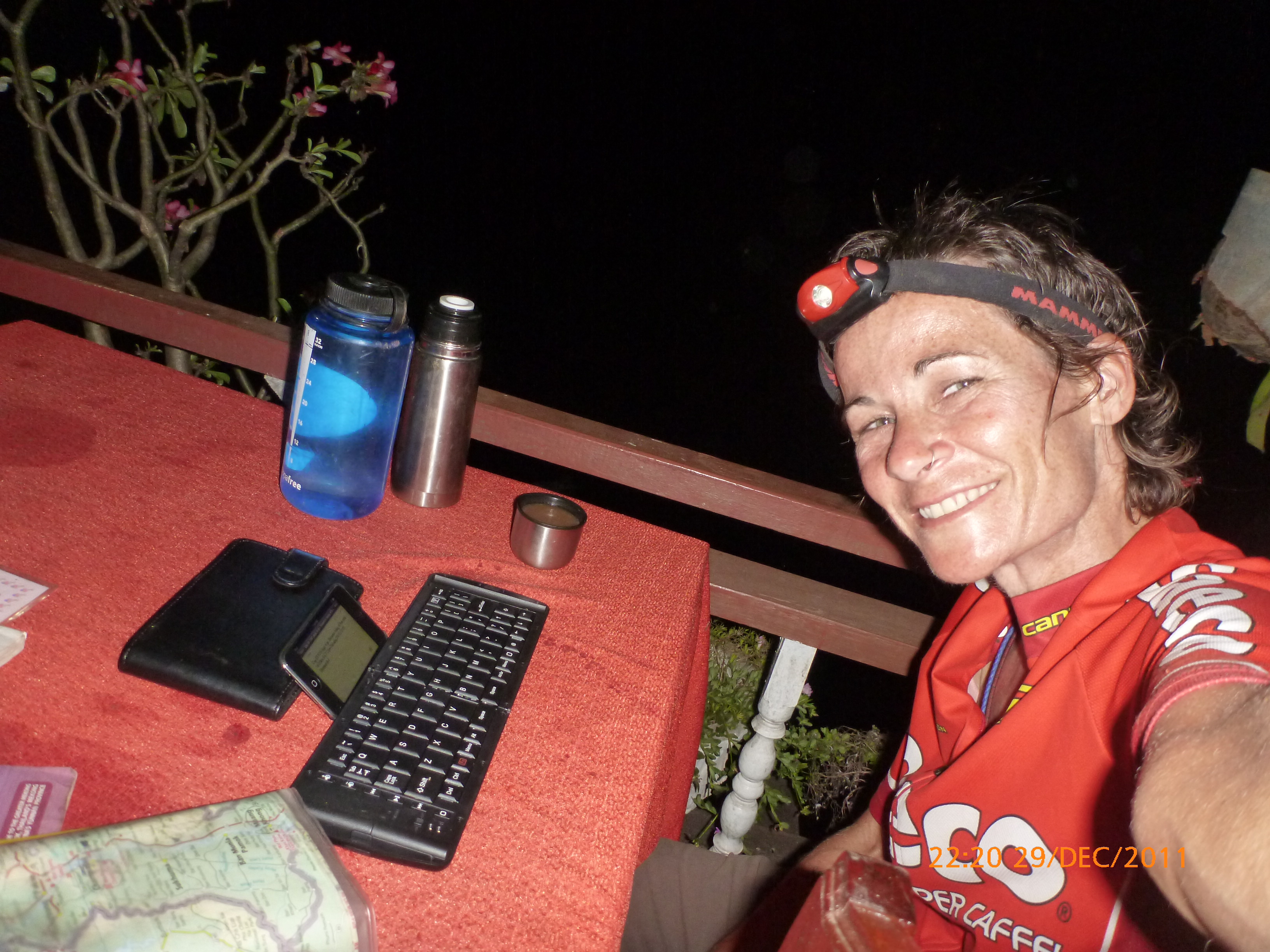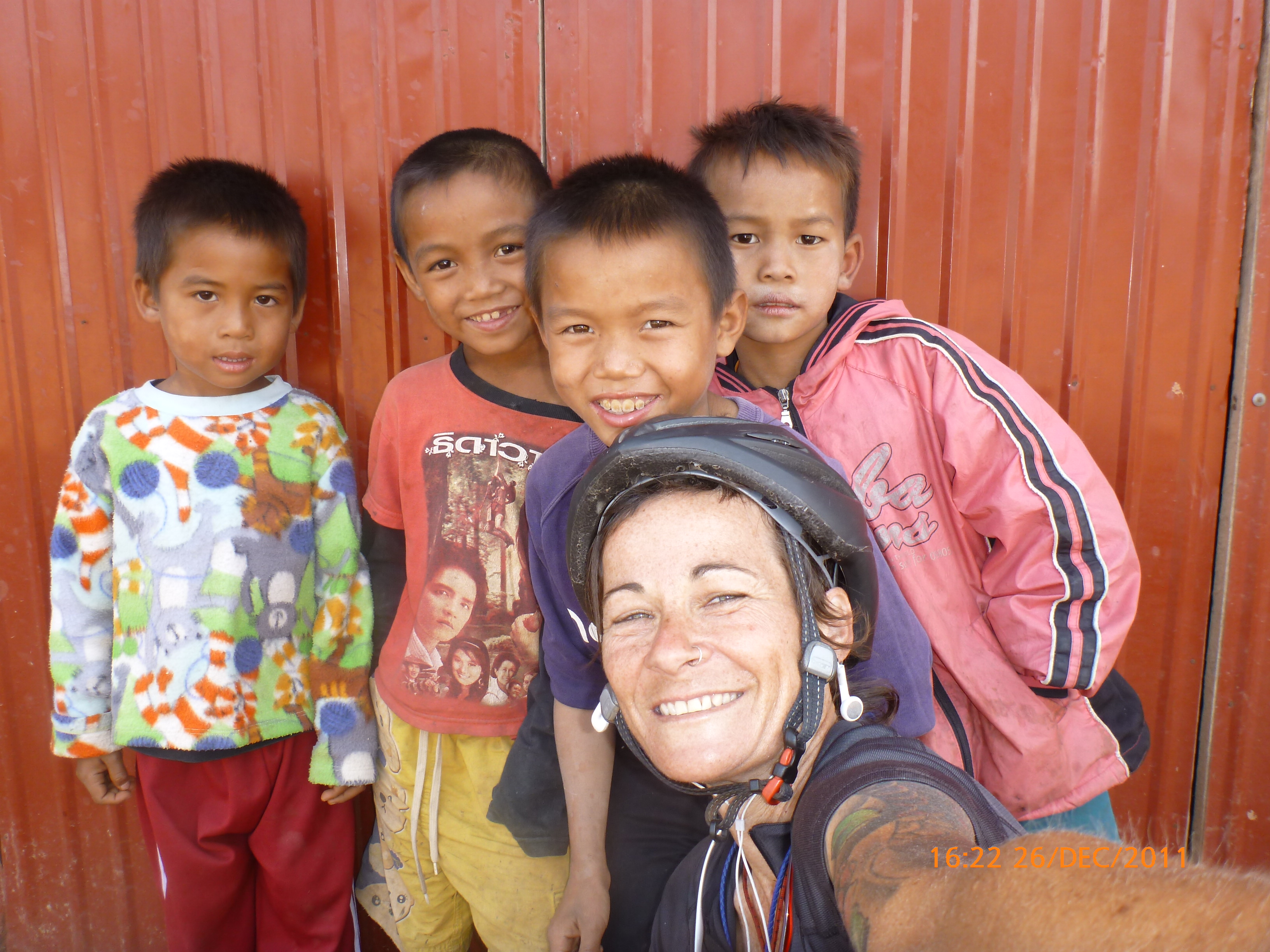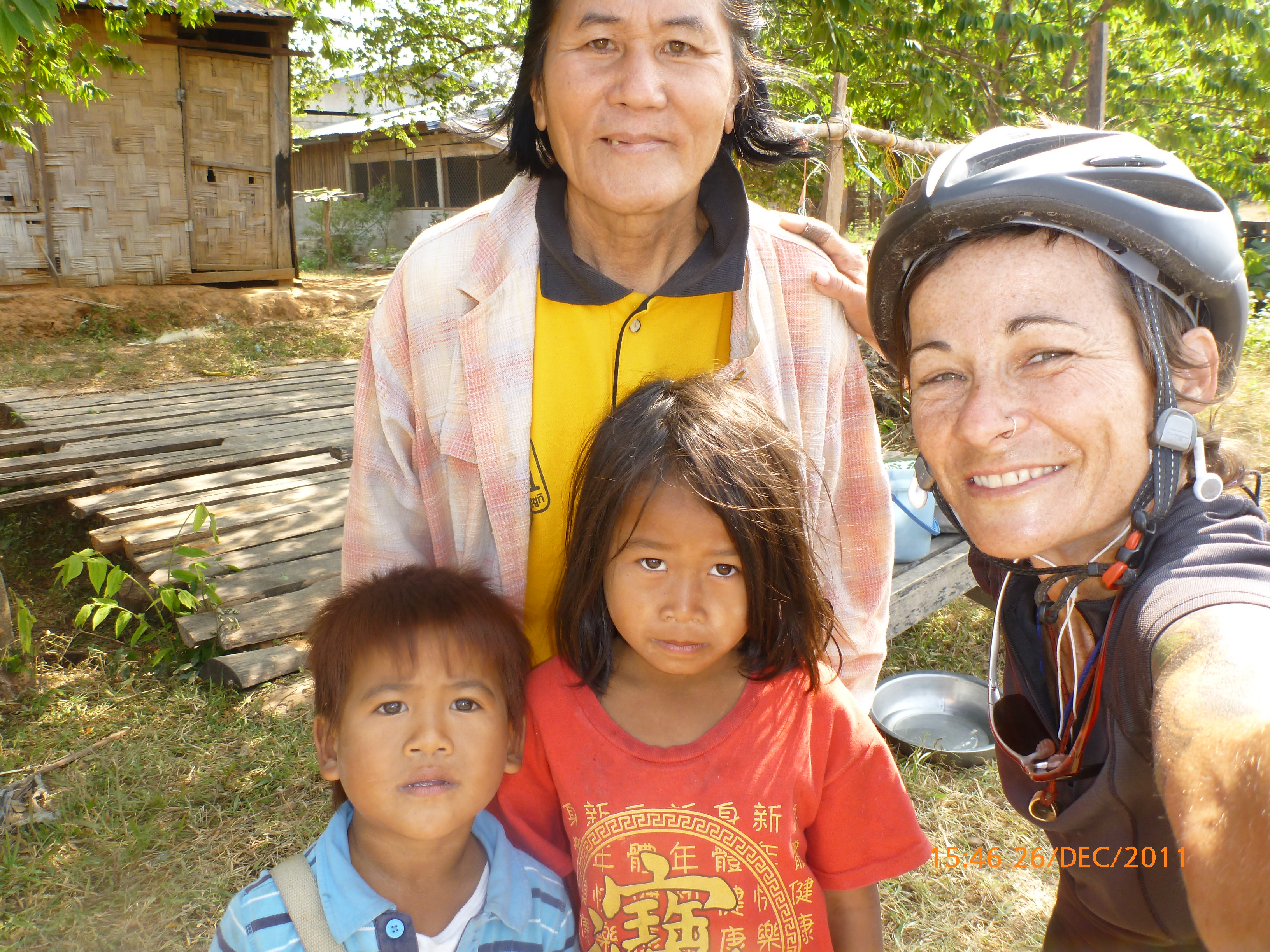 Day 21 1059 days to go. Distance: today 98km total 851km. It’s 7.20pm Wednesday the 21/12/2011 Ban Thabok. My room has a TV and there’s a video hits channel yayayayayayay. Videos they get me like a chronic teenager and yes it’s irrelevant I have no idea about the music or what they’re saying or that it’s very Bollywood and lollipop. It’s very cool and I’m spacing and enjoying the simple stimulation of FAN TV. Speaking of non-intellegent moments I realised tonight that I had a good one back in Chaing Rai. I had 200USD tucked away for an emergency need to exchange cash. I had thought before that I probably should have got some more cash out in Vientiane but remembered I had the USD and that it was an option to exchange some cash for Kip tomorrow. So I went to where I thought I had tucked it away and no, double-check still no mmmmm checked all the places it could be and rechecked mmmmm bugga big. All I can think is that I when I got my laundry done in haing Rai including my money belt for some reason I didn’t take out the UD that was folded in the back sleeve. I had a moment of growly growls I really hate loosing stull and am very proned particularly when Im distracted or tired that’s why everything important is tied to me literally. But its hard to stay cranky crank for something that happened two weeks ago when obviously my brain was elsewhere. You know I can still picture the woman who did my 1kg laundry for very little baht so it’s some consolation that it was an early christmas for her and her family that day. Onto today. I had the ,ost awesome Skype with my partner just a perfect way to start the day. It’s been a while since we hooked up on skype and had a two hour session thankyou technology x When I came down to reception to check out later there was Hanna yay hellllooooo. Her and the kids didn’t get into Vientiane until after 8pm and she didnt get my message until this morning. As I have mentioned there is only one arterial road north/south in Laos great that you can’t get lost but not so great if workers need to dig up road just what happened to these guys. All southbound road traffic including their bus, cars, bicycles, tuk tuks, tractors. mopeds, carts people. dog, cats, goats, buffalos, pigs, chickens were stopped for three hours while they did road maintenance. It was great to catch up briefly and Im sure they’re enjoying Vientiane. The rad here is great all sealed not too much dust and traffic or hills so I covered the distance from 12.30 to 4.30m (25km/hr with stops) a sign how good the conditions were. Hanna told me about bamboo sticks of sticky rice with seeds you can buy that make a great snack and I found one for lunch today yum more f them please. The country side was most agriculture rice fields. The town stalls were selling what I thought was a home-brew whisky or sorts but it turned out to be petrol/oil for mopeds for refueling. I saw one refilling during the day and its either that or rocket fuel whisky (lol). The guesthouse Im staying is nice 60000 kip bit exy comparatively but its the only one in town and since leaving the more remote areas camping not an apparent option but Im keeping my eyes open. The road crosses the Mekong before coming into town and its on a pretty spot their monastery perched right on the river. There’s a market as you cross the brifge so Ill check that out for breaky yum. Trave through Paksan tomorrow and aim for Pak kong a similar distance to today. I need to get to Kong Lo Cave over the next day so we’ll see where I’ll end up. As for today I’m safe and happy. Talk soon x