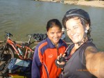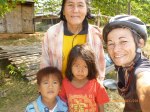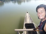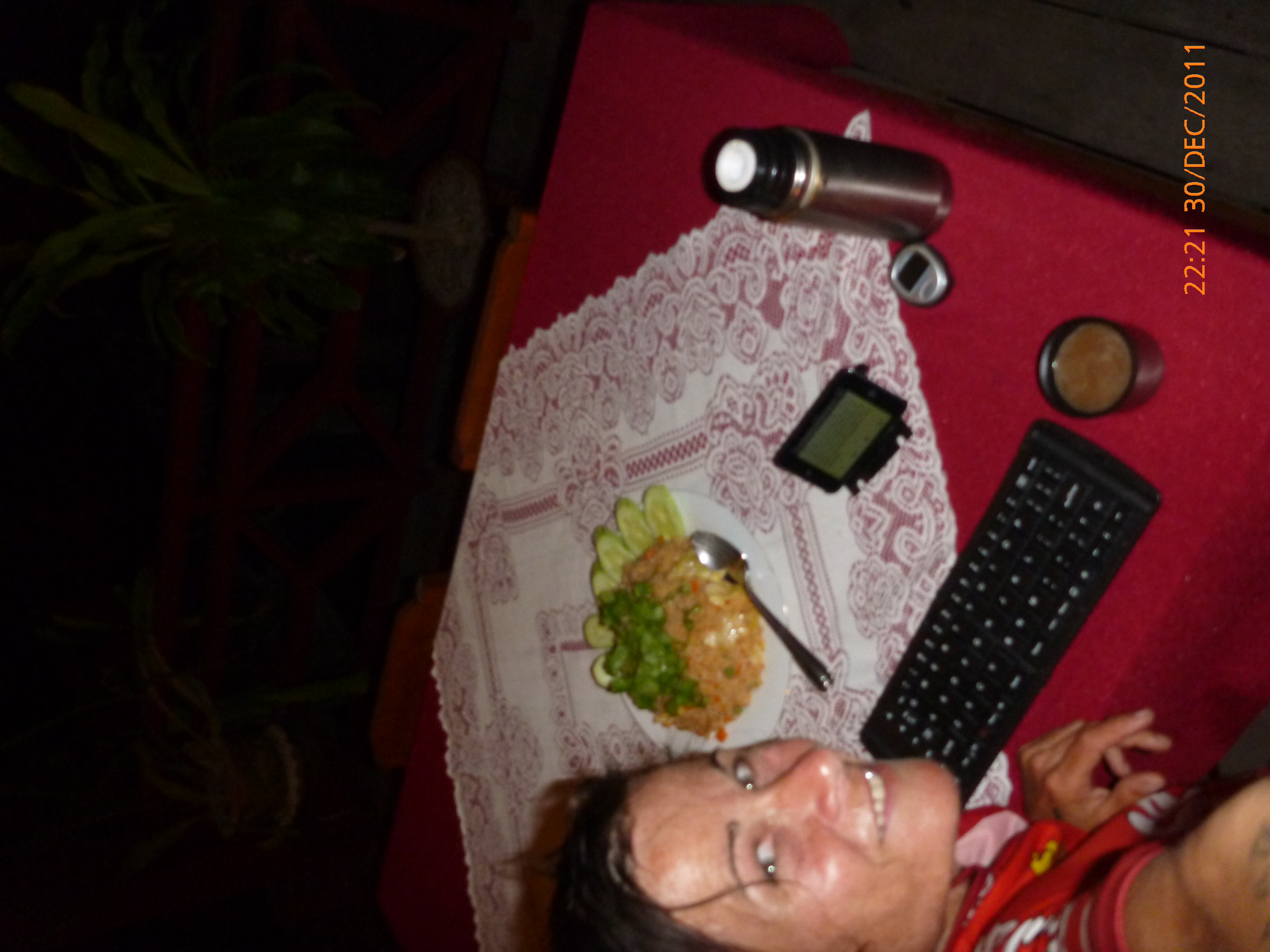 Day 30 1050 days to go. Distance: today 115km total 1515m. It’s 7.00pm Friday the 30/12/2011 Muang Kong, Don Kong Island, Si Phan Don (South Loas). I’m sitting at V Mala Lao House the guest home I found this arv. It’s beautiful and I have the whole place to myself spoilt city. I’m seated on the huge deck at a table and can smell something amazing coming from the kitchen best of all it’s my dinner cooking. I’ve ordered extra large vegy and egg fried rice very excited very hungry very very. The manager Than said that not many people stay here opting for the two larger hotels near the dock. What a missed opportunity for him and them. I told Than he should stick a sign up where the ferry comes in and that I would plug his guesthouse on the blog – he’s happy. The place is so beautiful this stilted old house all renovated with polished wooden interior walls floors and ceiling and really wide timbers. I thought I’d be way out of my budget but it’s only 50000 the cost of most places I’ve stayed but nothing in comparison. There are super hot showers where I indulged before dinner scrubbing up dam fine I might add and smelling a treat. My room is on the deck with a huge netted bed ready to fall into in an hour or so. The gardens are leafy green and cared for and the whole place oozes charm and comfort. I’ll take some pickies tomorrow in the light to show off where I’ll be hanging out for the next day’s leaving Cambodia on the 2/1/2012. For now I’m seeing in the New Year soaking up a slice of Si Phan Don about 30km from the boarder. As Lonely planet so articulately describes ‘..it is an archipelago of sandbars and rocky inlets set amid the turquoise expanse of the Mekong River. I’ve popped myself on the quieter of the three main islands the others being Don Det and Kon, a bit more touristy and expensive to ferry to and I though maybe a bit eeek for me being new years and lots of party people partying. So it’s just me and the crickets waiting on the deck for dinner to come out. It’s nice to hav a cooked meal as a treat and a nice way to start 3 days off to soak up the island, rest up and start thinking about Cambodia. There’s an internet café here I can’t pick it you would never guess it’s a small one street place with nothing much to distract you from doing nothing much. Obviously there’s some exploring that can be done and I may venture out over the days to see what’s about. It’ll also be great to have internet access to be in touch with family now over New Years. Dinners just come out and it could feed two but I’ll do my utmost between typing, what a trooper – by the way it tastes delish garnished with chopped coriander , cucumber and chilly I’m in drool heaven. That’s an offensively huge serve mmmmm maybe time for some more senakot J Headed off this morning after spending some time with the family from the guest house they were very warm and fun. Then it was down to the dock to catch the ferry across the river and pick up route 13 again. It’s a real pretty area full of river life and a fishing village feel. Quickly apparent on the short trip across. The ferry was this double long boat with a fella sitting out back steering his 2 stroke put put motor. The standing deck was about 3m square and a tight squeeze for a handful of us along with Rube. The banks are sandy and sloped and a bit of an effort to get her and the trailer on and off the ferries and back onto the harder level roads. I’ll give her some attention tomorrow to keep those nasty rusty bits at bay – she’s travelling so well and we’re a jet team propping each other up when the other goes a bit off rail J Did I mention dinner was fabulous and I am making an impressive dint for a wee thing. I did a good cycle stint first up to Lunchtime and stopped at a roadside amenities centre. These places pop up from time to time where there are multiple amenities to shower and wash up at a small fee a food store come restaurant attached. There were also these village women who had set up a make-ship grilling plate and was selling skewered pressed banana, meats and sweat potato. I had bought 3 grilled eggs earlier and ate them with the last of the baguette then bought skewered banana for desert yum. The family running the centre and the village women were so friendly I ended up hanging out there for nearly 2 hours playing with the kids and enjoying the people’s company. A bus of Japanese and Thai tourists pulled up at one stage and the people literally gave the women and their food the big swerve and bought packaged western style food instead go figure. So their loss but unfortunately also a loss of kip for the ladies. Their food is so cheap comes straight of the grill and tastes so yum. Anyway it was off and onwards to here and a long slog to end the day with pretty much nothing about except hot open plains and a bit tough to cover the ks. I wrongly took an early exit and had to follow a single sandy track along the river bank through these tiny offbeat villages very cool to check out with the villages very surprised to see me. It was a bit tricky cycling Rube and the trailer through the sandy uneven track and I was a bit over it by the time I popped out at the ferry port some 10km later. It was a short trip across to arrive at sunset beautiful. I met this cool family on the ferry. They’re from France but now live in London and travelling with their 5 year old boy – Impressive I thought given Laos isn’t easy travelling the easiest place to travel. They were also very interested in what I was doing so I gave them my blog card. I may hear from Oliver and his family bit in the meantime I hope they enjoy the rest of their trip. We have pretty much followed the same itinery so were able to exchange a few ‘what was your favorite?’ stories. Anyway time to sign off, finish devouring dinner and maybe visit the internet café to upload some photos while dinner digests otherwise it
