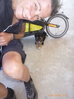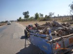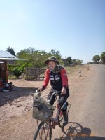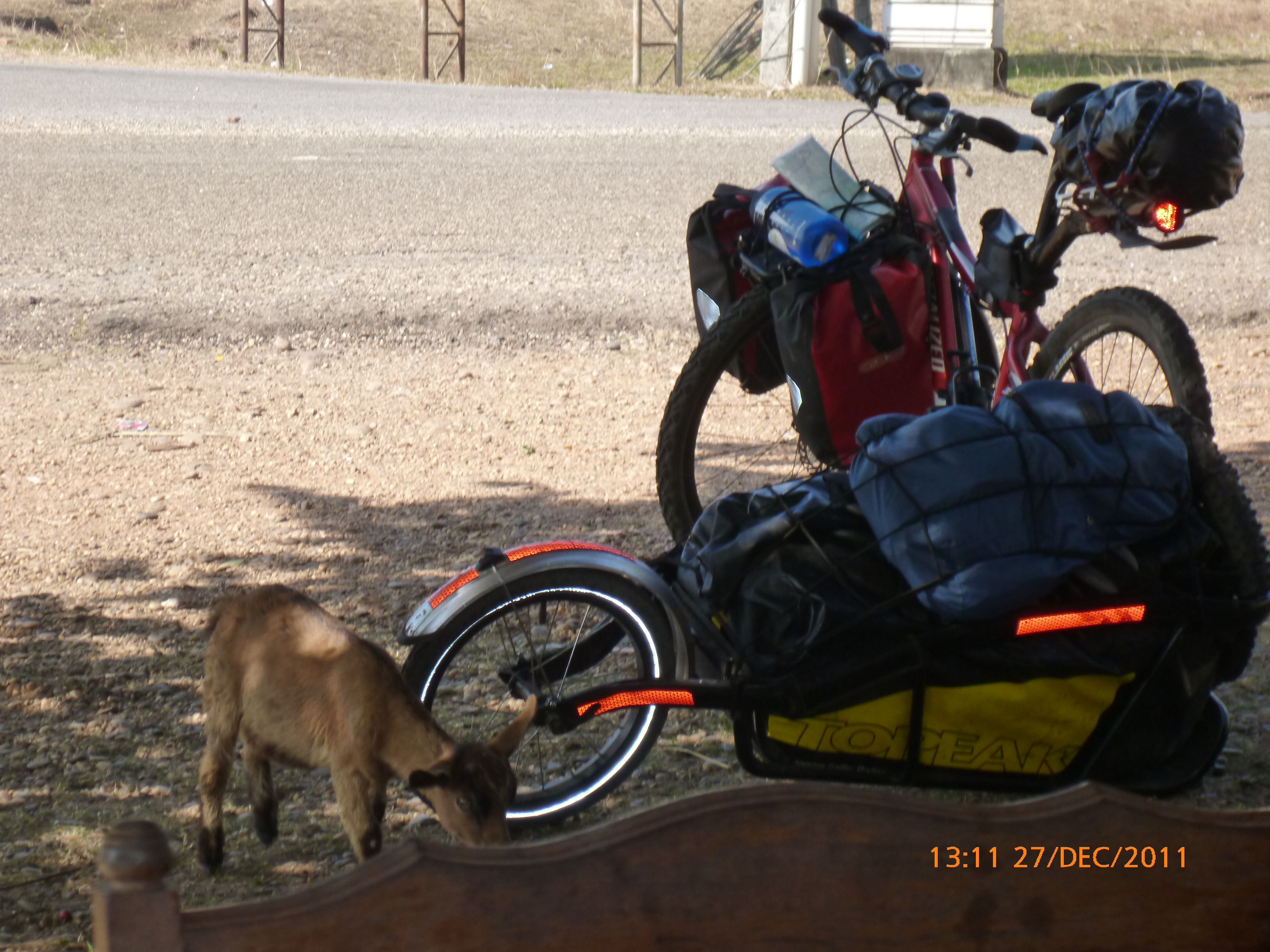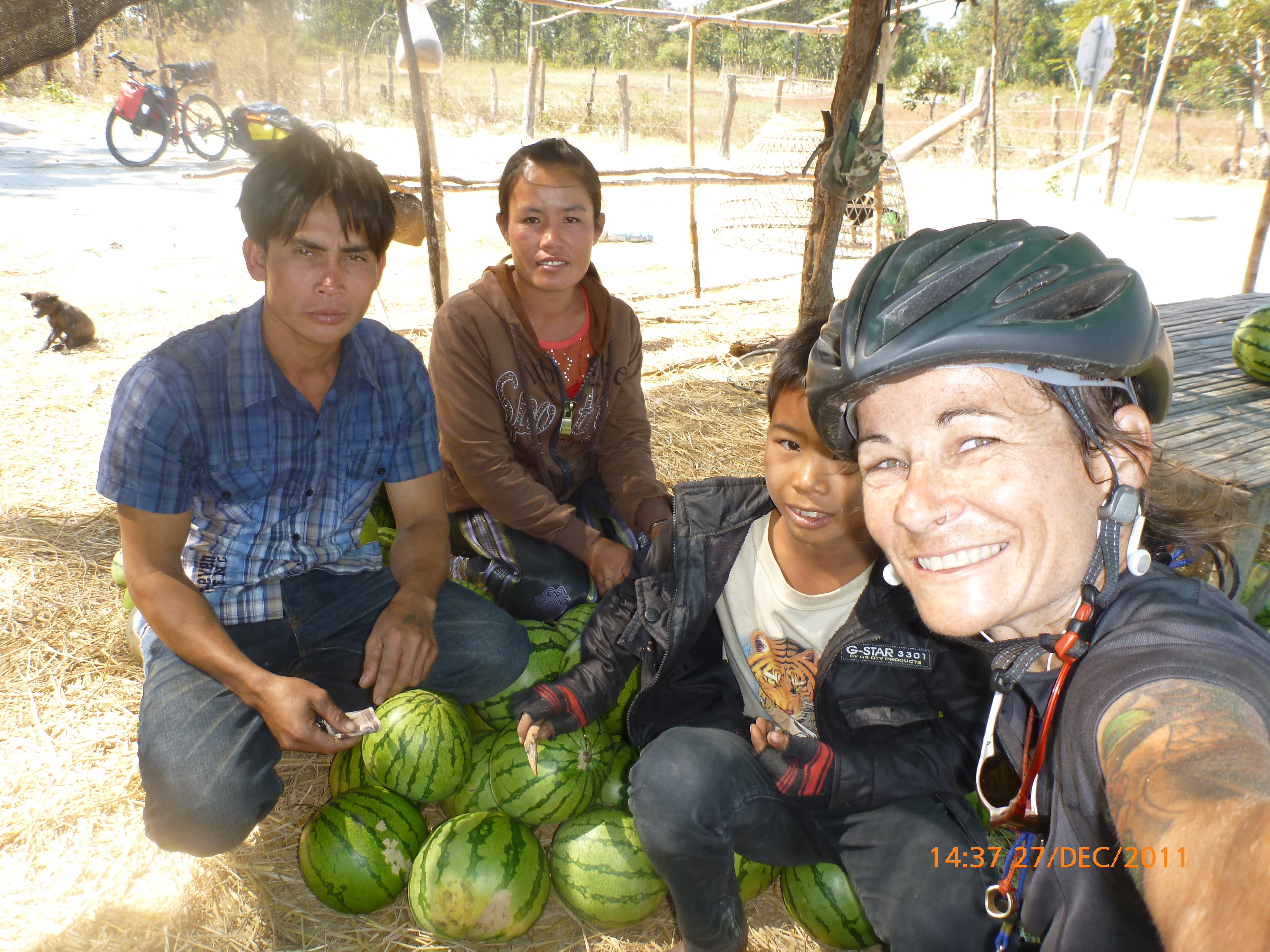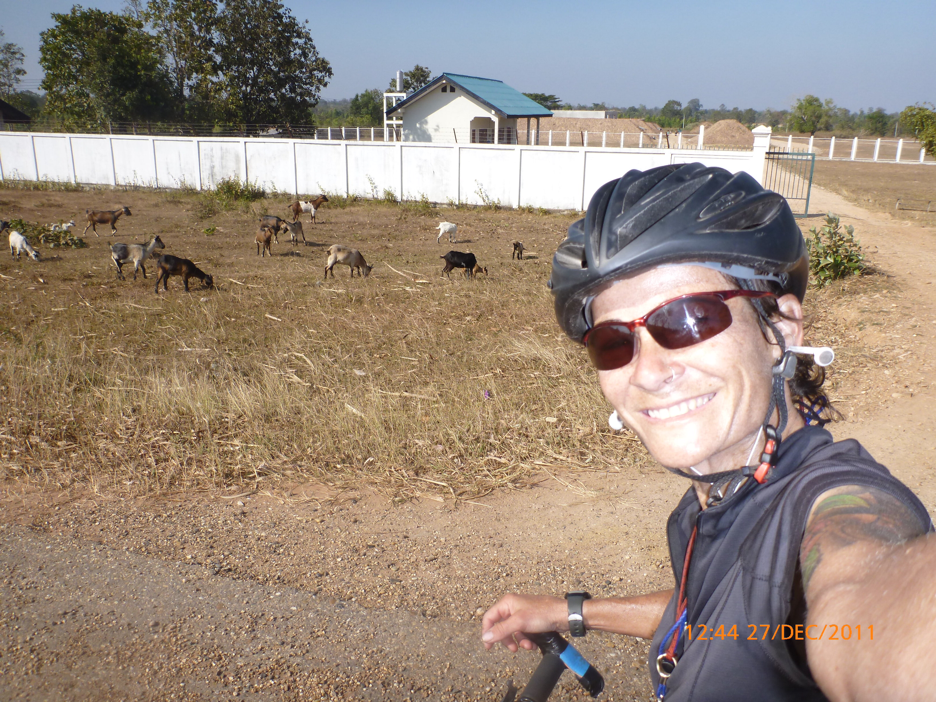 Day 27 1053 days to go. Distance: today 112km total 1330km. It’s 6.02pm Tuesday 27/12/2011 Ban Xenuan. I’m feeling right now that I have spent the best $5 Aus (40000kip) sitting outside the guest room. This place appeared really like an oasis this afternoon a guest house in the smallest town. There’s nothing much to it very basic but right now it’s the most beautiful place ever. I knew today that I had a midway stop towards Paske and wasn’t sure where I would end up which is kind of cool in a way but when you’re getting weary in the afternoon after and early start it’s a bit of a tricky mind game. Lets just say I squeeled squealed yayayayaya what on earth is a guest house doing out here, who cares it’s here I’ll take that one. I got my flask topped up at a roadside cafe shere I stopped for lunch and was saving it for when I finished up today. That was the best coffee ever plus the complimentary water was really cold bonus and happy happy days. And it was I’ve had a really lovely day. Totally took my time stopping as I pleased it made for a longer day but really enjoyable. The people here have goats and chickens. The chickens joined me for coffee this arv and one of the goats just sneezed as they so beautifully do. I love that familiar sound. It’s a clear chilly night and the stars are really bright with no town lights so I’m loving loving it. Great space to post the day. I left this morning via the nmarkets again to check them out in full swing markets are always so busy in the morning and definately at their best. I bought some more coffee sachets and mixed with some stall people then headed off to see what the day brought on. I stopped a few times this morning to get some pickies of the local pigs and goats and cows in amongst daily life here as Ive mentioned. Then I passed this roadside cafe that looked very inviting very low key and cheap noodles which were delish. This old fella thought me very interesting and joined me for lunch talking the whole time chatting and laughing he was so colorful and entertaining. The local goats being the curious creatures they are had to come check out Rube and I( managed to snap a picky before they bleated off to the next bit of mischief. I have mentioned the watermelons stalls and came across one for the next break and sugar fix. The lady picked a little ripe one giving it the tap test and I indulged on their bench enjoying their company and fun. When I showed the father the photo I took of him and his family he offered me another melon in exchange for the camera and thought it a great joke. Actually I think he was more laughing at me who took a time to catch on. Not a sharp moment 🙂 I’ll blame exposure. The locals here rug up like its sub zero with balaclavas the works. They are forever saying in Loas ‘aren’t you cold.’ Even being the cold frog that I am am not that cold. The evenings you need a jumper but otherwise it’s really great weather and wonderful temp for cycling. Even with lots of sunscreen Ive got a ‘been in the sun’ glow. Goes to show how steamy it must get here in summer and the wet season. I took a couple of shots today on the move. I must say Ive found my balance with Rube and the gear and this is a true sign as I wouldnt have managed this previously. anyway I( came up on a tractor cart pulling a load of wood and chugging along with a man driving his wife and child. I got the camera out and lined up a shot and a stall of locals all started calling and laughing out to the family obviously letting them know they were about to be snapped. Well they thought it the best ever having their picture taken by a passing cyclists and waved me off cheering. These tractor carts are everywhere in the agricultural areas. The families use them for transport and like a ute with a wooden tray on the back loaded with whatever their business is animals or wood or sugarcane or the family or locals hitching a lift or all the above. I see them in the field with the wooden cart detached and being hand used to plow the ground. They motor along slowly but do the trick. It’s wierd to actually pass a motored vehicle on the road much to their amusement being overtaken by a cycle ‘Go Rube you good thing speed demon red rocket.’ 🙂 At this town I went through called Paksong there was this amazing monastery so decorated and picket fenced with all different types of mini shrines. I was beautiful and in a town that was really small but equally cared for and beautiful in it own right. Had to stop to ejoy it more much to the delight of the baby monks who were have a chats asking anything they could in what English they knew and me asking them the questions that match their standard phrases. what’s you name, how old are you etc. The younger ones look to the older ones to translate and the chatting continues. I really enjoyed ot as did they. It was really quirky with cows all grazing in the footpath out front and I got a shot with rube parked at the temple gate with cows in the foreground. She now thinks she’s a tractor cycle pulling her cart. Rubes gone hick on me and loving the rural Laos life clearly 🙂 We both are. I alter passed another monastery with a small herd of goats lazing in the afternoon shade and managed to take a picky before they bleated off complaining about being disturbed and fair enough it looked a great spot and I could have parked alongside them for an afternoon kip at that stage. Fancying myself a bit of a ‘on the move’ photographer now I passed this woman cycling with her puppy in the front basket and thought I’d try my luck a second time. They both looked soooo cute and she got a welcomed surprise to have her photo taken both of them flashing a big grin for the photo big fun. This isn;’t the sort of thing I can do obviously when the roads are busy but they were really quiet moving through only small towns today it was a chance to try it on. I’m still playing with the idea of getting