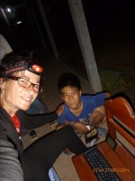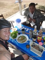 It’s 6.44pm same day and my7 post was interrupted by two ladies working one of the stalls who literally came over to have a chat. They wanted to know everything I was doing. It was really gusty at times and another lady had her matting and personal stuff blown from her stall so I helped her pick up her stuff so I think this got their attention. Anyway they knew no English but we just started gesturing and chatting and laughing it was fun and you could tell they were good value. They knew I didn’t want anything cause I was still full from my sticky rice breaky so it was genuine interest and conversation. Unfortunately it was time to leave and I shook their hands and they were introducing me to the other ladies about on my way to the tuk tuk -it was really cool – big wave good bye. So I headed back to the home stay and packed up Rubes with a group of inquisitive little lads watching on. ( showed them all my toys and they loved the multi tool the best go figure. Of course the camera was a hit and I let the eldest take a group photo he was soo chuffed. I just had to cycle out of that landscape it is so beautiful there and despite the headwind no matter what direction the road traveled (couldn’t figure that one) it was an awesome 45kms back to Ban Vandea where Rube and I caught a taxi over the limestone range to return to the main route 13. I shared the back of the taxi with this young lad who was sooooo car sick poor darling. I helped him with toilet paper, plastic bags and water as best I could and he prayer gestured many thank yous. So that’s where I am tonight about to dig into 3 minute noodles a great dinner when I have access to boiling water. All the guest houses a roadside restaurants seem to have hot water dispensers and they have been happy for me to fill my thermos up which has been great for pick me up coffee sachet breaks.