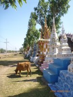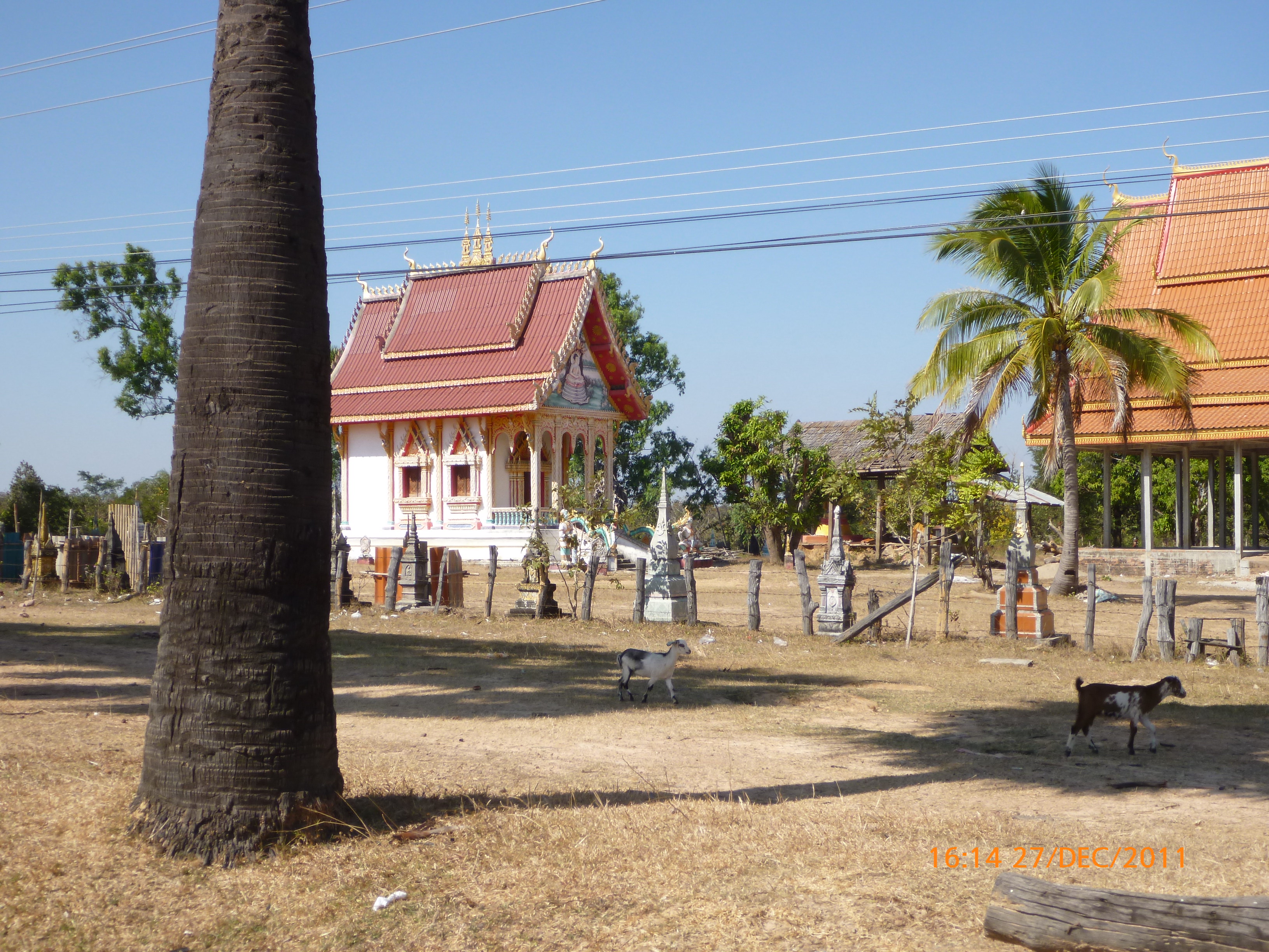 Day 26 1054 days to go. Distance today 100km total 1208. It’s 11.20am and lunch break time on route about half way to a place called Seno. You know that willy Nelson song ‘on the road again’ I’m hearing you willy. It’s having a place to go but enjoying the road along the way. People people people smiles hellos nods waves cheers more smiles oh dear no teeth no health care system but smiling happy nonetheless it’s that Loas psyche and I love it. Boxing say and it appears just another day here with school and the different working days as usual. It seems the people celebrate Christmas of sorts as there have been decorations and Christmas trees and a concert last night and fireworks but in what context Christmas is celebrated I’m not sure. Anyway it was nice to spend the day in tha Knaek. I was in a dormitory with a stack of backpackers and didn’t really connect with any or maybe I didn’t really want to. I did meet this one quirky couple who were from Israel and had been traveling for three years. The played the flute and the recorder but were very much out there and entrenched in the backpacker scene which is very different to my interests so there was little topics to discuss with detail. I find that scene a bit tiresome and try to dodge and weave it where possible. It’s a bit tricky cause its in the bigger towns that this scene is ripe and where I have stop overs to have to access to Internet etc. mmmmmmm need a plan. I think finding a piece of the towns authentic self, indulge in it and have something very cool and unique about the place to share with you is far better focus and a good plan to stick with. Accommodation is so cheap here I can afford a room to my self when they’re available and I appreciate that luxury more so now. Anyway today’s been cool the smaller towns I’m passing through have been interesting with lots of animals hanging out amongst the townsfolk like goats and pigs and cows and buffalo of course chickens. Fried specialities are about. I bought one and they’re like a donut ball filled with a sweet paste and rolled in icing sugar yum. Gotto share this story I saw this puppy he looked very poised so got my attention but he was very interested in up the road further then his tail started going off bigtime and approaching was his family coming home from a mornings work with the tractor. There’s some basic qualities that are universal aren’t there any way made me smile. Reminds me of when I had the home stay at long Lo and the puppy and kitten sat very attentive watching me eat breakfast. When noone was watching I have them half each of my leftover fish the cat of course devoured it growling in case the dog had ideas. But the puppy took it straight outside and buried it in a sandpile for Ron. There’s honking geese somewhere nearby and the sounds of children, adult chitchat and domestic choirs of all sorts as background noise. lots of layers of cool sounds and quite cathartic listening while sitting in the sun now over lunch. I’m munching on rice cakes and banana. The rice cakes have like a toffee crunch drizzled over them and they’re really yummy and my new fav. I suppose it’s time to start the next half of the day so far so very good.