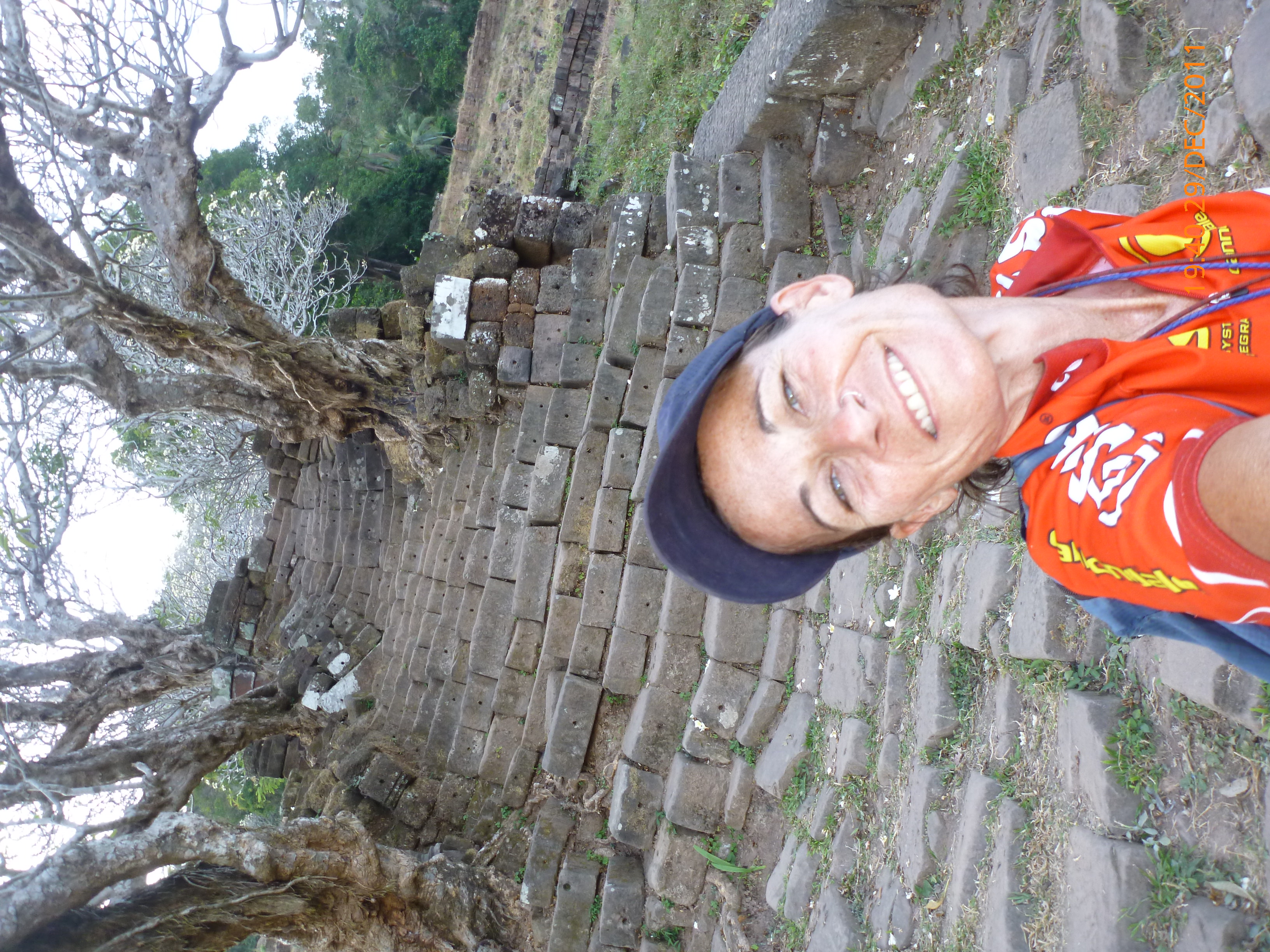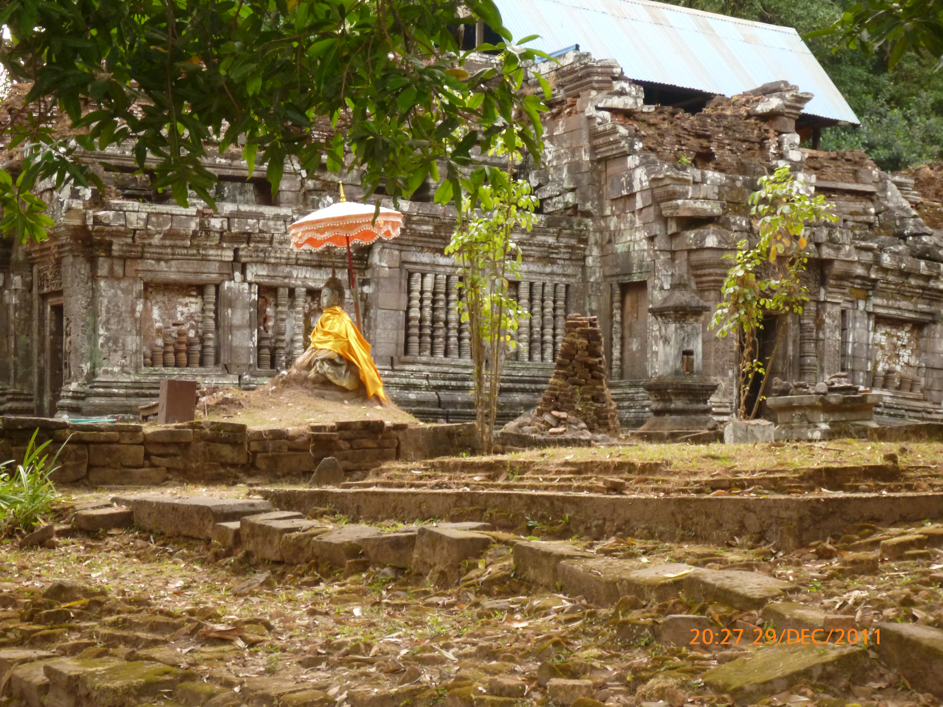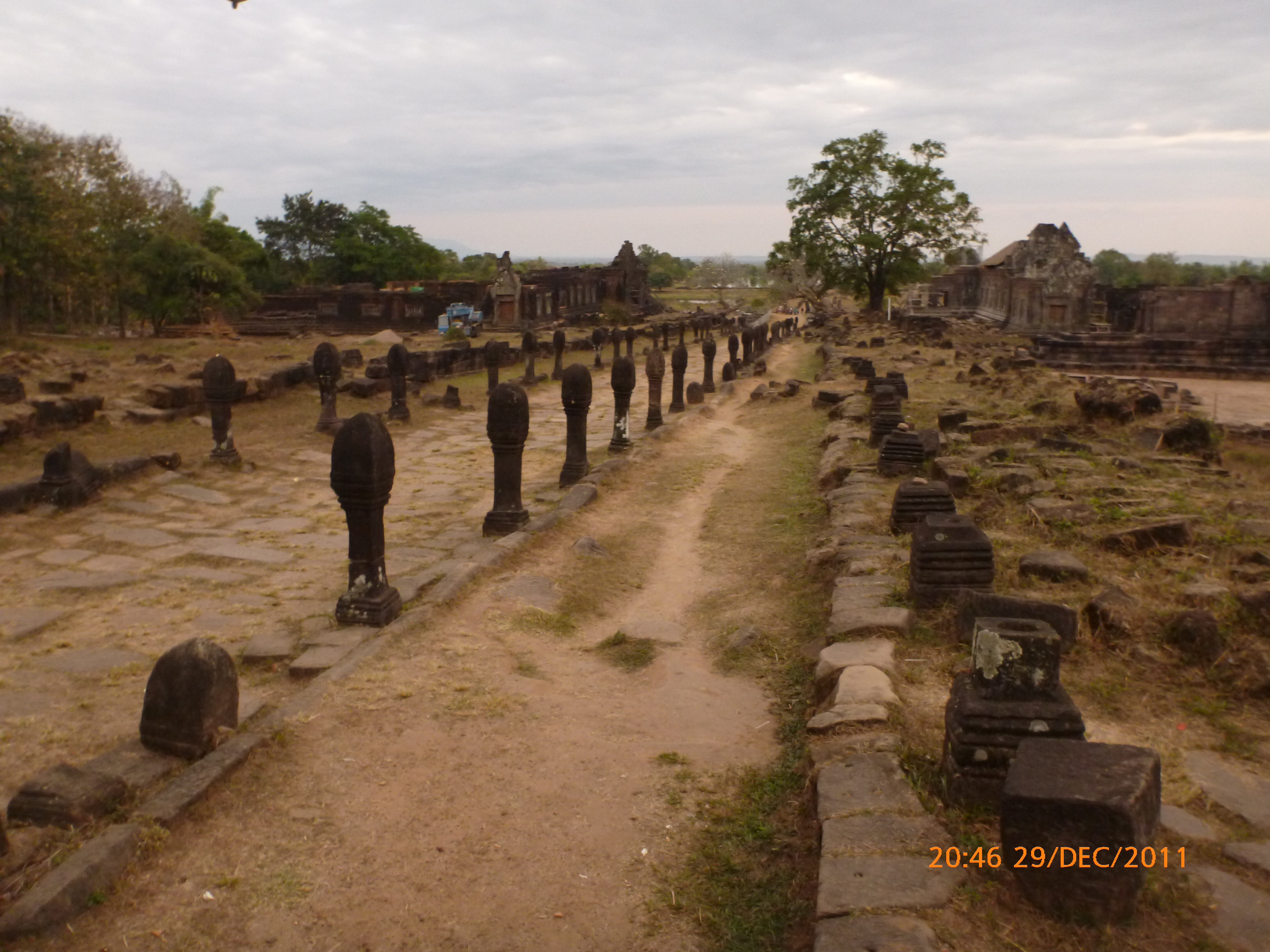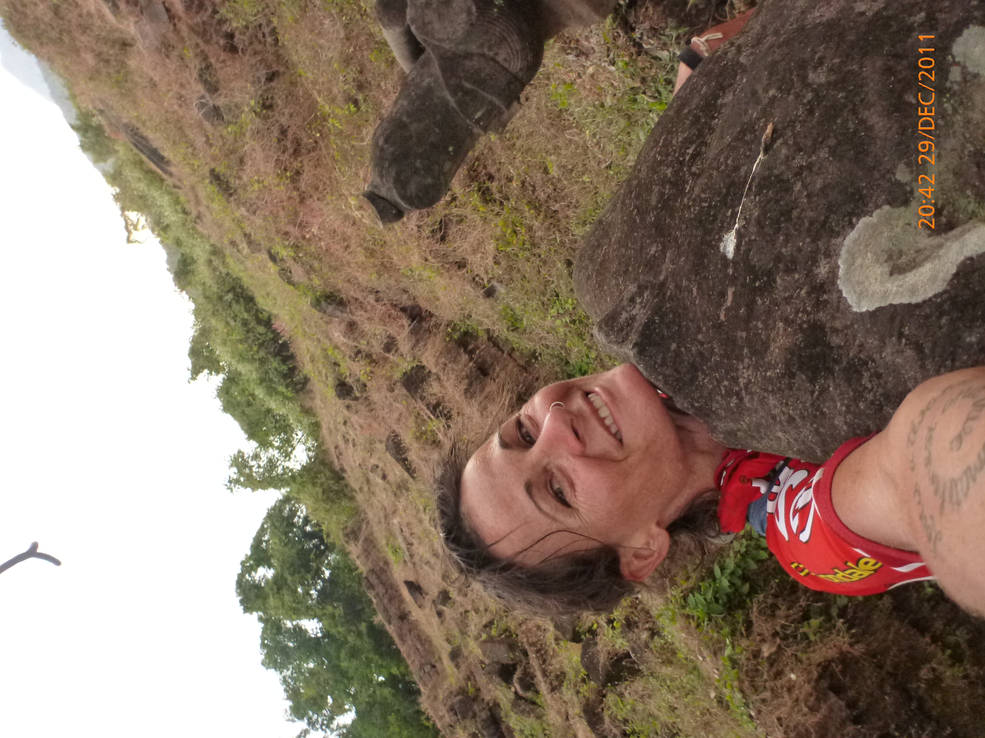 Day 29 1051 days to go. Distance: today 47km total 1400km. It’s 7.12pm Thursday 29/12/2011 Champasak. I am sitting in the cafe attached to the guesthouse I’m staying at 40000 kip nice and the restaurant looks straight out onto the mekong. The village lights from the island opposite are twinkling and the frog are going off. They’re almost drowning out the bunch of knee highs that live here. It’s very active o’clock for them and they’re happy squealing a muck. I’ve just got back from the Wat Phu Champasak awesome awesome awesome got to appreciate it for a few hours including sunset this arv so feeling very chuffed with myself and really glad I bothered. Today started with a recky of Paske interesting place full of pockets of happenings. Paske’s perched on an inlet where the Mekong and Si Don rivers meet. So there’s a real active river life mostly restaurants but also locals enjoying the lazy feel to the place like groups of men playing what I called botchy but here its called Petang. It’s got a rustic french colonial charm that’s a bit dirty and raw. It was still quite sleepy when I cycled round with stalls just starting to cook their breakfast menu grilled meats and sticky rice smells everywhere. That smell in the morning and then at dusk is so yummy. It’s like a smoky grilled BBQ smell of spicy meets with fresh steamed rice in the background mmmmmmmm you can tell I haven’t had dinner yet. I just sniff my way around at these times psyching up for what tempts the most. I think Ive mentioned previously that most locals don’t cook here they eat out and it’s a way of life to cater either quick stop stalls through to restaurants. Its really cool to check out the roadside stalls industriously preparing their menu for the hoards that come through at hungry o’clock. Mostly locals snack on the run or buy takeaway in plastic bags or some sit at the few chairs if available. There’s allot of social eating places where groups will sit around a grilling plate and it’s a free all everyone in selecting from fresh meat and veg cuts and grilling their bites. I found the local morning market which is also one of my favorite places and stocked up on bananas and found some baguettes yay – clearly recovered from my ant ordeal with no PTSD clearly seeing I bought three. I was trying to find how to access the bridge to Champasak and came across a dead end but right there was this pig market with this crazy frenzy of bidding and bartering it was insane. It was a bit challenging as the pigs welfare is not a priority just the first in don’t miss out yelling and squealing eeeek thing. Pigs were being pulled in an out by the legs in bright yellow hessian bags and it was just so business as usual I stood there for ages catching the eyes of locals and nodding at their good buys. i hope I don’t come back as a Laos pig that yellow is not my color. I’ve just tuned in to the layers of sounds coming from the river peoples voices at different distances and lots of put put motoring from long boats that’s the main river transportation. Frogs are the sopranos and geckos occasionally come in with their double chirps. It’s balmy and the breeze coming off the river is really melting. It’s nice there’s no tourists at least we’re Im staying. There’s a couple more upmarlket hotal further up and the few I have seen today may be there if there overnighting. I was expectng to see more tourists at the wat this arv but it was mostly laos people. There were these two japanese girls who were so sweat came up recognizing ruby as a specialized bike like a bike at home and kept saying how much I need to include Japan in my itineracy. That’s a bit of a detour. I checked out of the guesthouse in Paske and had my helper ‘Con’ who worked there so wanting to help. He sleeps in the foyer like most workers seem to do at guesthouses and going by the way Ruby’s seat was positioned this morning I think he and her played up all night she’s very quiet about the topic and a but sleepy today I noticed 🙂 Before leaving I ran into this crazy couple I met back in Kasi Christiano from italy and Graziella from France. They are so well travelled for an extended period of time and back in Kasi I got chatting for a bit about Madagascar Graziella’s favorite place. Anyway it was really great to bump into them again and was able to give them a card in case they want to keep in tough. We’re roughly traveling in the same direction for the next month so it maybe we meet up. The cycle to Champasak was lovely. The Bolaven Plateau is on one horizon and mountain ranges on the other. It’s very rural and agricultural with rice fields the main crop. I found this empty roadside stall right on the river to stop for lunch which was beautiful and the baguette never tasted so good. Champasak itself is very laid back comatosed even and there’s lots of places to chill and space out watching the river life potter by. I was tempted to just find a shady spot and play with my belly button but motivated myself to go check out the watt and so glad I did. It’s from the 6th century and it oozzed this age quite primitive in some of it’s rock impressions of geckos and elephants. Aparently it was the blueprint for cambodia’s Ankor watt so that’ll be interesting to check for similarities when I’m there. The watt runs up a hillside and from the top there’s a terraced outlook over the complex. Flowering frangipanis line the stairs up the hill beautiful and the light was great being over sunset. It draws locals who leave offerings and burning incense in the shrines and there’s ladies selling offerings for those who didn’t come prepared and feel the urge. I noticed the Buddhas had been dressed in gold robes and the one in the courtyard even has an umbrella. Well it is hot you know and you too would have sun exposure concerns if you were that old 🙂 It was very laid back and non touristy and a wonderful plac
