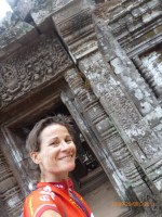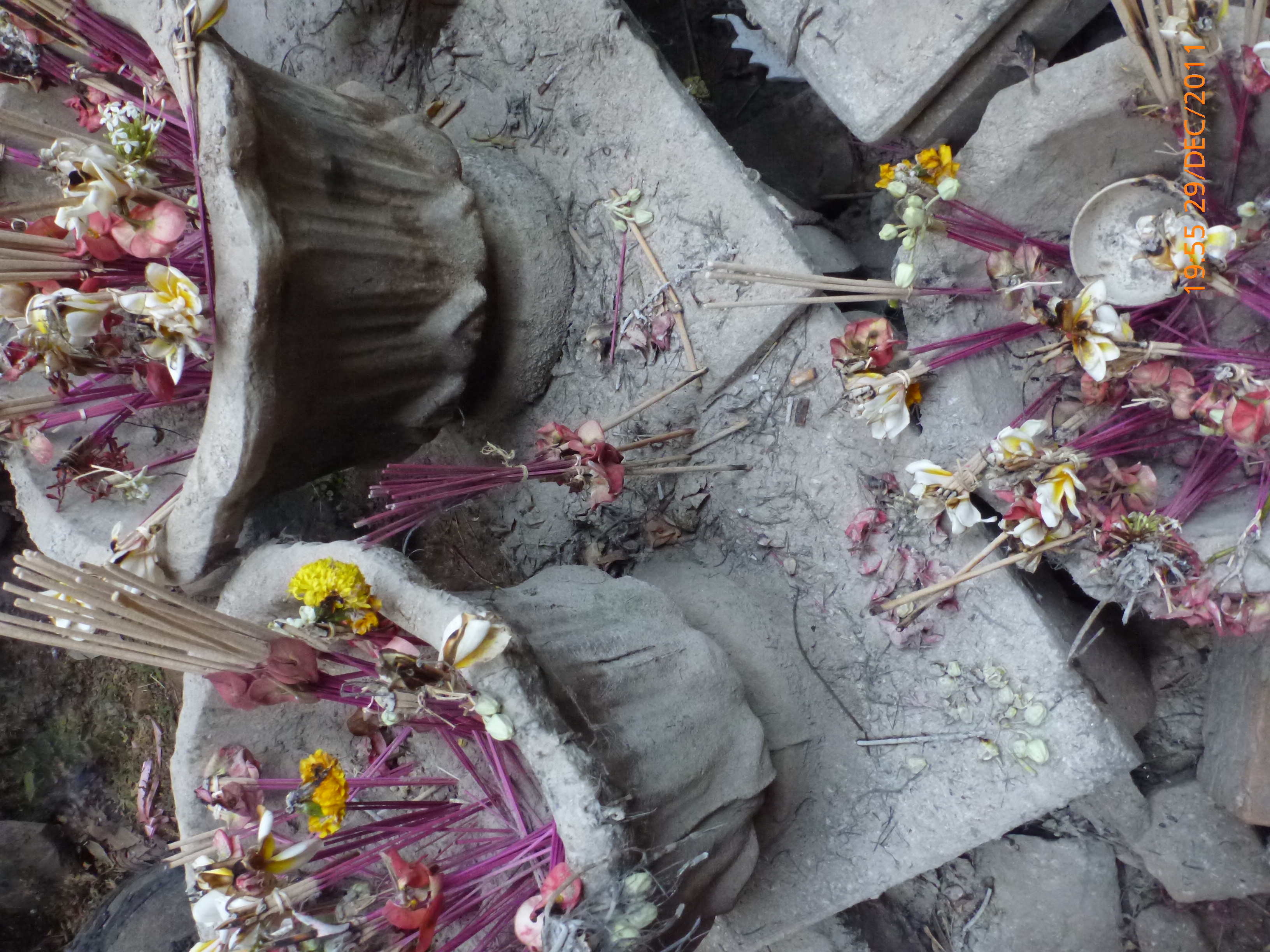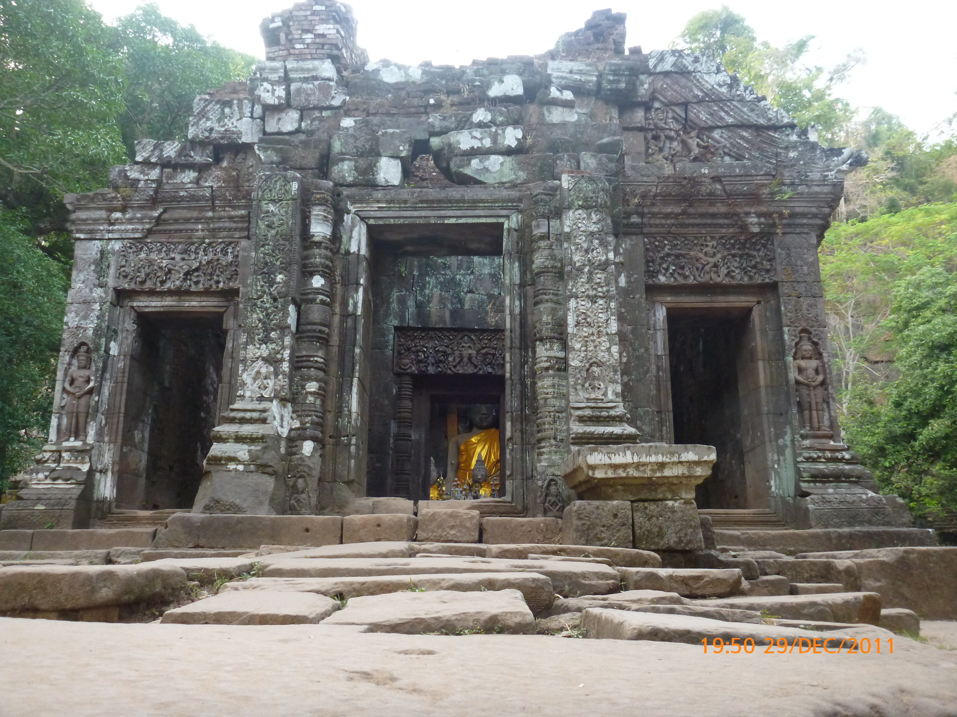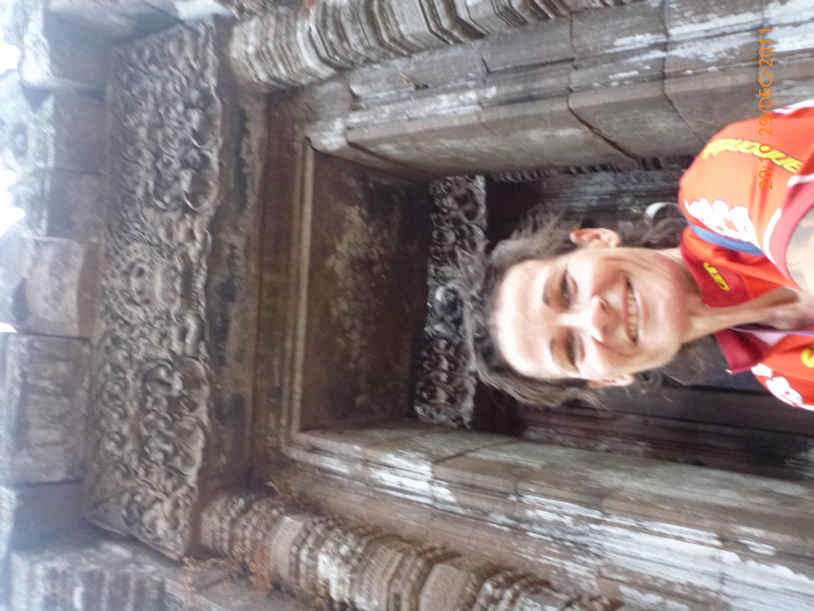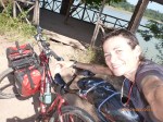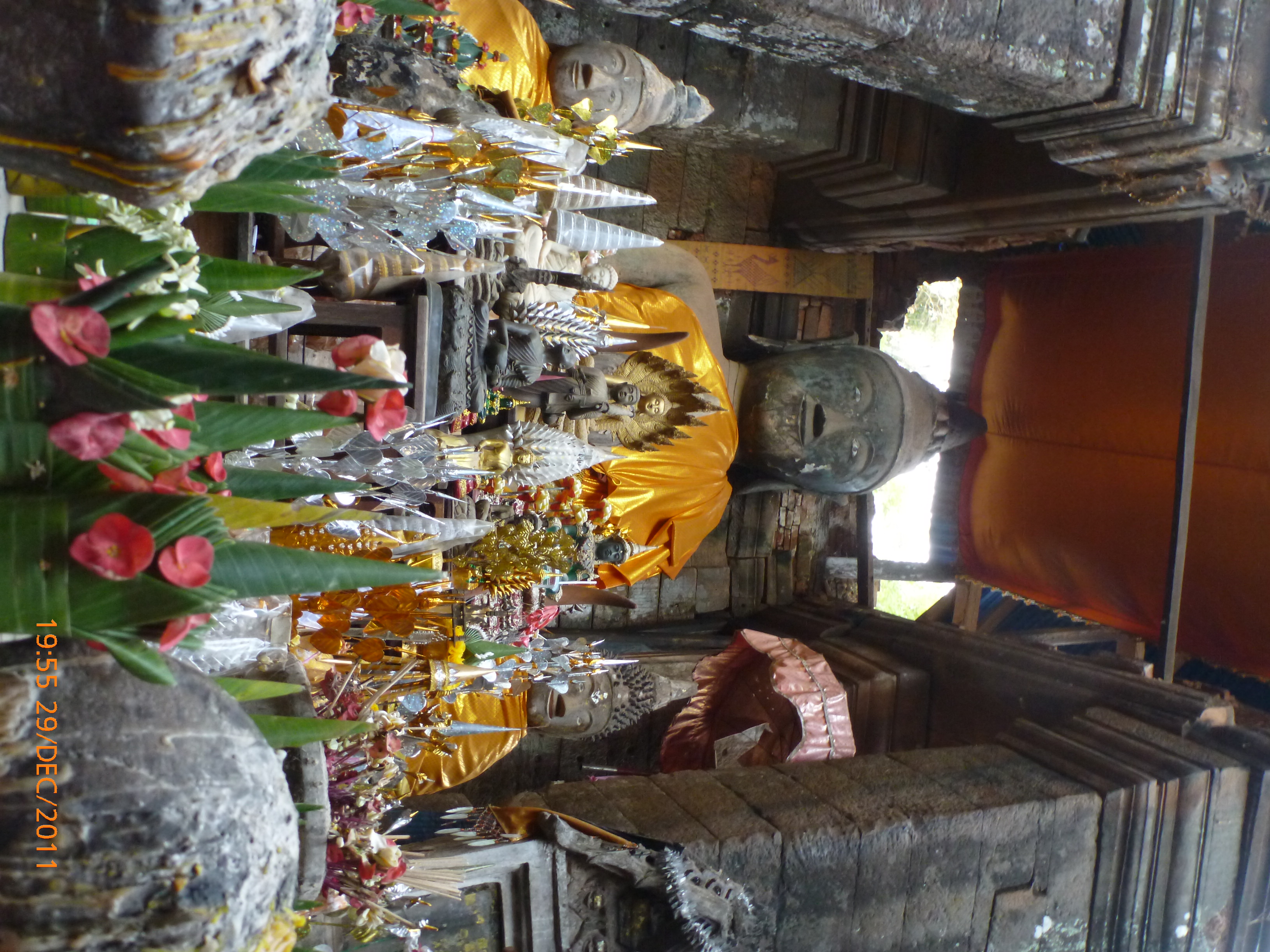 Day 29 1051 days to go. Distance: today 47km total 1400km. It’s 7.12pm Thursday 29/12/2011 Champasak. I am sitting in the cafe attached to the guesthouse I’m staying at 40000 kip nice and the restaurant looks straight out onto the mekong. The village lights from the island opposite are twinkling and the frog are going off. They’re almost drowning out the bunch of knee highs that live here. It’s very active o’clock for them and they’re happy squealing a muck. I’ve just got back from the Wat Phu Champasak awesome awesome awesome got to appreciate it for a few hours including sunset this arv so feeling very chuffed with myself and really glad I bothered. Today started with a recky of Paske interesting place full of pockets of happenings. Paske’s perched on an inlet where the Mekong and Si Don rivers meet. So there’s a real active river life mostly restaurants but also locals enjoying the lazy feel to the place like groups of men playing what I called botchy but here its called Petang. It’s got a rustic french colonial charm that’s a bit dirty and raw. It was still quite sleepy when I cycled round with stalls just starting to cook their breakfast menu grilled meats and sticky rice smells everywhere. That smell in the morning and then at dusk is so yummy. It’s like a smoky grilled BBQ smell of spicy meets with fresh steamed rice in the background mmmmmmmm you can tell I haven’t had dinner yet. I just sniff my way around at these times psyching up for what tempts the most. I think Ive mentioned previously that most locals don’t cook here they eat out and it’s a way of life to cater either quick stop stalls through to restaurants. Its really cool to check out the roadside stalls industriously preparing their menu for the hoards that come through at hungry o’clock. Mostly locals snack on the run or buy takeaway in plastic bags or some sit at the few chairs if available. There’s allot of social eating places where groups will sit around a grilling plate and it’s a free all everyone in selecting from fresh meat and veg cuts and grilling their bites. I found the local morning market which is also one of my favorite places and stocked up on bananas and found some baguettes yay – clearly recovered from my ant ordeal with no PTSD clearly seeing I bought three. I was trying to find how to access the bridge to Champasak and came across a dead end but right there was this pig market with this crazy frenzy of bidding and bartering it was insane. It was a bit challenging as the pigs welfare is not a priority just the first in don’t miss out yelling and squealing eeeek thing. Pigs were being pulled in an out by the legs in bright yellow hessian bags and it was just so business as usual I stood there for ages catching the eyes of locals and nodding at their good buys. i hope I don’t come back as a Laos pig that yellow is not my color. I’ve just tuned in to the layers of sounds coming from the river peoples voices at different distances and lots of put put motoring from long boats that’s the main river transportation. Frogs are the sopranos and geckos occasionally come in with their double chirps. It’s balmy and the breeze coming off the river is really melting. It’s nice there’s no tourists at least we’re Im staying. There’s a couple more upmarlket hotal further up and the few I have seen today may be there if there overnighting. I was expectng to see more tourists at the wat this arv but it was mostly laos people. There were these two japanese girls who were so sweat came up recognizing ruby as a specialized bike like a bike at home and kept saying how much I need to include Japan in my itineracy. That’s a bit of a detour. I checked out of the guesthouse in Paske and had my helper ‘Con’ who worked there so wanting to help. He sleeps in the foyer like most workers seem to do at guesthouses and going by the way Ruby’s seat was positioned this morning I think he and her played up all night she’s very quiet about the topic and a but sleepy today I noticed 🙂 Before leaving I ran into this crazy couple I met back in Kasi Christiano from italy and Graziella from France. They are so well travelled for an extended period of time and back in Kasi I got chatting for a bit about Madagascar Graziella’s favorite place. Anyway it was really great to bump into them again and was able to give them a card in case they want to keep in tough. We’re roughly traveling in the same direction for the next month so it maybe we meet up. The cycle to Champasak was lovely. The Bolaven Plateau is on one horizon and mountain ranges on the other. It’s very rural and agricultural with rice fields the main crop. I found this empty roadside stall right on the river to stop for lunch which was beautiful and the baguette never tasted so good. Champasak itself is very laid back comatosed even and there’s lots of places to chill and space out watching the river life potter by. I was tempted to just find a shady spot and play with my belly button but motivated myself to go check out the watt and so glad I did. It’s from the 6th century and it oozzed this age quite primitive in some of it’s rock impressions of geckos and elephants. Aparently it was the blueprint for cambodia’s Ankor watt so that’ll be interesting to check for similarities when I’m there. The watt runs up a hillside and from the top there’s a terraced outlook over the complex. Flowering frangipanis line the stairs up the hill beautiful and the light was great being over sunset. It draws locals who leave offerings and burning incense in the shrines and there’s ladies selling offerings for those who didn’t come prepared and feel the urge. I noticed the Buddhas had been dressed in gold robes and the one in the courtyard even has an umbrella. Well it is hot you know and you too would have sun exposure concerns if you were that old 🙂 It was very laid back and non touristy and a wonderful plac