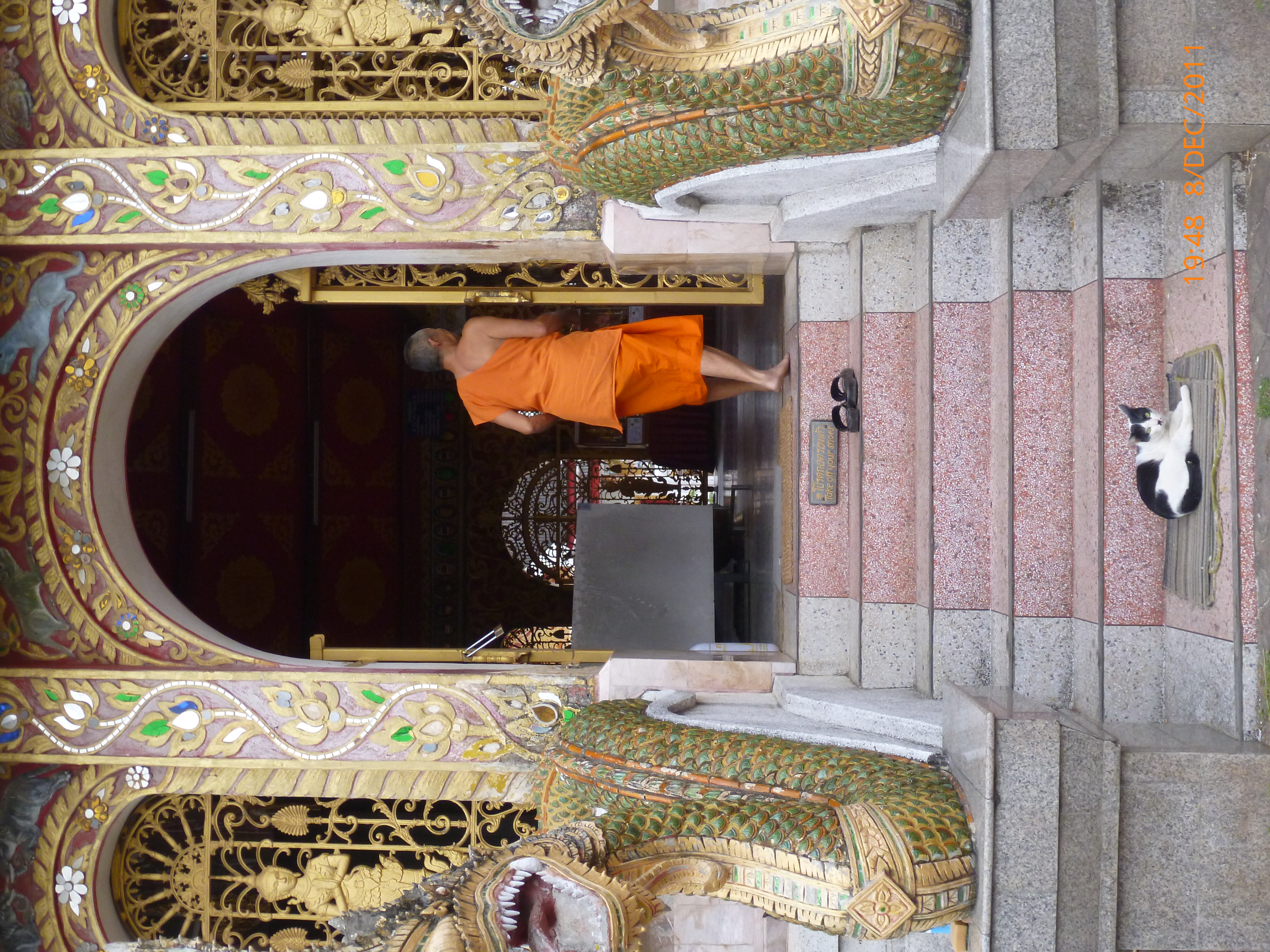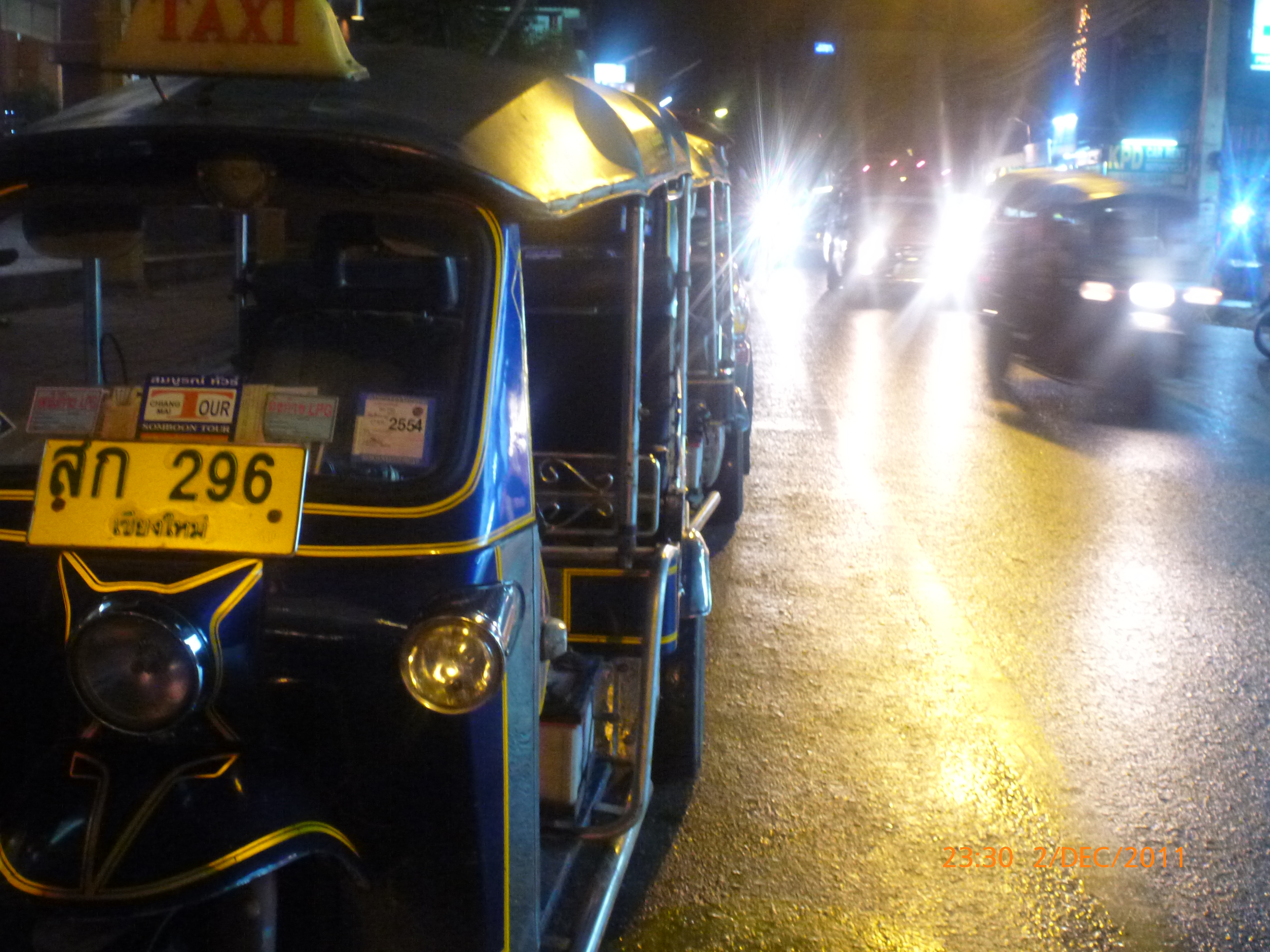 I head today for Chaing Rai then onto the border town of Chaing Konginto Loas in about 5 days. Chaing Mai has been a trip for the senses and an amazing beginner’s introduction to Asian travel. The local people are colorful, friendly, helpful, and down to earth and respond warmly and graciously to the universal smile. I’ve made a point to catch the eyes of locals and smile with a nod. Local people speak little English so it’s been an entertaining mix of acting, drawing, laughing and trying again. Thai folk away from the tourist centers are keen and patient to understand. Plus I think I have been a source of amusement in my efforts. For a seemingly hectic place the people are relaxed and polite and move around each other with an ease that works. There is lots of honking and beeping but no aggression in it. It’s a language of its own used to communicate to people and other traffic goers – and there’s a whole mix out on the roads spilling onto the footpaths: Cars, mopeds, cyclist pedestrians, dogs, cats, and taxis of all sorts.