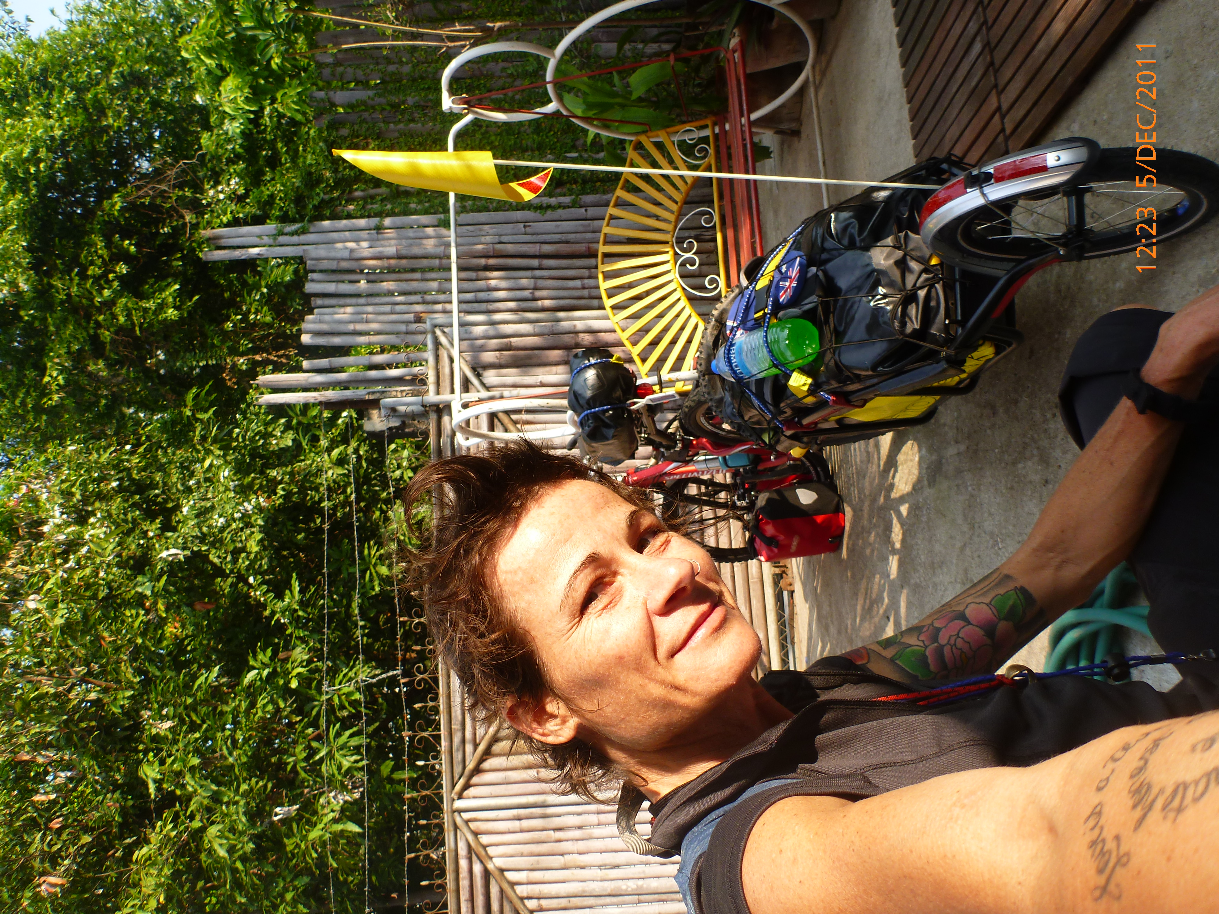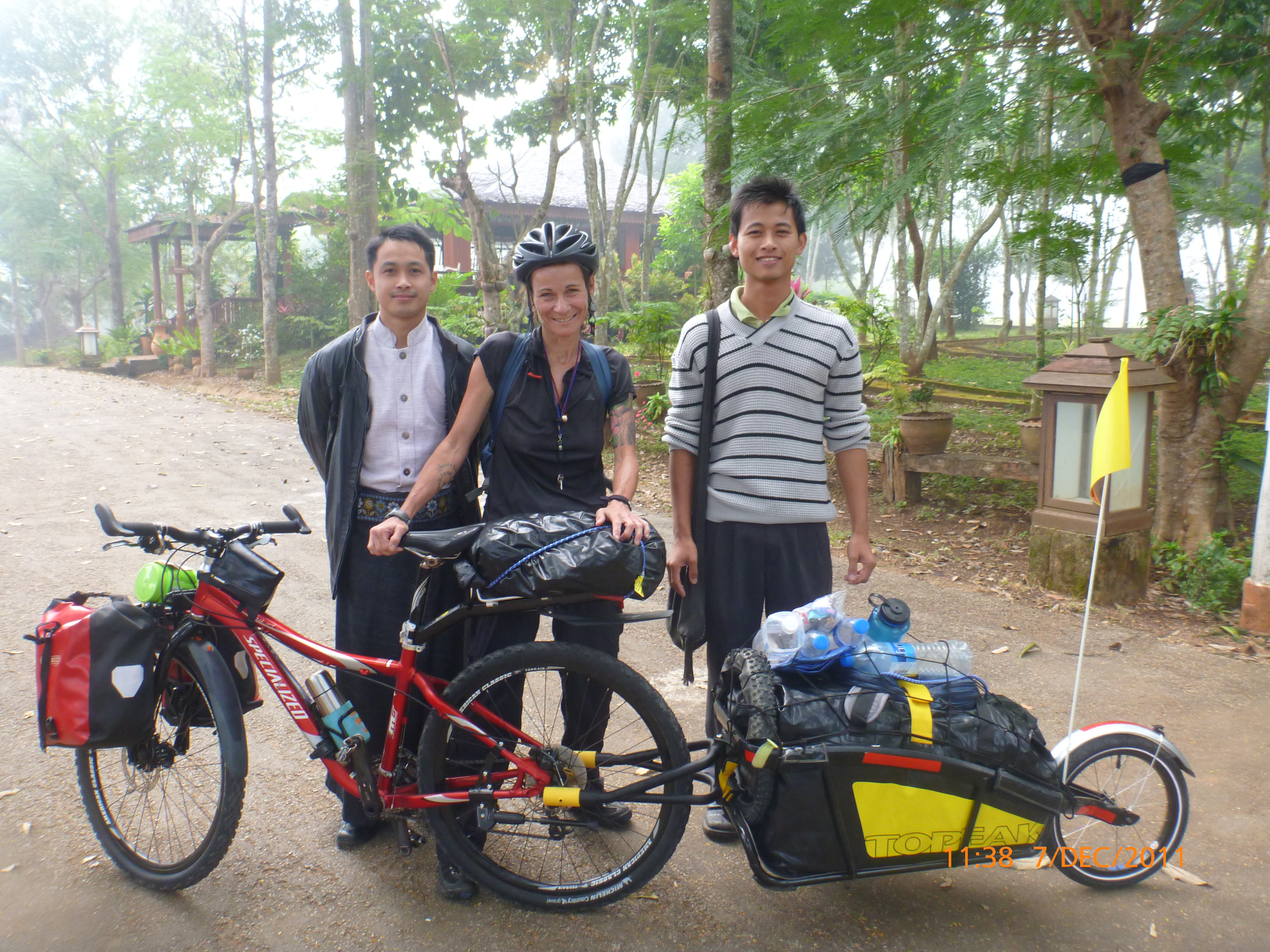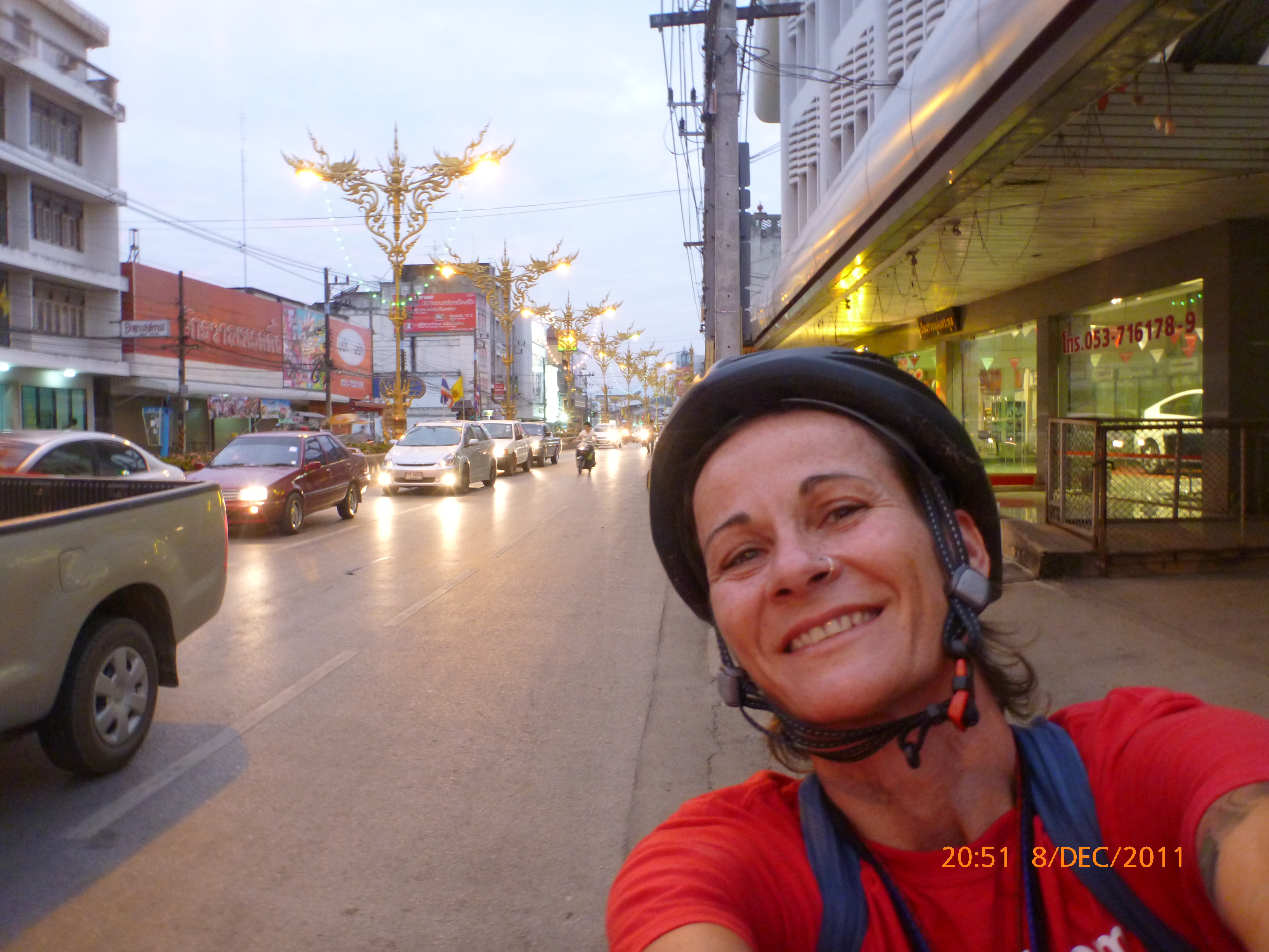 Day 5 Days to Go 1075 – Hi there. It’s Monday morning 5/12/2011 here time and I’ve found an internet café for the inaugural virgin post for shecyclesolo. I can’t believe it’s only 48hours after touchdown Chaing Mai. Leaving was emotionally harder than I imagined and the flight and transit seems a blur now. The next 1080 days isn’t intended a holiday and I wasn’t really prepared for the moment of letting go of the logistics phase and entering into a whole new world literally. Let’s say it’s been a transition from the overwhelming to now feeling ready to rock and roll. What has helped is a newfound insight for the gift of internet: to video skype with my partner and exchange emails with my family. We are not so far part and I am certainly not alone in this adventure. Plus it definitely helped to have a loving upper cut from one of my sisters to get on with it one peddle and post at a time. But enough of the heavy… 🙂