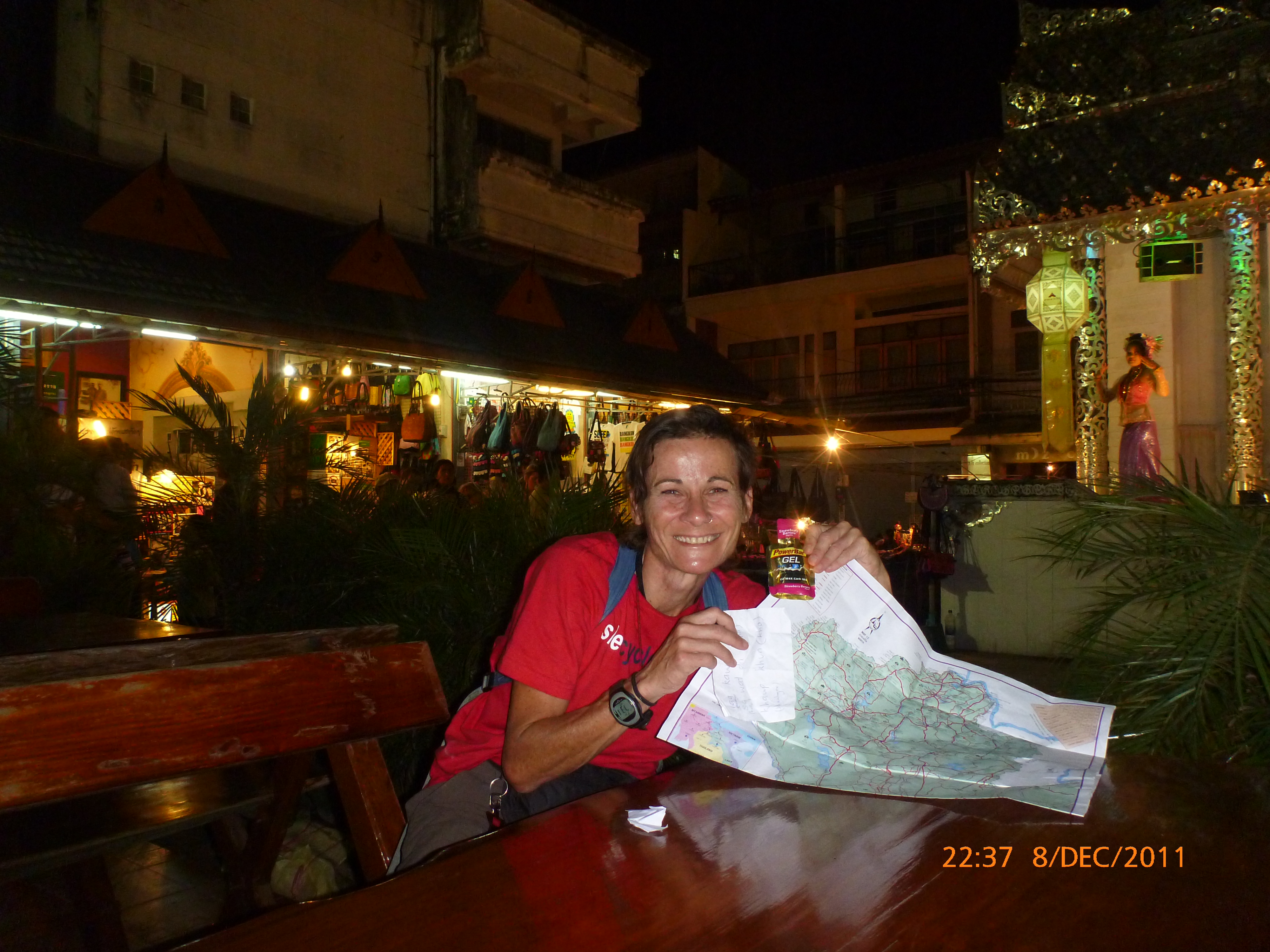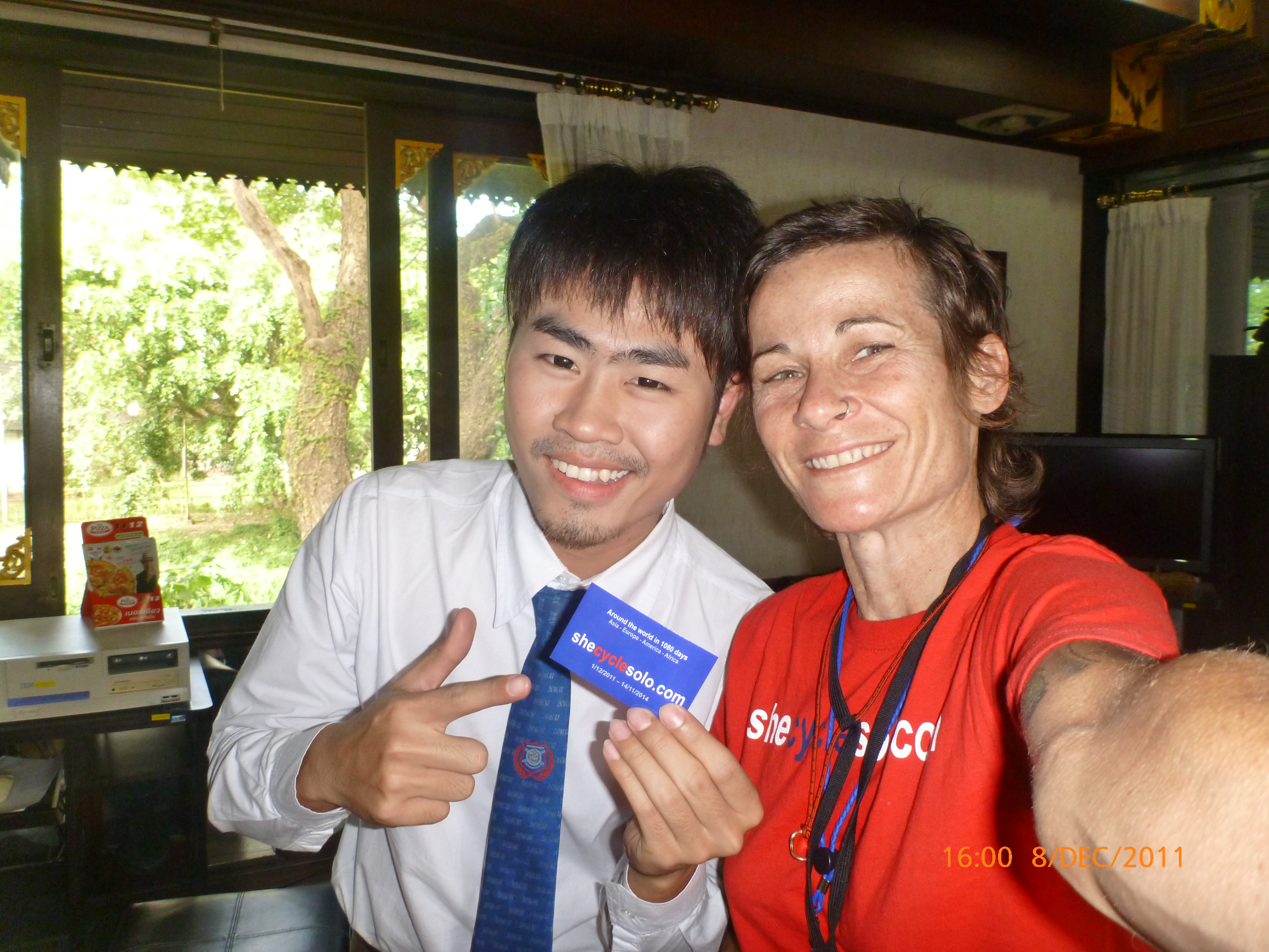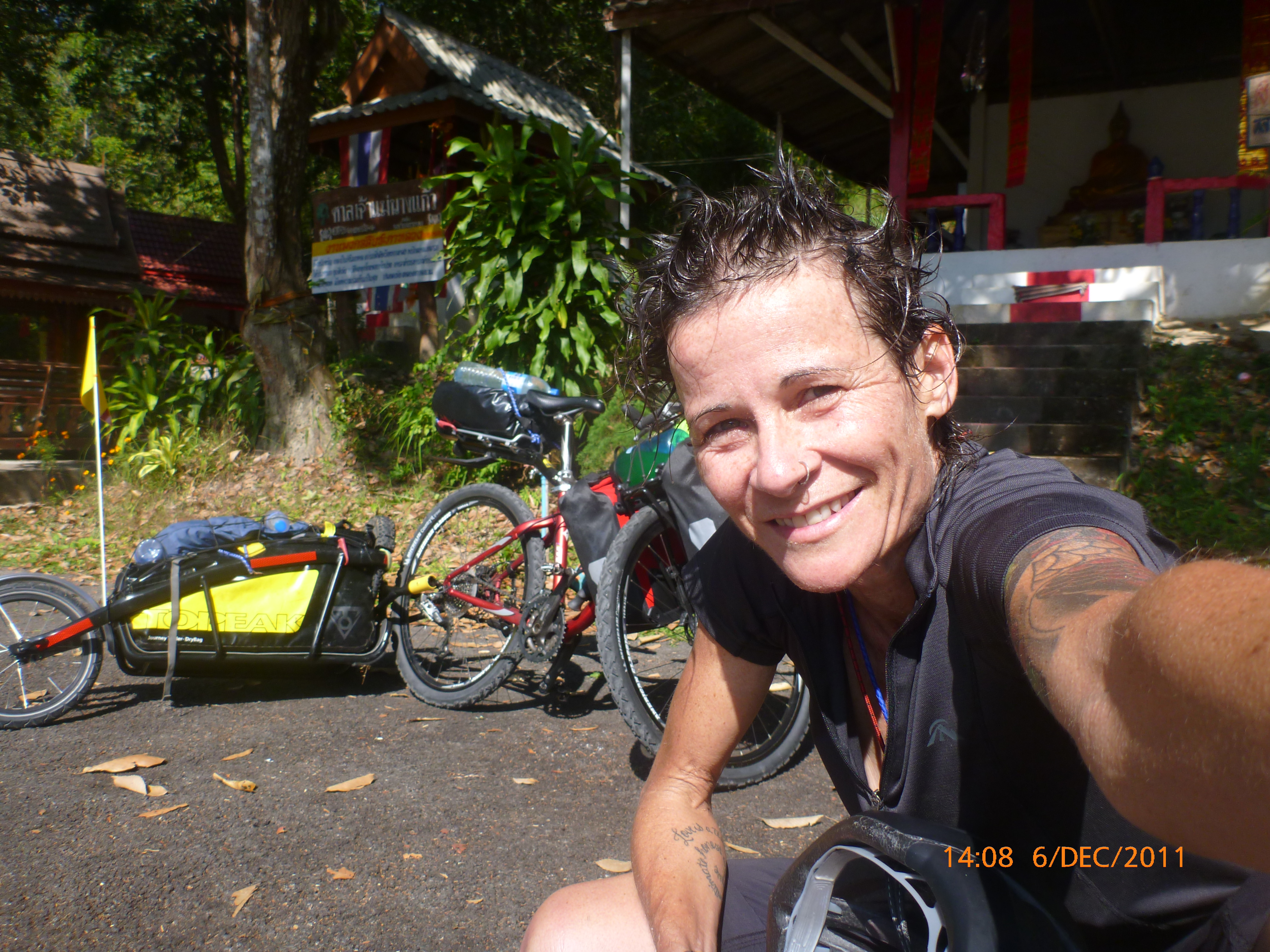 Day 5 Days to Go 1075 – Hi there. It’s Monday morning 5/12/2011 here time and I’ve found an internet café for the inaugural virgin post for shecyclesolo. I can’t believe it’s only 48hours after touchdown Chaing Mai. Leaving was emotionally harder than I imagined and the flight and transit seems a blur now. The next 1080 days isn’t intended a holiday and I wasn’t really prepared for the moment of letting go of the logistics phase and entering into a whole new world literally. Let’s say it’s been a transition from the overwhelming to now feeling ready to rock and roll. What has helped is a newfound insight for the gift of internet: to video skype with my partner and exchange emails with my family. We are not so far part and I am certainly not alone in this adventure. Plus it definitely helped to have a loving upper cut from one of my sisters to get on with it one peddle and post at a time. But enough of the heavy… 🙂