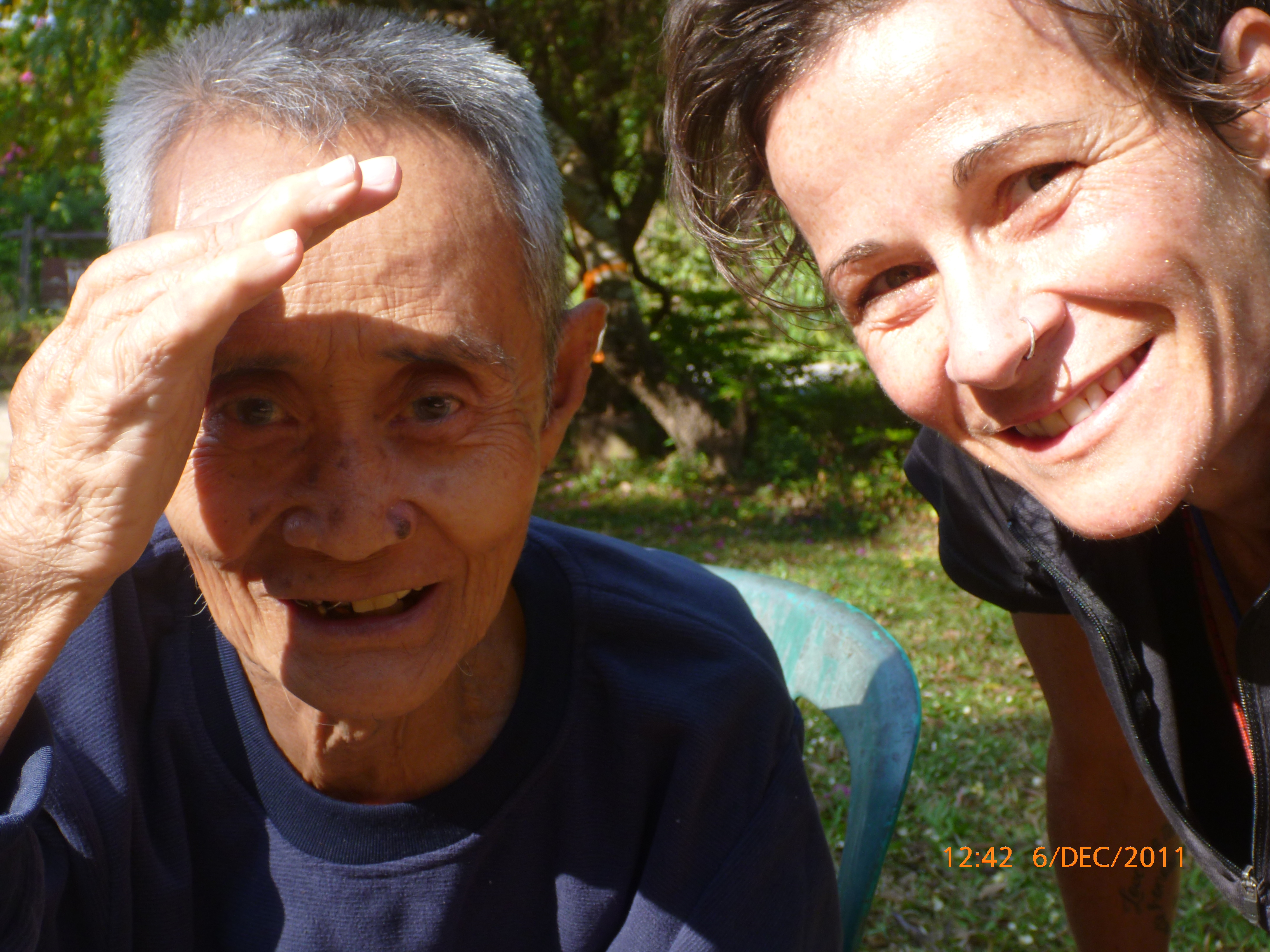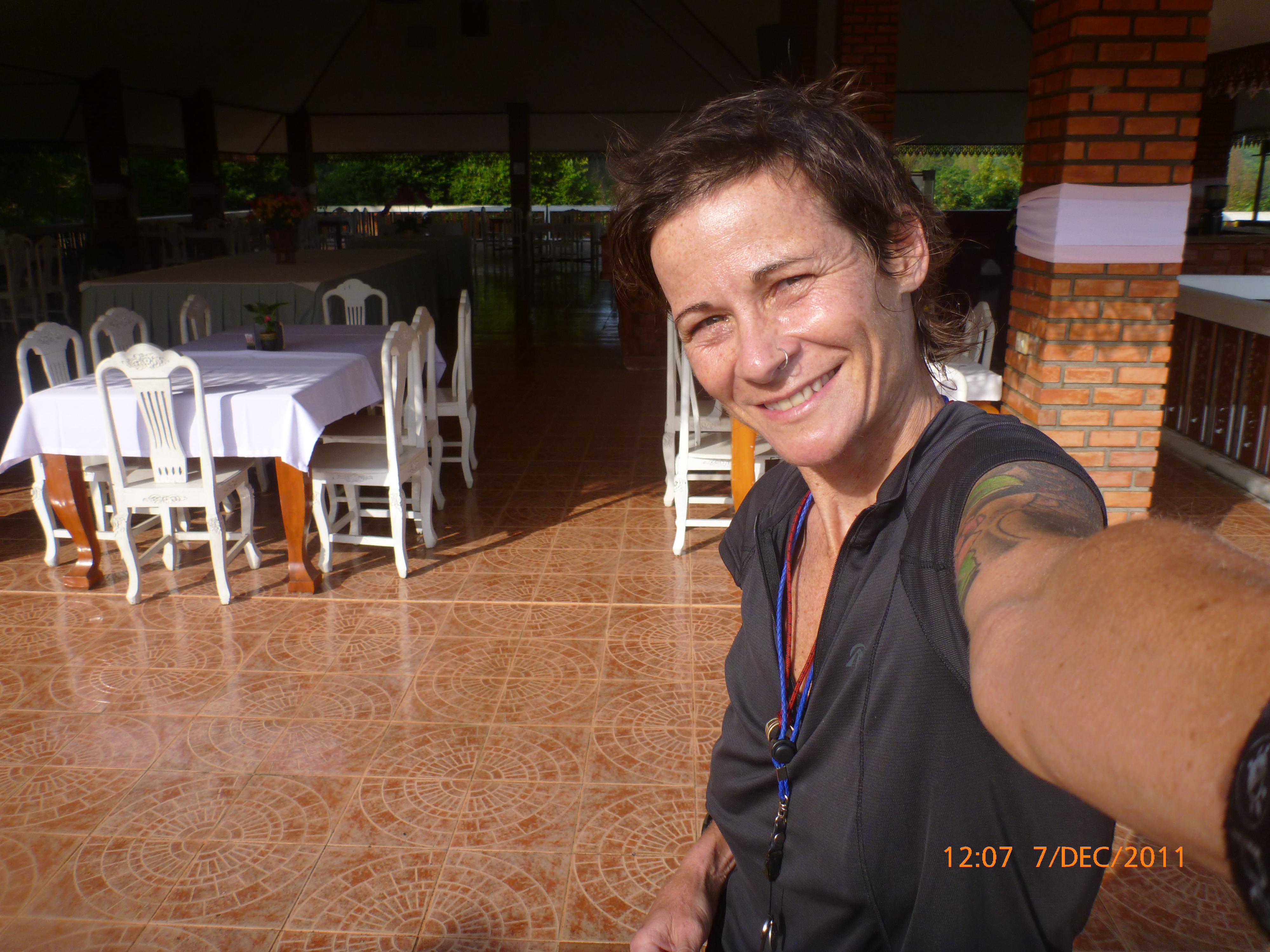 Day 7 Days to go 1073 – It’s 7.45pm Tues 6/12/11. I am sitting in an open area common room at Mohn mye horn resort I’m guessing about 60km from Chaing Rai. That sounds a bit flash for a $15 Aus a day girl or about 400 baht. No I didn’t pay the 2000 baht per night. It got to ‘the end of the day’ o’clock about 5pm when I started asking locals where I may sleep. I kept getting waved onto this place. Here I was met by the owner ‘Munee’ who in his best English told me the cost and in the same breath apologised knowing I wouldn’t be able to afford it. I then asked if he had a quiet spot I could camp and here I am. He didn’t accept any baht and gave me two yogurts and a bottle of water instead. Kind is the word. I promised him a plug on the blog which he did graciously accept so I’ll post his own to say thank you. I’m loving the Thai people. What I ‘m appreciating most is the warm generosity comes from the richer and the poorer. Last night I’m staying at a tiny rural home and tonight I’m soaking up the lavish all given in kind. I even managed a decent bird bath in the female amenities so I’m feeling a million bucks. I started today by having a photo with by all accounts the grandad of the extended family living on the farm. He was sitting in the sun watching the mushrooms dry literally and was very happy to have his photo taken. The ride was really hilly this morning. One thing I have learnt early about cycle touring is that it teaches humiliation 101. It’s not very glamourous pushing your bike and trailer up hills that get too long and steeps for these little legs at least. However once over the range it was downhill (max speed 52.8 yay) and flat for the next section which was great. I stopped for a break at a local road stall and had my first thai noodle soup with green veg, peanuts and chilli Yum (35baht or $1.50). Tummy rumbles tonight but who cares when travelling solo 🙂 All carbed up it was a really enjoyable afternoon even the last couple of hours which were back in the hills. I went through a town and saw a wifi sign in front of a cafe’ so for the price of an expresso (30baht) I got onto the internet yay. I tested sending a post via the ipod using what I typed last night from the notes application so I hope it worked. i didn’t proof read it first so please excuse the grammar. I put dido on the ipod today for some inspiration to get up and over one of the more trickier climbs. It chomped into the battery life so tonight I’m using my solar charger for the first time and it’s working yay. I’ve got such a great range of safety toys thanks to my genius partner so it’s fun to play with them now in real time to have more of a clue about how great they are. I’ll be all IT savy in no time 😉 So the stats for today. Distance 78km, Costs 85 baht, Favorite moment: the whole day. least favorite: my first decent puppy attack who chased me for about 50m with the sound of my growling back at him echoing in the hills. Life’s good and all going well I’ll be in Chaing Rai tomorrow arc. It’ll be good to share some photos. I have a slide show going on my camera and it doesn’t take long to collect some cool memories. Ipod all charged its te for bed. Talk soon x