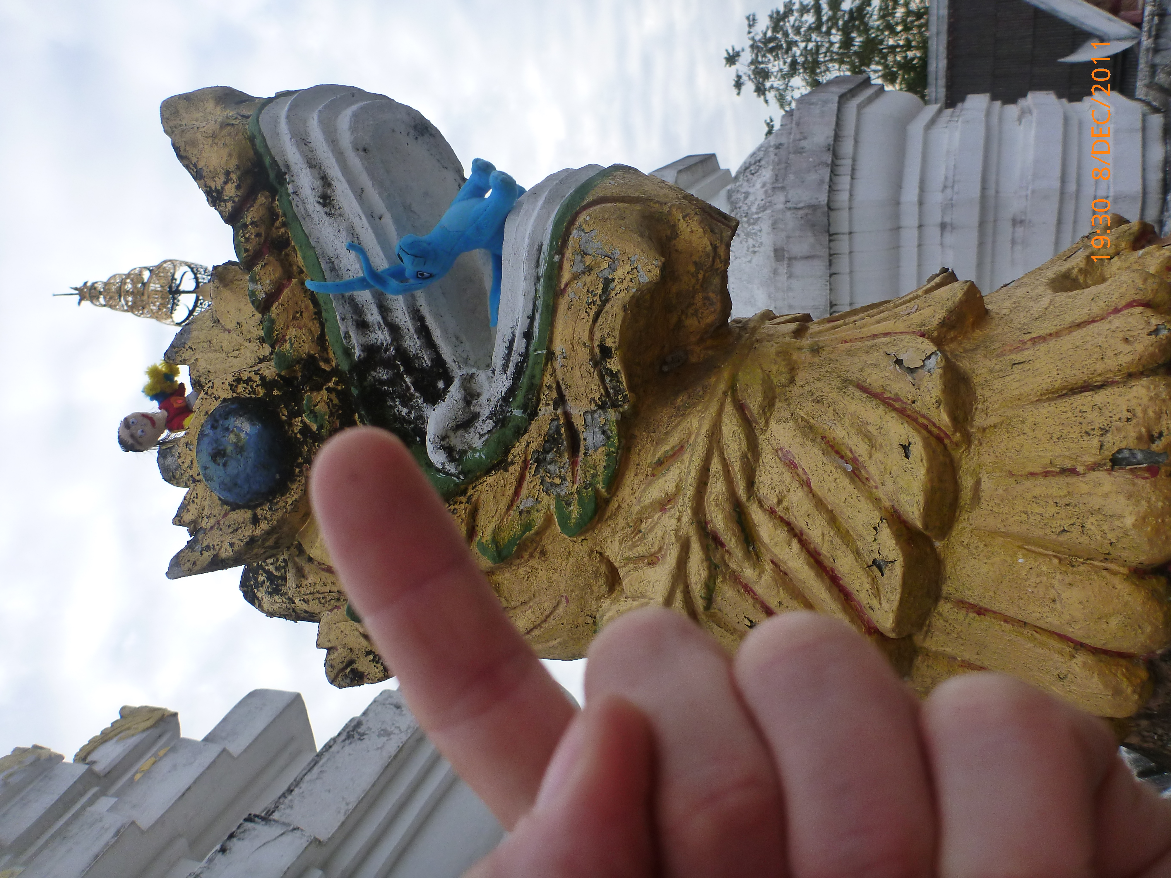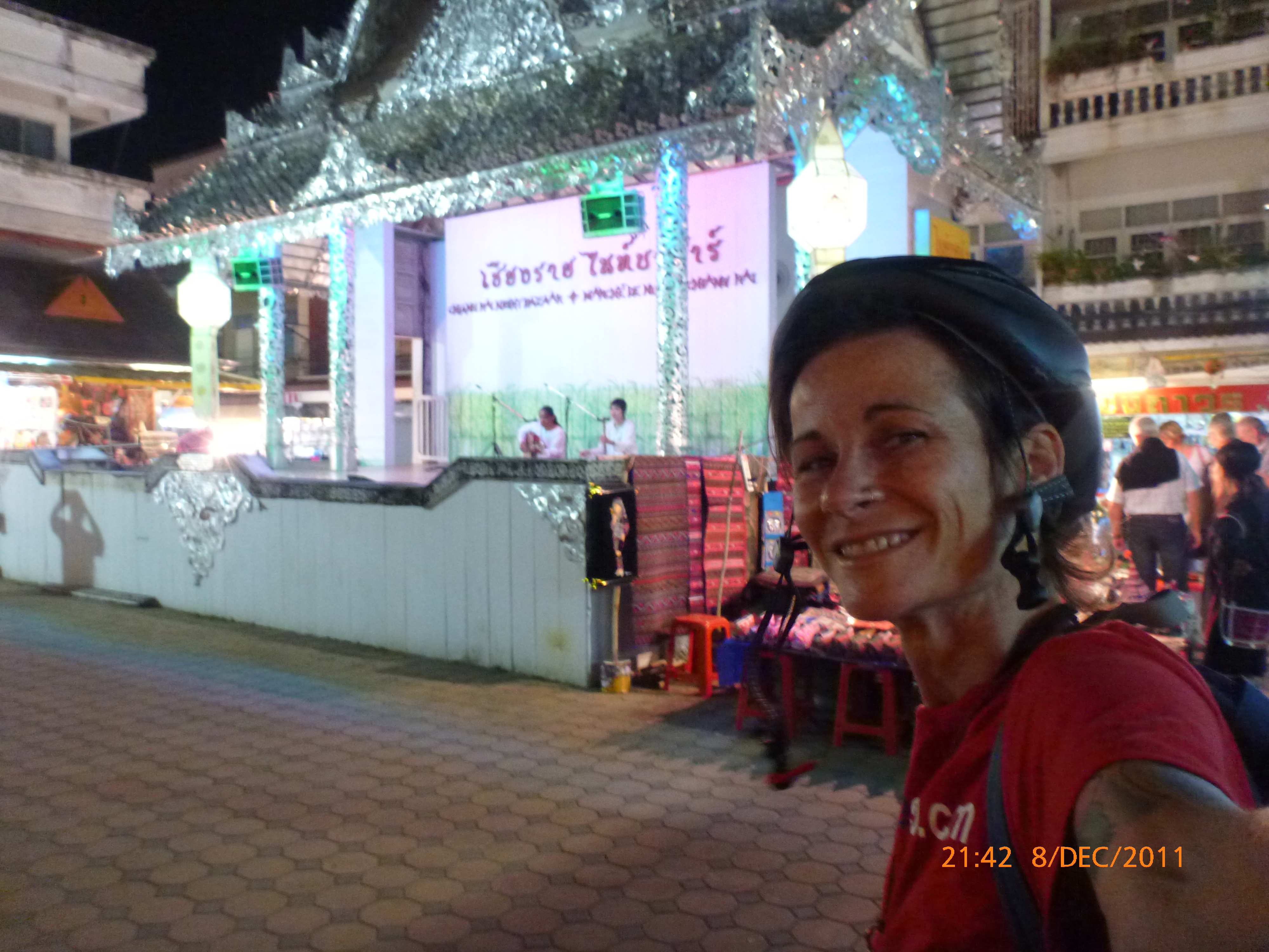 Day 8 Days to go 1072 It’s 6.40pm sitting in the night bazaar listening to a three piece Thai folk band if there’s such a thing. It’s really beautiful soaking up the music and aromas so what a great place to end an awesome day ipod’ing what’s happened. The day started perfect skyping my partner at early o’clock so I had to excuse myself for a couple more hours sleep ready for another Skype session a bit later. Have I told you how much I love the Internet. I then spent some time packing up ready to head to chaing kong tomorrow via Mae chan and chaing saen then along the Mekong into chaing kong. I thought I’d start to include some place names for the geographically interest especially my Pops xxx it should take about 2 days. I decided to stay another day here it’s really lovely and time is a luxury I do have to a degree, I was feeling a bit weary from the heat and k’s from the last days but feeling good tonight how could I not. Whilst packing I made friends with the house keeper Dang and her helper, Dang has 3 children 10, 8 and 1 and is raising them as a single mum, fun naughty lady so into sharing stories. I showed her all my gear, maps and wedding ring but “no children” much to her very sad face, lovely lovely time spent sharing their respectful intrigue and giggles. I popped back into the hotel durind the day to drop some shopping.off and I hear “Moree!!!” it was Dang with a Powerade gel for me how gorgeous, I headed to the tourist info to find out how to best head and again the guy was fascinated and wished me God’s protection and safe travel watch out for trucks-his broken English was excellent. On that more Dang taught me thankyou the word for the day which I regimately used all day awesome “khawp Kuhn kha”to the store Man I bought bananas from. Another to the checkout girls at the super market where I bought another tofu hit. And again to the bakery lady who was selling these tiny pastries filled with a fruit paste for 1 baht each yum. And so on …. I came across this buddhist monastery that grabbed attention with the old whitewashed Temple at the rear of the more modern one. Wow what a great find I spent ages there loving it’s age and tradition. Blue dog and Miss Jane even made a cameo appearance climbing the statues up to all sorts of mischief. It started getting dark so I road around town checking the exit route for Tomorrow something I forget to do in chaing Mai oppsy and now sitting very content in the night markets. I like this place allot so I hope you enjoy the photos. Heading back to the hotel soon sadly but it’s An early night for these little legs after uploading this post and photos from the day. Favorite part of the day mmmmmm right now thinking about what a great day it’s been and sharing it with you. Least favourite that it has to end. Tomorrows another day yay onwards to chaing kong. Talk soon x ps thankyou to everyone for your comments x I have taken some videos but still trying to work how to attach these – I’ll get to that one – right now – Photos uploaded nd time for zzzzzzzz