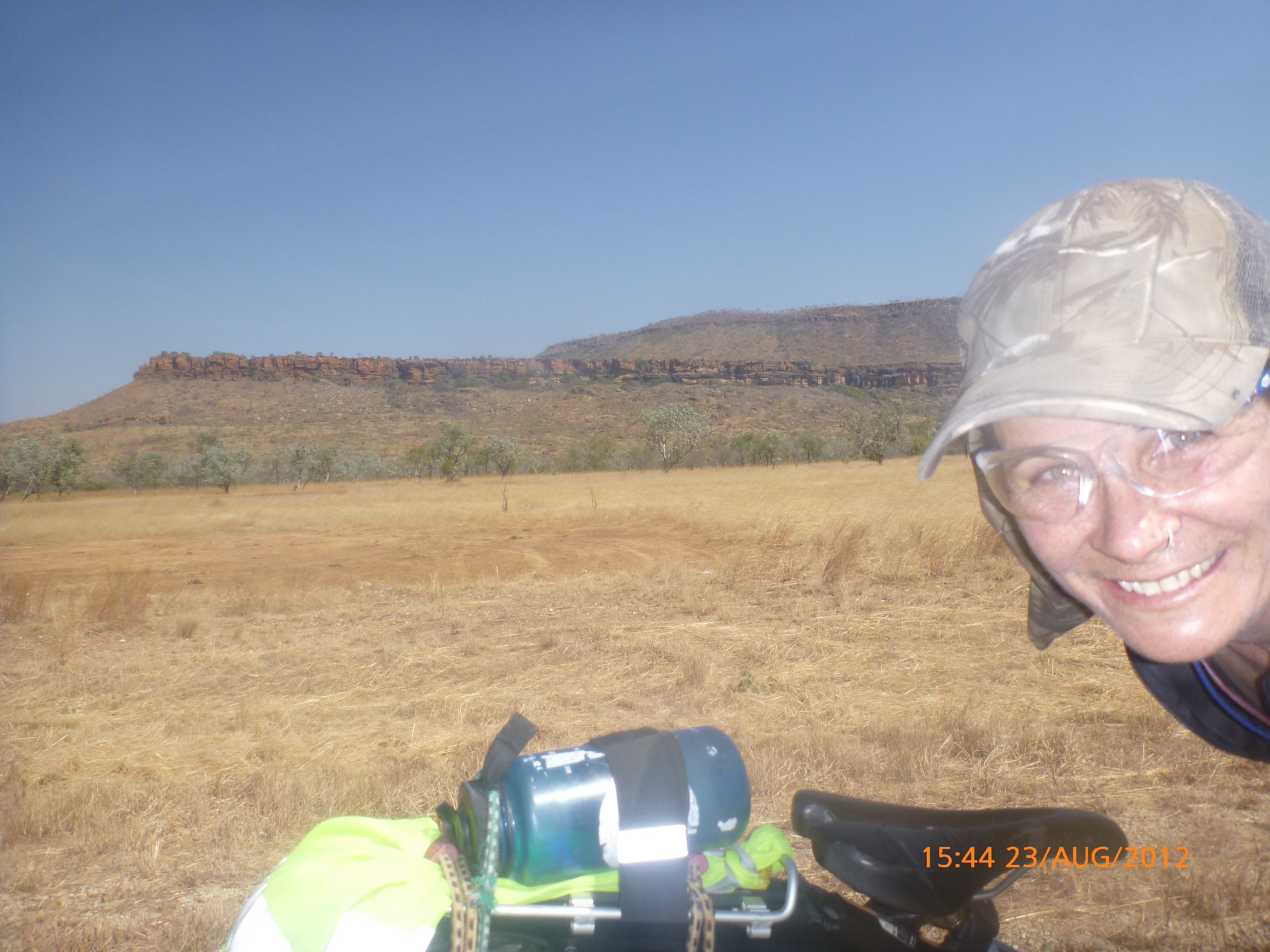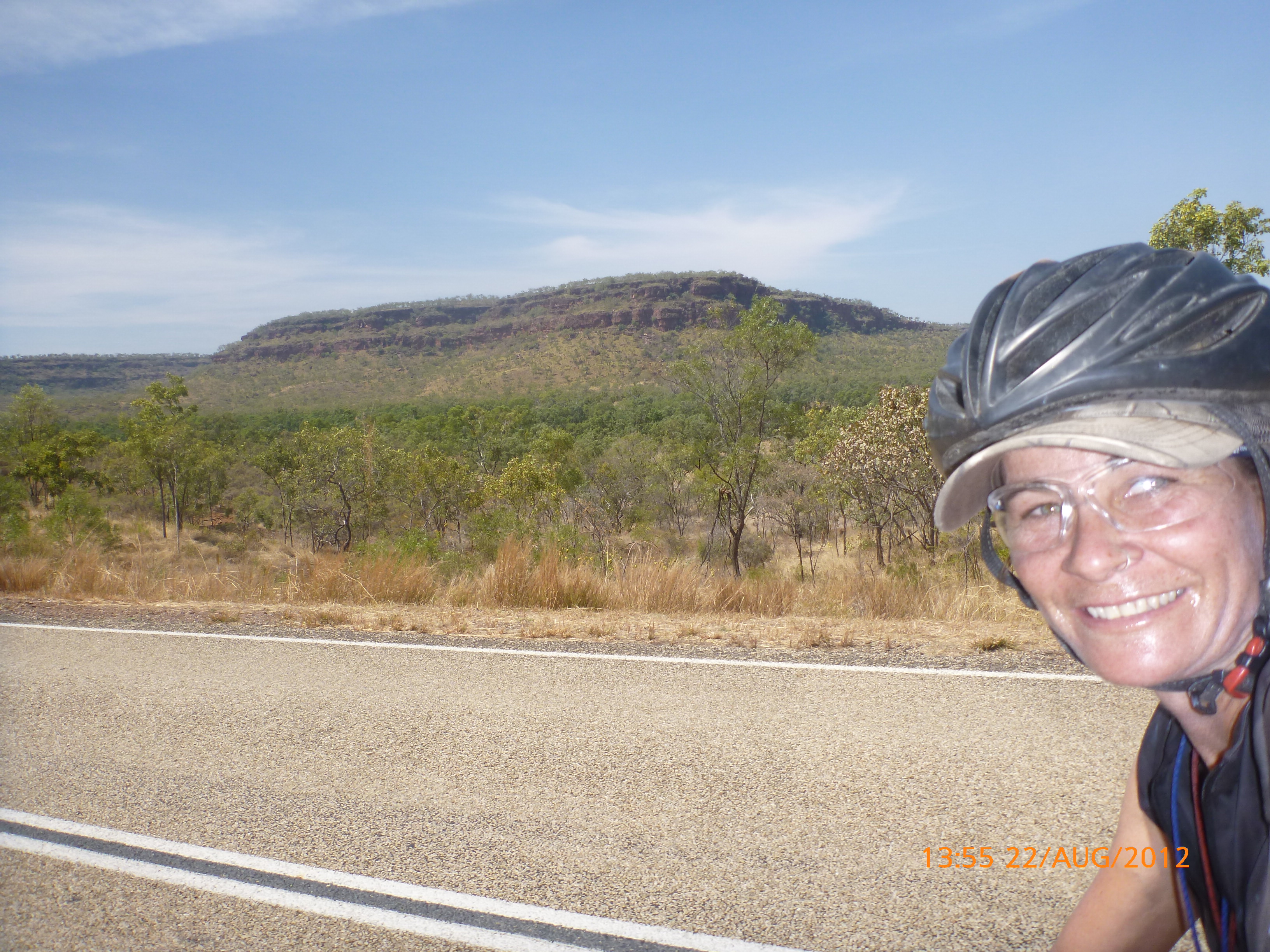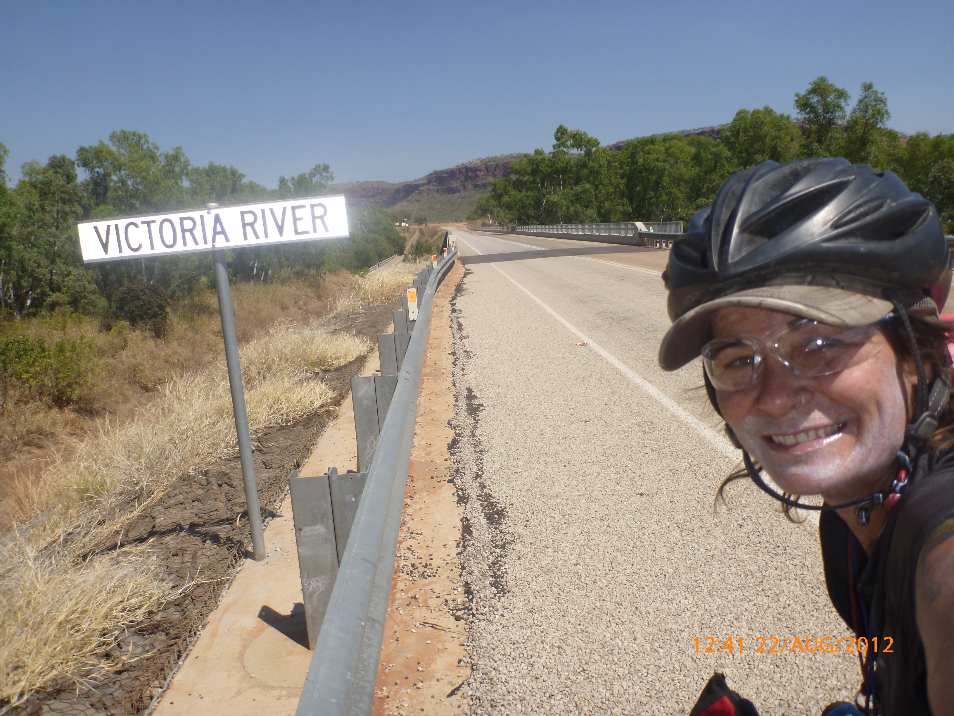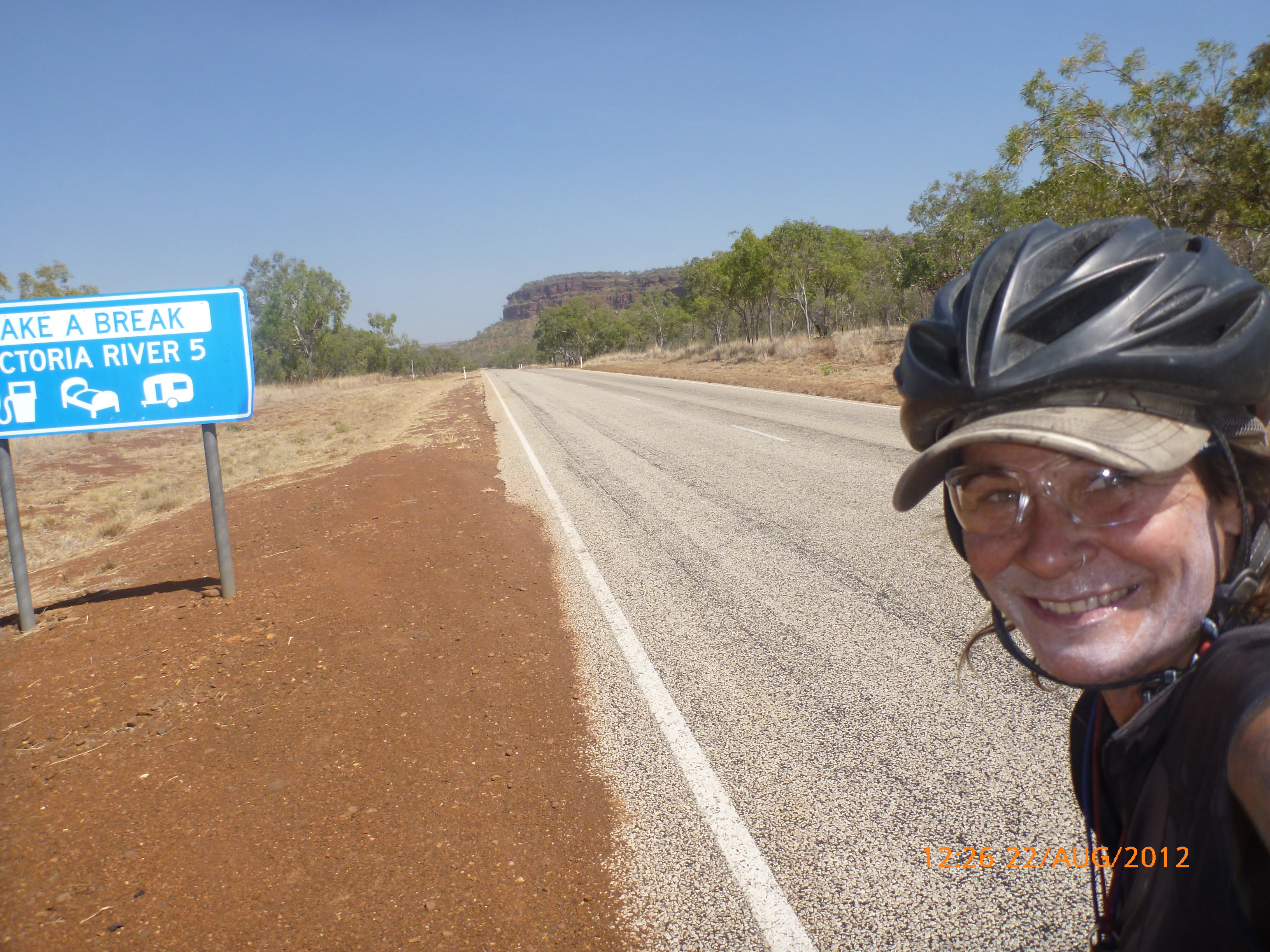 Day 47 95 days to go. Distance: today 190km total 3432km. It’s 8pm Wednesday 22/8/12 Timber Creek Campground. I’ve just been looking at the photos from todays ride through the Victoria River Region. Oh my goodness this area is stunning. Now I know I say that allot but really it’s something else. It’s 360 degrees of red rock layered escarpment rising sheer from the roadside and surrounding landscape. The Victoria River is vivid green and meanders throughout the area with the road intermittently crossing it or running alongside. Sprawling between the rock are rolling green hills lush and alive with natives and birdlife. It was 90km from the rest area to the Victoria River roadhouse which marks the entrance to the region. Most of the 90km was creepy slow inclines but the impact of entering the region made every hard earnt peddle so well worth it. We started at 7am this morning giving us time to reach the roadhouse by lunch and have a break. I met ‘Daniel’ the truckie who came up and said ‘hi I’m one of the truckies you waved to today.’ He was a cool friendly guy based in Newcastle and spends 6 weeks on the road with 12 days off in between. He mostly transports between Newcastle and Broome and thinks he has the best job ever as he’s paid big bucks to see such a beautiful country. I couldn’t agree with him more. He was a real enigma and quite poetic about the scents and sights of the land. He loves this time of year with the wild flowers and his favorite is the yellow one that’s been blooming by the roadside since Pine Creek. We’re travelling a similar route over the next weeks so he promised to stop if his schedule allows and make me a roadside coffee to continue our chats. Nice lad!!!! He also donated $10 and hopes one day to cycle around Australia so he was full of questions about how we’ve set up out kit etc. I really like the truckie culture and the many lads I have met all have their individual story but share a real down-to-earthness which is warm and sincere and just under that tough exterior. Except for Daniel he was totally comfy expressing himself emotionally and was a stand out unique lad amongst lads.