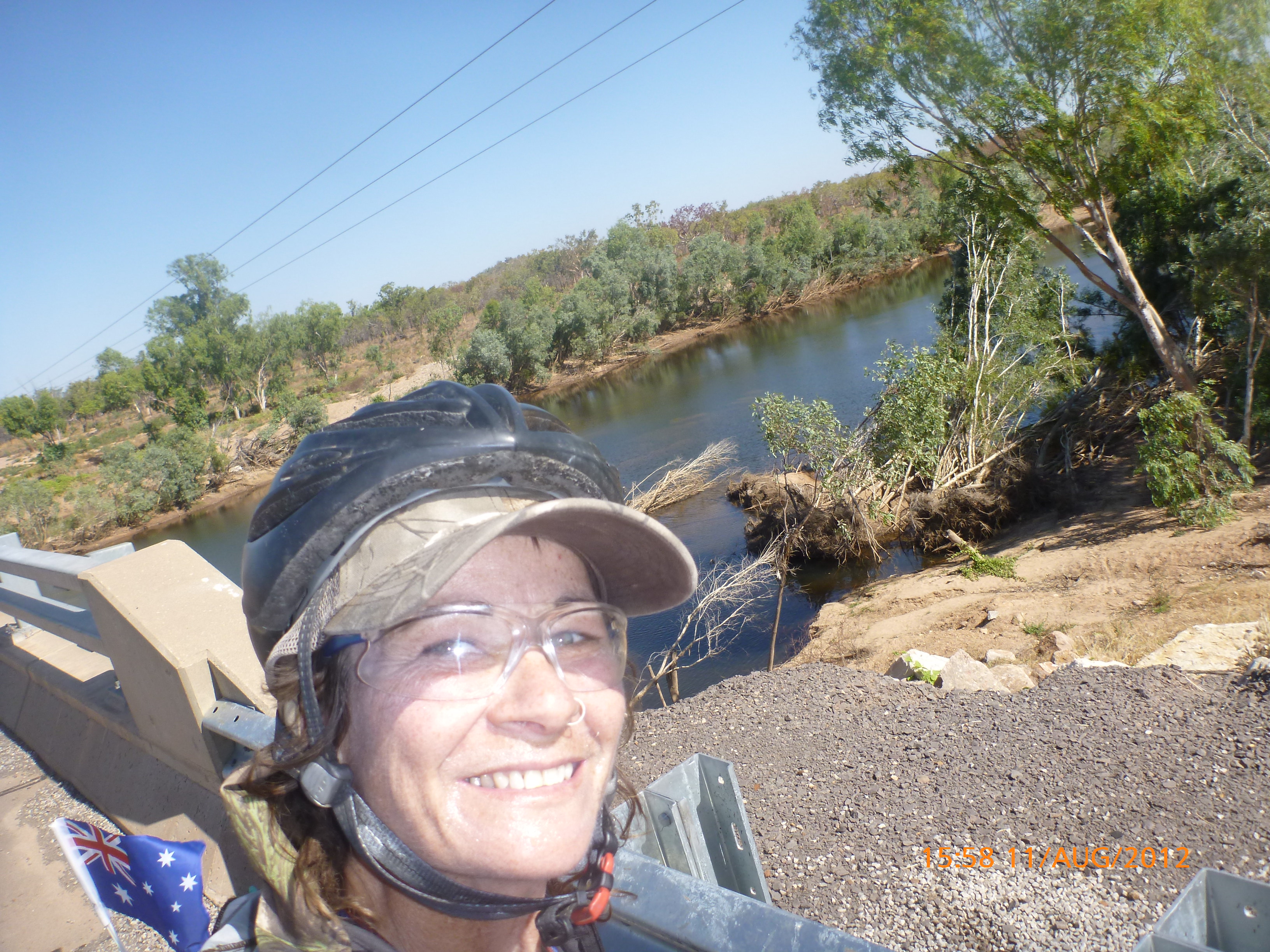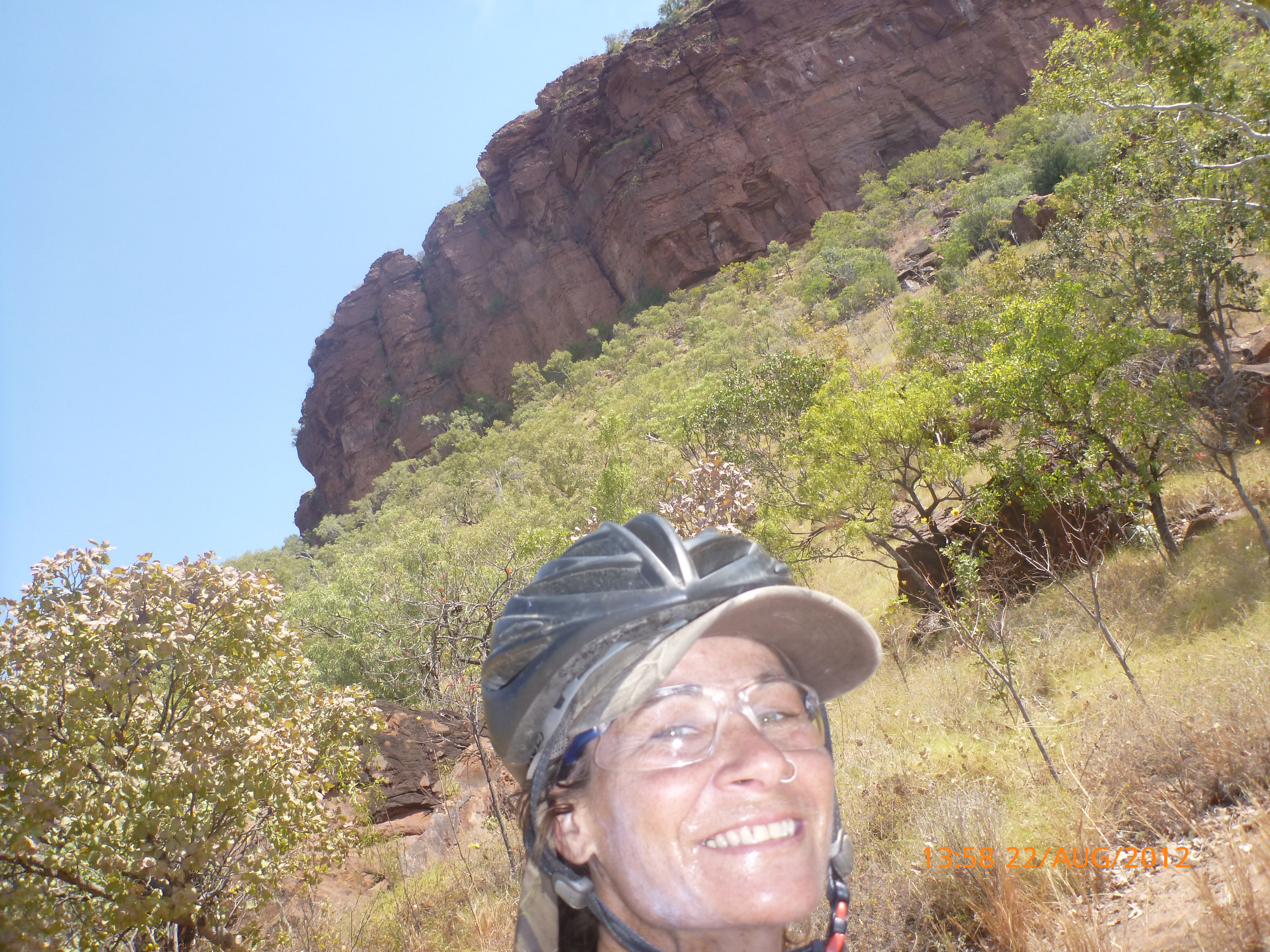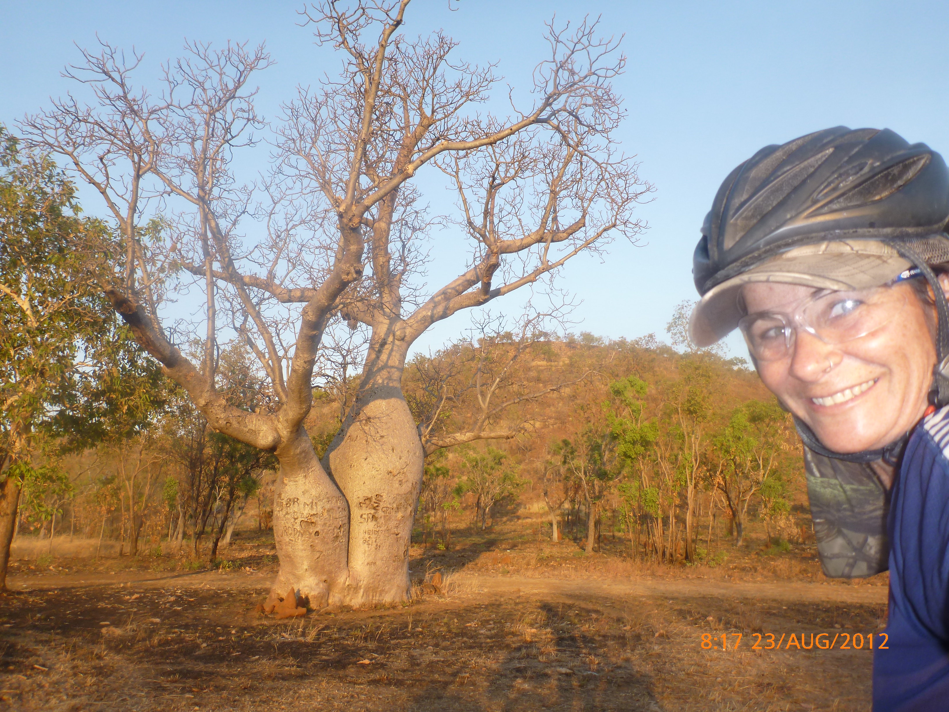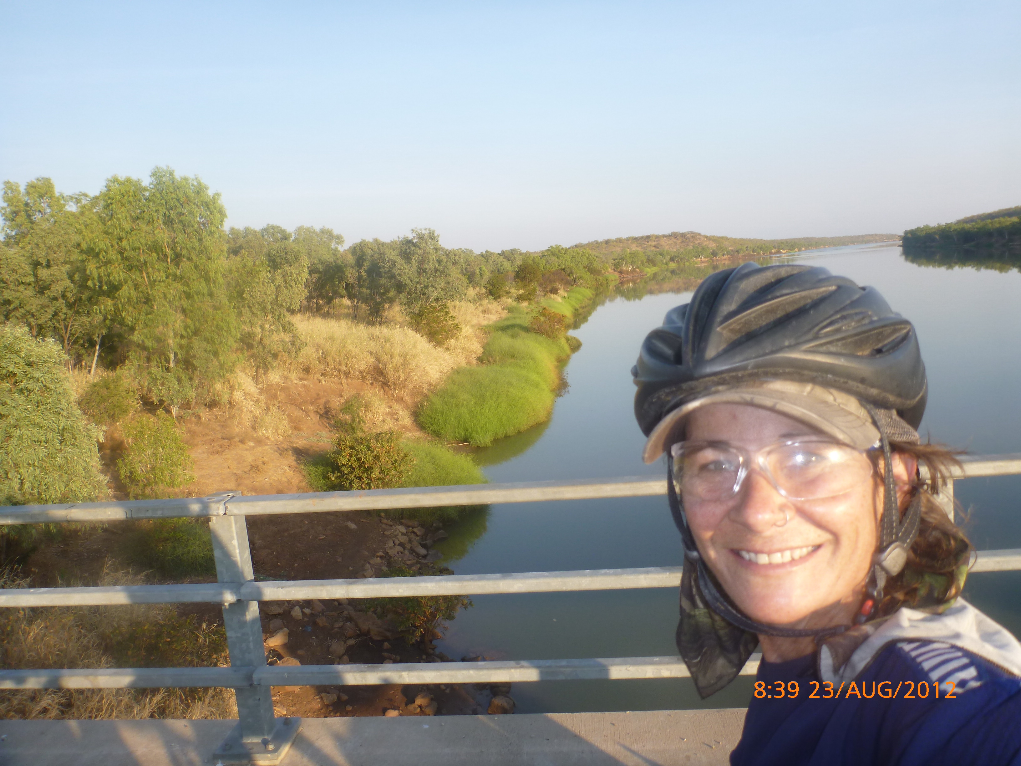 Day 47 95 days to go. Distance: today 190km total 3432km. It’s 8pm Wednesday 22/8/12 Timber Creek Campground. I’ve just been looking at the photos from todays ride through the Victoria River Region. Oh my goodness this area is stunning. Now I know I say that allot but really it’s something else. It’s 360 degrees of red rock layered escarpment rising sheer from the roadside and surrounding landscape. The Victoria River is vivid green and meanders throughout the area with the road intermittently crossing it or running alongside. Sprawling between the rock are rolling green hills lush and alive with natives and birdlife. It was 90km from the rest area to the Victoria River roadhouse which marks the entrance to the region. Most of the 90km was creepy slow inclines but the impact of entering the region made every hard earnt peddle so well worth it. We started at 7am this morning giving us time to reach the roadhouse by lunch and have a break. I met ‘Daniel’ the truckie who came up and said ‘hi I’m one of the truckies you waved to today.’ He was a cool friendly guy based in Newcastle and spends 6 weeks on the road with 12 days off in between. He mostly transports between Newcastle and Broome and thinks he has the best job ever as he’s paid big bucks to see such a beautiful country. I couldn’t agree with him more. He was a real enigma and quite poetic about the scents and sights of the land. He loves this time of year with the wild flowers and his favorite is the yellow one that’s been blooming by the roadside since Pine Creek. We’re travelling a similar route over the next weeks so he promised to stop if his schedule allows and make me a roadside coffee to continue our chats. Nice lad!!!! He also donated $10 and hopes one day to cycle around Australia so he was full of questions about how we’ve set up out kit etc. I really like the truckie culture and the many lads I have met all have their individual story but share a real down-to-earthness which is warm and sincere and just under that tough exterior. Except for Daniel he was totally comfy expressing himself emotionally and was a stand out unique lad amongst lads.