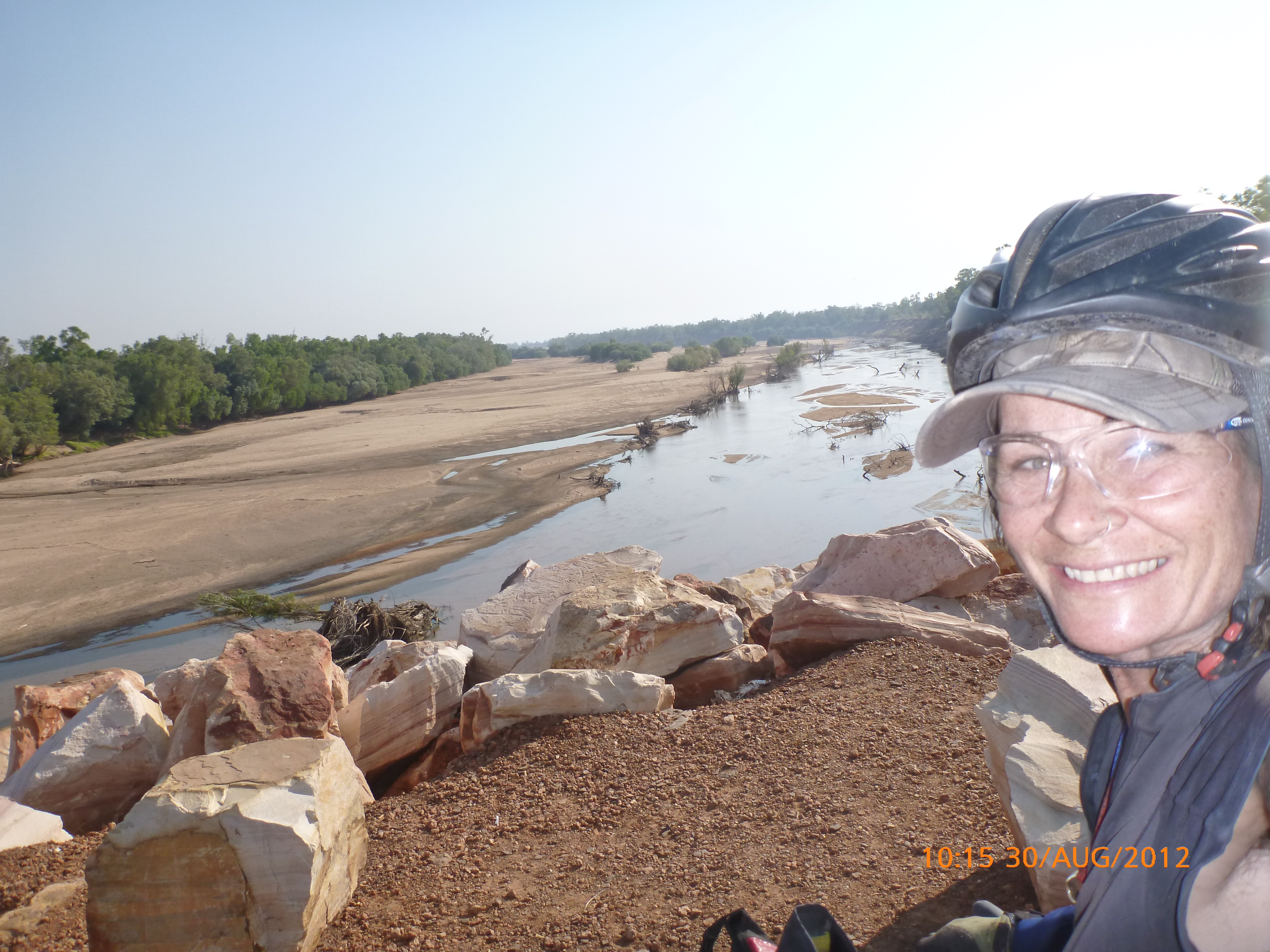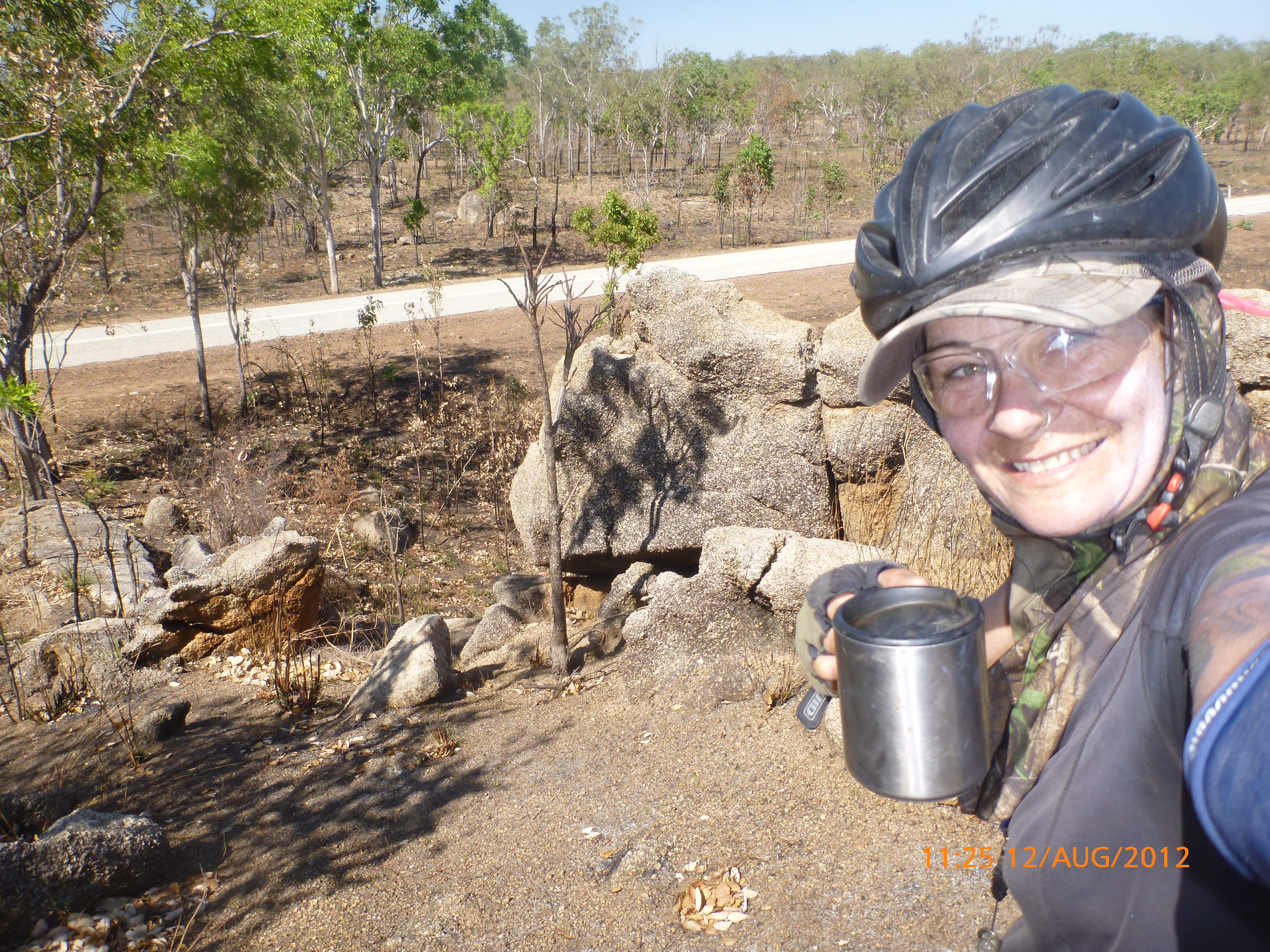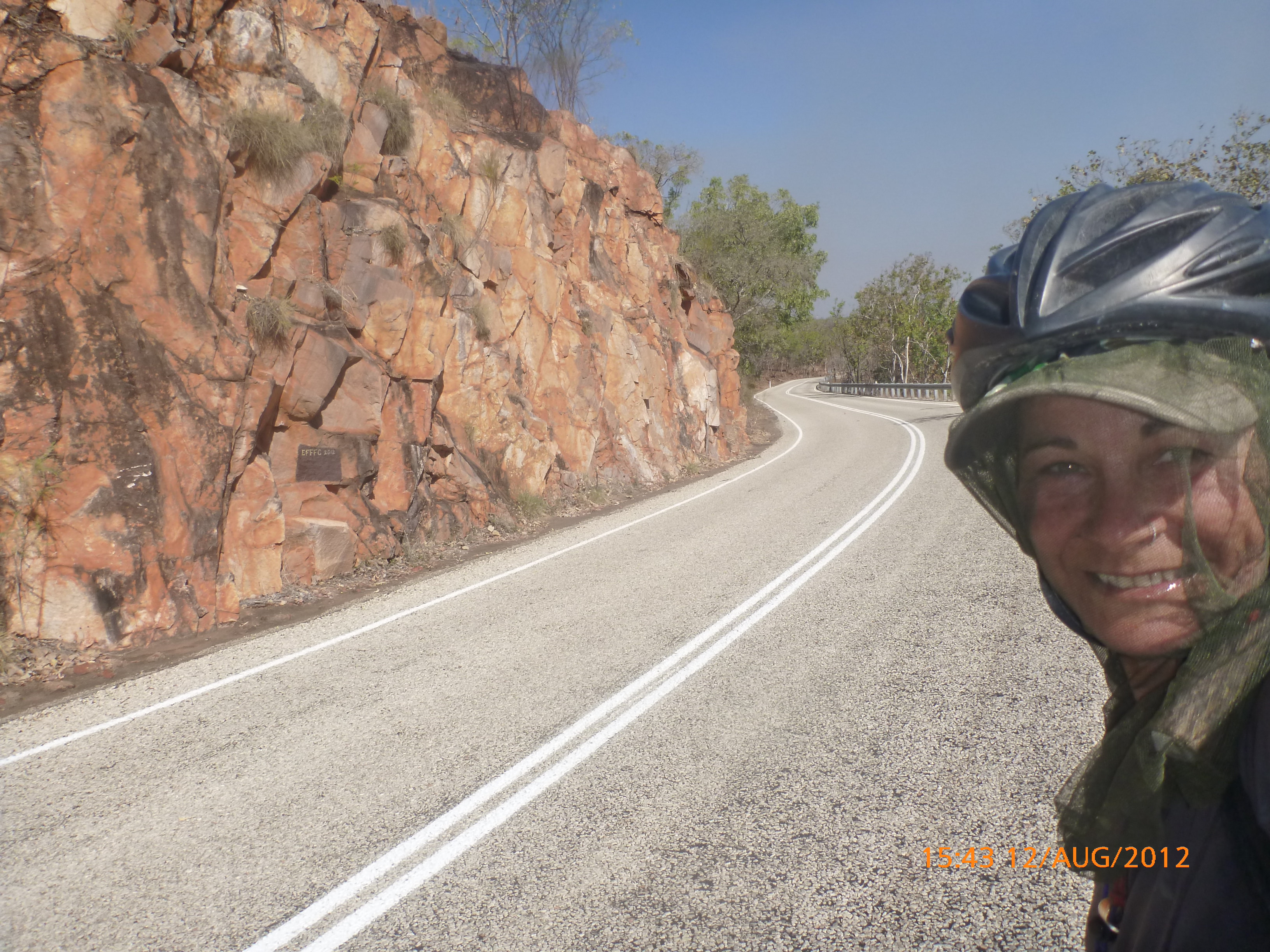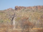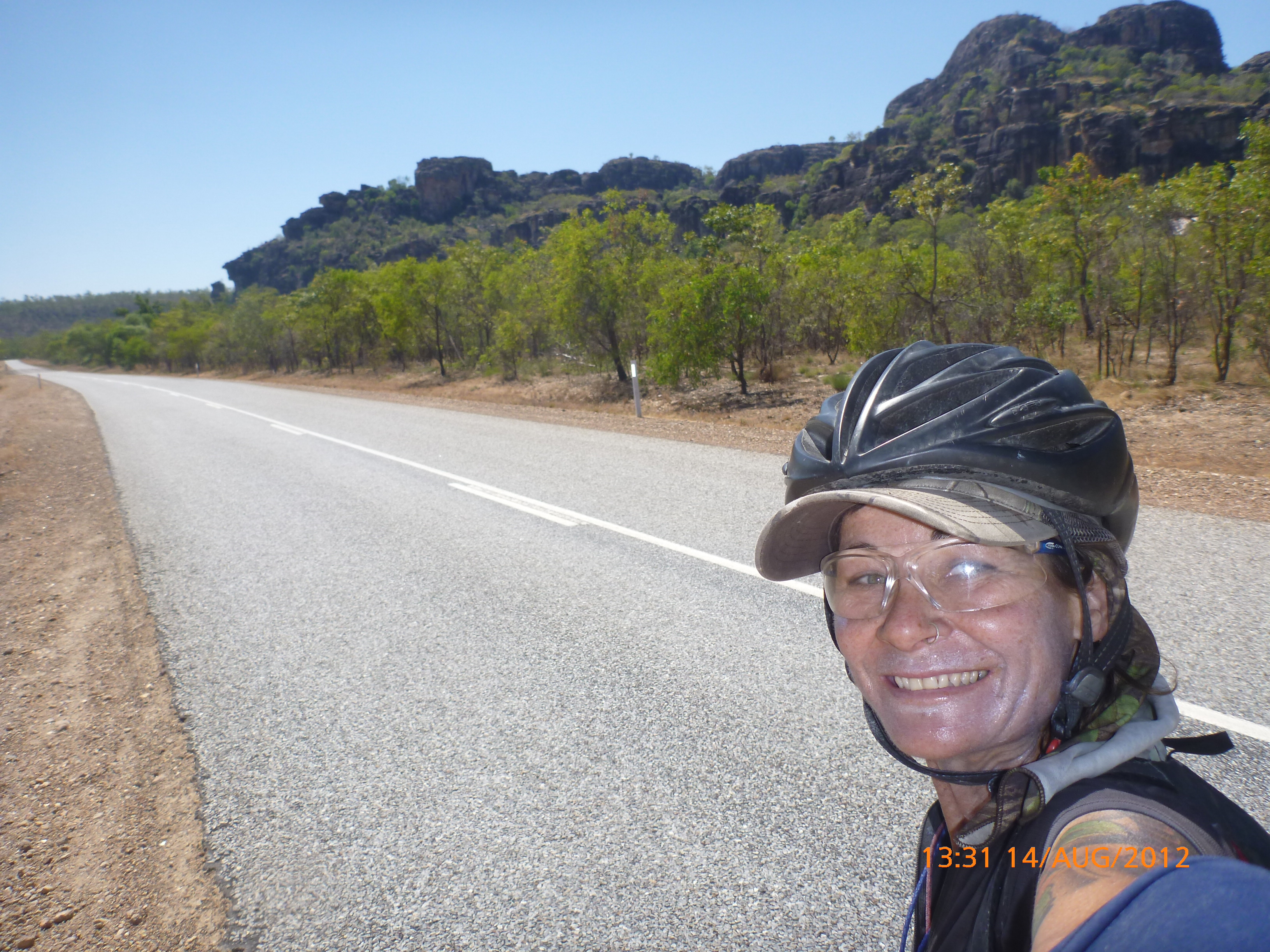 Day 47 95 days to go. Distance: today 190km total 3432km. It’s 8pm Wednesday 22/8/12 Timber Creek Campground. I’ve just been looking at the photos from todays ride through the Victoria River Region. Oh my goodness this area is stunning. Now I know I say that allot but really it’s something else. It’s 360 degrees of red rock layered escarpment rising sheer from the roadside and surrounding landscape. The Victoria River is vivid green and meanders throughout the area with the road intermittently crossing it or running alongside. Sprawling between the rock are rolling green hills lush and alive with natives and birdlife. It was 90km from the rest area to the Victoria River roadhouse which marks the entrance to the region. Most of the 90km was creepy slow inclines but the impact of entering the region made every hard earnt peddle so well worth it. We started at 7am this morning giving us time to reach the roadhouse by lunch and have a break. I met ‘Daniel’ the truckie who came up and said ‘hi I’m one of the truckies you waved to today.’ He was a cool friendly guy based in Newcastle and spends 6 weeks on the road with 12 days off in between. He mostly transports between Newcastle and Broome and thinks he has the best job ever as he’s paid big bucks to see such a beautiful country. I couldn’t agree with him more. He was a real enigma and quite poetic about the scents and sights of the land. He loves this time of year with the wild flowers and his favorite is the yellow one that’s been blooming by the roadside since Pine Creek. We’re travelling a similar route over the next weeks so he promised to stop if his schedule allows and make me a roadside coffee to continue our chats. Nice lad!!!! He also donated $10 and hopes one day to cycle around Australia so he was full of questions about how we’ve set up out kit etc. I really like the truckie culture and the many lads I have met all have their individual story but share a real down-to-earthness which is warm and sincere and just under that tough exterior. Except for Daniel he was totally comfy expressing himself emotionally and was a stand out unique lad amongst lads.