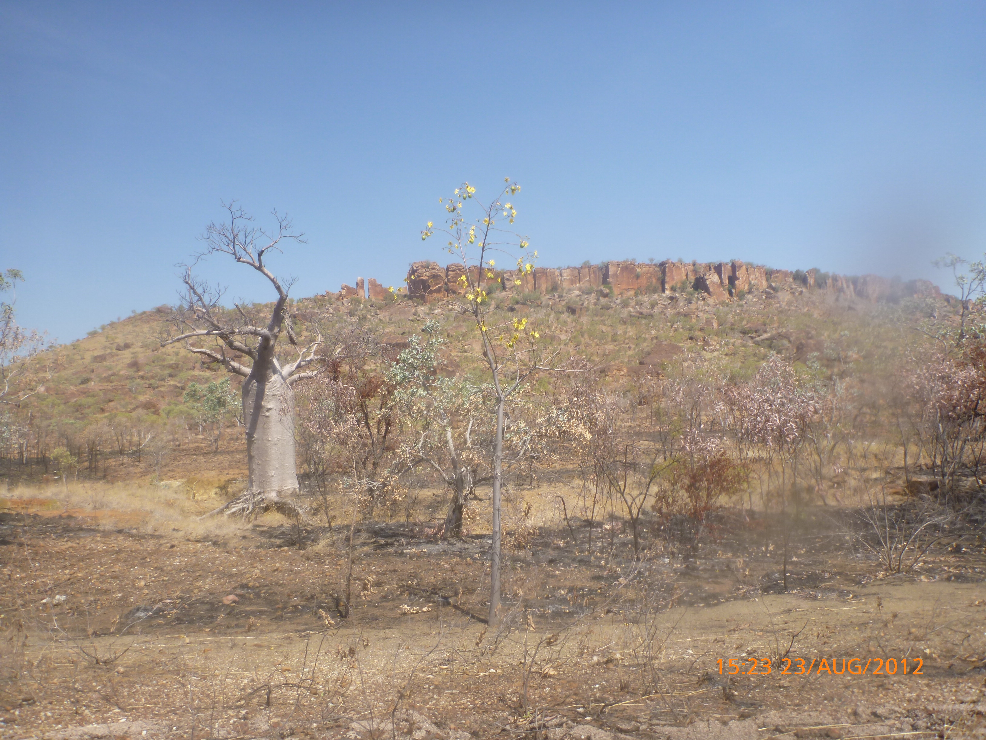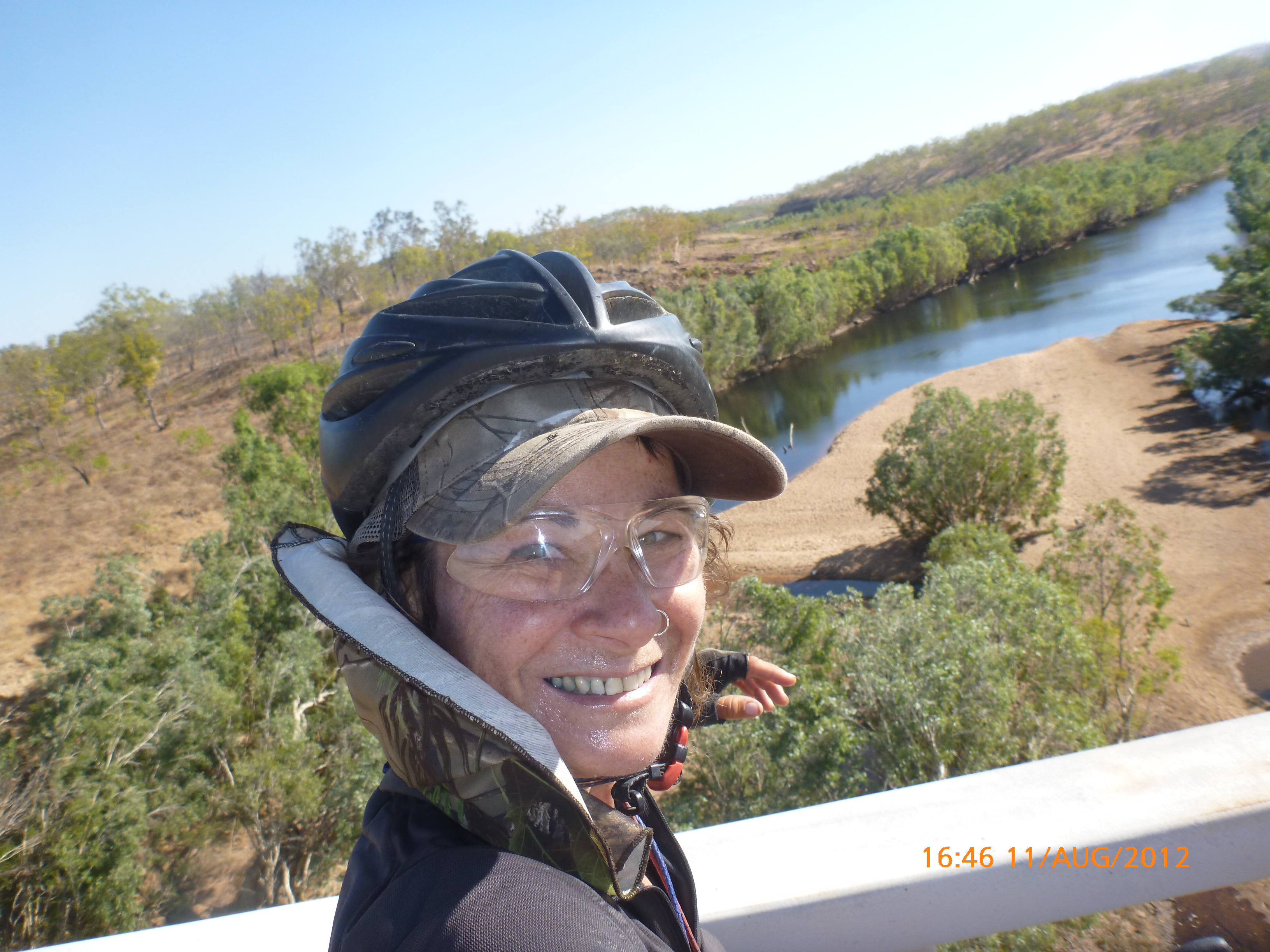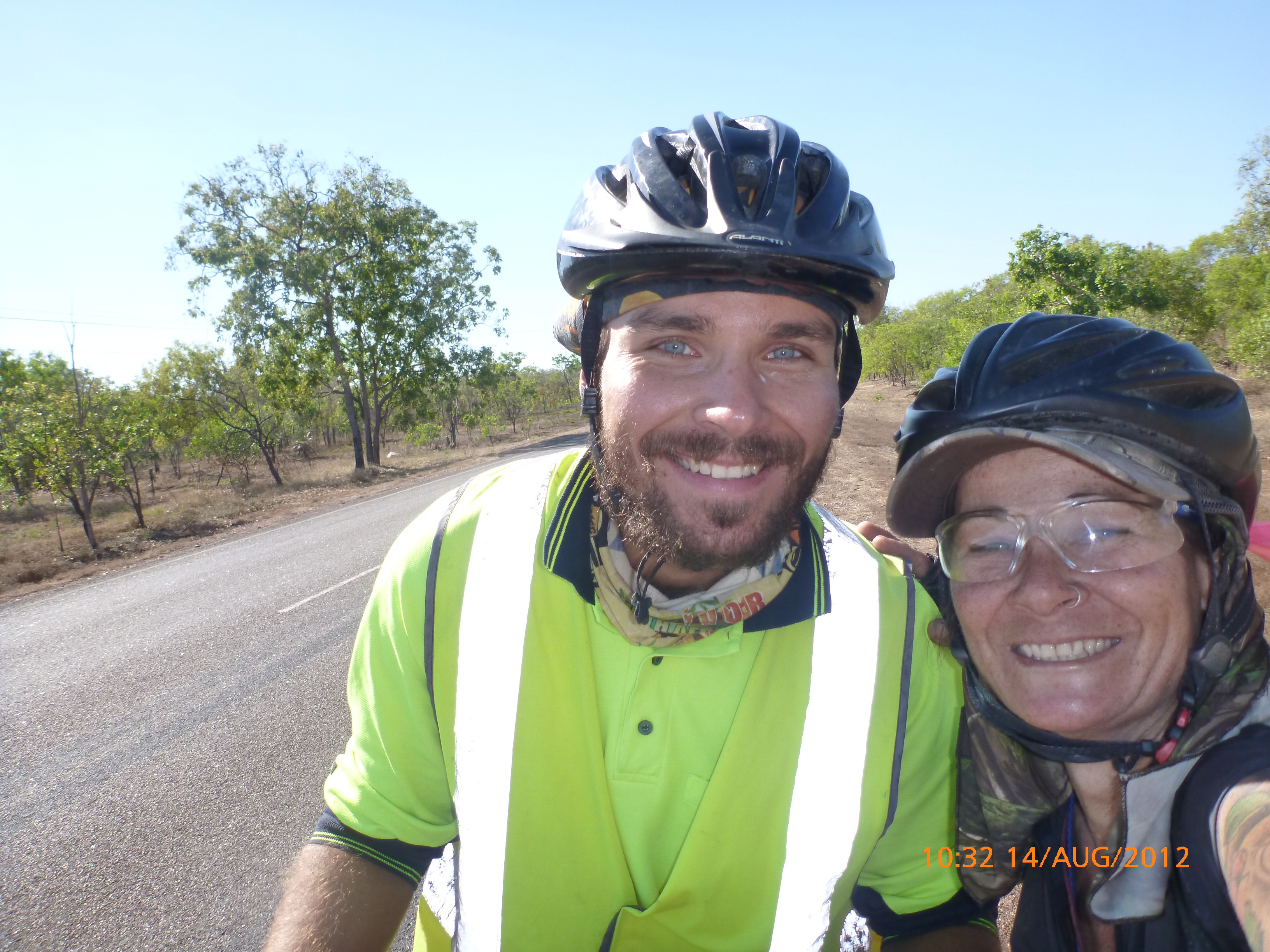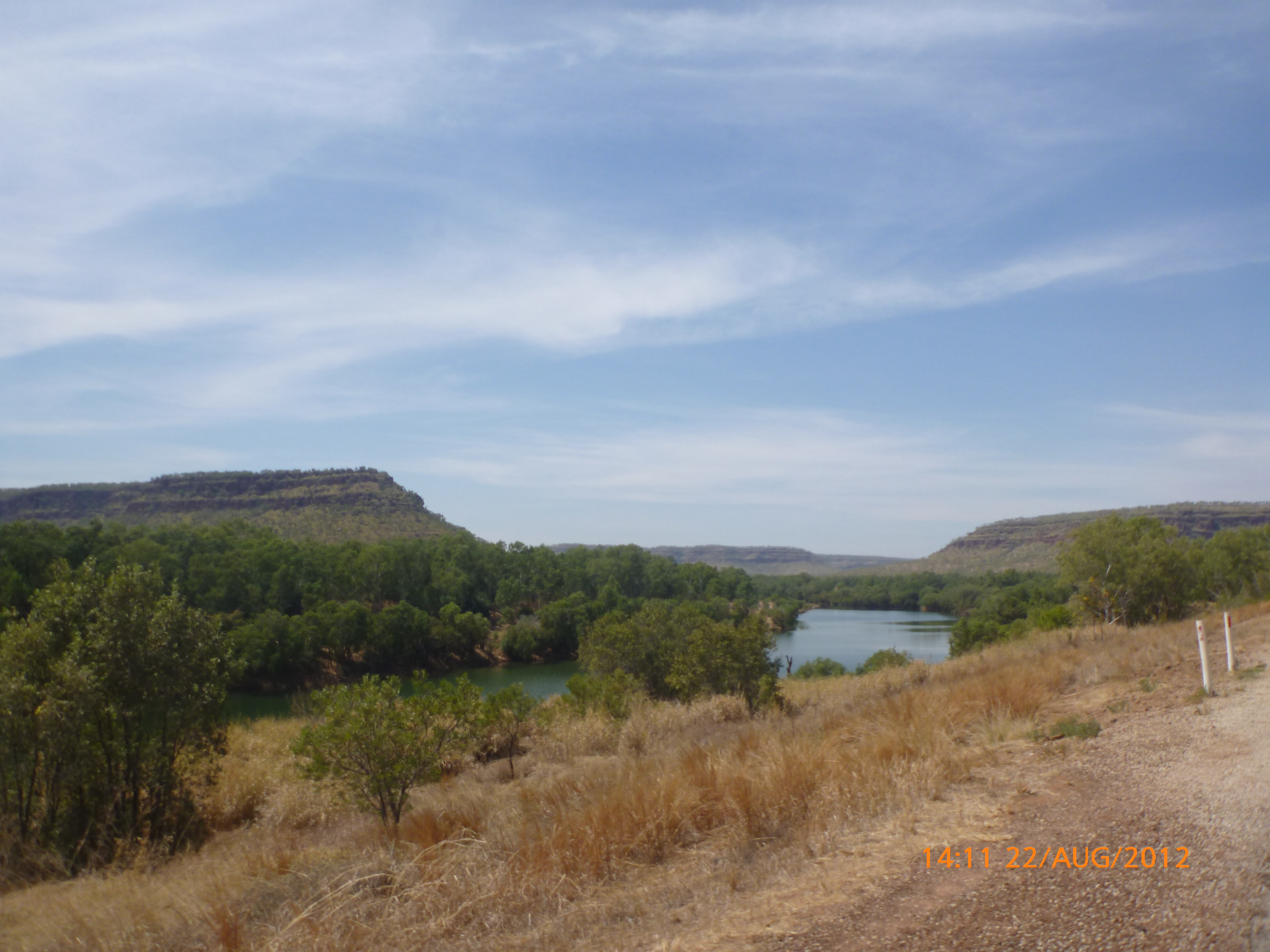 Day 47 95 days to go. Distance: today 190km total 3432km. It’s 8pm Wednesday 22/8/12 Timber Creek Campground. I’ve just been looking at the photos from todays ride through the Victoria River Region. Oh my goodness this area is stunning. Now I know I say that allot but really it’s something else. It’s 360 degrees of red rock layered escarpment rising sheer from the roadside and surrounding landscape. The Victoria River is vivid green and meanders throughout the area with the road intermittently crossing it or running alongside. Sprawling between the rock are rolling green hills lush and alive with natives and birdlife. It was 90km from the rest area to the Victoria River roadhouse which marks the entrance to the region. Most of the 90km was creepy slow inclines but the impact of entering the region made every hard earnt peddle so well worth it. We started at 7am this morning giving us time to reach the roadhouse by lunch and have a break. I met ‘Daniel’ the truckie who came up and said ‘hi I’m one of the truckies you waved to today.’ He was a cool friendly guy based in Newcastle and spends 6 weeks on the road with 12 days off in between. He mostly transports between Newcastle and Broome and thinks he has the best job ever as he’s paid big bucks to see such a beautiful country. I couldn’t agree with him more. He was a real enigma and quite poetic about the scents and sights of the land. He loves this time of year with the wild flowers and his favorite is the yellow one that’s been blooming by the roadside since Pine Creek. We’re travelling a similar route over the next weeks so he promised to stop if his schedule allows and make me a roadside coffee to continue our chats. Nice lad!!!! He also donated $10 and hopes one day to cycle around Australia so he was full of questions about how we’ve set up out kit etc. I really like the truckie culture and the many lads I have met all have their individual story but share a real down-to-earthness which is warm and sincere and just under that tough exterior. Except for Daniel he was totally comfy expressing himself emotionally and was a stand out unique lad amongst lads.