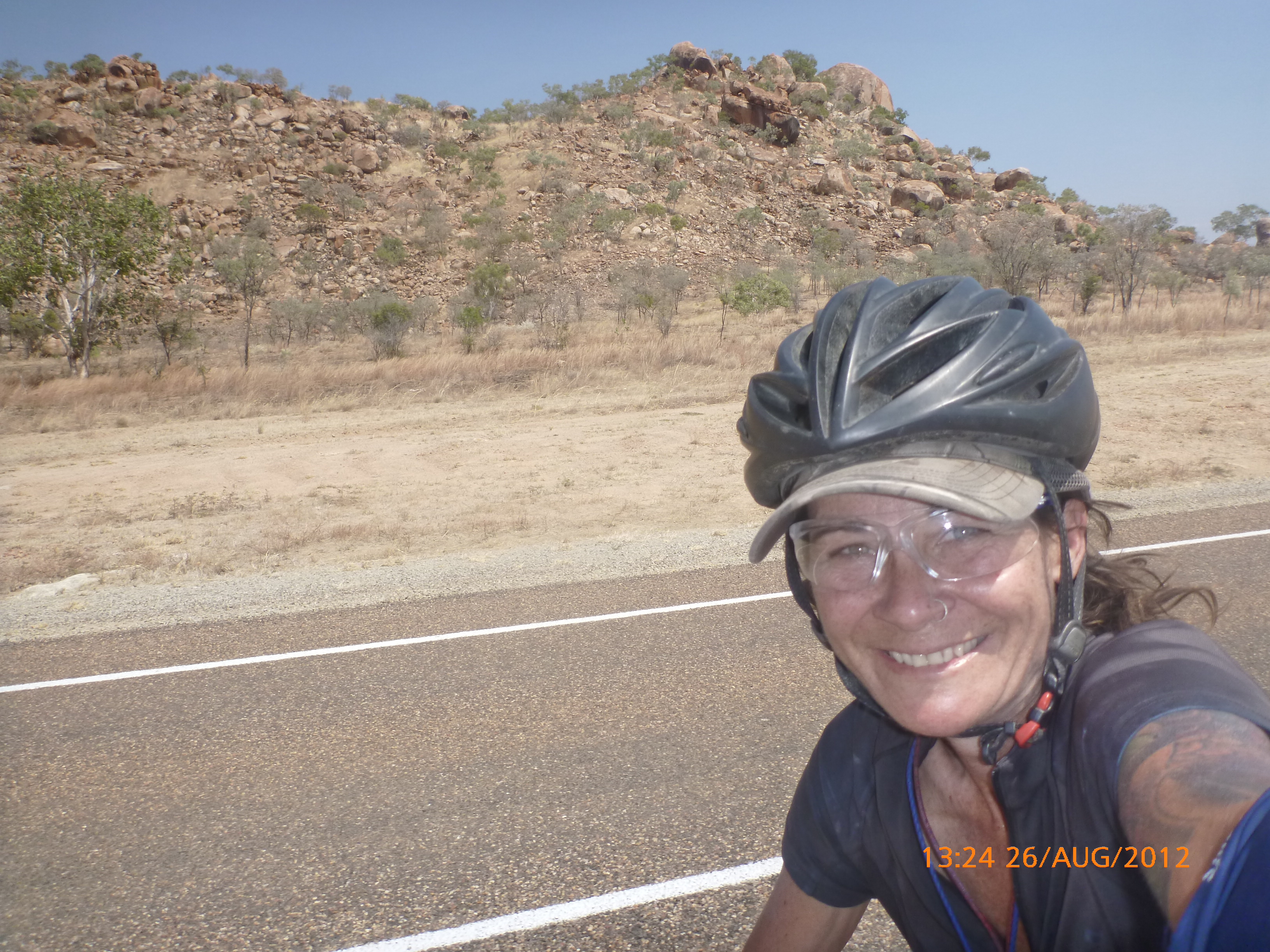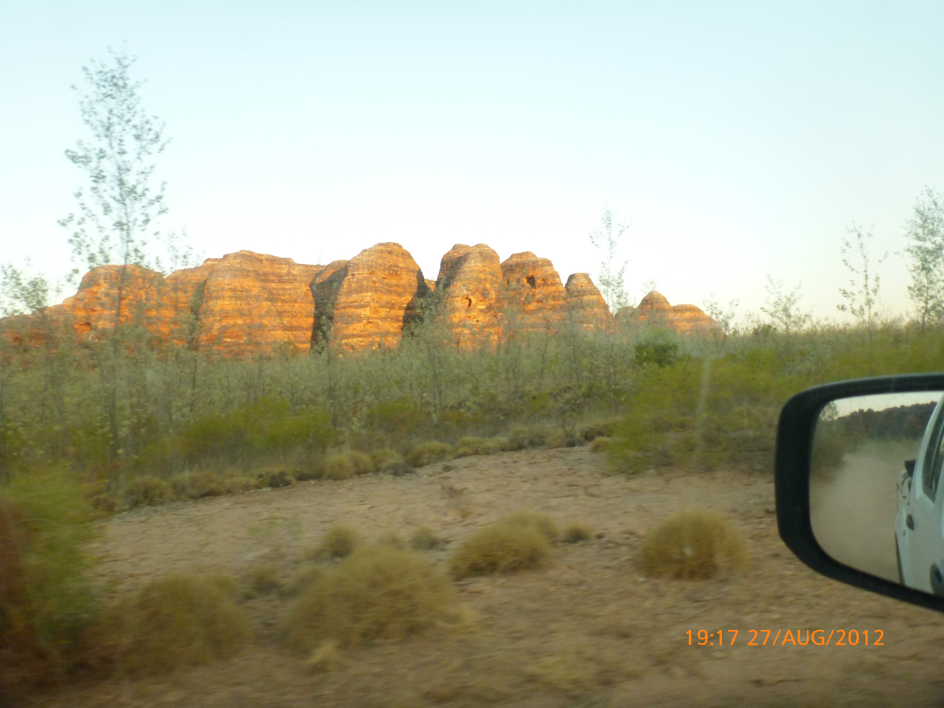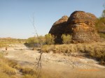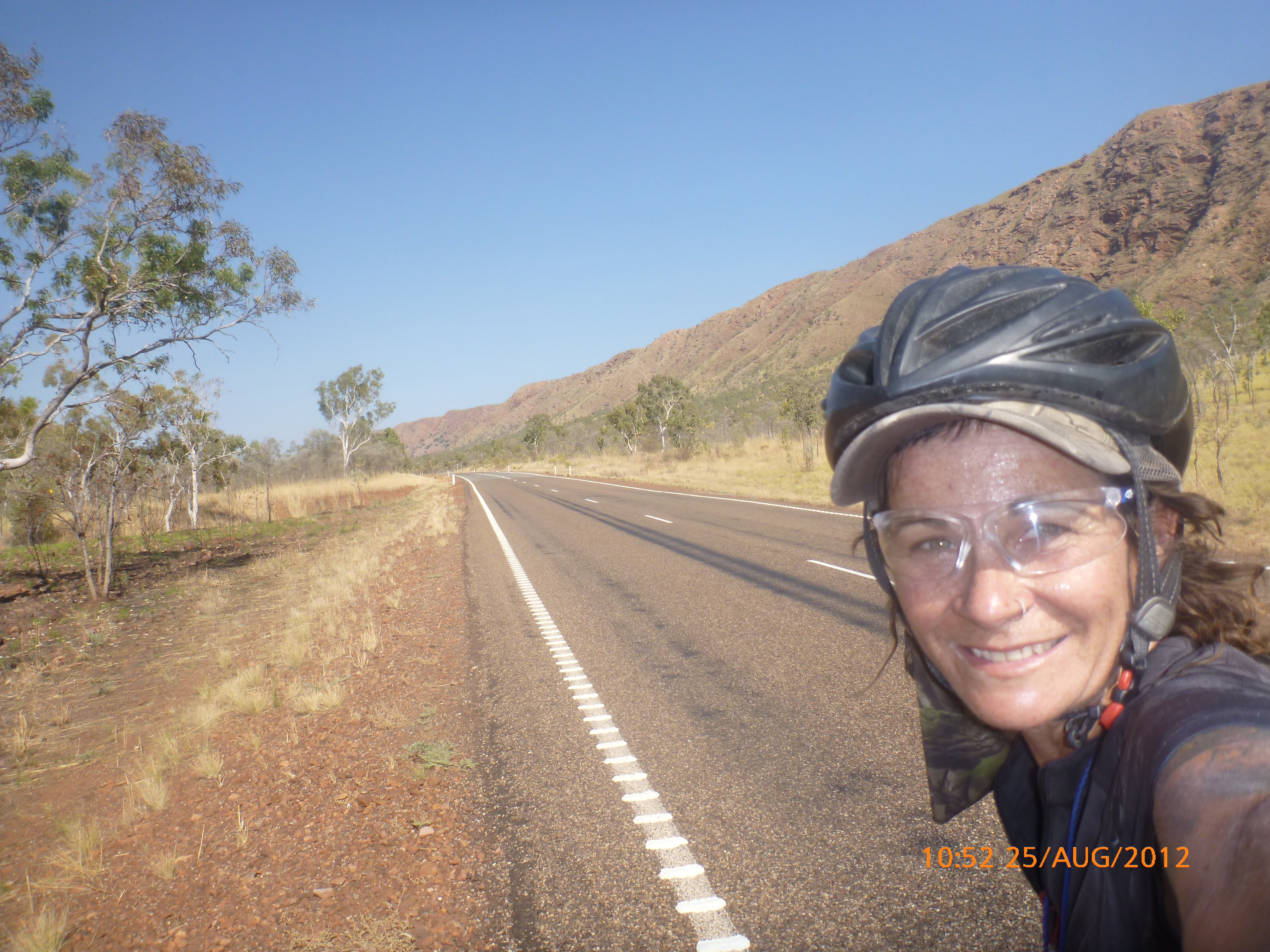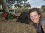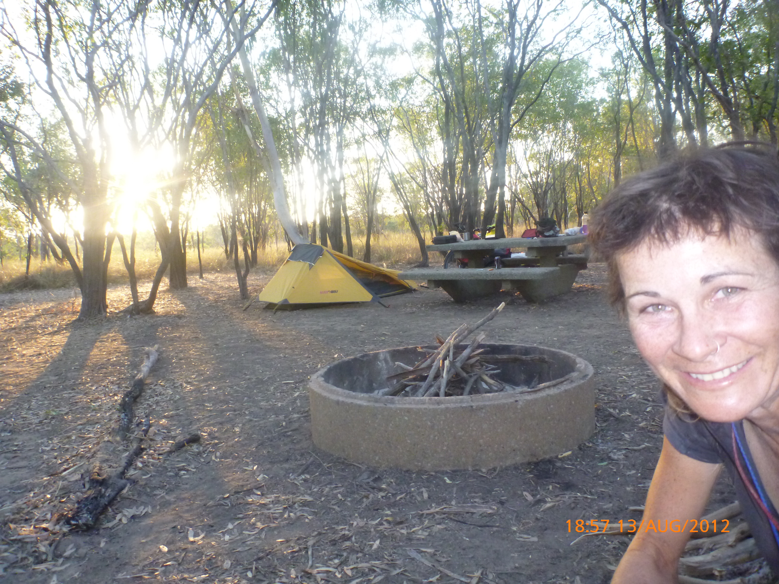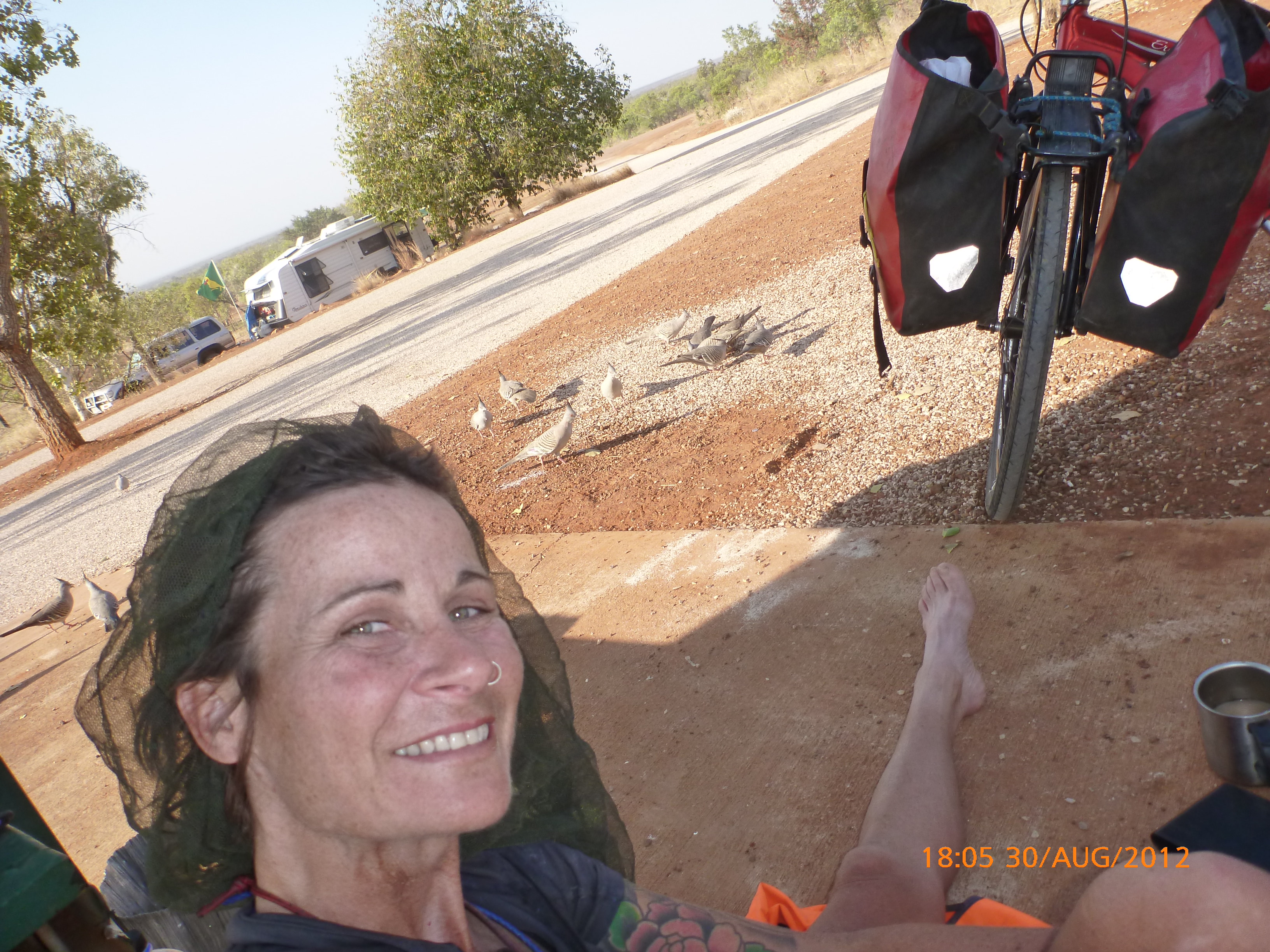 Day 54 88 days to go. Distances: Sun 26/8 Wamun (Turkey Creek) 96km, Mon 27/8 Purnululu NP, Bungle Bungle Range 0km, Tue 28/8 Mary Pool RA 116km, Wed 29/8 Fitzroy Crossing 187km, today 94km total 3990km. It’s 4pm Thursday 30/8/12 Ellandale RA. I’m currently sharing my peanut paste sammy with a whole bunch of top-knot pigeons that are clearly very wild and shy. I arrived about 2ish and only just now feel some personality coming back to my brain. This is in noway a winge as the weather is sensational but it’s between 38-42 degrees and I’m still sorting how best to balance the kms and heat stress. I pulled up today well and truly brain fried and the body stepped in saying ‘no more today Maree.’ But it was a late start after a late night and my liberated moment of turning the alarm off at 5am came back to bite me. I didn’t get on the road until 8am about 3 hours later than when I need to be. Today just reminded me of that so good revision lesson. I haven’t had heat stress since starting off in Thailand and it’s a bit icky tricky. What comes to mind is the first days of rain leaving Brisbane and thinking, ‘there be days down the track where you’ll want to be down poured on….yep these are those days I be thinking !!!! 🙂 So from tomorrow until we hit a change in weather it’ll be 4am up and 5am starts. It seems the more difficult the conditions the more kind folk become…isn’t that an awesome thing!! At the rest area was a hippy bloke I met at the RA out of Kununarra. He’s from the Blue Mts traveling for 3months with his border collie but heading home now cause he’s homesick and misses his Mum. He’s untidy around the edges but a big sweet kid and topped up all my water bottles before heading. Then George who’s from Caboolture and traveling with his wife and another couple, came over and said, ‘when you’re ready come over for a cool drink.’ I beat him back to his van and stayed for an hour enjoying the shady sit and warm company. They have a 17 y/o cockateal called Sparky who’s mummy’s boy and living the dream on the road with mum and dad. They can reach the ripe ol’ age of 30!! His only close encounter has been with a baby cassuarie in Mossman but mum snaveled him first so Sparky’s adventures continue. I then went to set up camp and the lads came over with a tarp to block the afternoon sun. Another german couple cam over with two oranges which I’ve just now devoured and shared with the bush bees. They are just as persistent and sticky as the desert flies so the head net is well and truly on. It cools down slowly now to balmy beautiful evenings and sleeping under the grasshopper fly is so beautiful. It’s full moon on the 1/9 so the stars and moon are currently serenading me nigh nighs. I haven’t managed a post for 5 days with all that’s been happening well into the evenings.