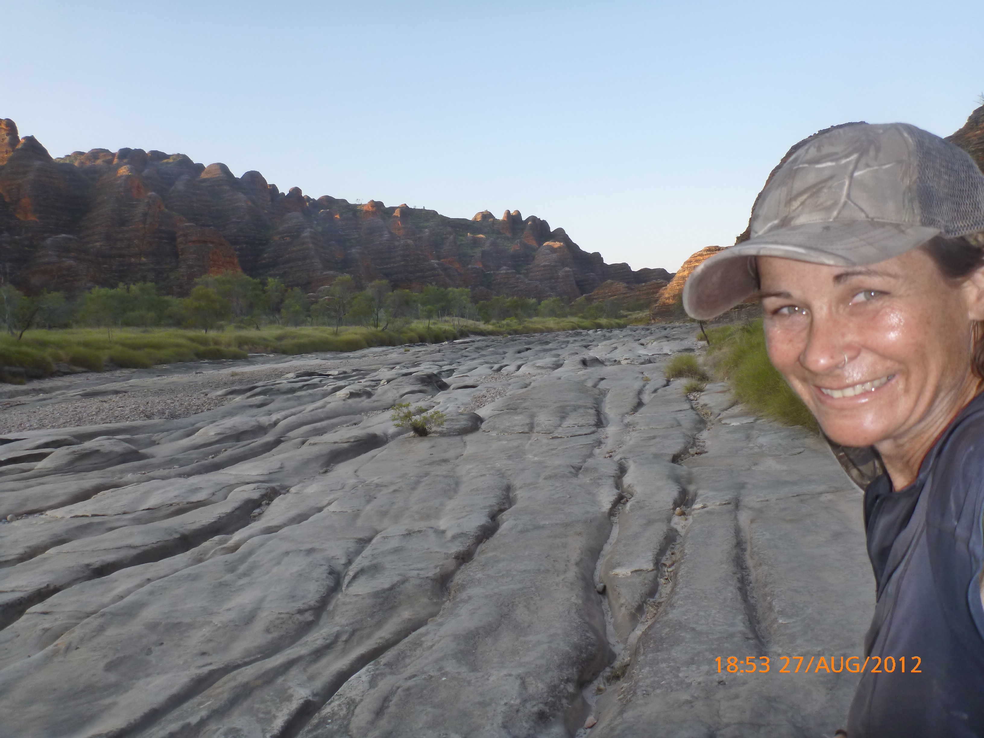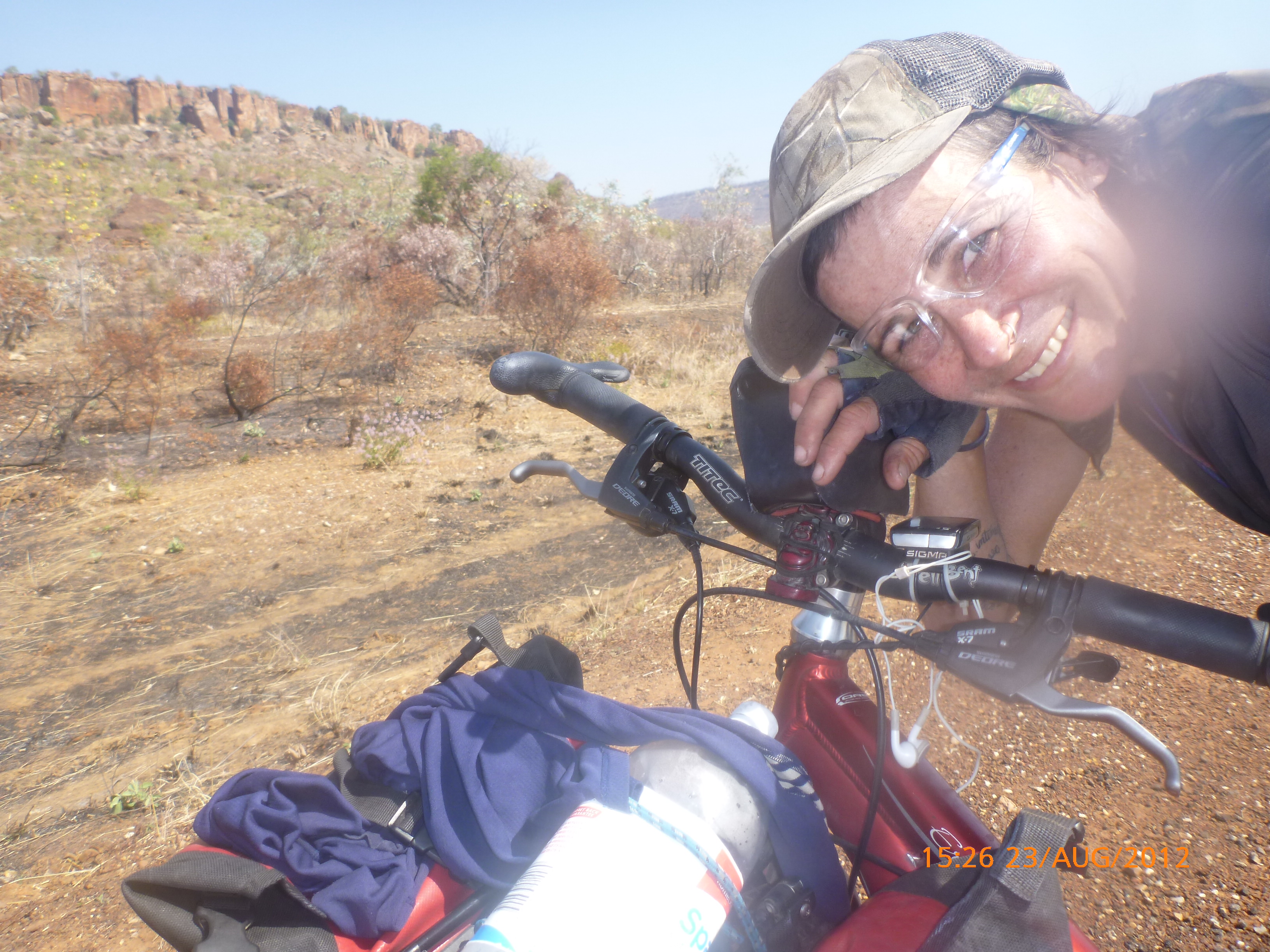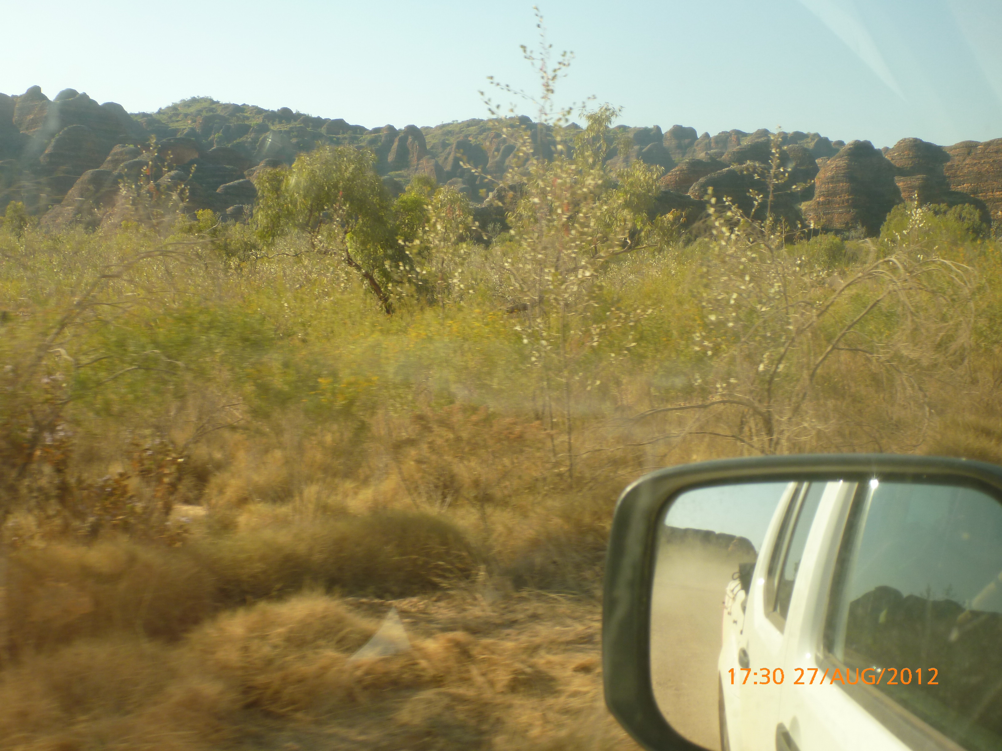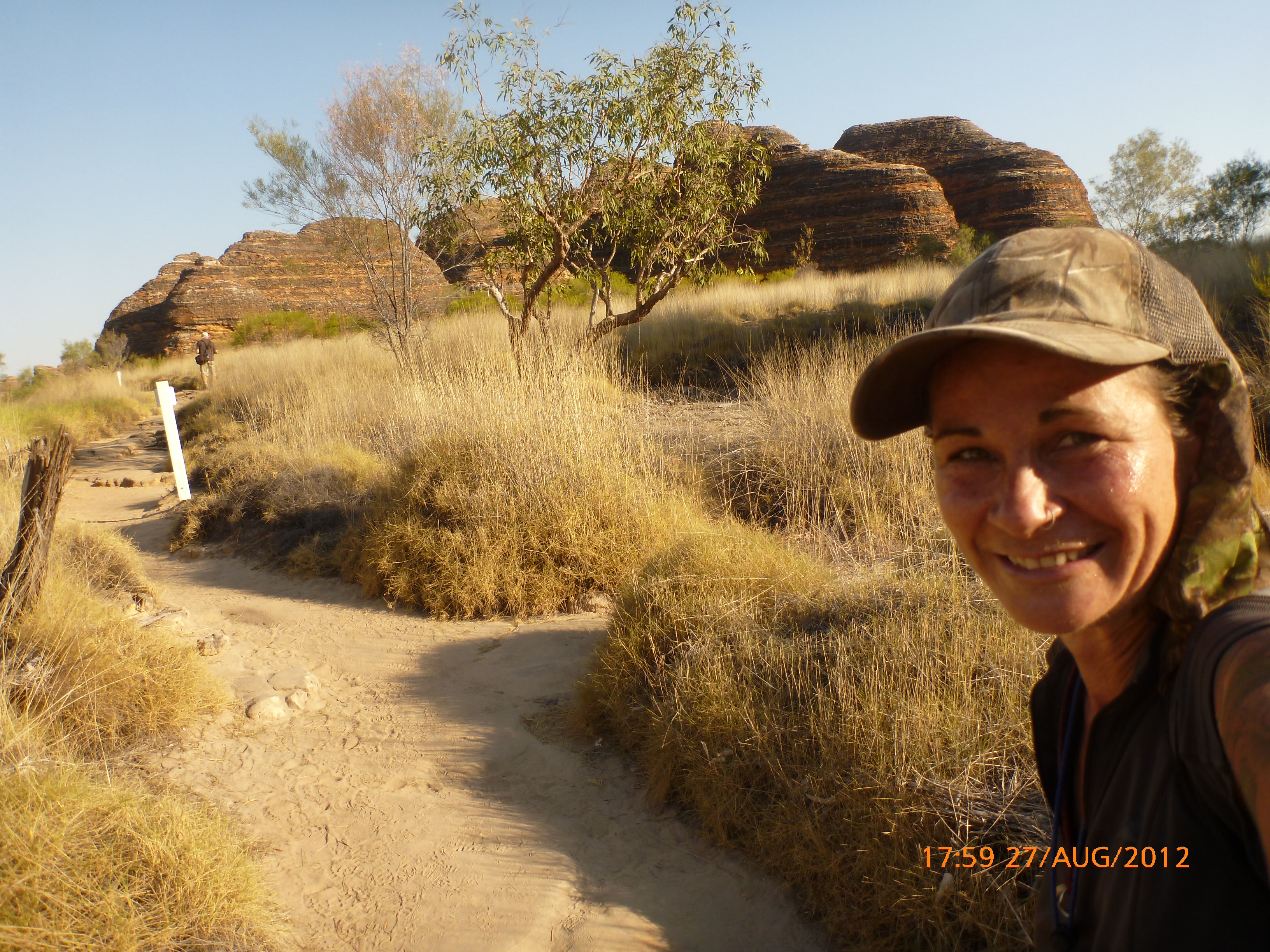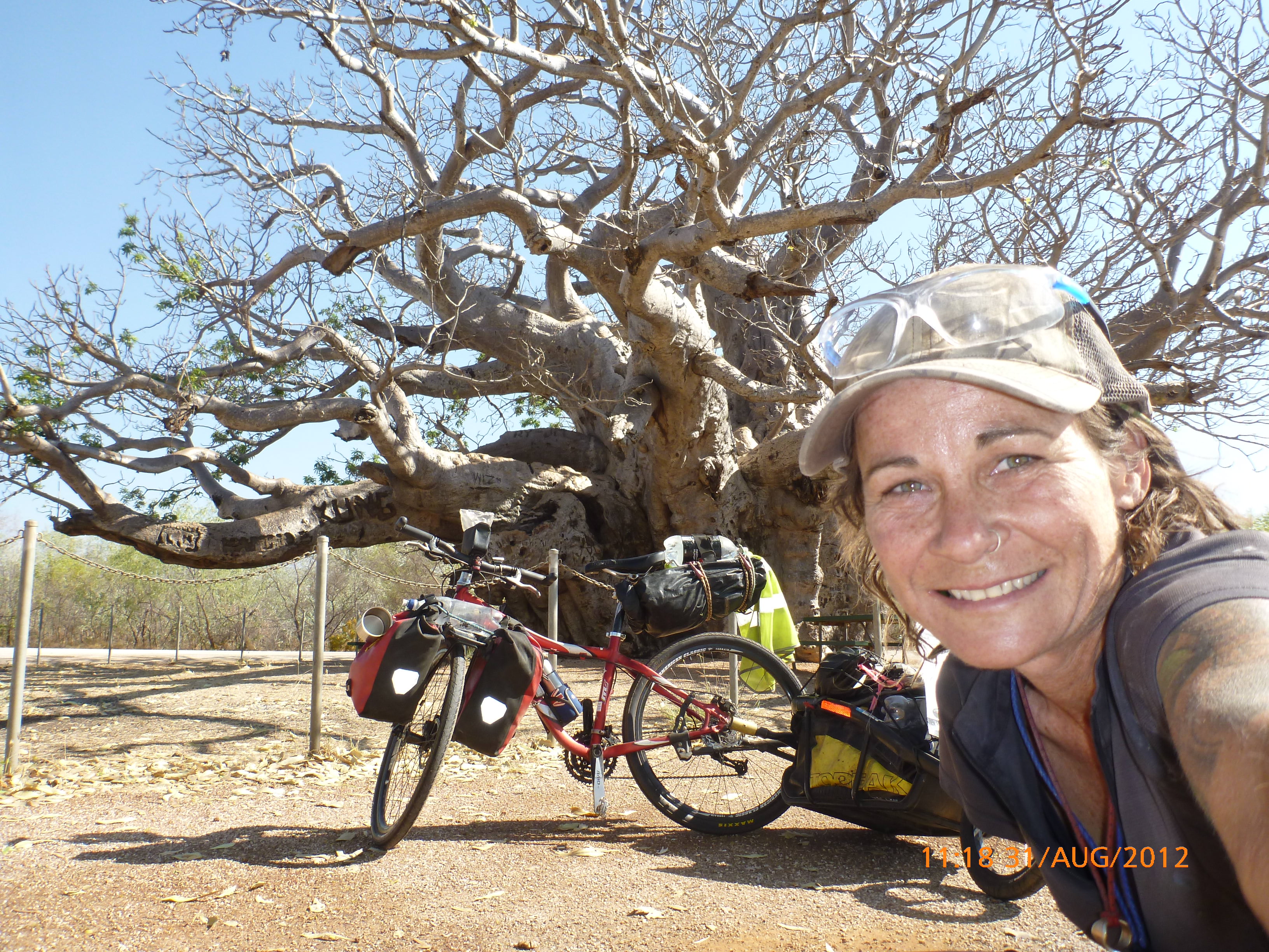 Day 54 88 days to go. Distances: Sun 26/8 Wamun (Turkey Creek) 96km, Mon 27/8 Purnululu NP, Bungle Bungle Range 0km, Tue 28/8 Mary Pool RA 116km, Wed 29/8 Fitzroy Crossing 187km, today 94km total 3990km. It’s 4pm Thursday 30/8/12 Ellandale RA. I’m currently sharing my peanut paste sammy with a whole bunch of top-knot pigeons that are clearly very wild and shy. I arrived about 2ish and only just now feel some personality coming back to my brain. This is in noway a winge as the weather is sensational but it’s between 38-42 degrees and I’m still sorting how best to balance the kms and heat stress. I pulled up today well and truly brain fried and the body stepped in saying ‘no more today Maree.’ But it was a late start after a late night and my liberated moment of turning the alarm off at 5am came back to bite me. I didn’t get on the road until 8am about 3 hours later than when I need to be. Today just reminded me of that so good revision lesson. I haven’t had heat stress since starting off in Thailand and it’s a bit icky tricky. What comes to mind is the first days of rain leaving Brisbane and thinking, ‘there be days down the track where you’ll want to be down poured on….yep these are those days I be thinking !!!! 🙂 So from tomorrow until we hit a change in weather it’ll be 4am up and 5am starts. It seems the more difficult the conditions the more kind folk become…isn’t that an awesome thing!! At the rest area was a hippy bloke I met at the RA out of Kununarra. He’s from the Blue Mts traveling for 3months with his border collie but heading home now cause he’s homesick and misses his Mum. He’s untidy around the edges but a big sweet kid and topped up all my water bottles before heading. Then George who’s from Caboolture and traveling with his wife and another couple, came over and said, ‘when you’re ready come over for a cool drink.’ I beat him back to his van and stayed for an hour enjoying the shady sit and warm company. They have a 17 y/o cockateal called Sparky who’s mummy’s boy and living the dream on the road with mum and dad. They can reach the ripe ol’ age of 30!! His only close encounter has been with a baby cassuarie in Mossman but mum snaveled him first so Sparky’s adventures continue. I then went to set up camp and the lads came over with a tarp to block the afternoon sun. Another german couple cam over with two oranges which I’ve just now devoured and shared with the bush bees. They are just as persistent and sticky as the desert flies so the head net is well and truly on. It cools down slowly now to balmy beautiful evenings and sleeping under the grasshopper fly is so beautiful. It’s full moon on the 1/9 so the stars and moon are currently serenading me nigh nighs. I haven’t managed a post for 5 days with all that’s been happening well into the evenings.