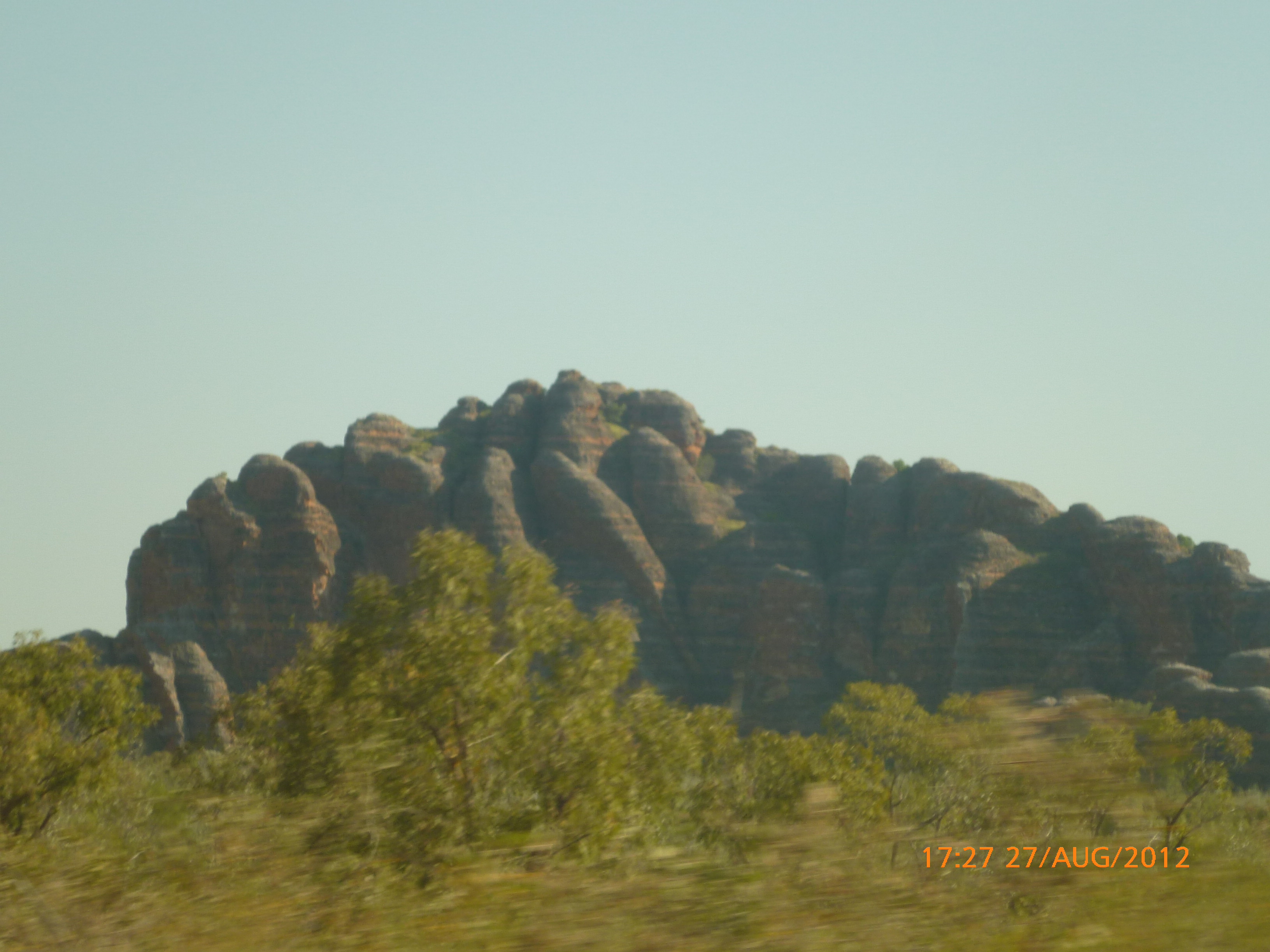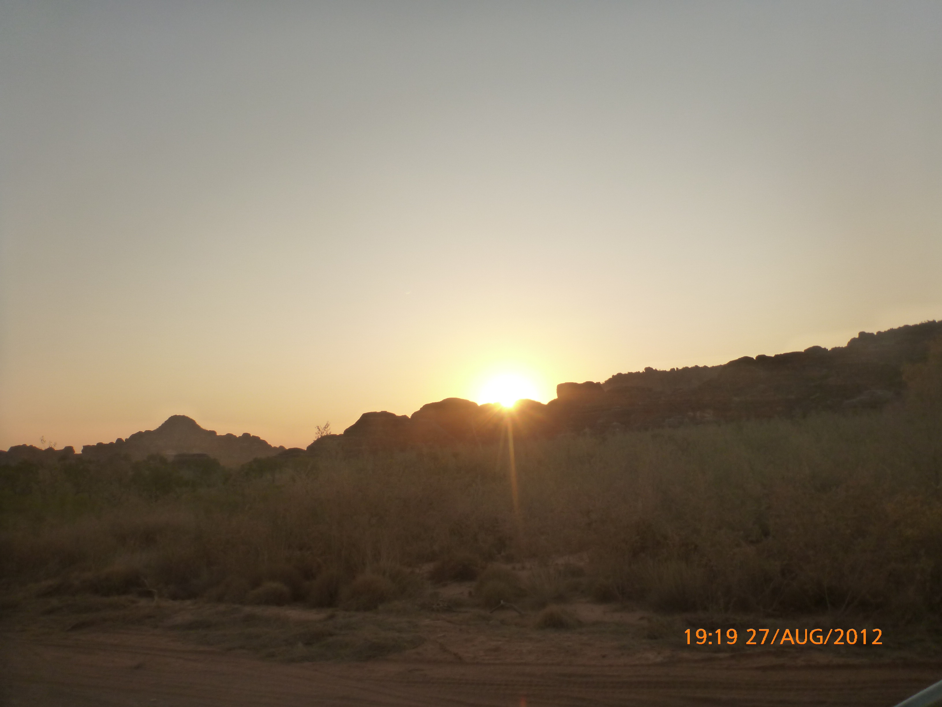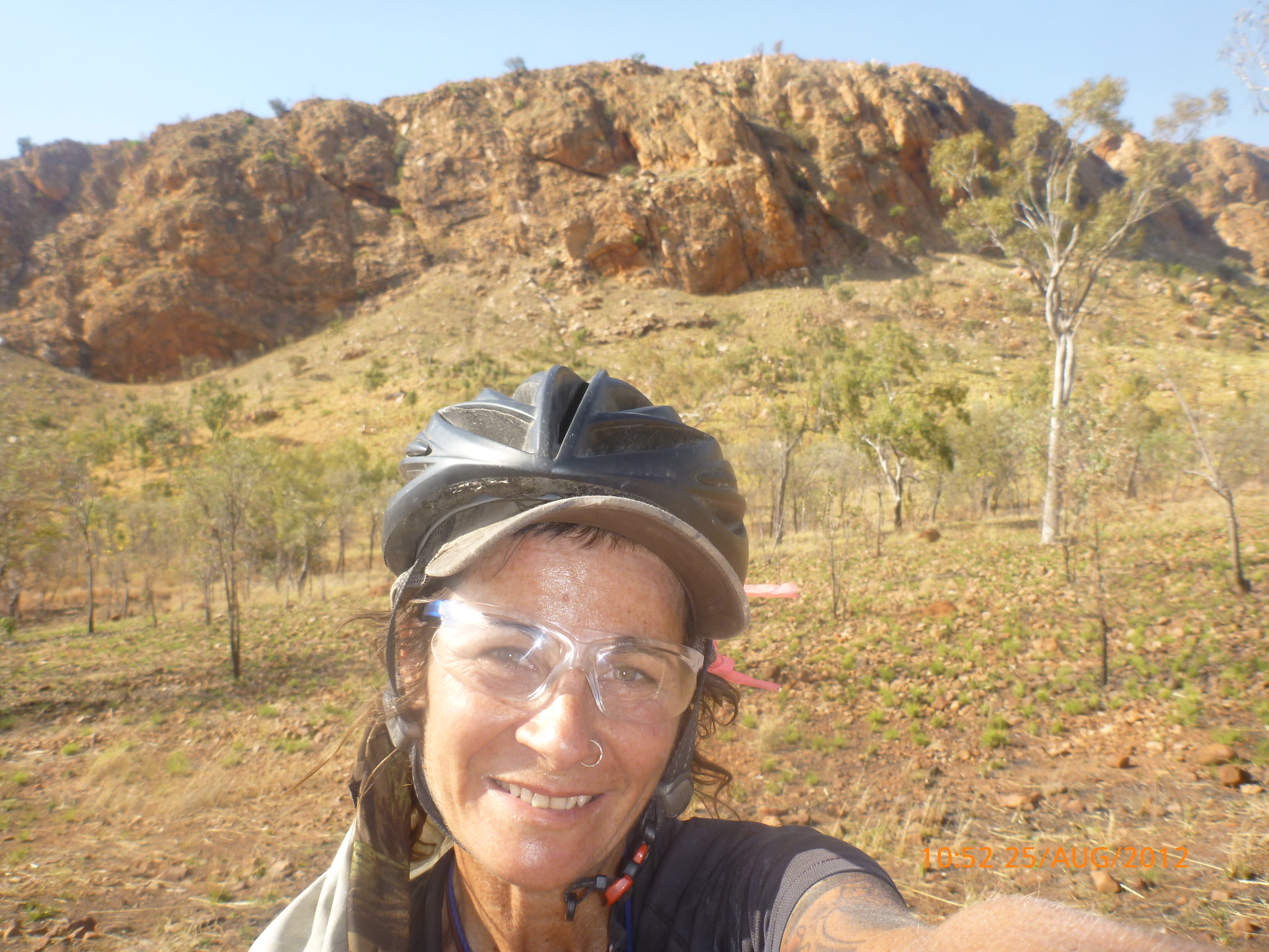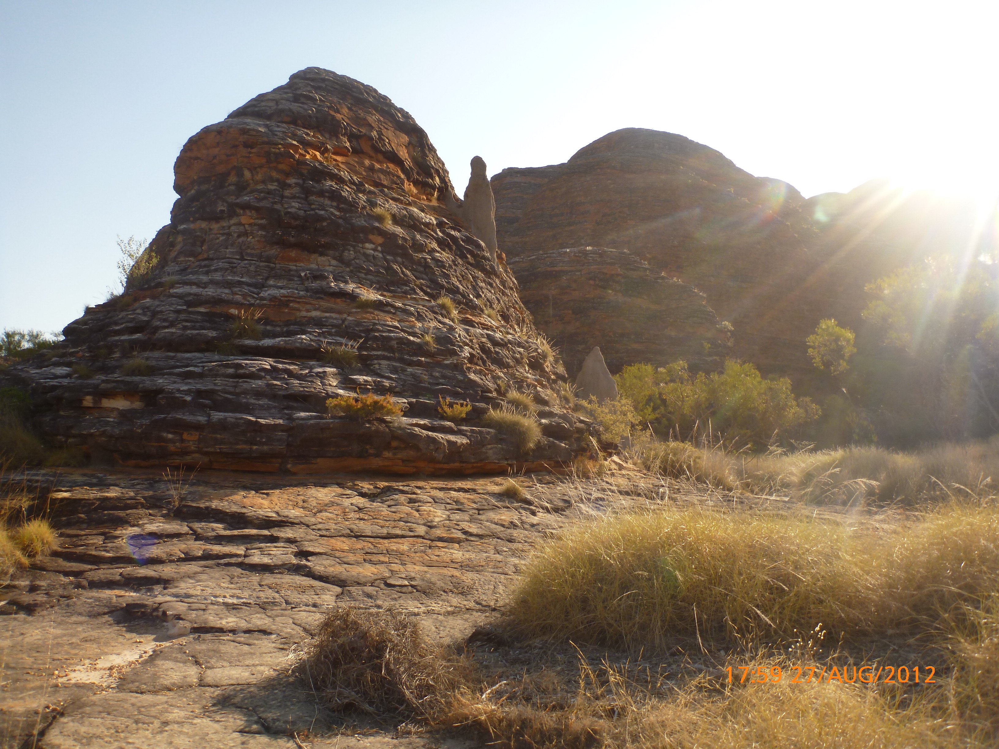 Day 54 88 days to go. Distances: Sun 26/8 Wamun (Turkey Creek) 96km, Mon 27/8 Purnululu NP, Bungle Bungle Range 0km, Tue 28/8 Mary Pool RA 116km, Wed 29/8 Fitzroy Crossing 187km, today 94km total 3990km. It’s 4pm Thursday 30/8/12 Ellandale RA. I’m currently sharing my peanut paste sammy with a whole bunch of top-knot pigeons that are clearly very wild and shy. I arrived about 2ish and only just now feel some personality coming back to my brain. This is in noway a winge as the weather is sensational but it’s between 38-42 degrees and I’m still sorting how best to balance the kms and heat stress. I pulled up today well and truly brain fried and the body stepped in saying ‘no more today Maree.’ But it was a late start after a late night and my liberated moment of turning the alarm off at 5am came back to bite me. I didn’t get on the road until 8am about 3 hours later than when I need to be. Today just reminded me of that so good revision lesson. I haven’t had heat stress since starting off in Thailand and it’s a bit icky tricky. What comes to mind is the first days of rain leaving Brisbane and thinking, ‘there be days down the track where you’ll want to be down poured on….yep these are those days I be thinking !!!! 🙂 So from tomorrow until we hit a change in weather it’ll be 4am up and 5am starts. It seems the more difficult the conditions the more kind folk become…isn’t that an awesome thing!! At the rest area was a hippy bloke I met at the RA out of Kununarra. He’s from the Blue Mts traveling for 3months with his border collie but heading home now cause he’s homesick and misses his Mum. He’s untidy around the edges but a big sweet kid and topped up all my water bottles before heading. Then George who’s from Caboolture and traveling with his wife and another couple, came over and said, ‘when you’re ready come over for a cool drink.’ I beat him back to his van and stayed for an hour enjoying the shady sit and warm company. They have a 17 y/o cockateal called Sparky who’s mummy’s boy and living the dream on the road with mum and dad. They can reach the ripe ol’ age of 30!! His only close encounter has been with a baby cassuarie in Mossman but mum snaveled him first so Sparky’s adventures continue. I then went to set up camp and the lads came over with a tarp to block the afternoon sun. Another german couple cam over with two oranges which I’ve just now devoured and shared with the bush bees. They are just as persistent and sticky as the desert flies so the head net is well and truly on. It cools down slowly now to balmy beautiful evenings and sleeping under the grasshopper fly is so beautiful. It’s full moon on the 1/9 so the stars and moon are currently serenading me nigh nighs. I haven’t managed a post for 5 days with all that’s been happening well into the evenings.