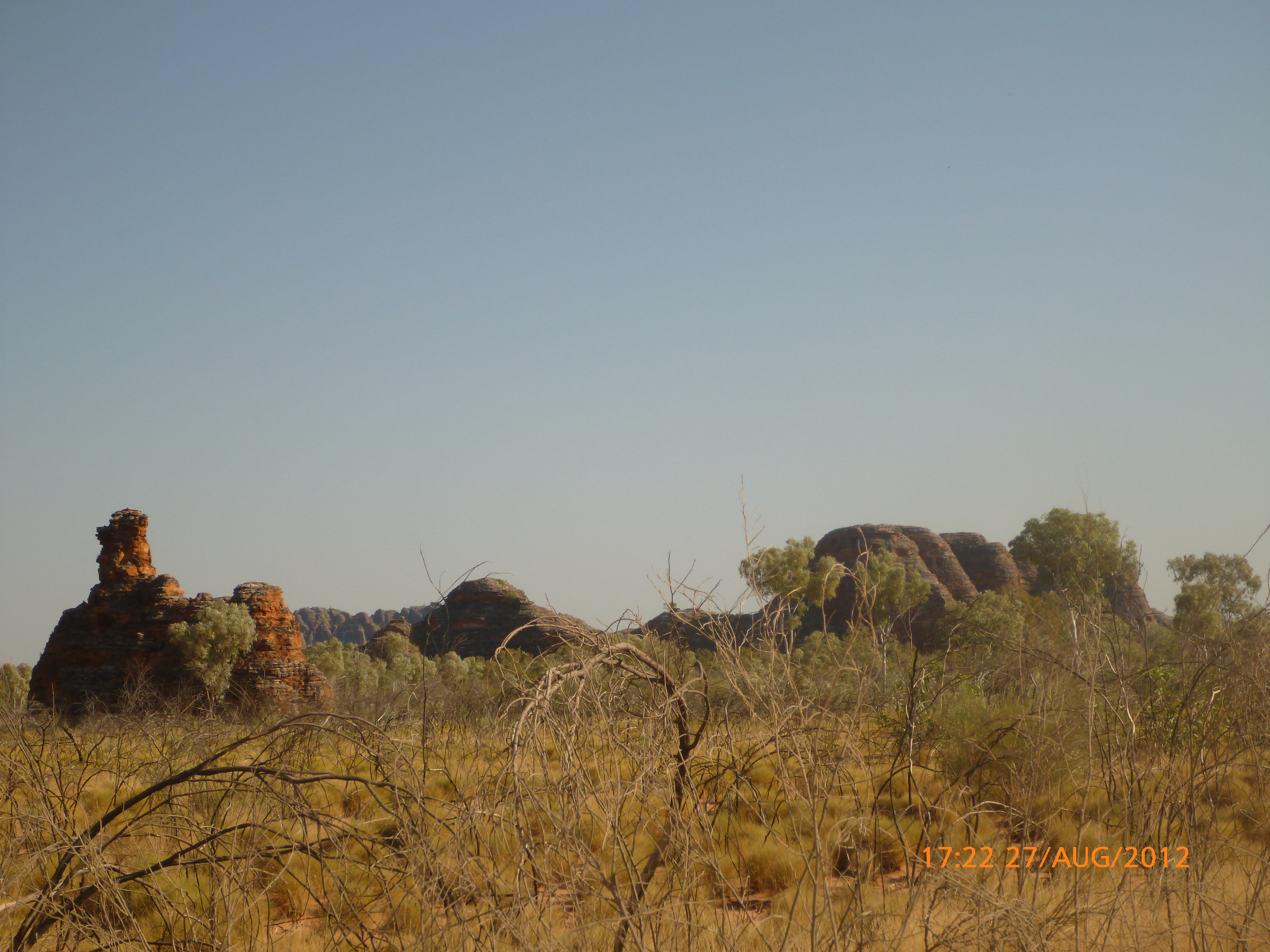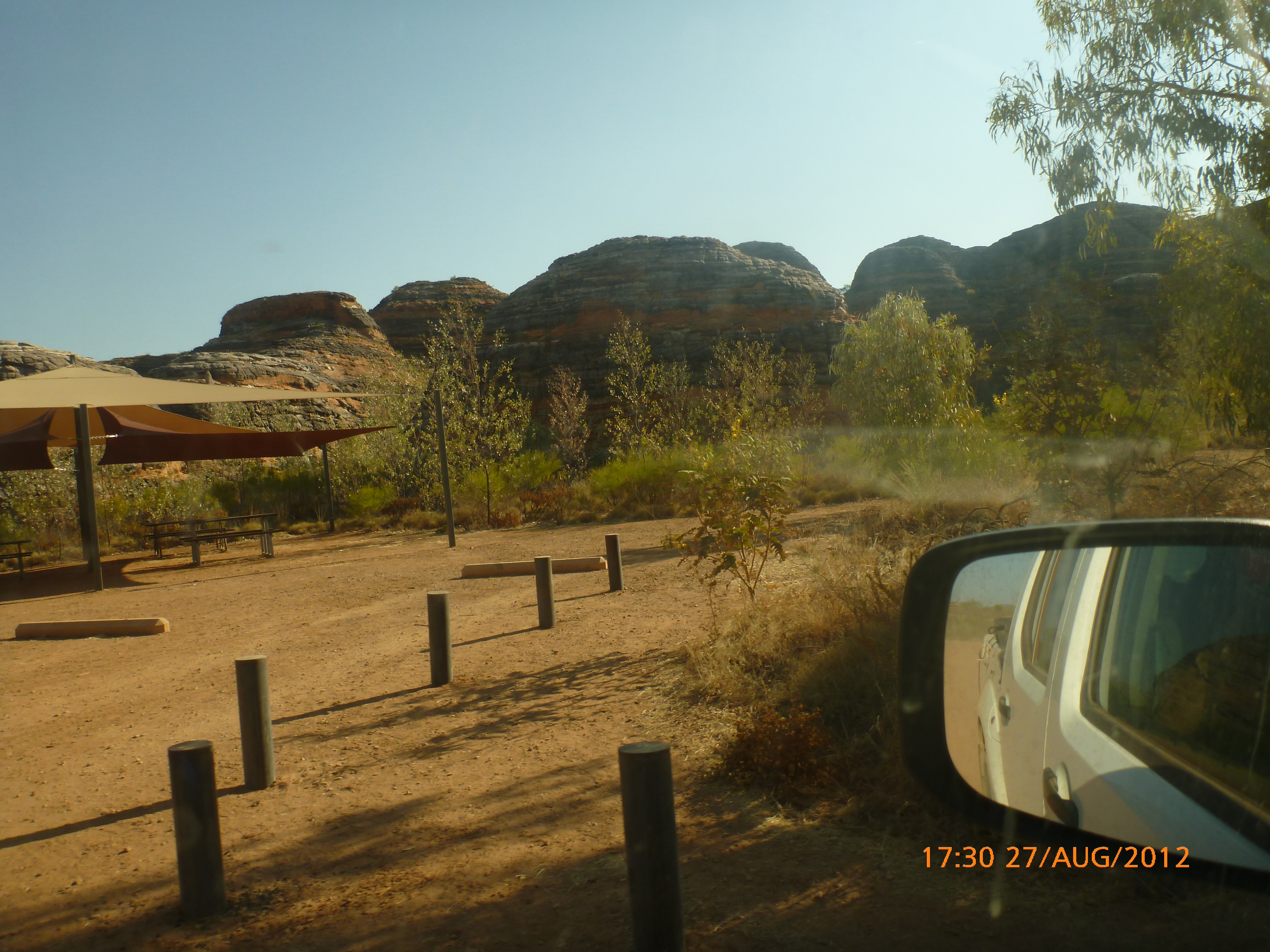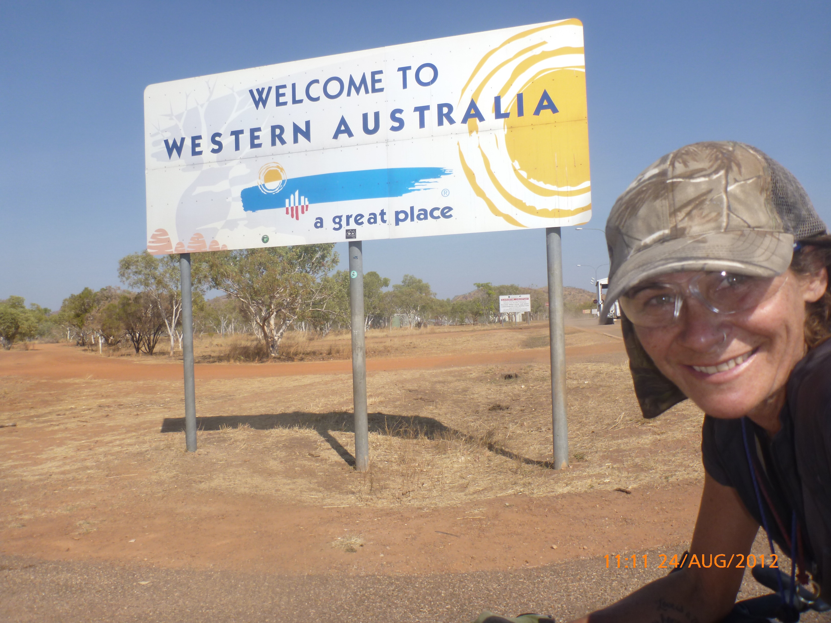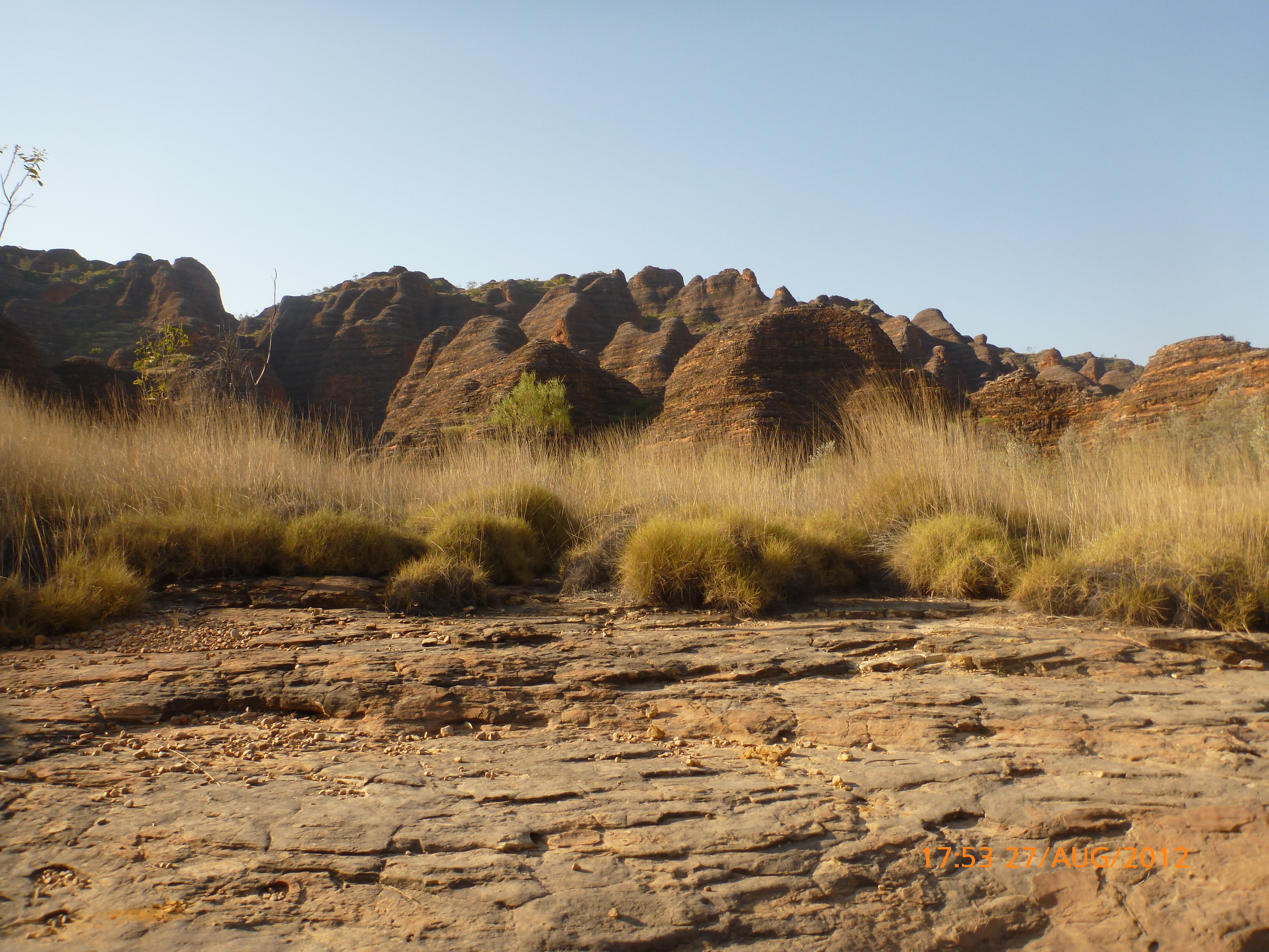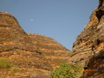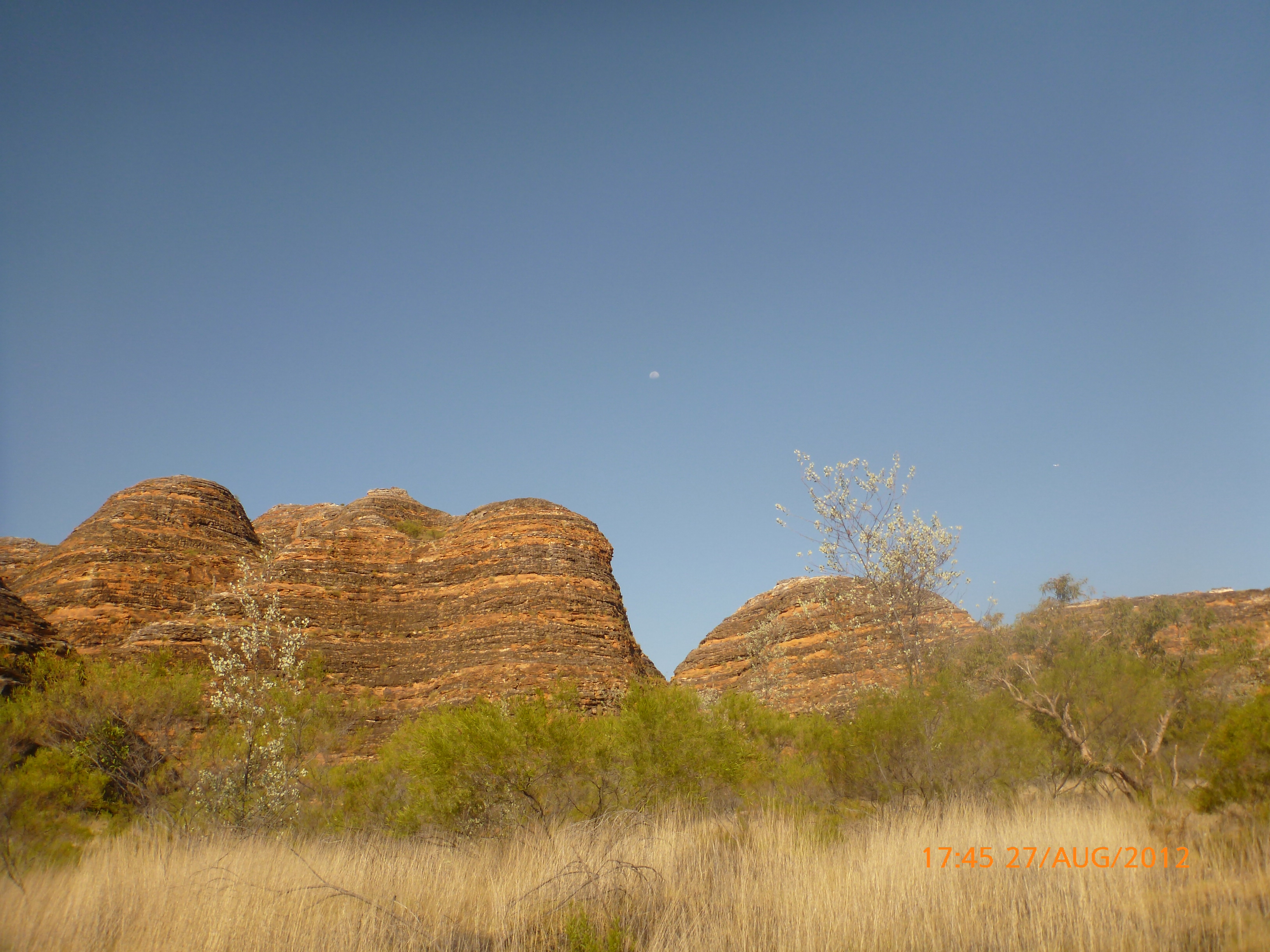 Day 54 88 days to go. Distances: Sun 26/8 Wamun (Turkey Creek) 96km, Mon 27/8 Purnululu NP, Bungle Bungle Range 0km, Tue 28/8 Mary Pool RA 116km, Wed 29/8 Fitzroy Crossing 187km, today 94km total 3990km. It’s 4pm Thursday 30/8/12 Ellandale RA. I’m currently sharing my peanut paste sammy with a whole bunch of top-knot pigeons that are clearly very wild and shy. I arrived about 2ish and only just now feel some personality coming back to my brain. This is in noway a winge as the weather is sensational but it’s between 38-42 degrees and I’m still sorting how best to balance the kms and heat stress. I pulled up today well and truly brain fried and the body stepped in saying ‘no more today Maree.’ But it was a late start after a late night and my liberated moment of turning the alarm off at 5am came back to bite me. I didn’t get on the road until 8am about 3 hours later than when I need to be. Today just reminded me of that so good revision lesson. I haven’t had heat stress since starting off in Thailand and it’s a bit icky tricky. What comes to mind is the first days of rain leaving Brisbane and thinking, ‘there be days down the track where you’ll want to be down poured on….yep these are those days I be thinking !!!! 🙂 So from tomorrow until we hit a change in weather it’ll be 4am up and 5am starts. It seems the more difficult the conditions the more kind folk become…isn’t that an awesome thing!! At the rest area was a hippy bloke I met at the RA out of Kununarra. He’s from the Blue Mts traveling for 3months with his border collie but heading home now cause he’s homesick and misses his Mum. He’s untidy around the edges but a big sweet kid and topped up all my water bottles before heading. Then George who’s from Caboolture and traveling with his wife and another couple, came over and said, ‘when you’re ready come over for a cool drink.’ I beat him back to his van and stayed for an hour enjoying the shady sit and warm company. They have a 17 y/o cockateal called Sparky who’s mummy’s boy and living the dream on the road with mum and dad. They can reach the ripe ol’ age of 30!! His only close encounter has been with a baby cassuarie in Mossman but mum snaveled him first so Sparky’s adventures continue. I then went to set up camp and the lads came over with a tarp to block the afternoon sun. Another german couple cam over with two oranges which I’ve just now devoured and shared with the bush bees. They are just as persistent and sticky as the desert flies so the head net is well and truly on. It cools down slowly now to balmy beautiful evenings and sleeping under the grasshopper fly is so beautiful. It’s full moon on the 1/9 so the stars and moon are currently serenading me nigh nighs. I haven’t managed a post for 5 days with all that’s been happening well into the evenings.