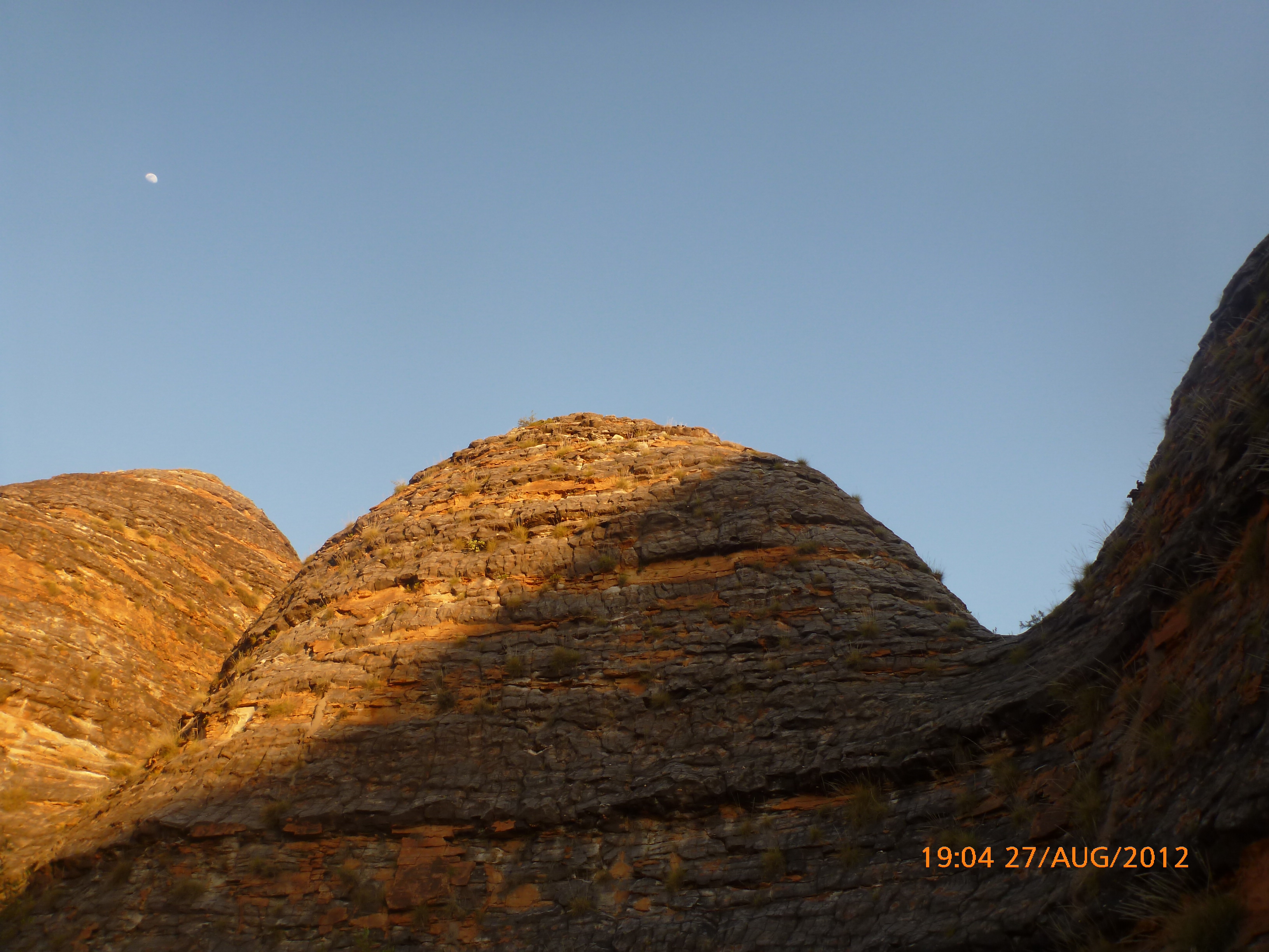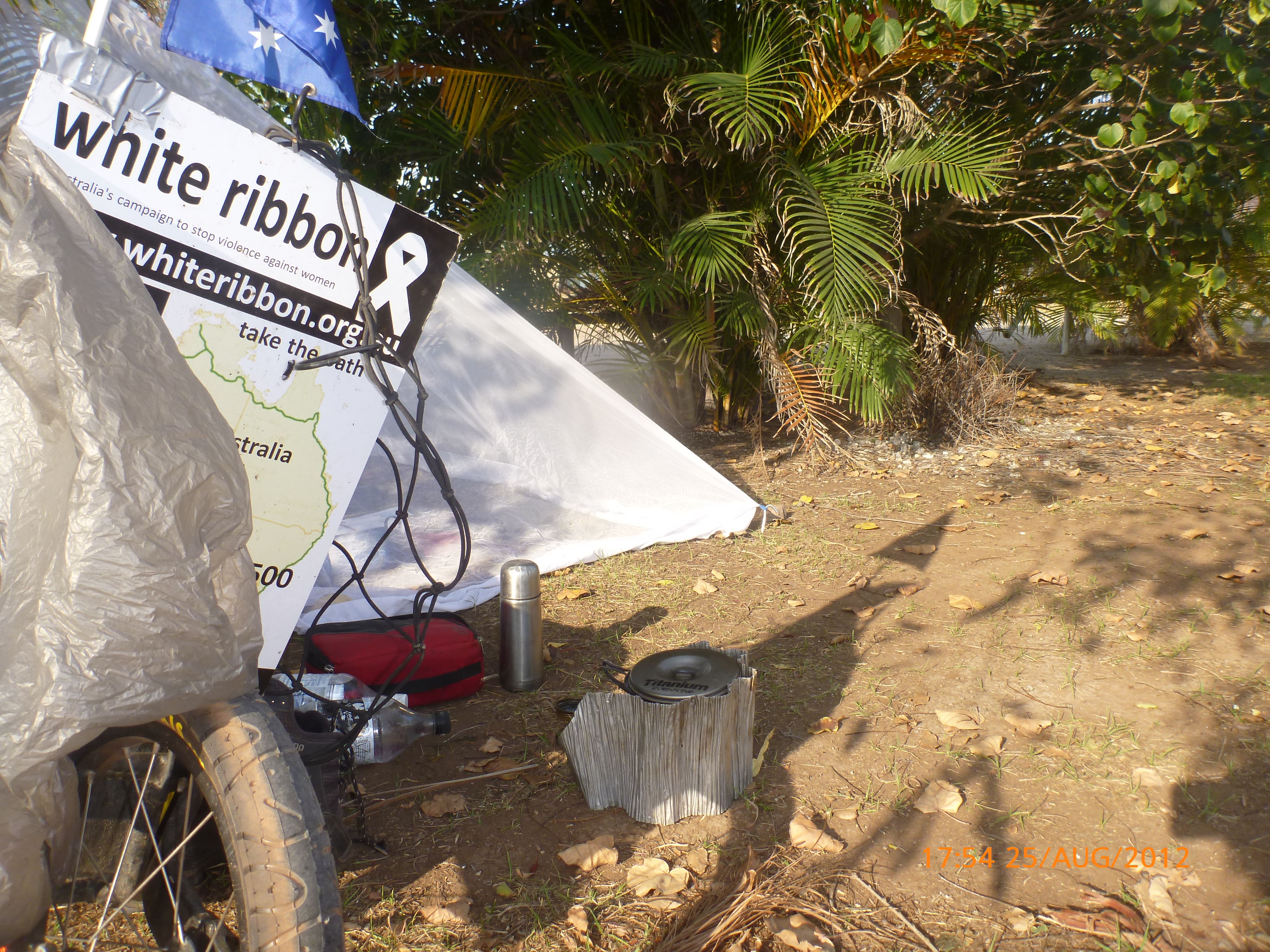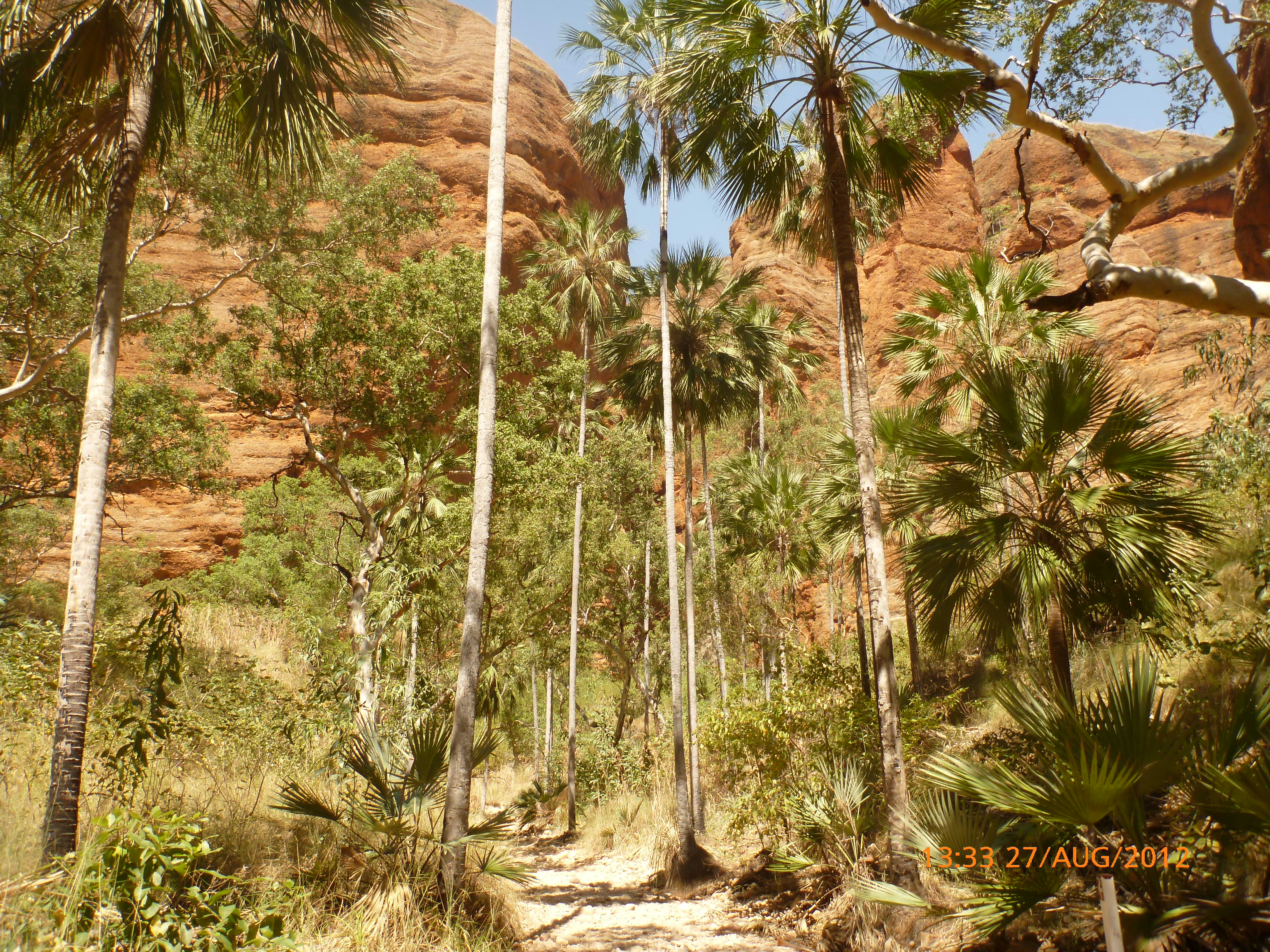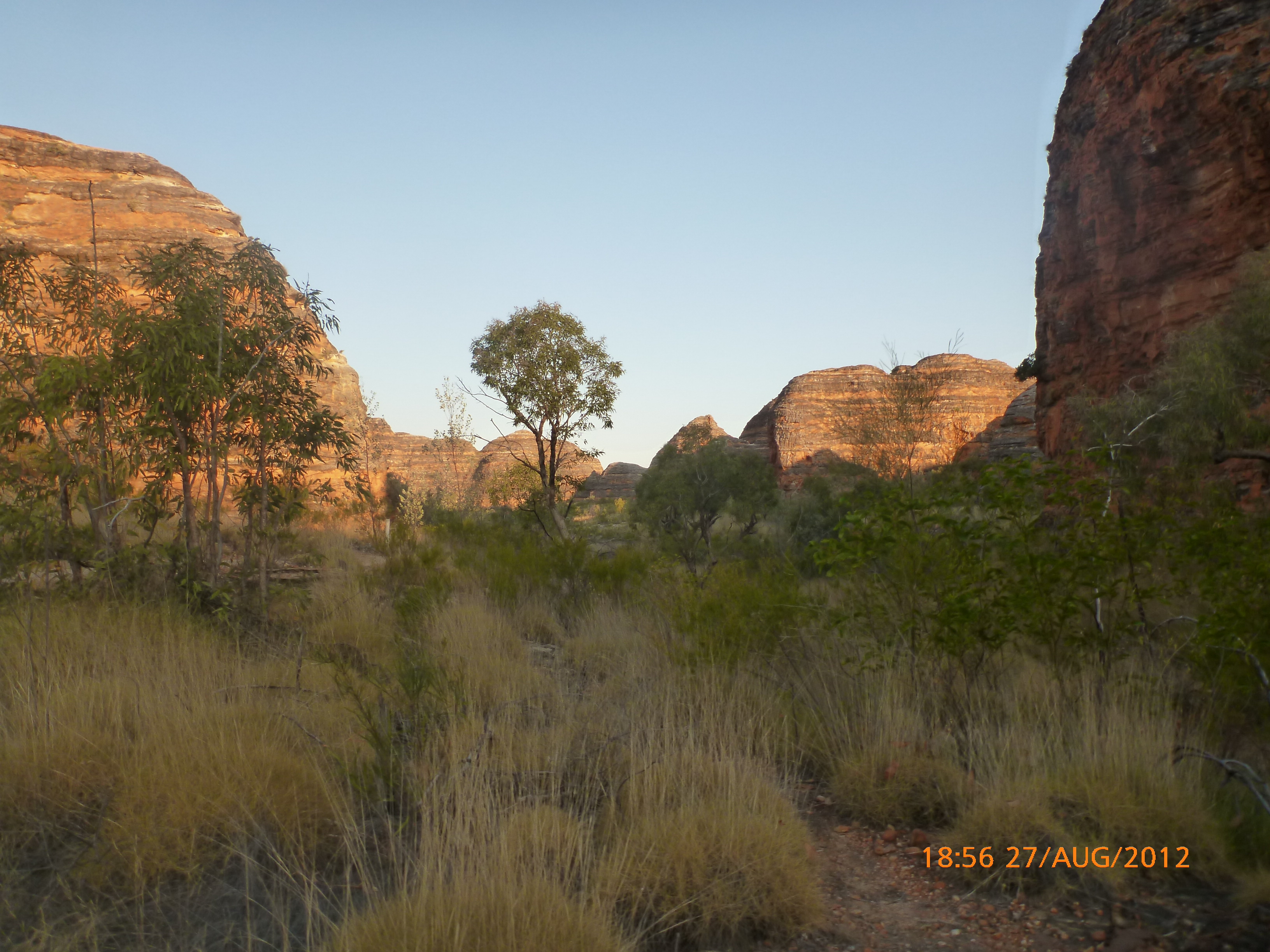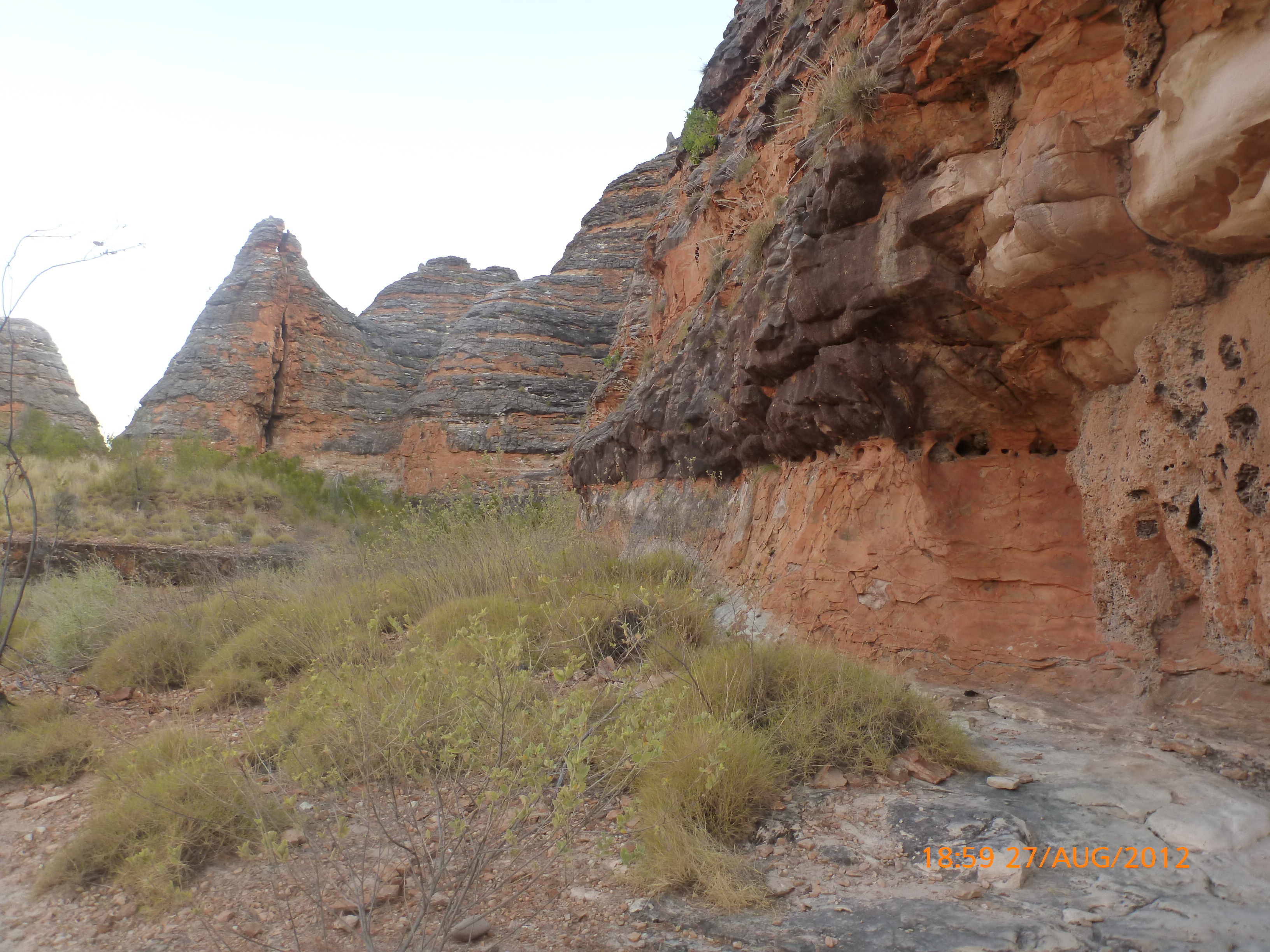 Day 54 88 days to go. Distances: Sun 26/8 Wamun (Turkey Creek) 96km, Mon 27/8 Purnululu NP, Bungle Bungle Range 0km, Tue 28/8 Mary Pool RA 116km, Wed 29/8 Fitzroy Crossing 187km, today 94km total 3990km. It’s 4pm Thursday 30/8/12 Ellandale RA. I’m currently sharing my peanut paste sammy with a whole bunch of top-knot pigeons that are clearly very wild and shy. I arrived about 2ish and only just now feel some personality coming back to my brain. This is in noway a winge as the weather is sensational but it’s between 38-42 degrees and I’m still sorting how best to balance the kms and heat stress. I pulled up today well and truly brain fried and the body stepped in saying ‘no more today Maree.’ But it was a late start after a late night and my liberated moment of turning the alarm off at 5am came back to bite me. I didn’t get on the road until 8am about 3 hours later than when I need to be. Today just reminded me of that so good revision lesson. I haven’t had heat stress since starting off in Thailand and it’s a bit icky tricky. What comes to mind is the first days of rain leaving Brisbane and thinking, ‘there be days down the track where you’ll want to be down poured on….yep these are those days I be thinking !!!! 🙂 So from tomorrow until we hit a change in weather it’ll be 4am up and 5am starts. It seems the more difficult the conditions the more kind folk become…isn’t that an awesome thing!! At the rest area was a hippy bloke I met at the RA out of Kununarra. He’s from the Blue Mts traveling for 3months with his border collie but heading home now cause he’s homesick and misses his Mum. He’s untidy around the edges but a big sweet kid and topped up all my water bottles before heading. Then George who’s from Caboolture and traveling with his wife and another couple, came over and said, ‘when you’re ready come over for a cool drink.’ I beat him back to his van and stayed for an hour enjoying the shady sit and warm company. They have a 17 y/o cockateal called Sparky who’s mummy’s boy and living the dream on the road with mum and dad. They can reach the ripe ol’ age of 30!! His only close encounter has been with a baby cassuarie in Mossman but mum snaveled him first so Sparky’s adventures continue. I then went to set up camp and the lads came over with a tarp to block the afternoon sun. Another german couple cam over with two oranges which I’ve just now devoured and shared with the bush bees. They are just as persistent and sticky as the desert flies so the head net is well and truly on. It cools down slowly now to balmy beautiful evenings and sleeping under the grasshopper fly is so beautiful. It’s full moon on the 1/9 so the stars and moon are currently serenading me nigh nighs. I haven’t managed a post for 5 days with all that’s been happening well into the evenings.