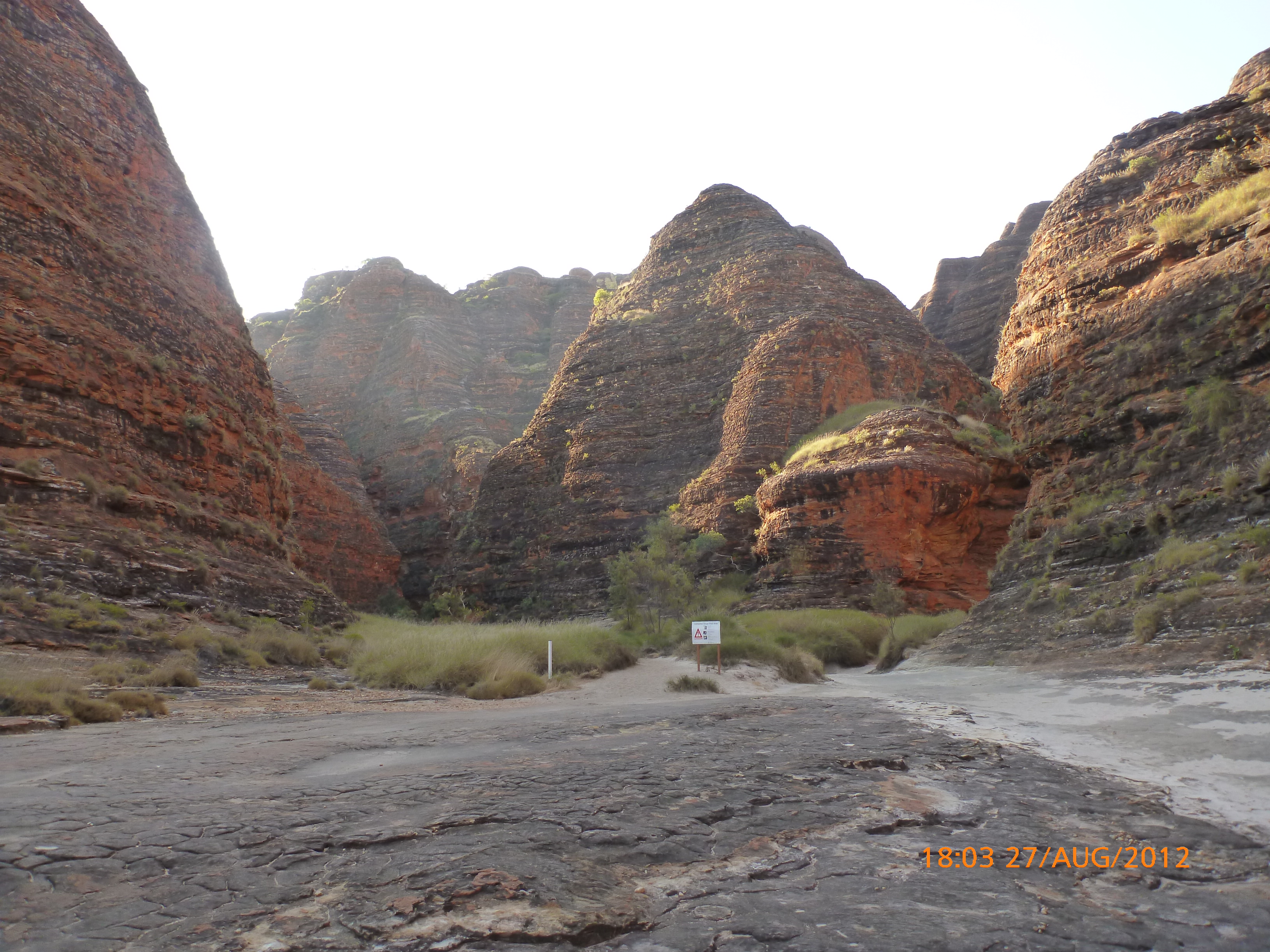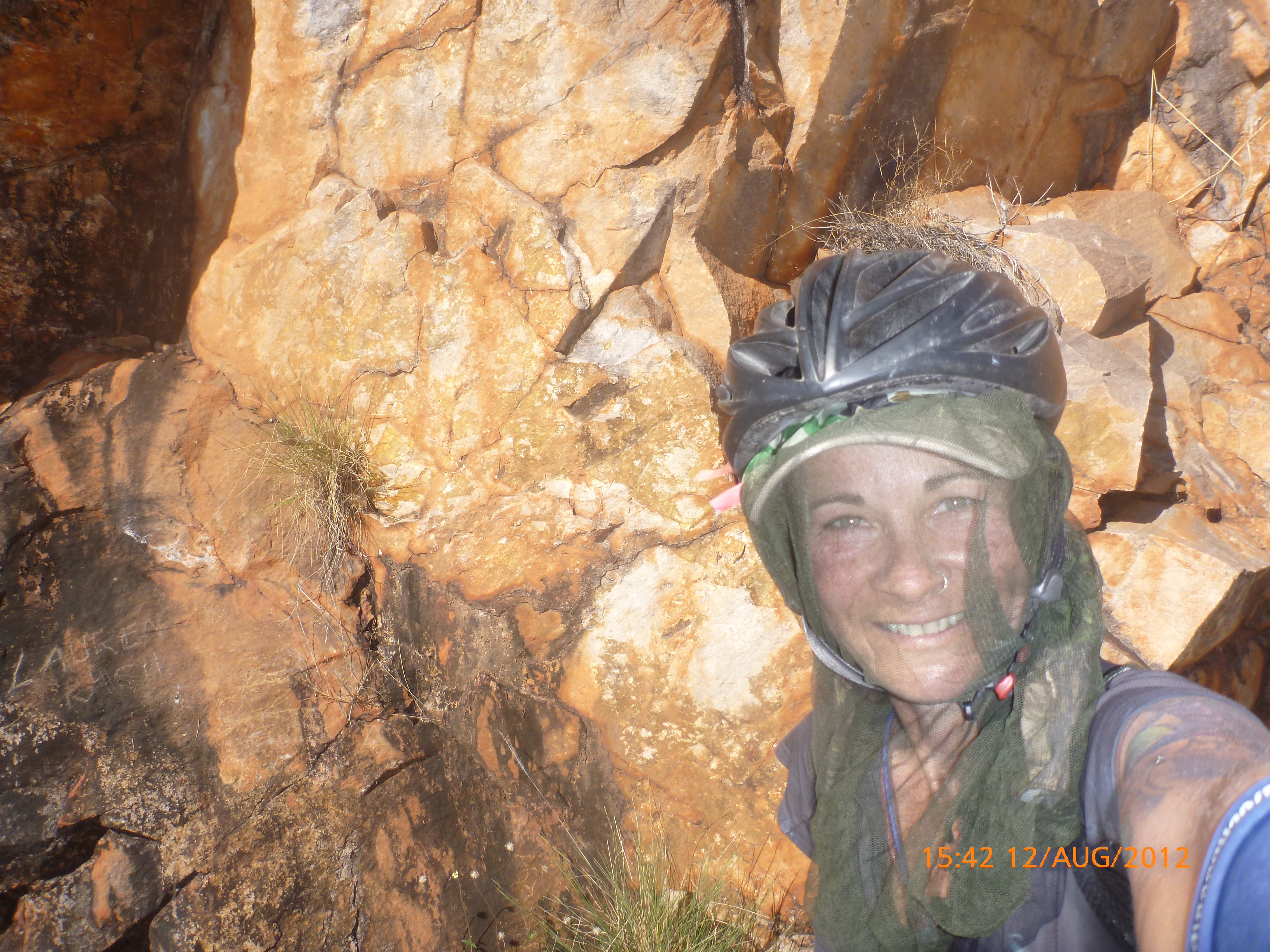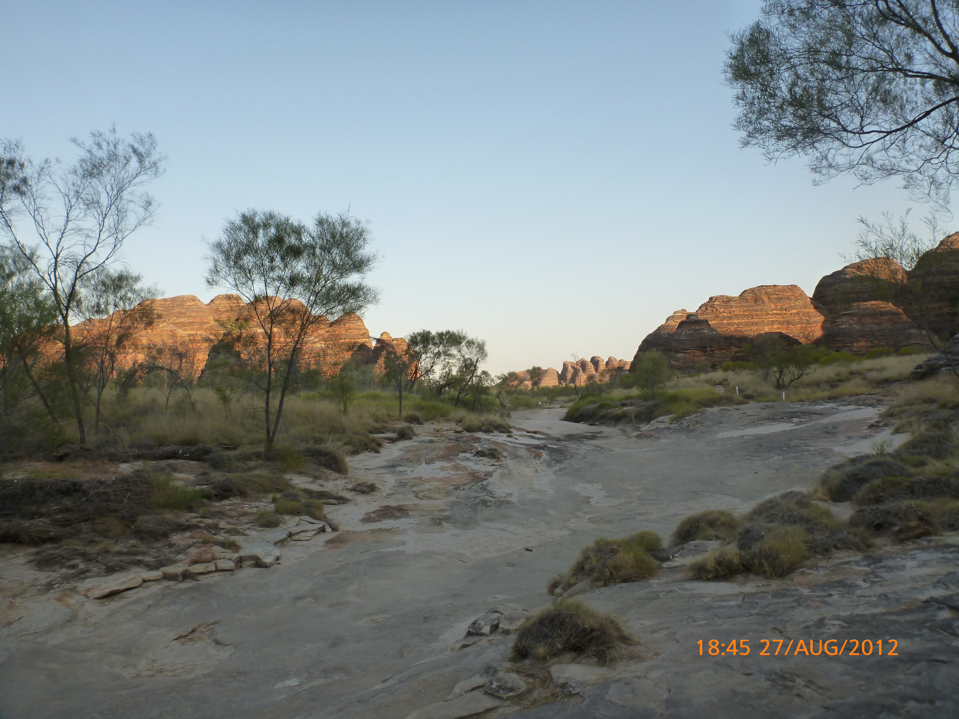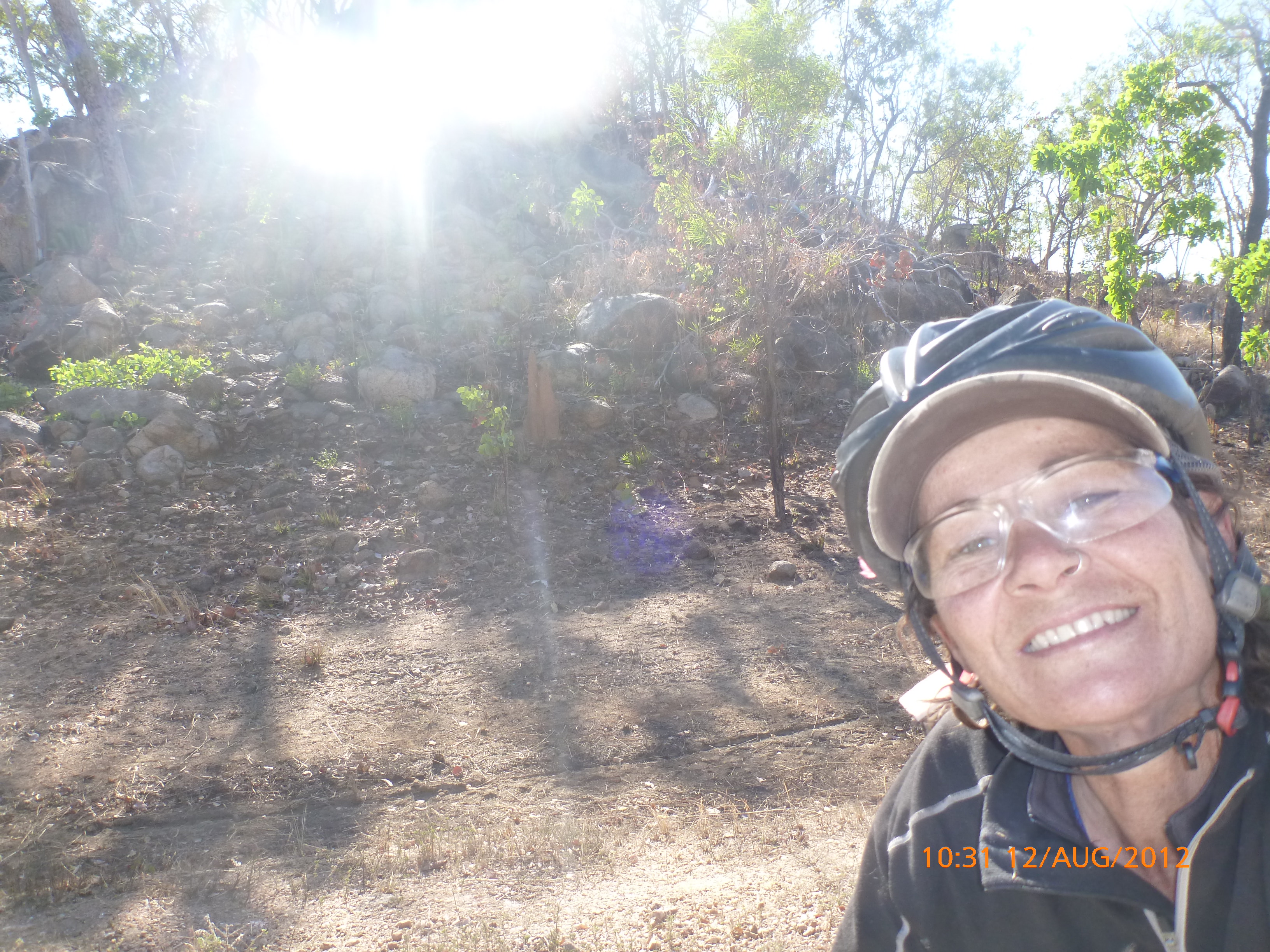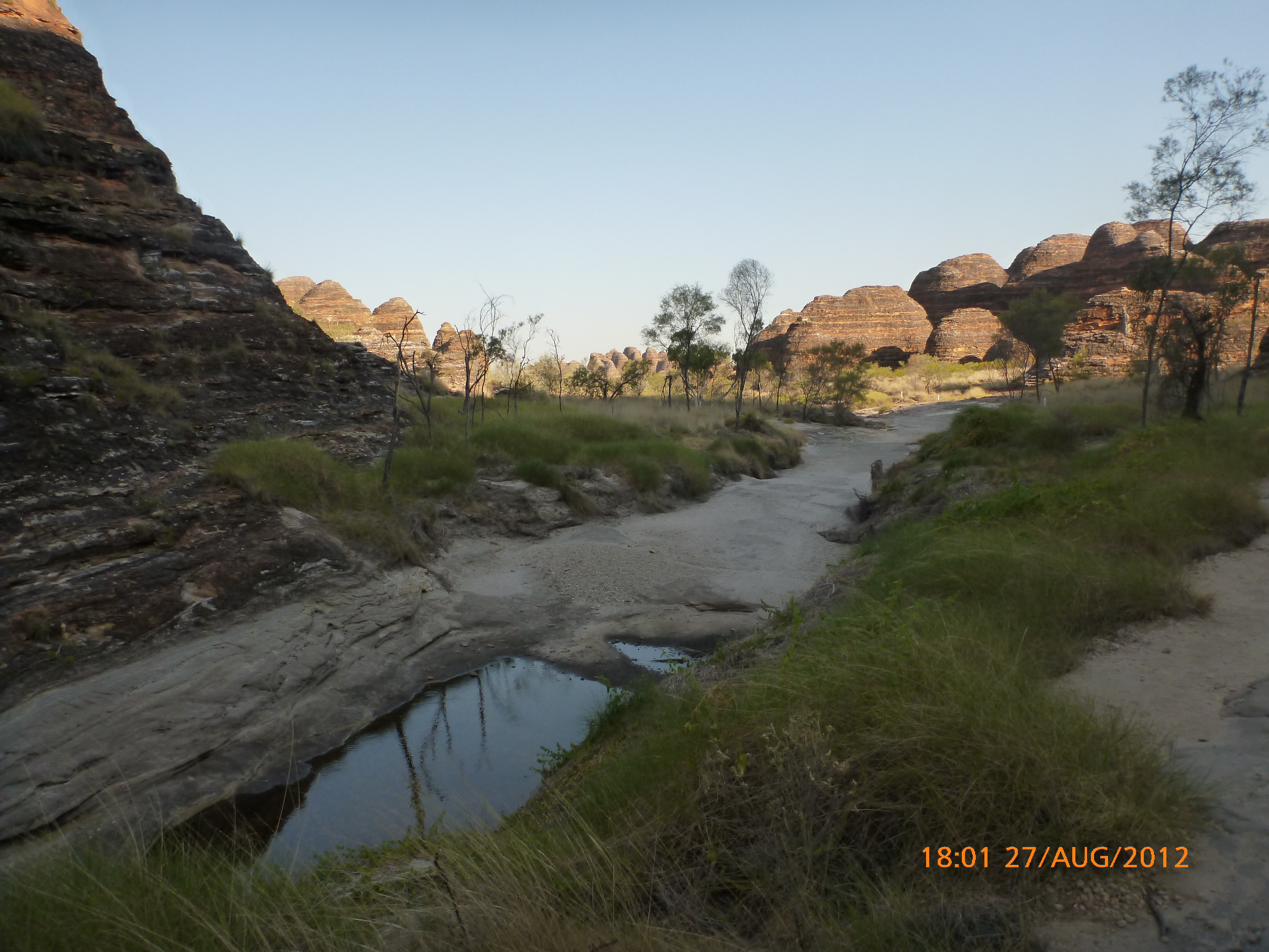 Day 54 88 days to go. Distances: Sun 26/8 Wamun (Turkey Creek) 96km, Mon 27/8 Purnululu NP, Bungle Bungle Range 0km, Tue 28/8 Mary Pool RA 116km, Wed 29/8 Fitzroy Crossing 187km, today 94km total 3990km. It’s 4pm Thursday 30/8/12 Ellandale RA. I’m currently sharing my peanut paste sammy with a whole bunch of top-knot pigeons that are clearly very wild and shy. I arrived about 2ish and only just now feel some personality coming back to my brain. This is in noway a winge as the weather is sensational but it’s between 38-42 degrees and I’m still sorting how best to balance the kms and heat stress. I pulled up today well and truly brain fried and the body stepped in saying ‘no more today Maree.’ But it was a late start after a late night and my liberated moment of turning the alarm off at 5am came back to bite me. I didn’t get on the road until 8am about 3 hours later than when I need to be. Today just reminded me of that so good revision lesson. I haven’t had heat stress since starting off in Thailand and it’s a bit icky tricky. What comes to mind is the first days of rain leaving Brisbane and thinking, ‘there be days down the track where you’ll want to be down poured on….yep these are those days I be thinking !!!! 🙂 So from tomorrow until we hit a change in weather it’ll be 4am up and 5am starts. It seems the more difficult the conditions the more kind folk become…isn’t that an awesome thing!! At the rest area was a hippy bloke I met at the RA out of Kununarra. He’s from the Blue Mts traveling for 3months with his border collie but heading home now cause he’s homesick and misses his Mum. He’s untidy around the edges but a big sweet kid and topped up all my water bottles before heading. Then George who’s from Caboolture and traveling with his wife and another couple, came over and said, ‘when you’re ready come over for a cool drink.’ I beat him back to his van and stayed for an hour enjoying the shady sit and warm company. They have a 17 y/o cockateal called Sparky who’s mummy’s boy and living the dream on the road with mum and dad. They can reach the ripe ol’ age of 30!! His only close encounter has been with a baby cassuarie in Mossman but mum snaveled him first so Sparky’s adventures continue. I then went to set up camp and the lads came over with a tarp to block the afternoon sun. Another german couple cam over with two oranges which I’ve just now devoured and shared with the bush bees. They are just as persistent and sticky as the desert flies so the head net is well and truly on. It cools down slowly now to balmy beautiful evenings and sleeping under the grasshopper fly is so beautiful. It’s full moon on the 1/9 so the stars and moon are currently serenading me nigh nighs. I haven’t managed a post for 5 days with all that’s been happening well into the evenings.